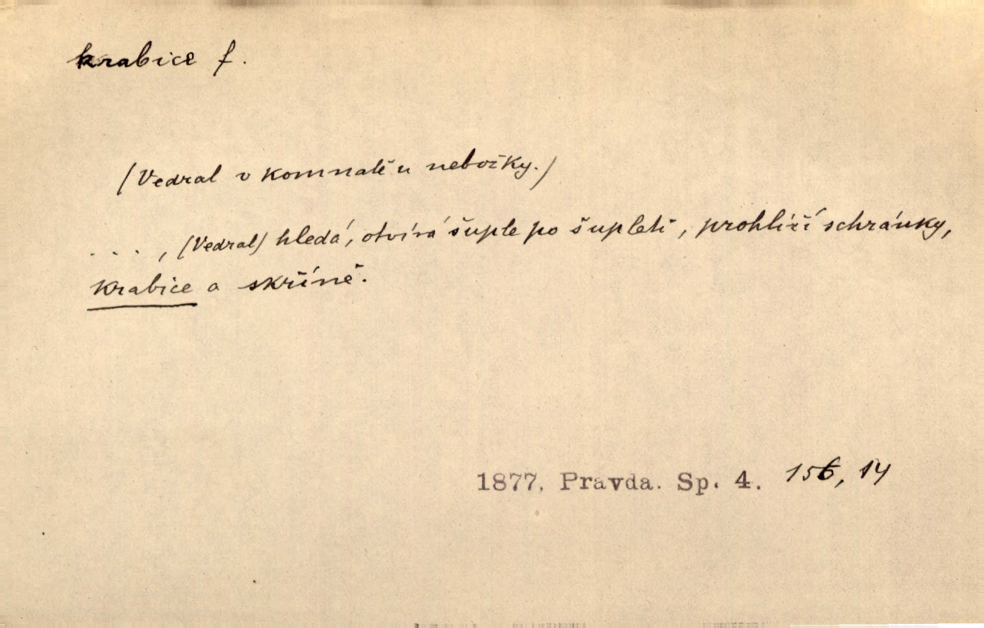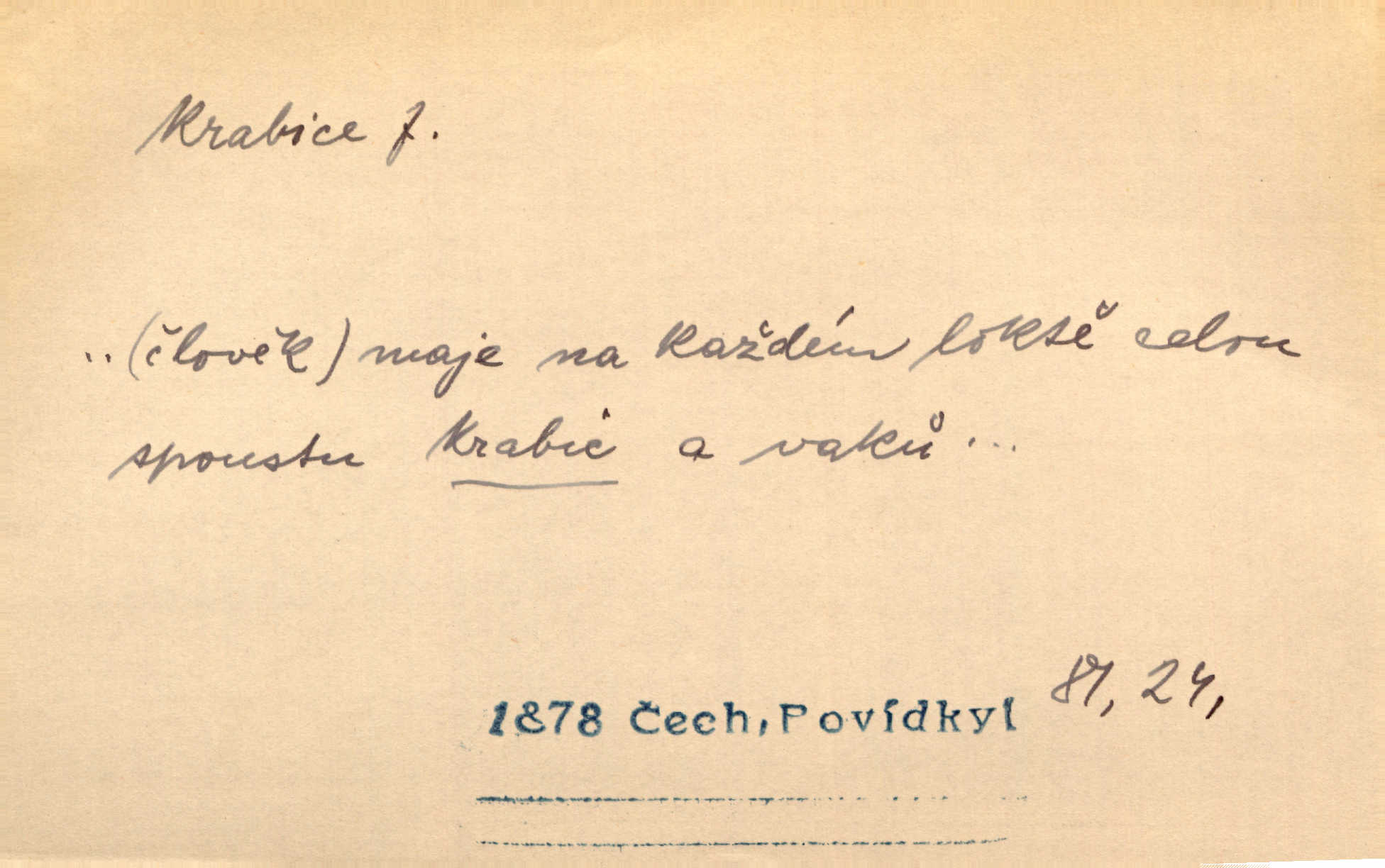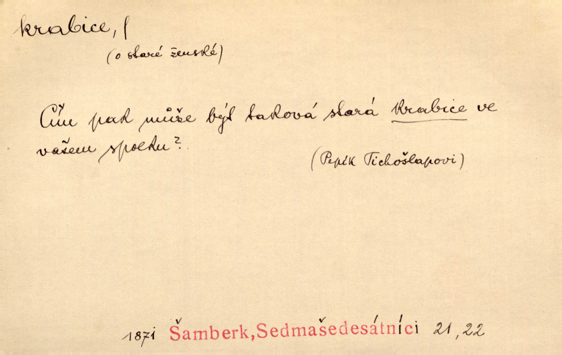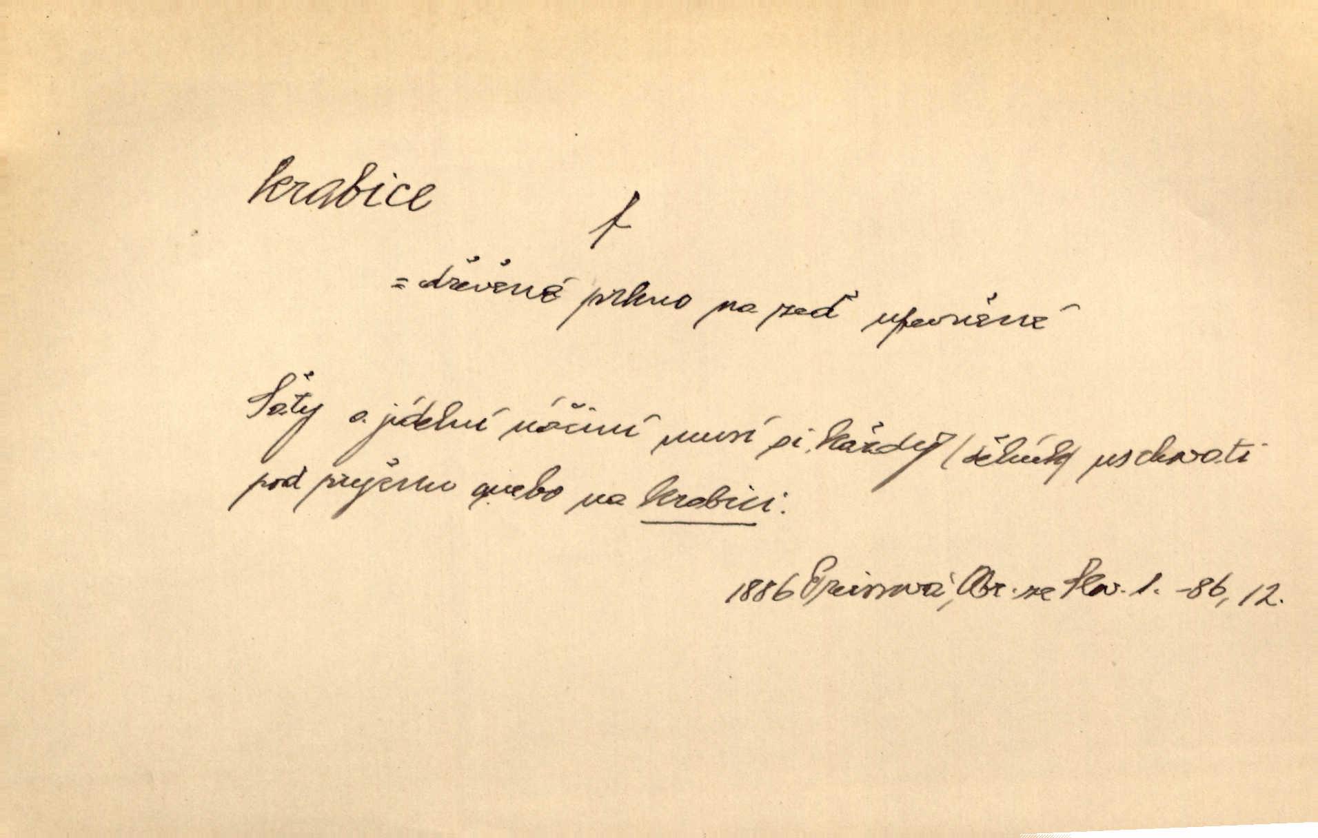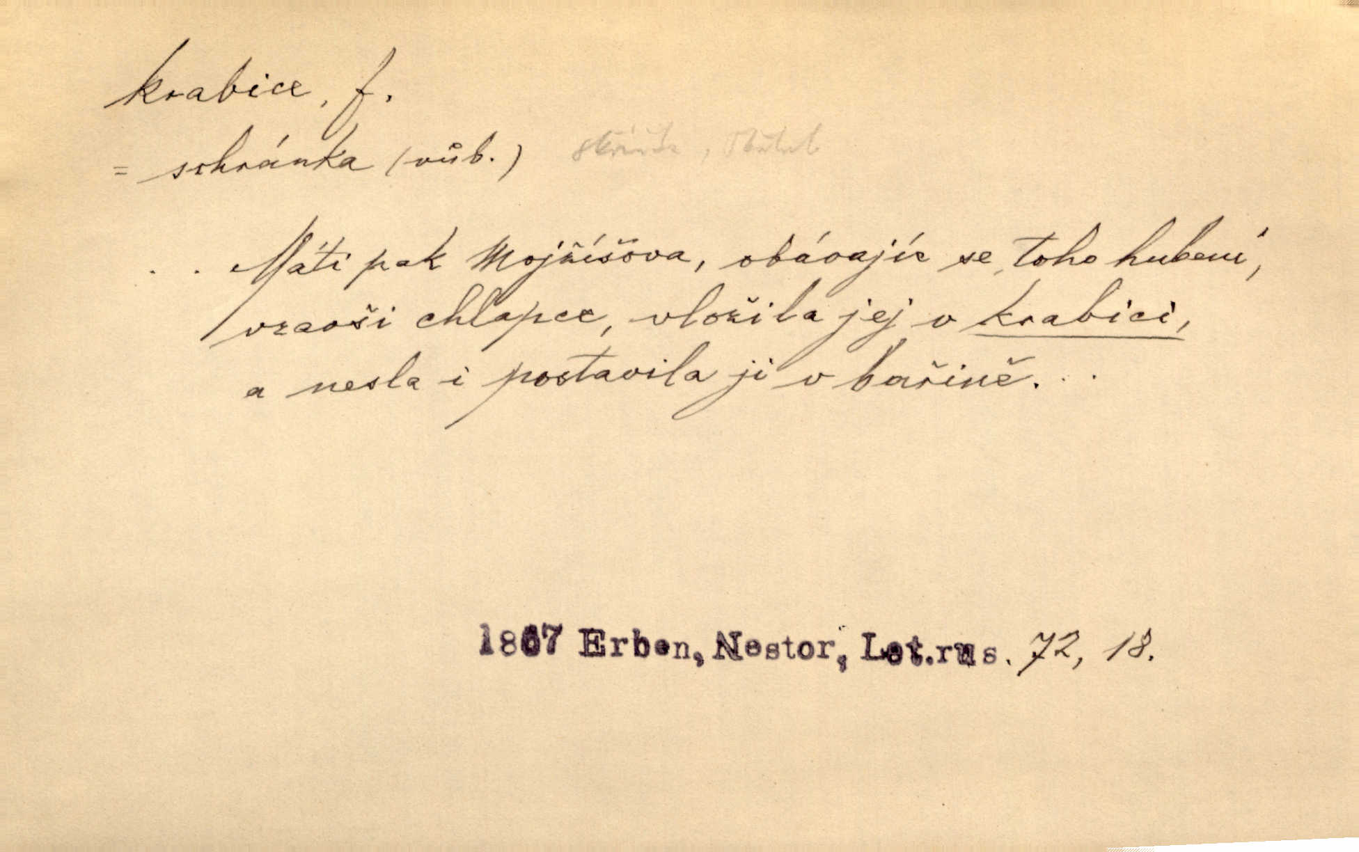 - krabice, -e f. škatule, schránka, skřínka. Hledá, otvírá šuple po šupleti, prohlíží schránky, krabice a skříně. Prav. Píchal [akcizák] do krabic s dorty. Vach. Přibral krabici olejových sardinek. Herrm. Vytáhla ze skříně krabici hedvábí. Ner. Krabice na klobouky. El. tech. odbočná krabice kruhová n. čtvercová skřínka s víkem, v níž se dráty spojují n. odbočují. D nadávka staré ženě, škatule. Čím pak může být taková stará krabice ve vašem spolku? Šamb.