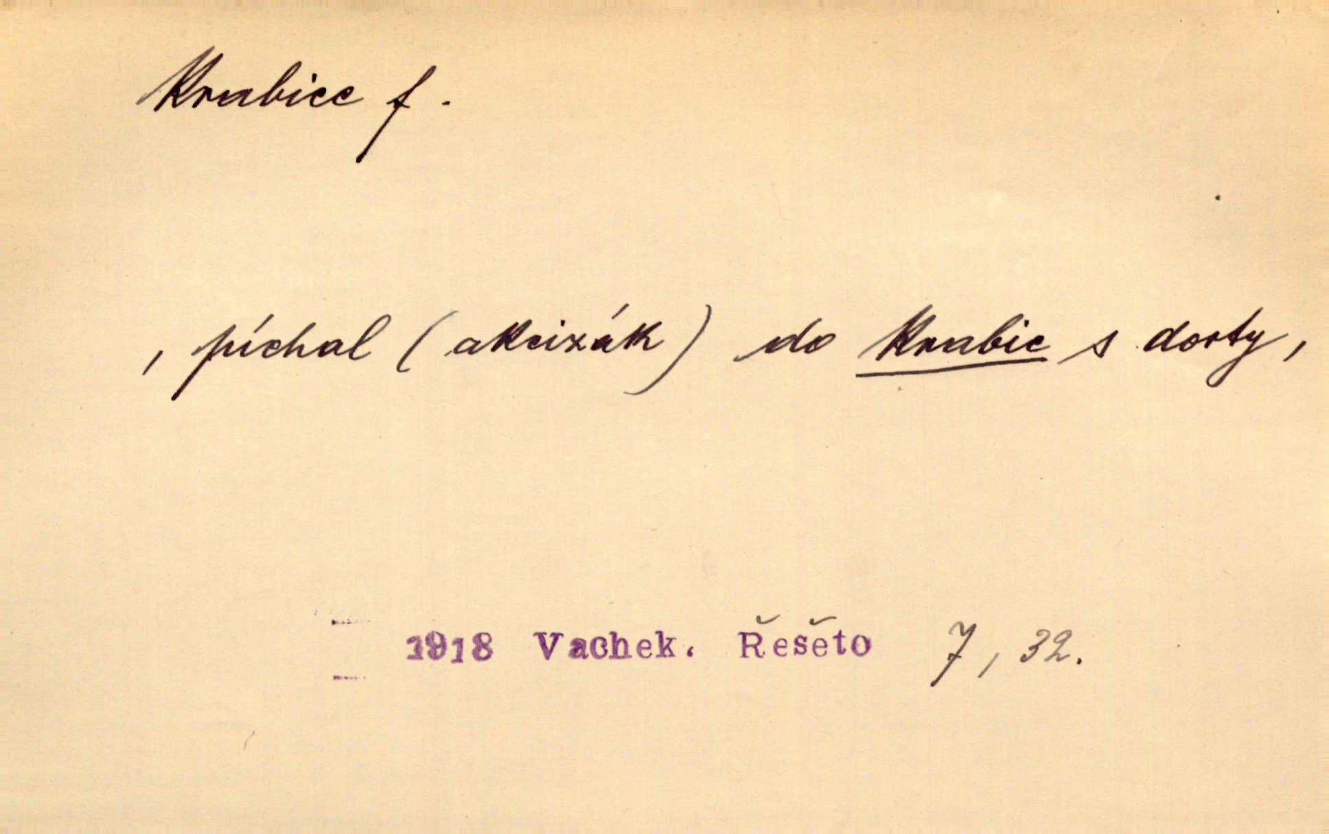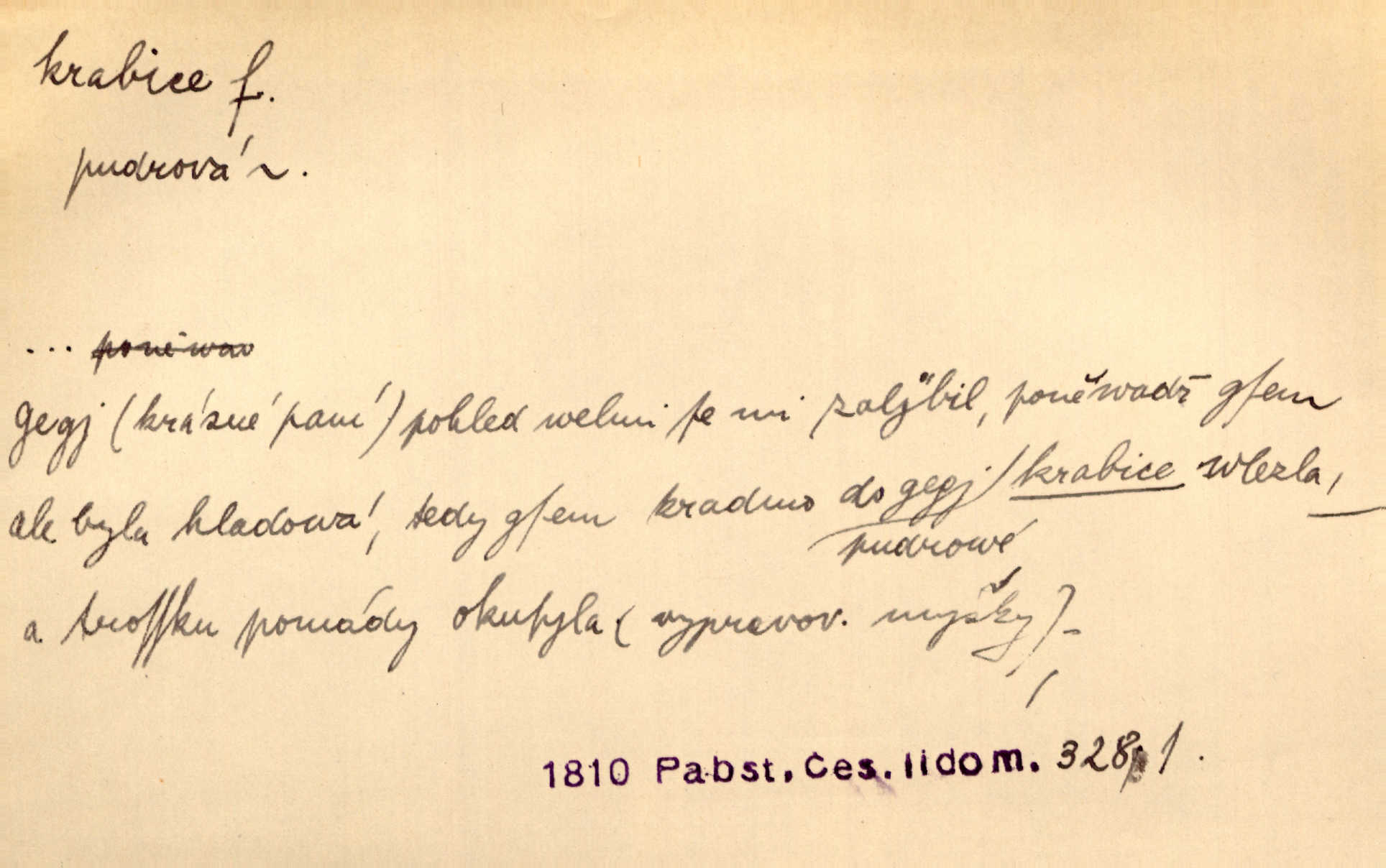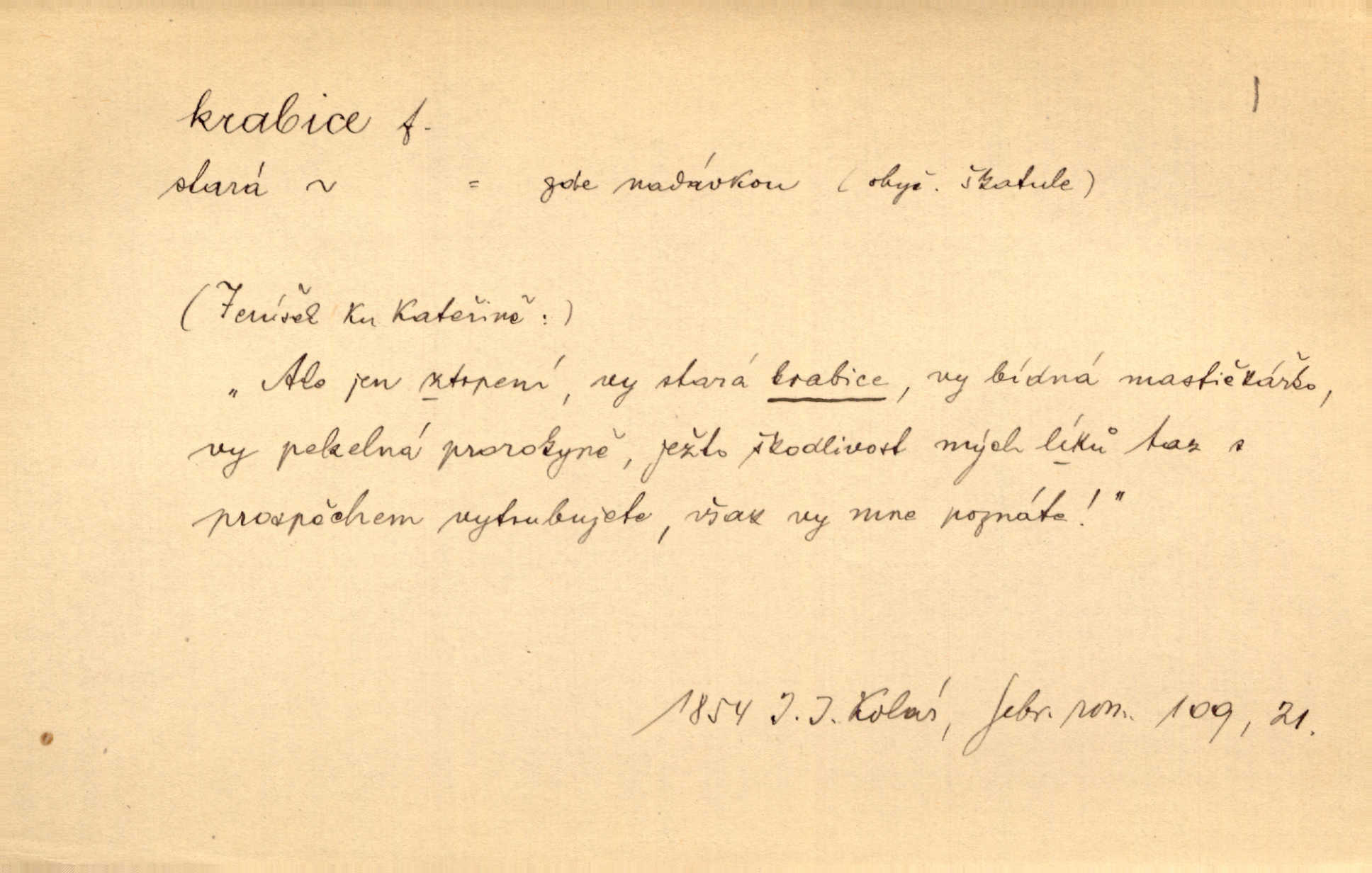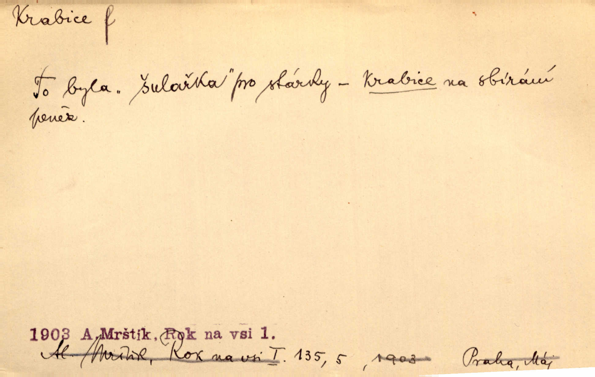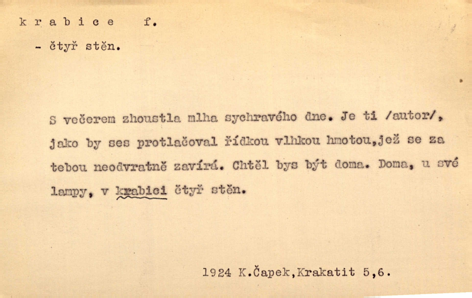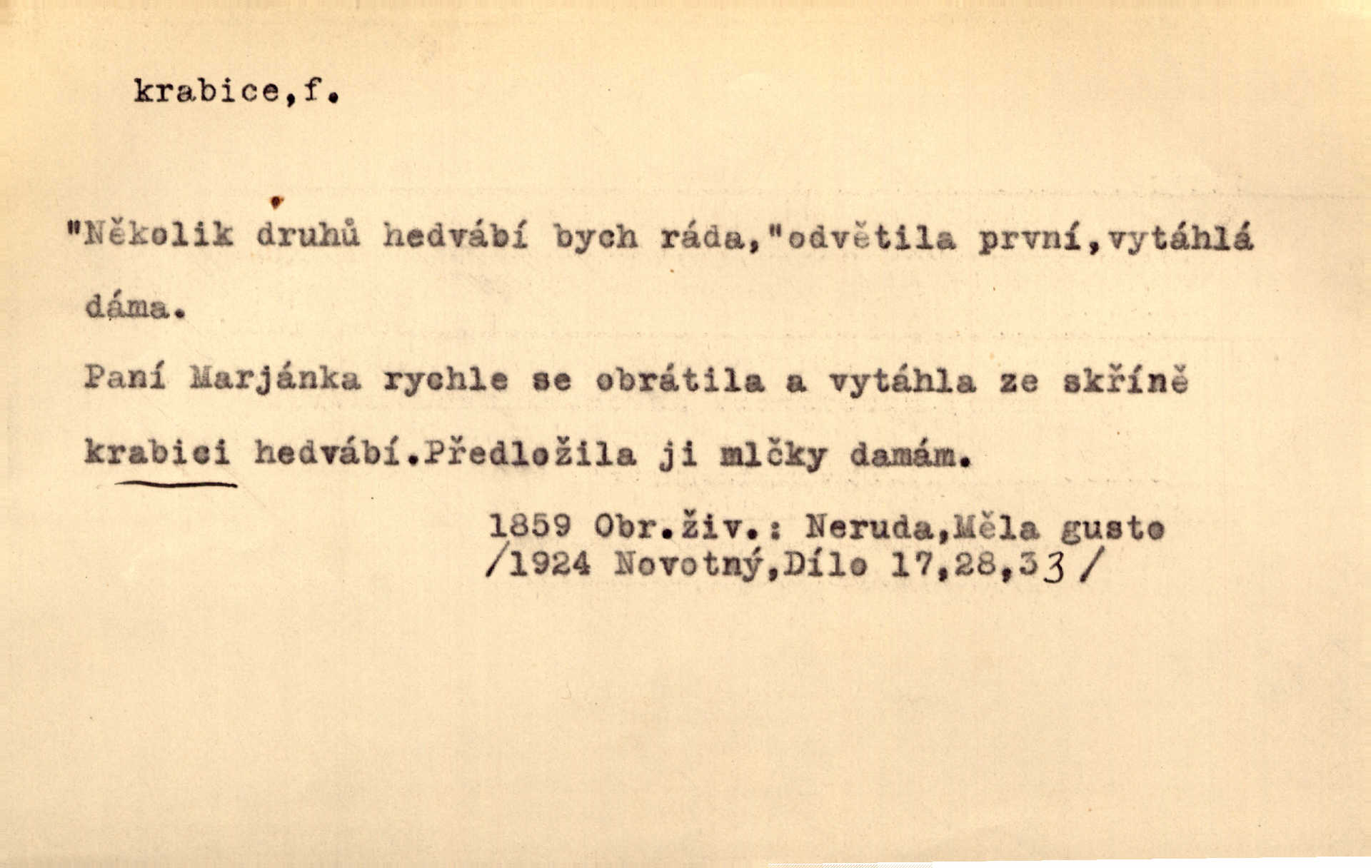 - krabice, -e f. škatule, schránka, skřínka. Hledá, otvírá šuple po šupleti, prohlíží schránky, krabice a skříně. Prav. Píchal [akcizák] do krabic s dorty. Vach. Přibral krabici olejových sardinek. Herrm. Vytáhla ze skříně krabici hedvábí. Ner. Krabice na klobouky. El. tech. odbočná krabice kruhová n. čtvercová skřínka s víkem, v níž se dráty spojují n. odbočují. D nadávka staré ženě, škatule. Čím pak může být taková stará krabice ve vašem spolku? Šamb.