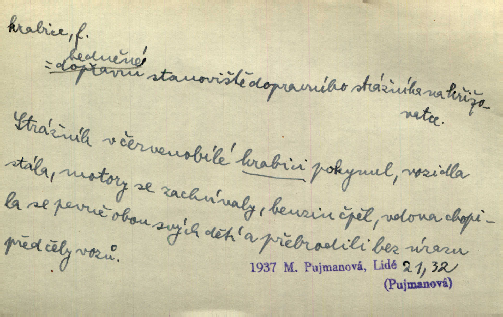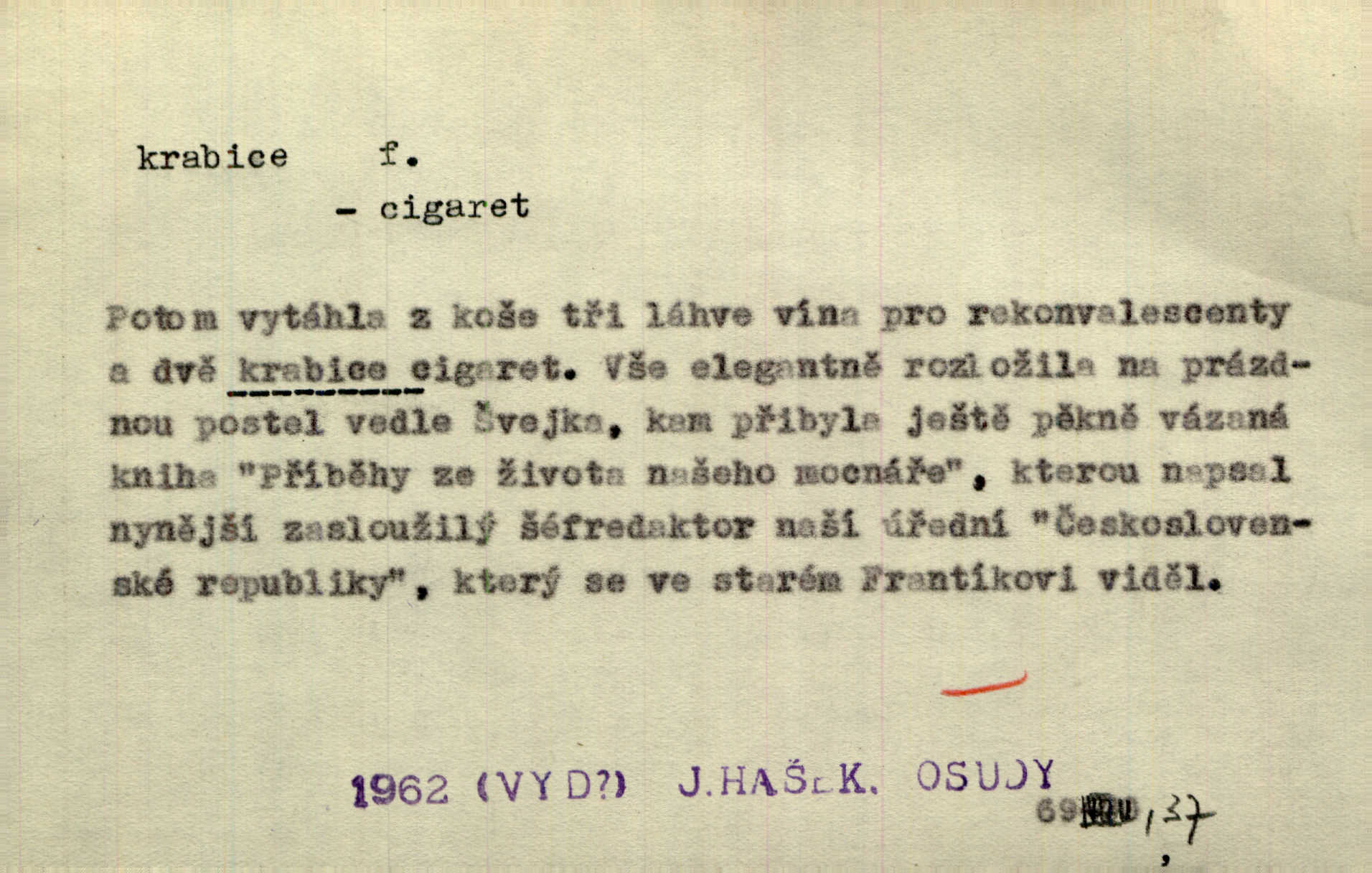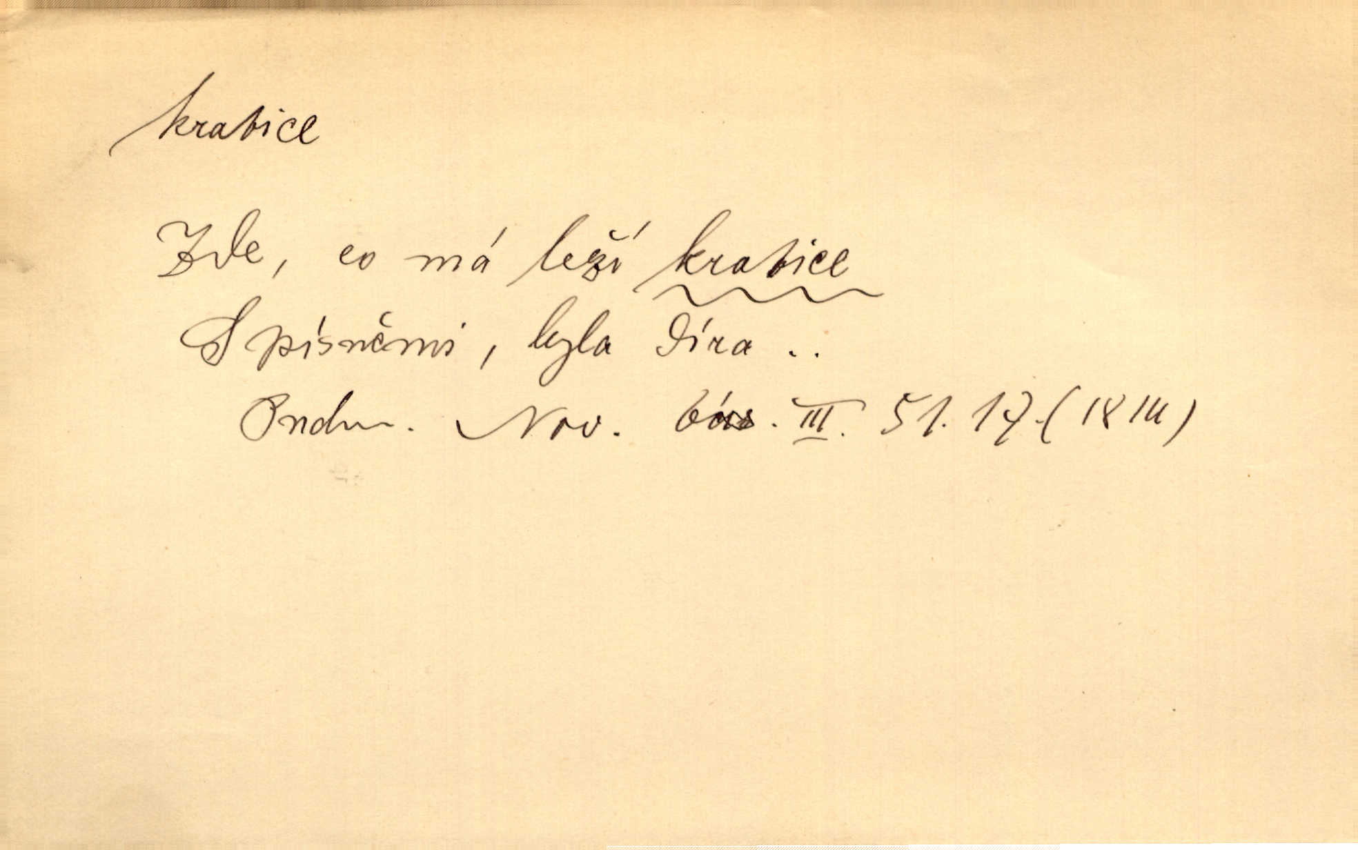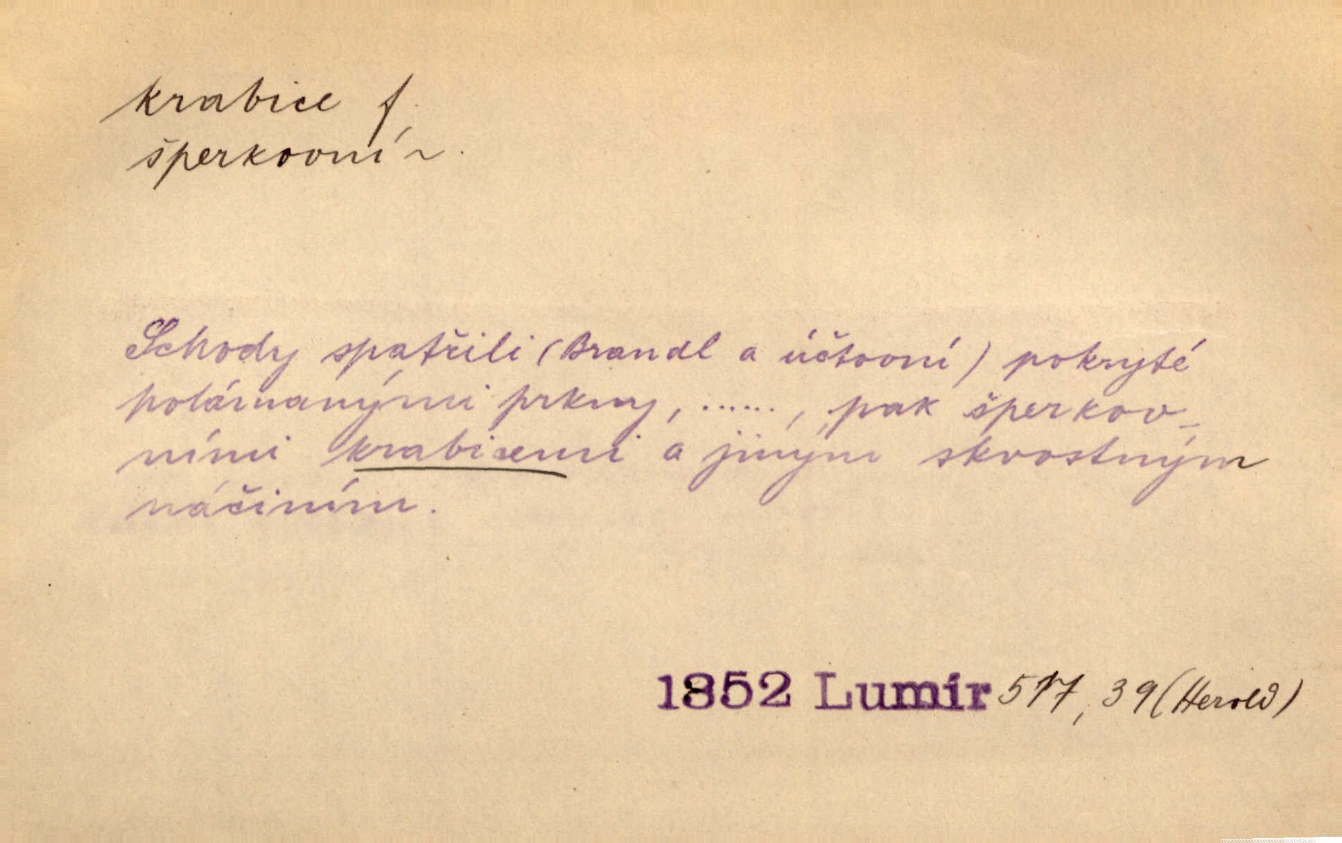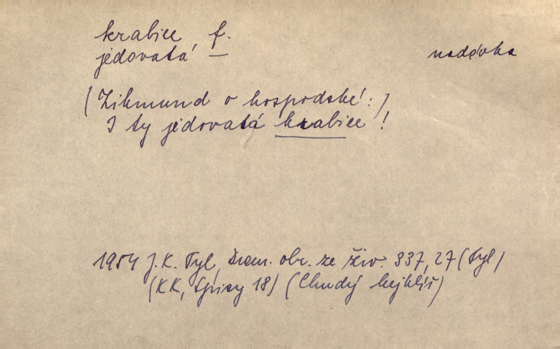 - krabice, -e f. škatule, schránka, skřínka. Hledá, otvírá šuple po šupleti, prohlíží schránky, krabice a skříně. Prav. Píchal [akcizák] do krabic s dorty. Vach. Přibral krabici olejových sardinek. Herrm. Vytáhla ze skříně krabici hedvábí. Ner. Krabice na klobouky. El. tech. odbočná krabice kruhová n. čtvercová skřínka s víkem, v níž se dráty spojují n. odbočují. D nadávka staré ženě, škatule. Čím pak může být taková stará krabice ve vašem spolku? Šamb.