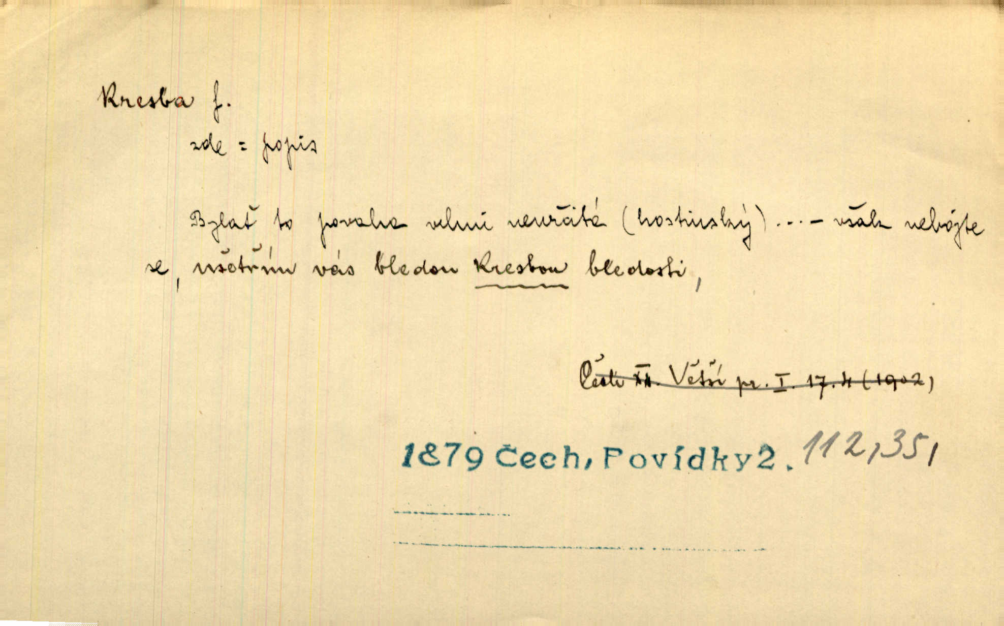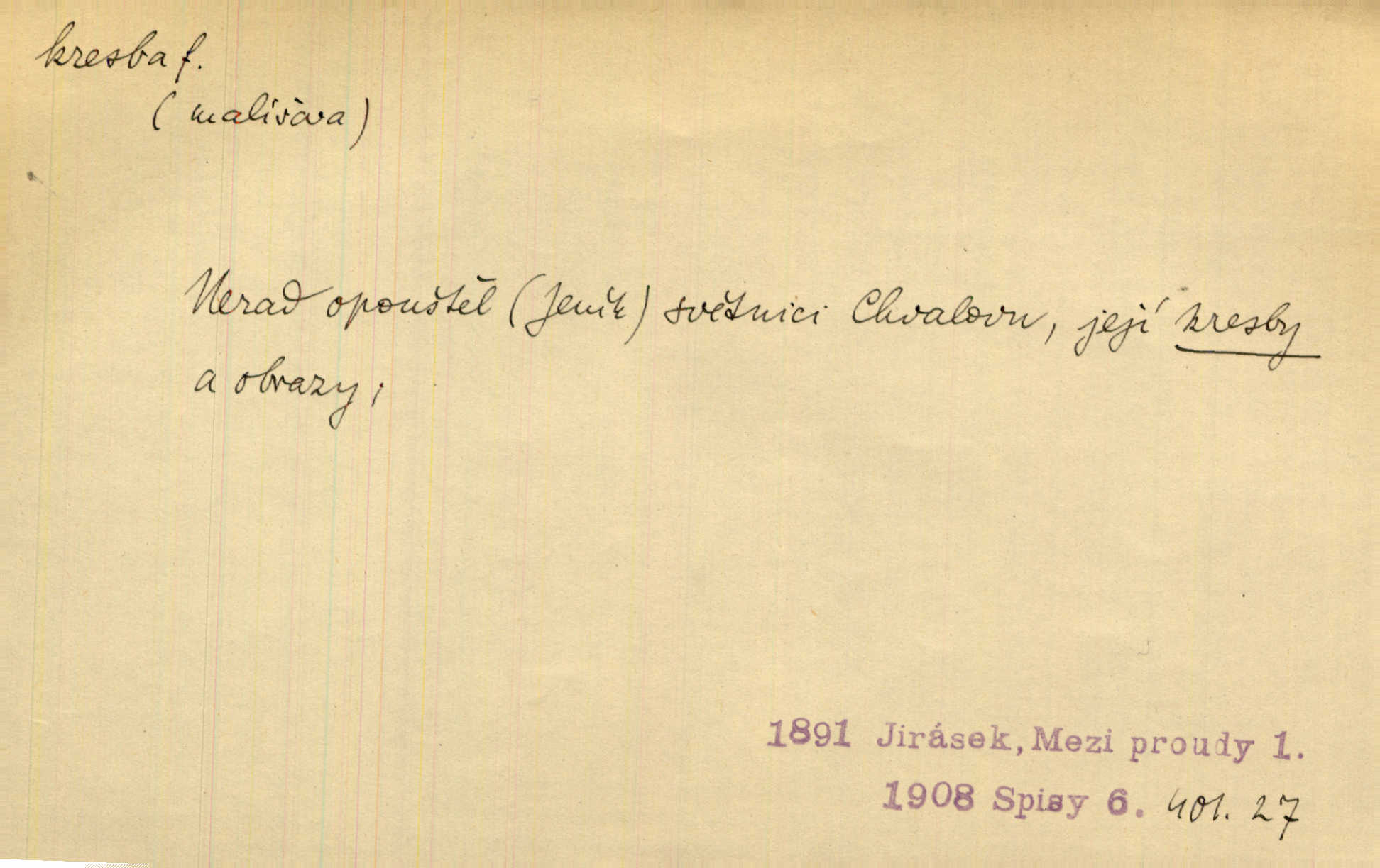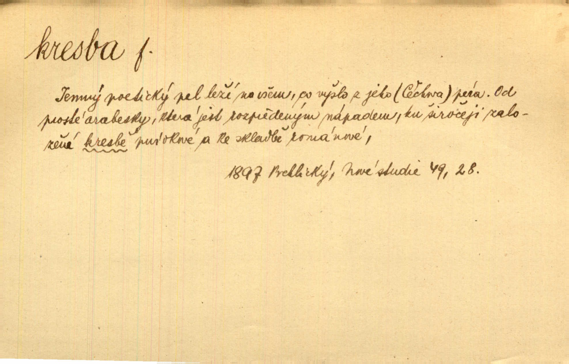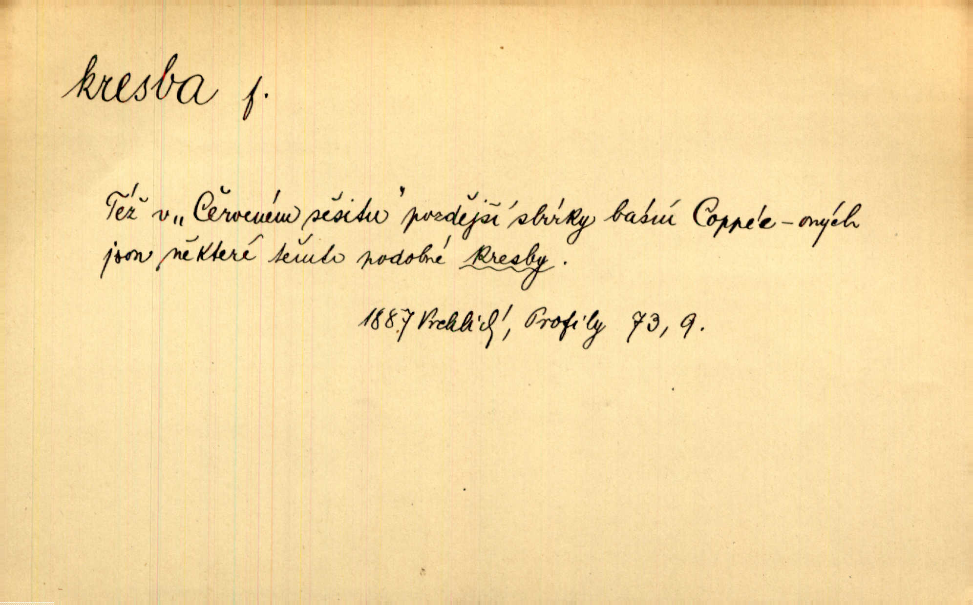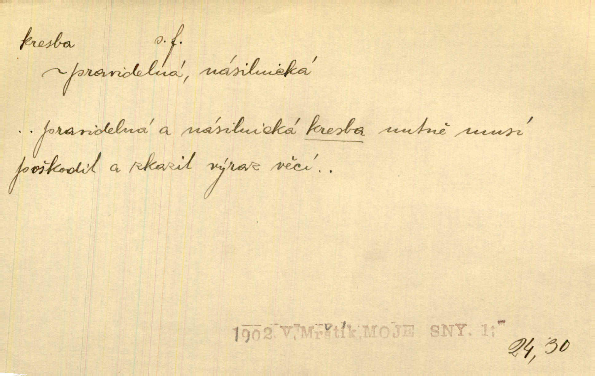 - kresba, -y f. zast. kreslení. Nepřijala ho [vévodkyně]‚ davši mu ohlásiti, že je kresbou pilně zaměstnána. Jir. D Výtv. umění zpodobovati tvary čarami. D něco nakresleného, nakreslený obraz, výkres. Kresby Kupkovy mluví řečí jasnou. Mach. Nerad opouštěl světnici, její kresby a obrazy. Jir. Červené štěnice s černými kresbami na křídelkách vyhřívaly se v houfech na kořeni topolu. Mach. D umělecké zpodobení jinak než kreslířsky, na př. literárně, hudebně, herecky. Vyniká „Lakomec“ hlavně mistrovskou kresbou Harpagona. Vrch. L. spatřuje Smetanovu dramatickou sílu při „Prodané nevěstě“ v hudební kresbě postavy Kecalovy. Smet. D drobné literární dílo. Kresby z Ještědí. Svět. Kresby z hor. Vrch.