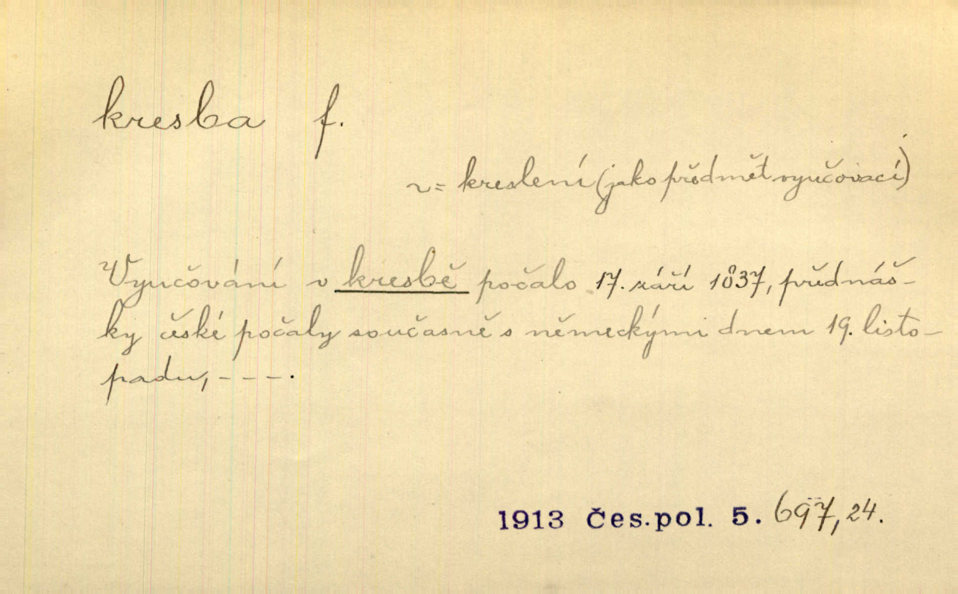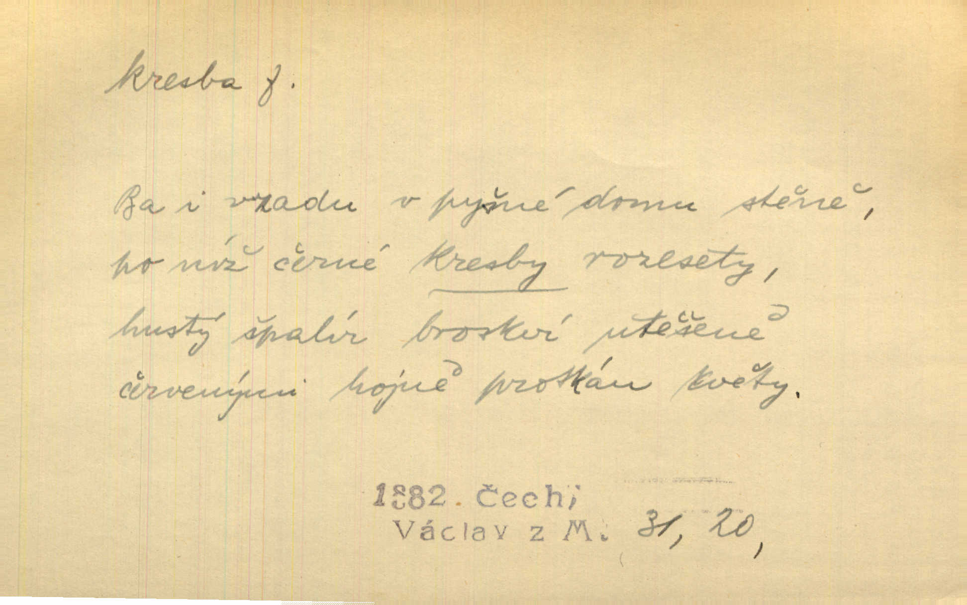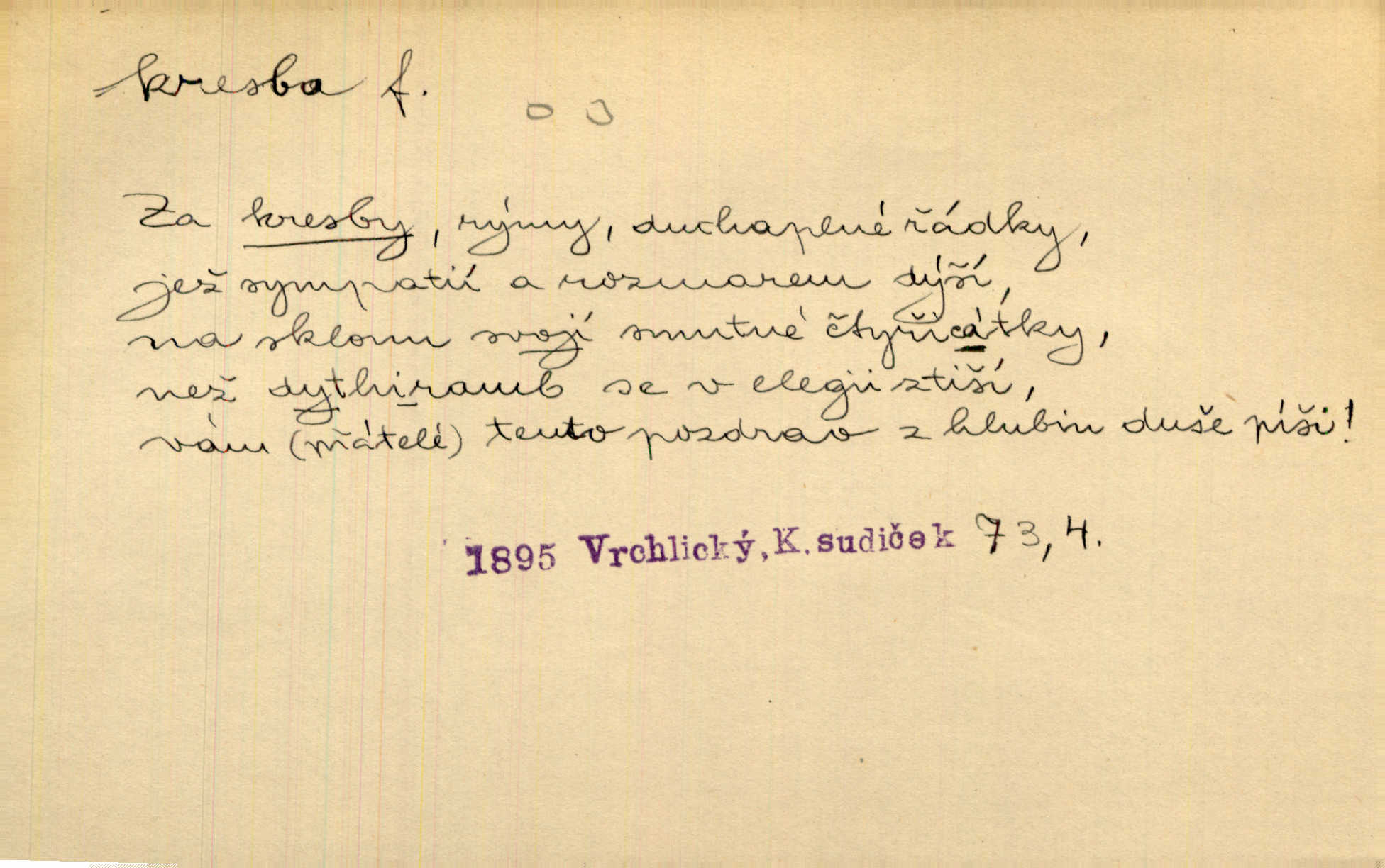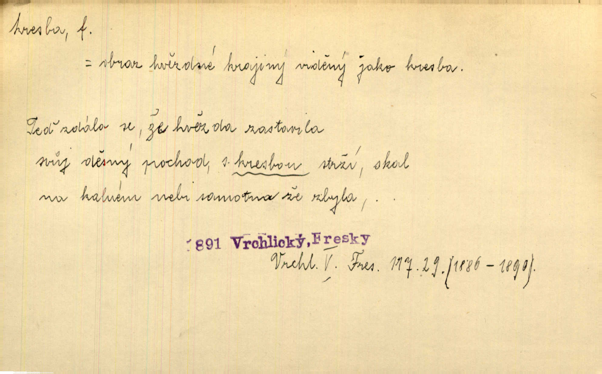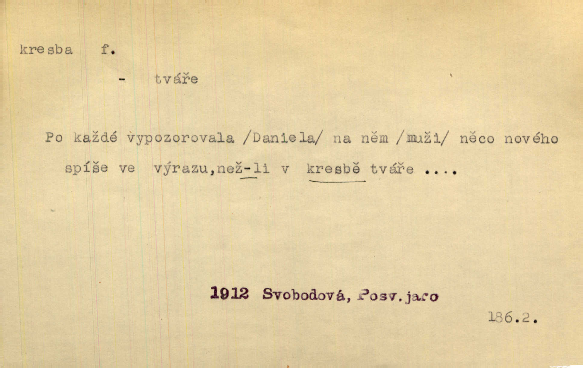 - kresba, -y f. zast. kreslení. Nepřijala ho [vévodkyně]‚ davši mu ohlásiti, že je kresbou pilně zaměstnána. Jir. D Výtv. umění zpodobovati tvary čarami. D něco nakresleného, nakreslený obraz, výkres. Kresby Kupkovy mluví řečí jasnou. Mach. Nerad opouštěl světnici, její kresby a obrazy. Jir. Červené štěnice s černými kresbami na křídelkách vyhřívaly se v houfech na kořeni topolu. Mach. D umělecké zpodobení jinak než kreslířsky, na př. literárně, hudebně, herecky. Vyniká „Lakomec“ hlavně mistrovskou kresbou Harpagona. Vrch. L. spatřuje Smetanovu dramatickou sílu při „Prodané nevěstě“ v hudební kresbě postavy Kecalovy. Smet. D drobné literární dílo. Kresby z Ještědí. Svět. Kresby z hor. Vrch.