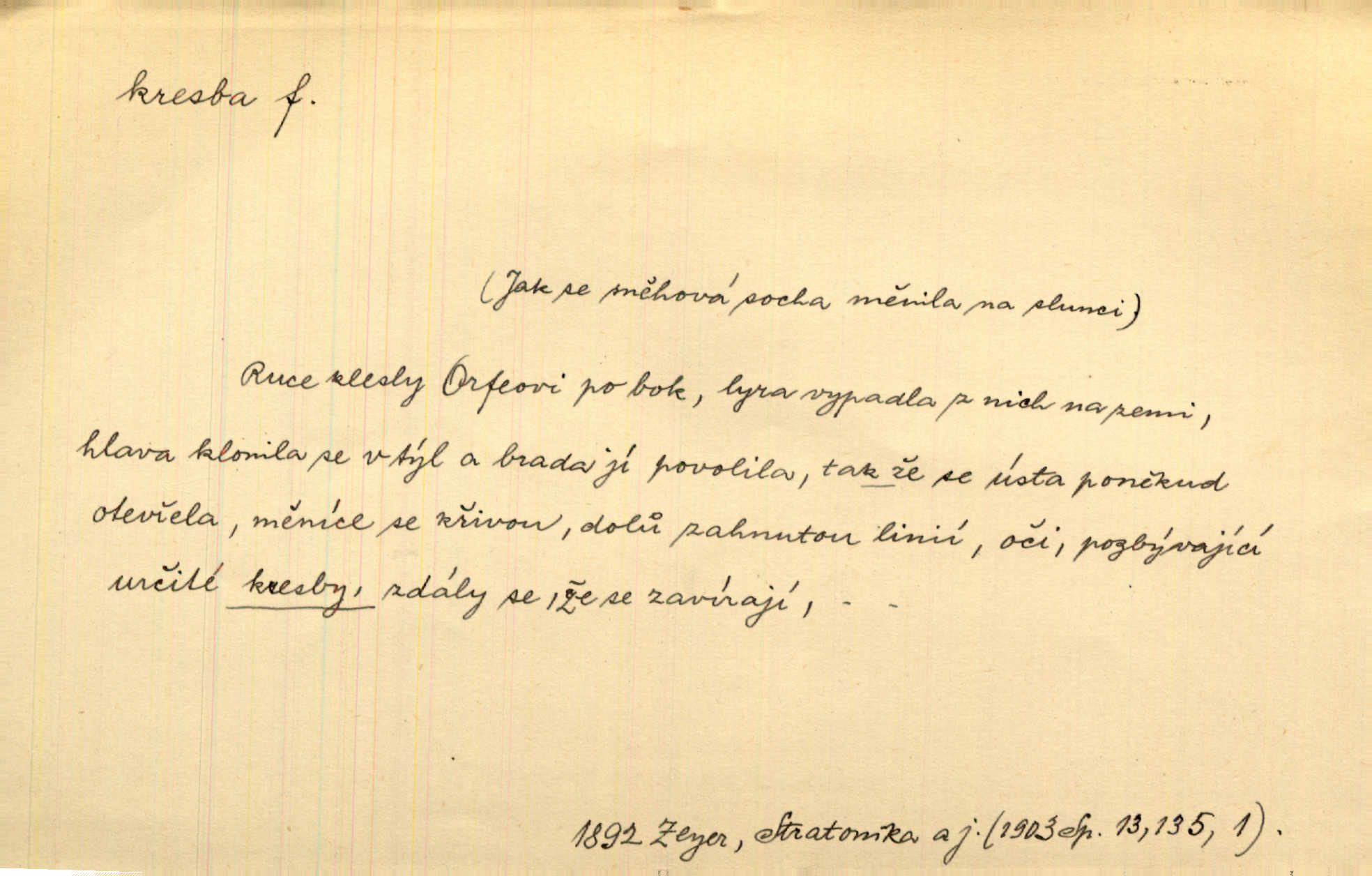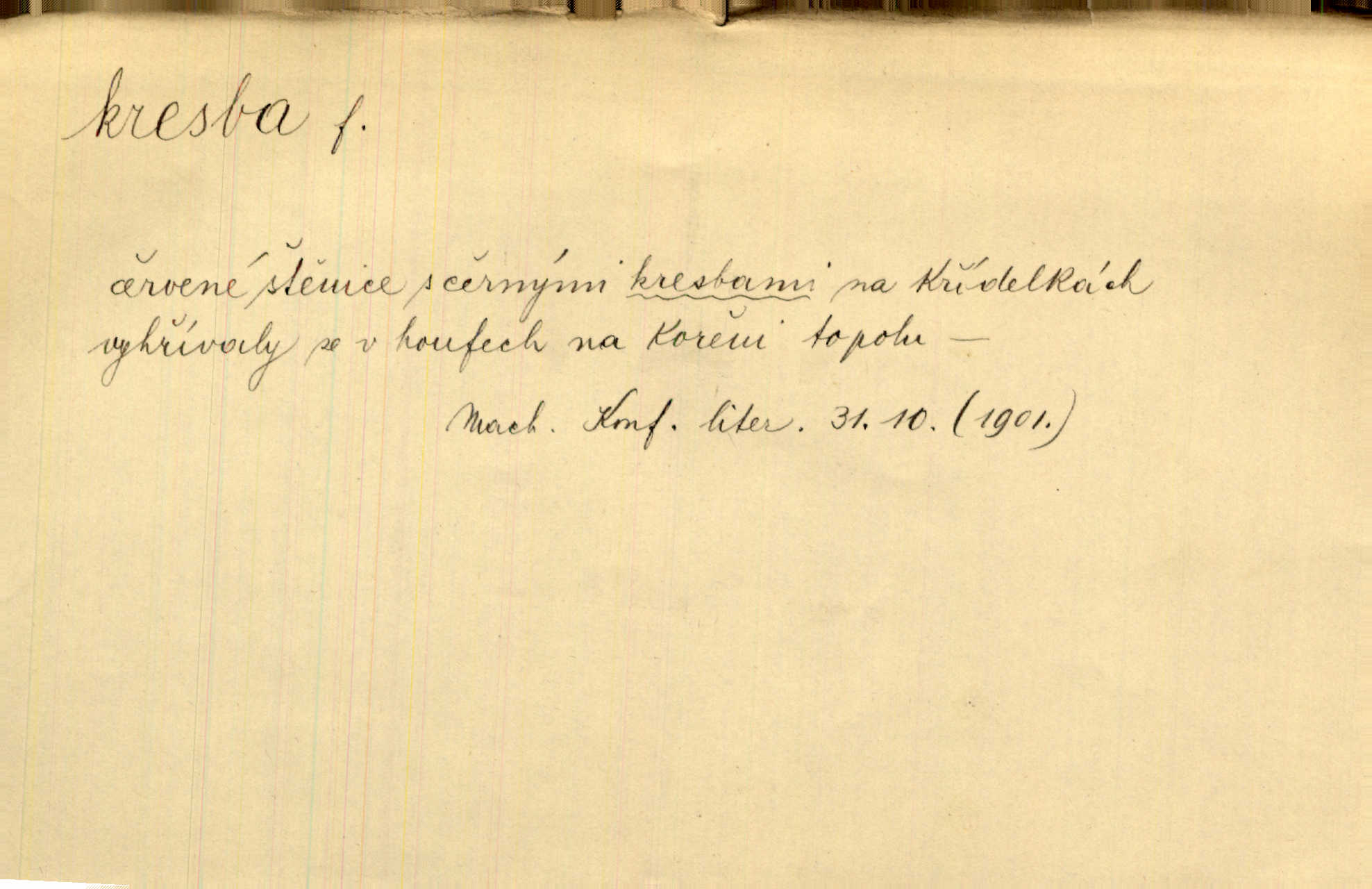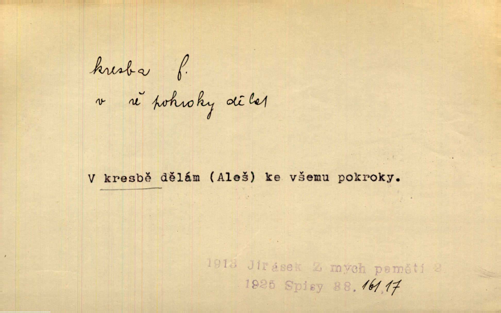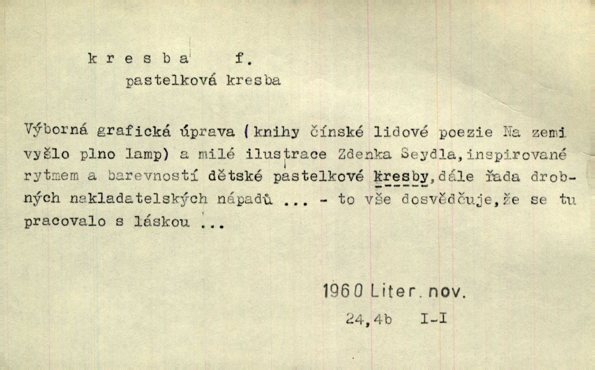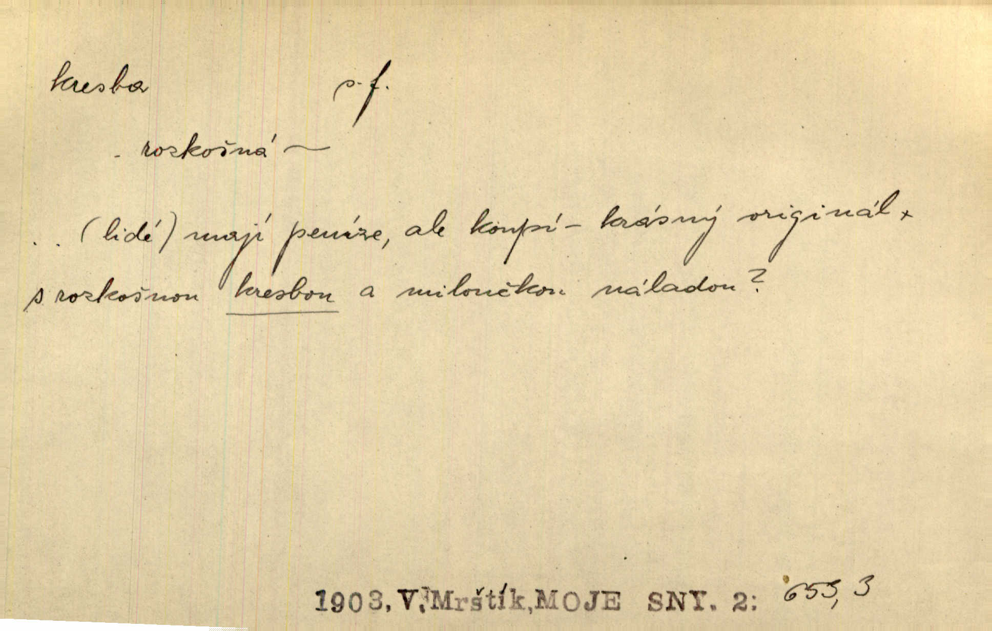 - kresba, -y f. zast. kreslení. Nepřijala ho [vévodkyně]‚ davši mu ohlásiti, že je kresbou pilně zaměstnána. Jir. D Výtv. umění zpodobovati tvary čarami. D něco nakresleného, nakreslený obraz, výkres. Kresby Kupkovy mluví řečí jasnou. Mach. Nerad opouštěl světnici, její kresby a obrazy. Jir. Červené štěnice s černými kresbami na křídelkách vyhřívaly se v houfech na kořeni topolu. Mach. D umělecké zpodobení jinak než kreslířsky, na př. literárně, hudebně, herecky. Vyniká „Lakomec“ hlavně mistrovskou kresbou Harpagona. Vrch. L. spatřuje Smetanovu dramatickou sílu při „Prodané nevěstě“ v hudební kresbě postavy Kecalovy. Smet. D drobné literární dílo. Kresby z Ještědí. Svět. Kresby z hor. Vrch.