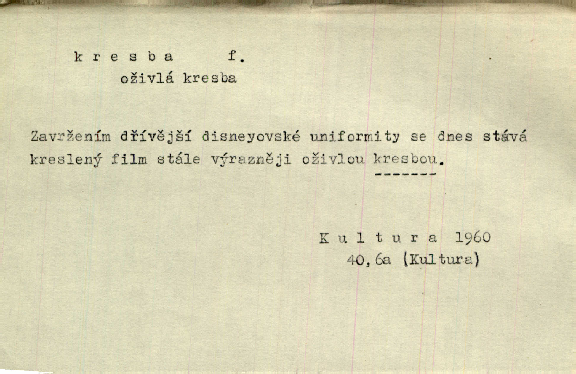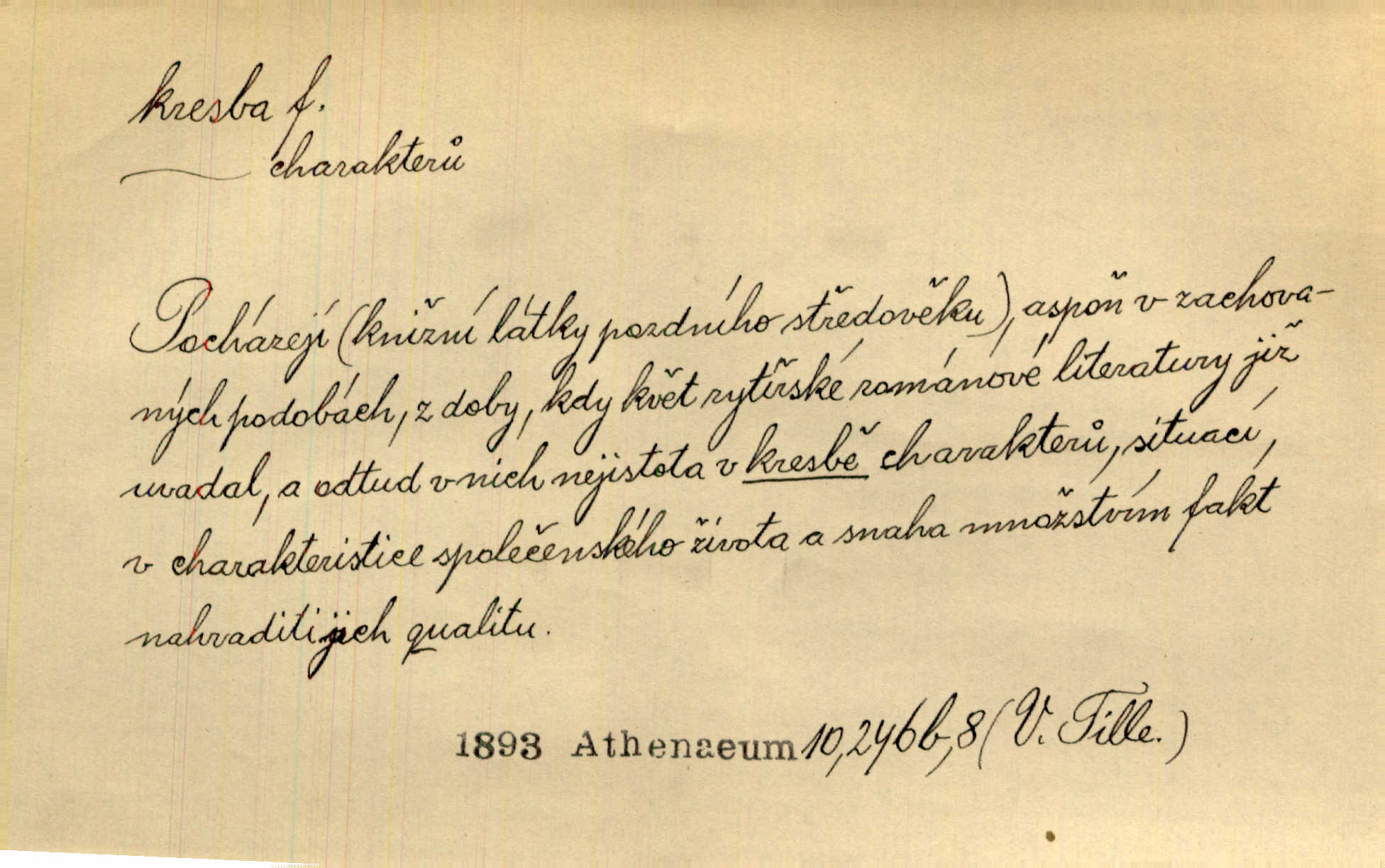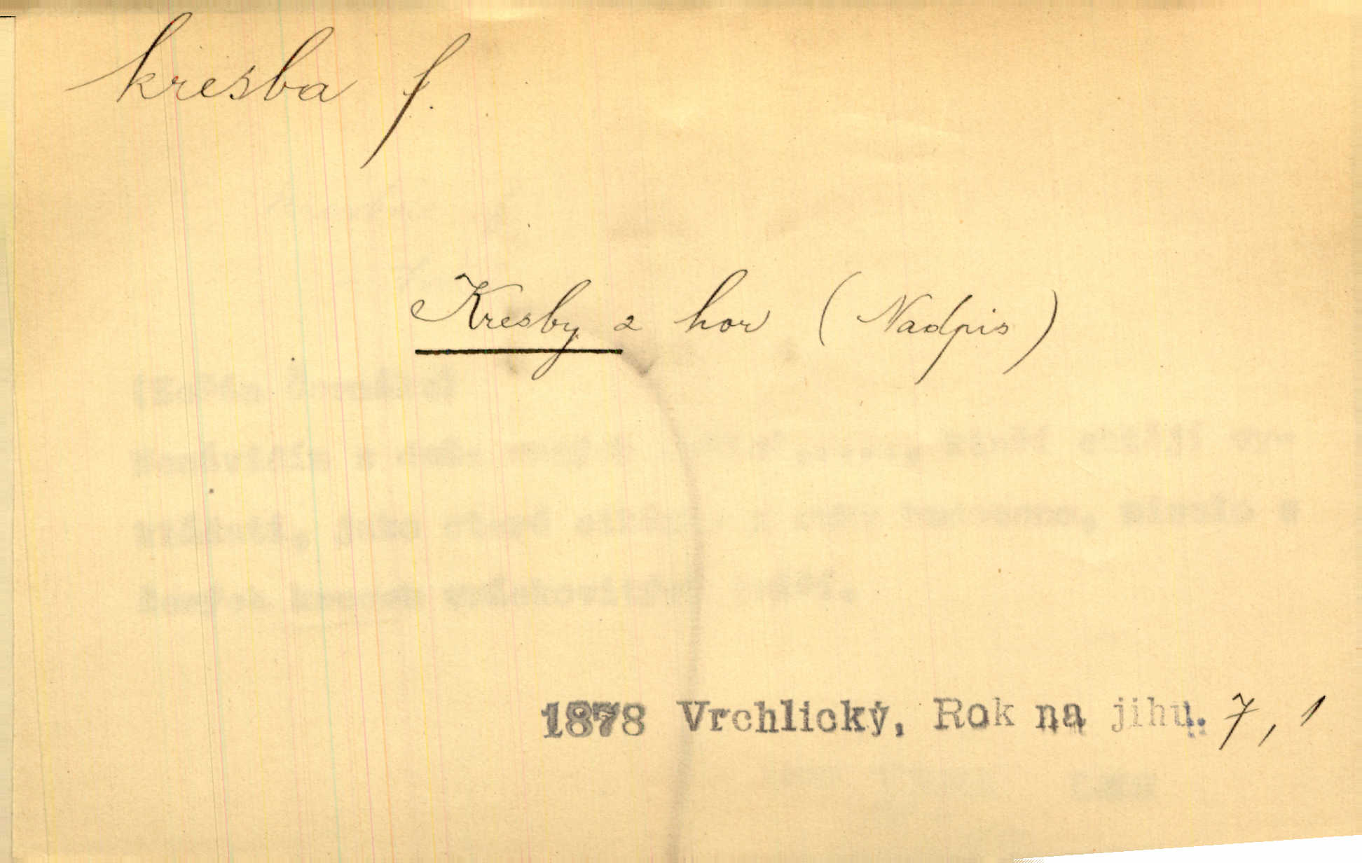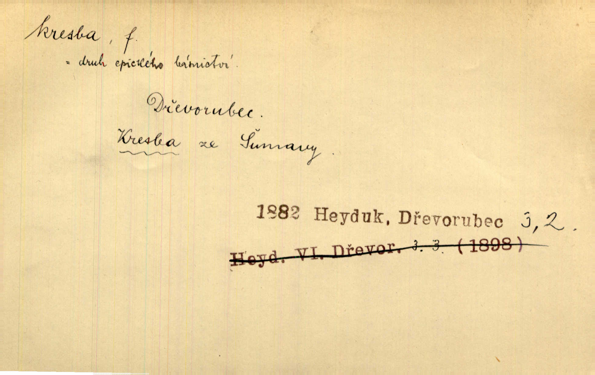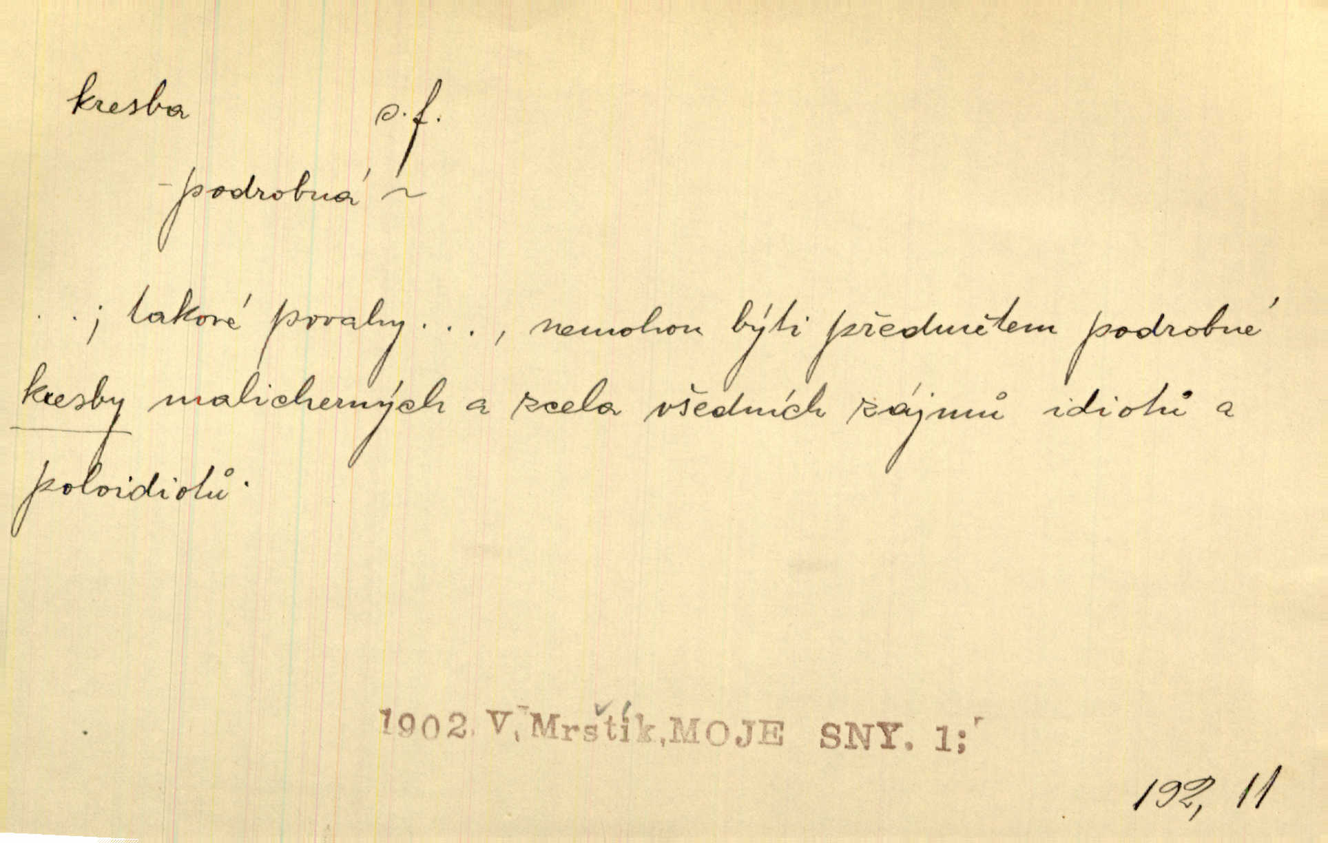 - kresba, -y f. zast. kreslení. Nepřijala ho [vévodkyně]‚ davši mu ohlásiti, že je kresbou pilně zaměstnána. Jir. D Výtv. umění zpodobovati tvary čarami. D něco nakresleného, nakreslený obraz, výkres. Kresby Kupkovy mluví řečí jasnou. Mach. Nerad opouštěl světnici, její kresby a obrazy. Jir. Červené štěnice s černými kresbami na křídelkách vyhřívaly se v houfech na kořeni topolu. Mach. D umělecké zpodobení jinak než kreslířsky, na př. literárně, hudebně, herecky. Vyniká „Lakomec“ hlavně mistrovskou kresbou Harpagona. Vrch. L. spatřuje Smetanovu dramatickou sílu při „Prodané nevěstě“ v hudební kresbě postavy Kecalovy. Smet. D drobné literární dílo. Kresby z Ještědí. Svět. Kresby z hor. Vrch.