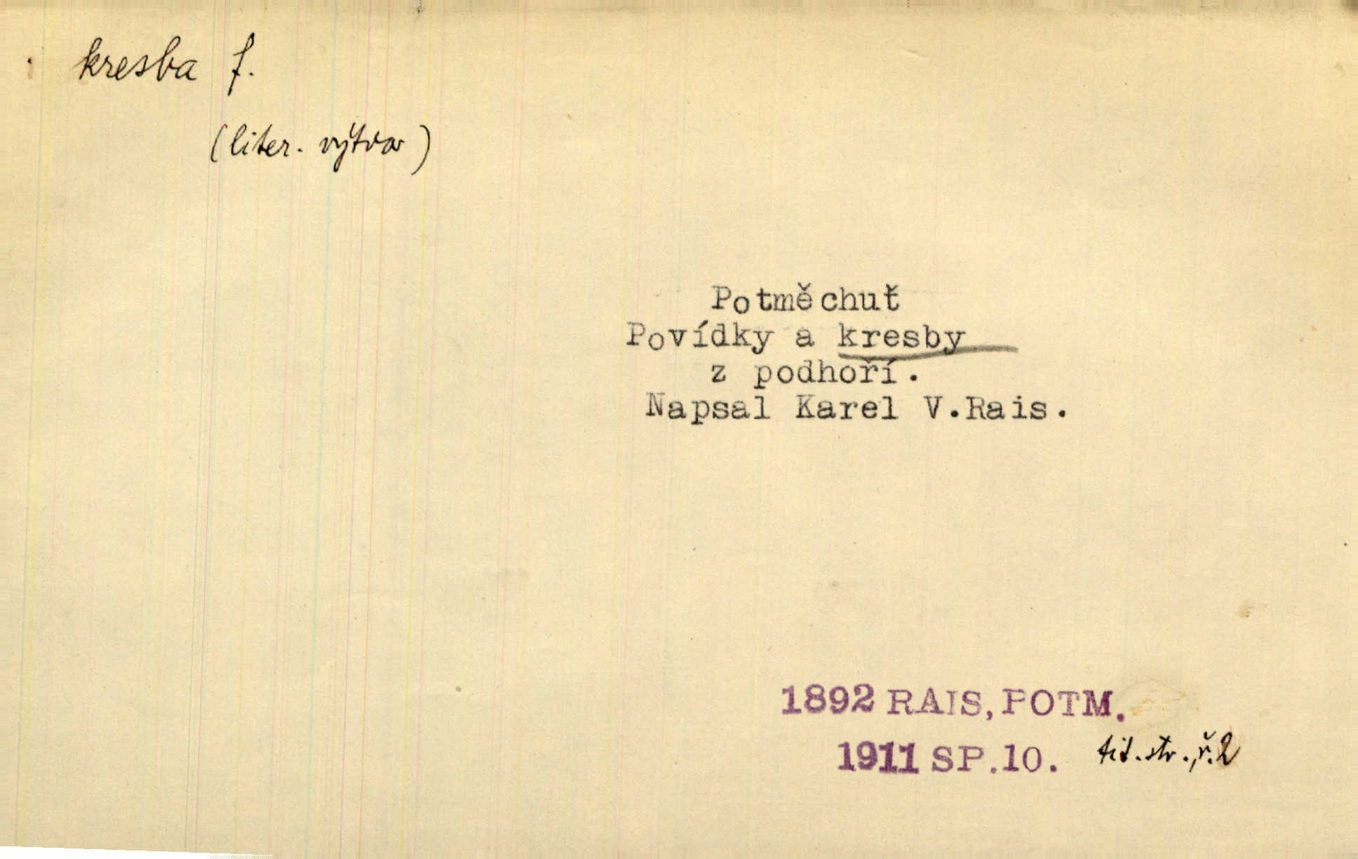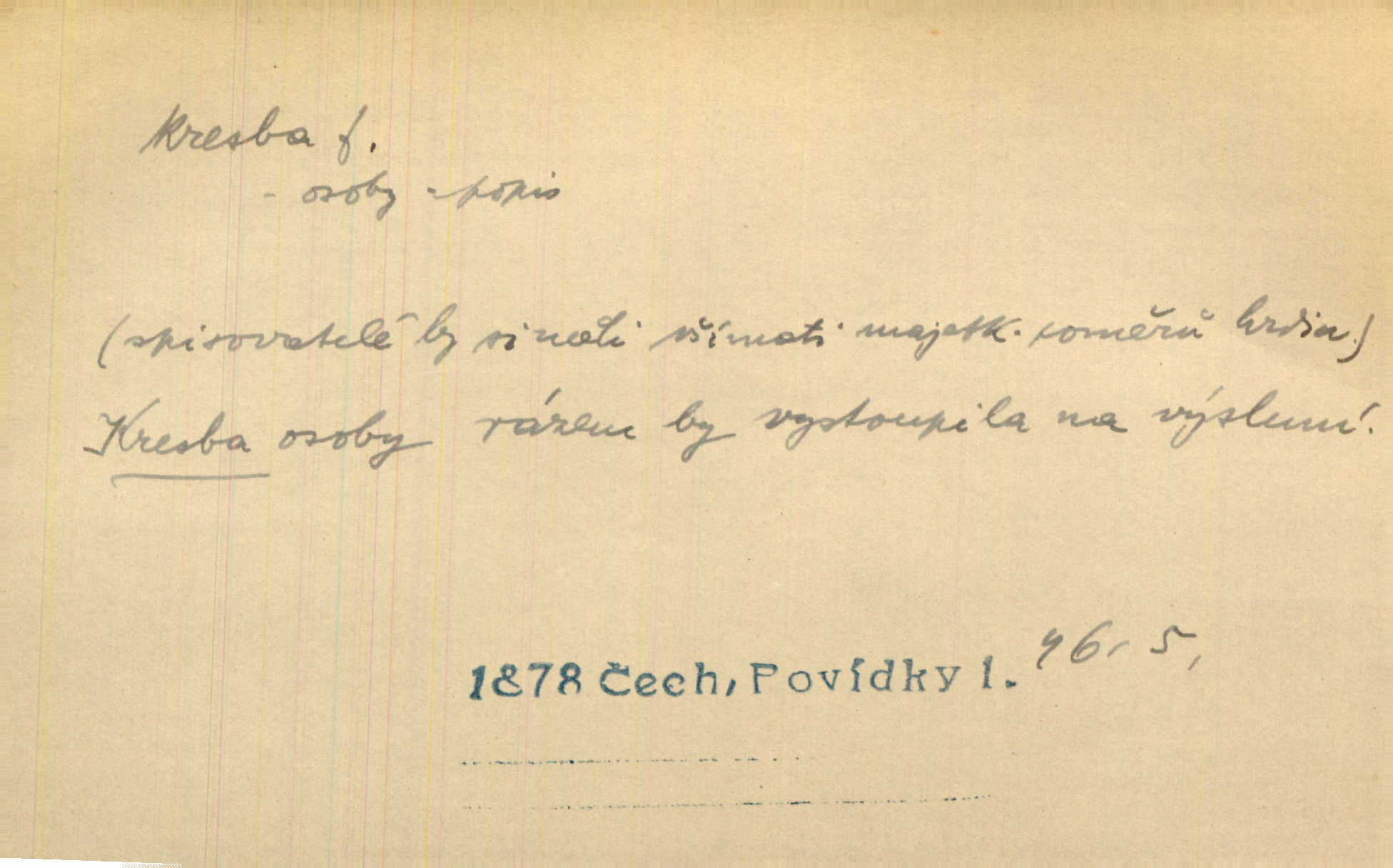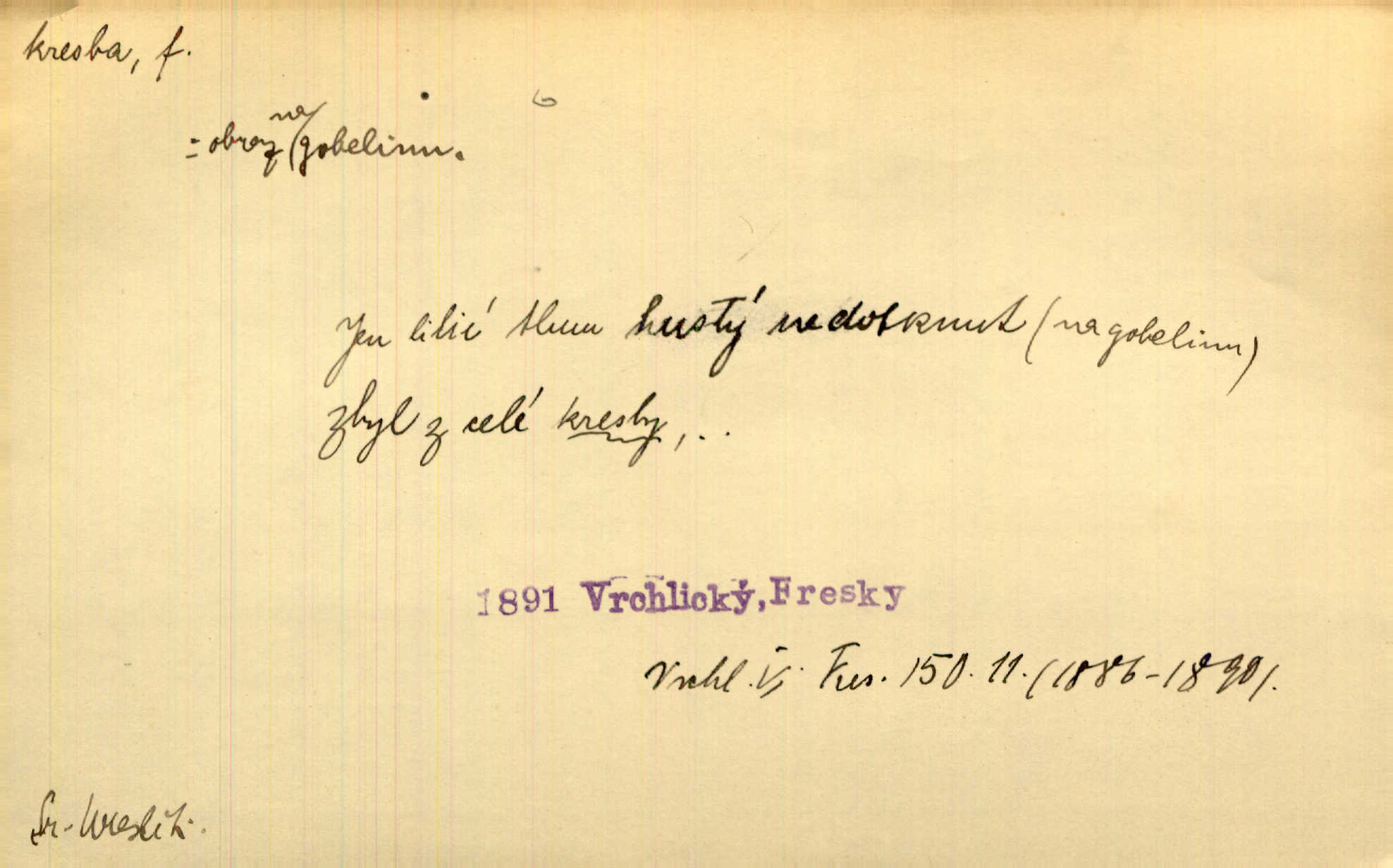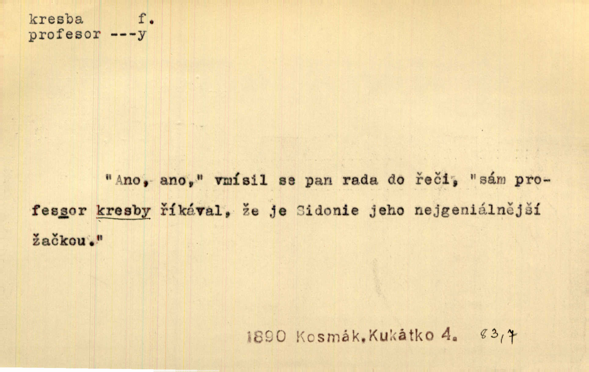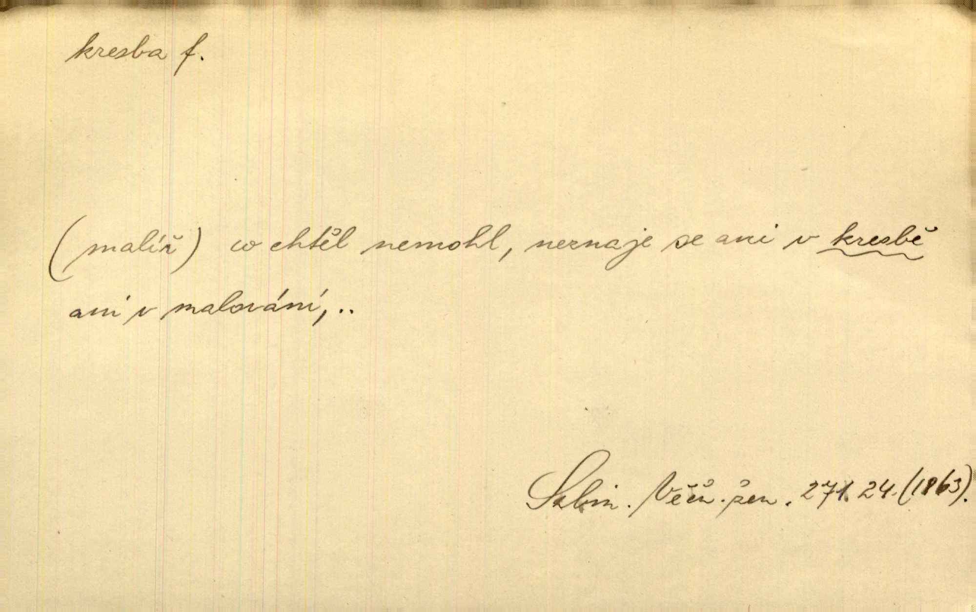 - kresba, -y f. zast. kreslení. Nepřijala ho [vévodkyně]‚ davši mu ohlásiti, že je kresbou pilně zaměstnána. Jir. D Výtv. umění zpodobovati tvary čarami. D něco nakresleného, nakreslený obraz, výkres. Kresby Kupkovy mluví řečí jasnou. Mach. Nerad opouštěl světnici, její kresby a obrazy. Jir. Červené štěnice s černými kresbami na křídelkách vyhřívaly se v houfech na kořeni topolu. Mach. D umělecké zpodobení jinak než kreslířsky, na př. literárně, hudebně, herecky. Vyniká „Lakomec“ hlavně mistrovskou kresbou Harpagona. Vrch. L. spatřuje Smetanovu dramatickou sílu při „Prodané nevěstě“ v hudební kresbě postavy Kecalovy. Smet. D drobné literární dílo. Kresby z Ještědí. Svět. Kresby z hor. Vrch.
