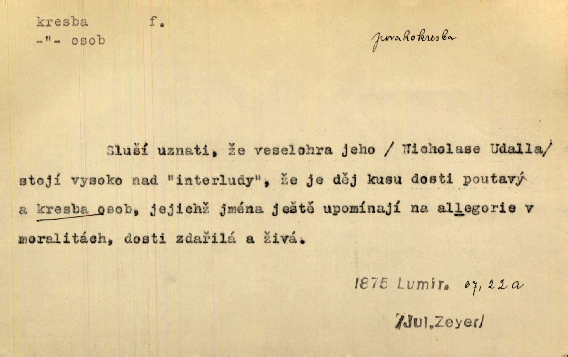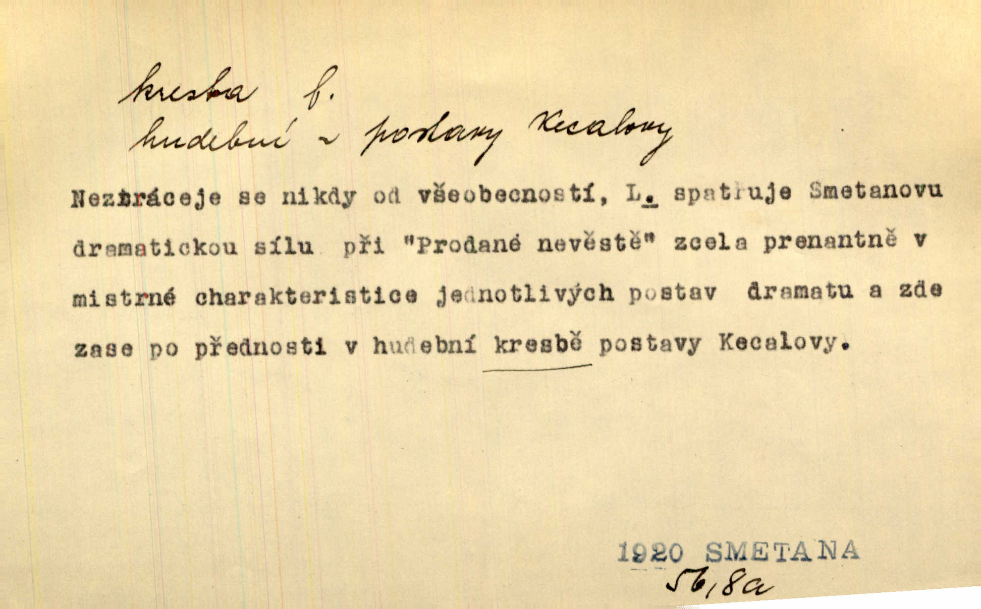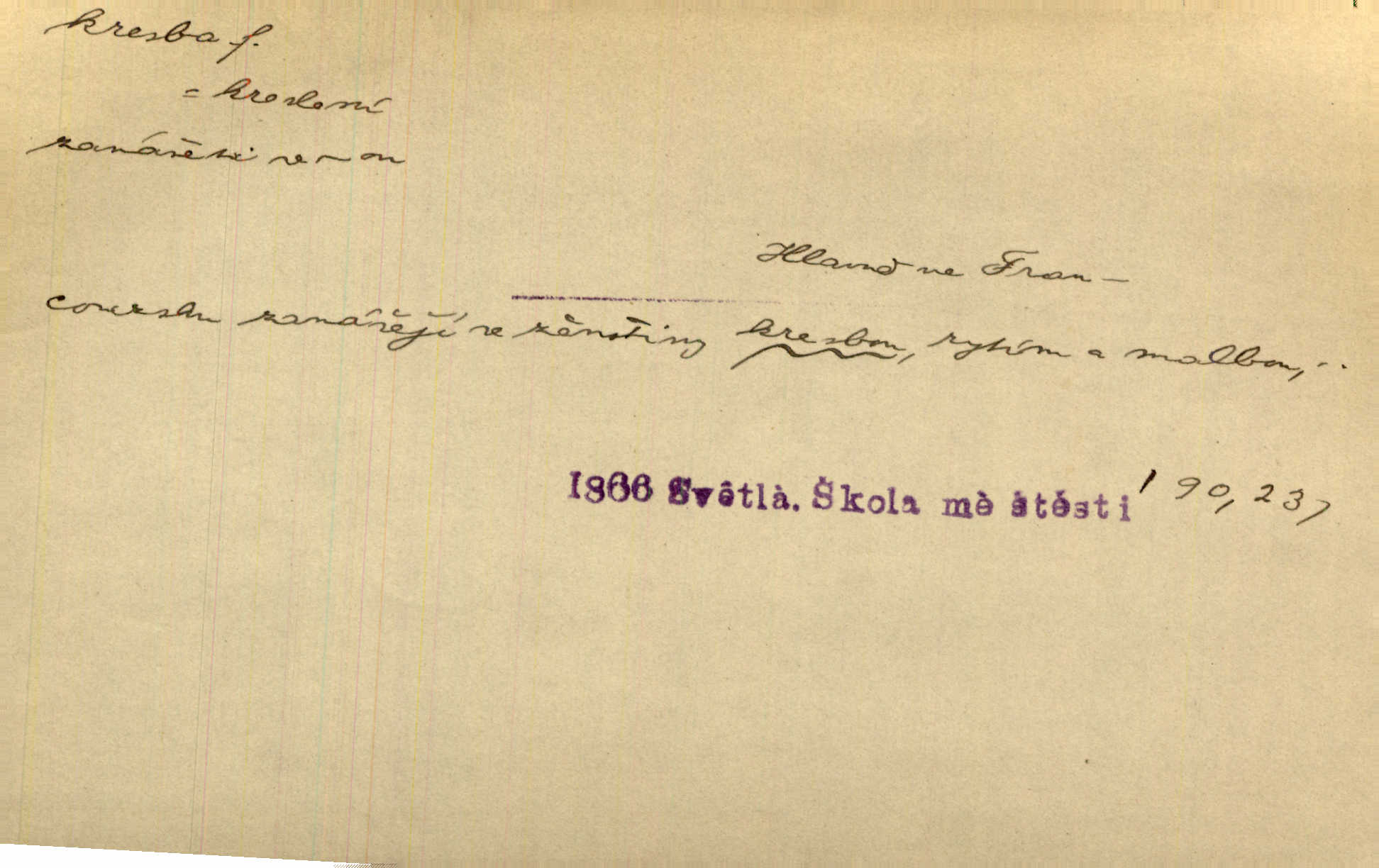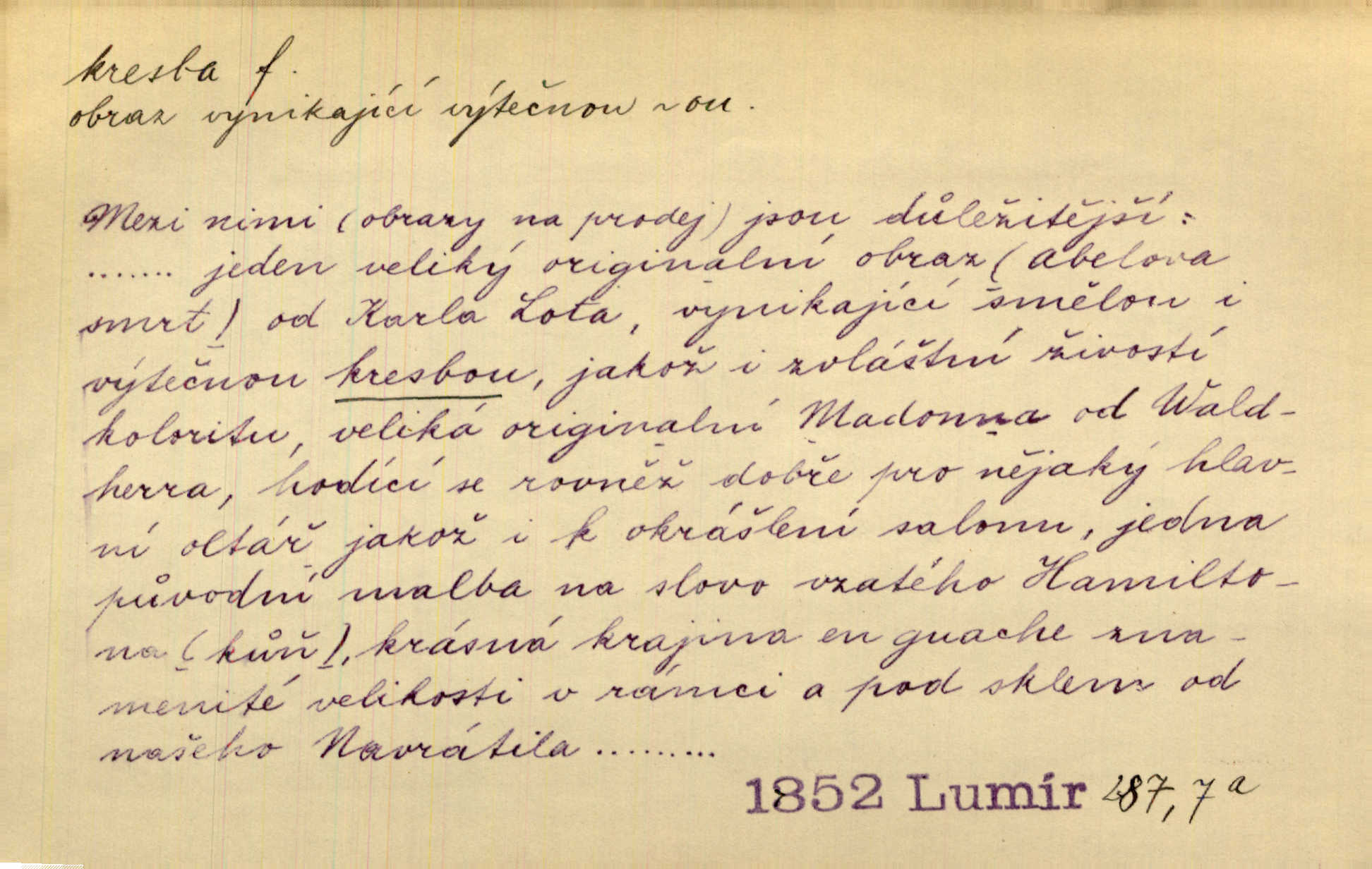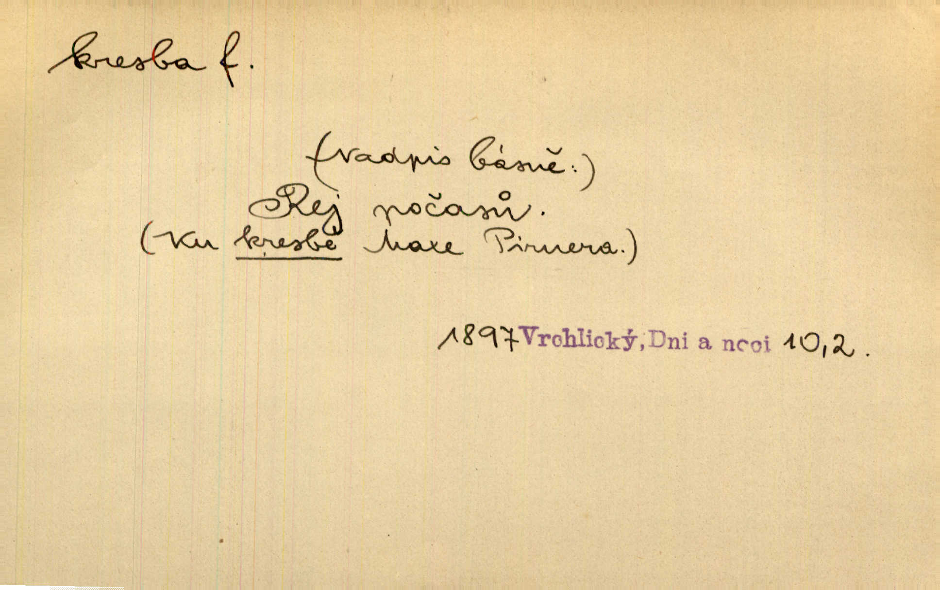 - kresba, -y f. zast. kreslení. Nepřijala ho [vévodkyně]‚ davši mu ohlásiti, že je kresbou pilně zaměstnána. Jir. D Výtv. umění zpodobovati tvary čarami. D něco nakresleného, nakreslený obraz, výkres. Kresby Kupkovy mluví řečí jasnou. Mach. Nerad opouštěl světnici, její kresby a obrazy. Jir. Červené štěnice s černými kresbami na křídelkách vyhřívaly se v houfech na kořeni topolu. Mach. D umělecké zpodobení jinak než kreslířsky, na př. literárně, hudebně, herecky. Vyniká „Lakomec“ hlavně mistrovskou kresbou Harpagona. Vrch. L. spatřuje Smetanovu dramatickou sílu při „Prodané nevěstě“ v hudební kresbě postavy Kecalovy. Smet. D drobné literární dílo. Kresby z Ještědí. Svět. Kresby z hor. Vrch.