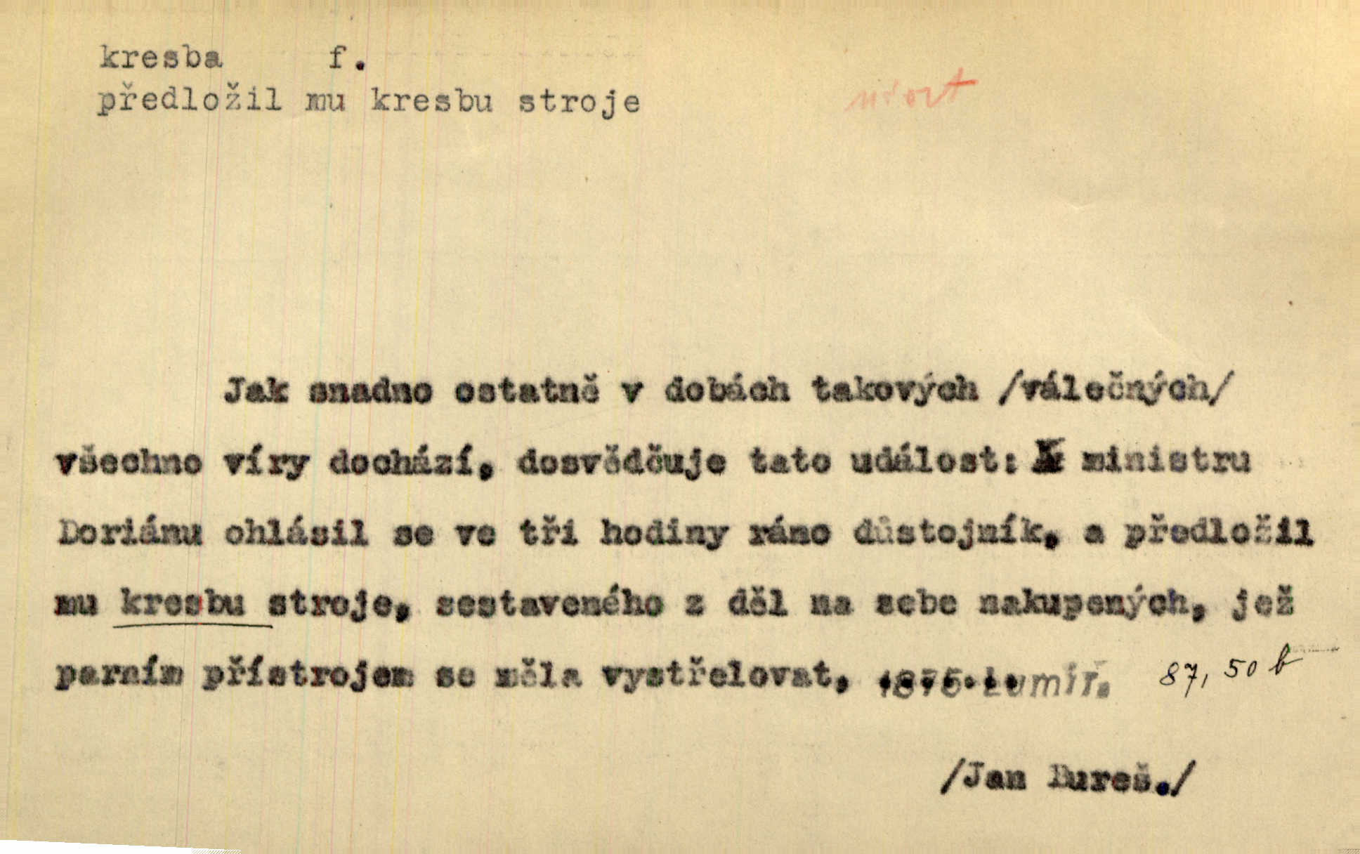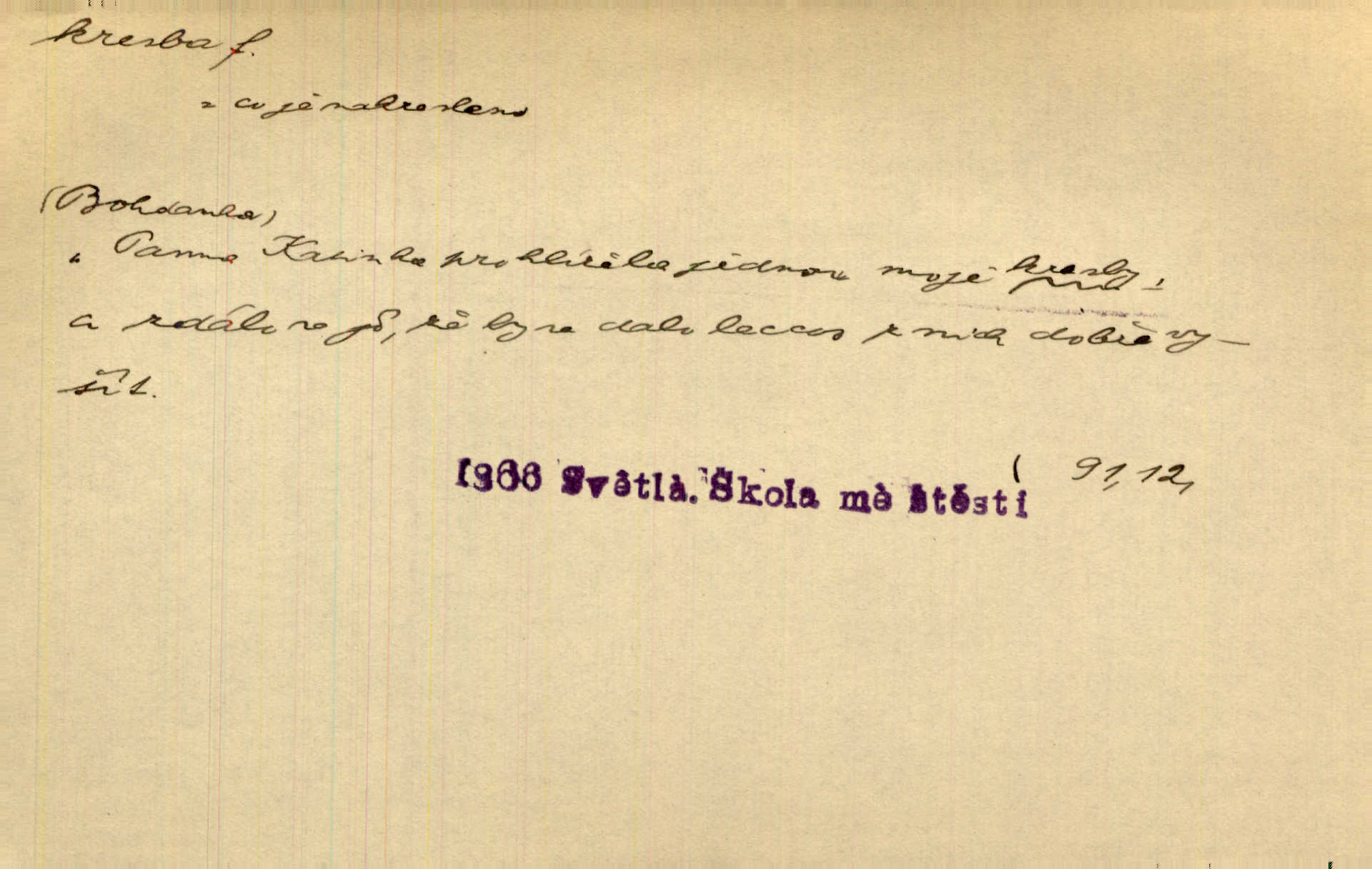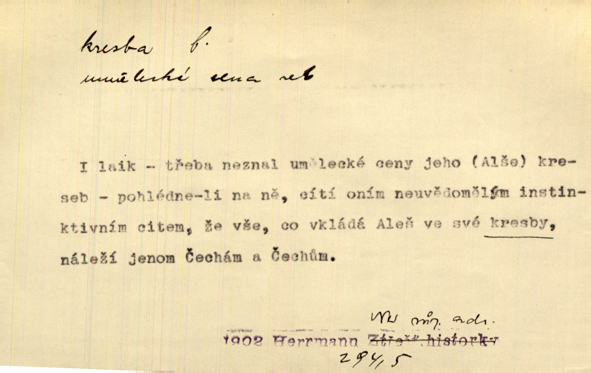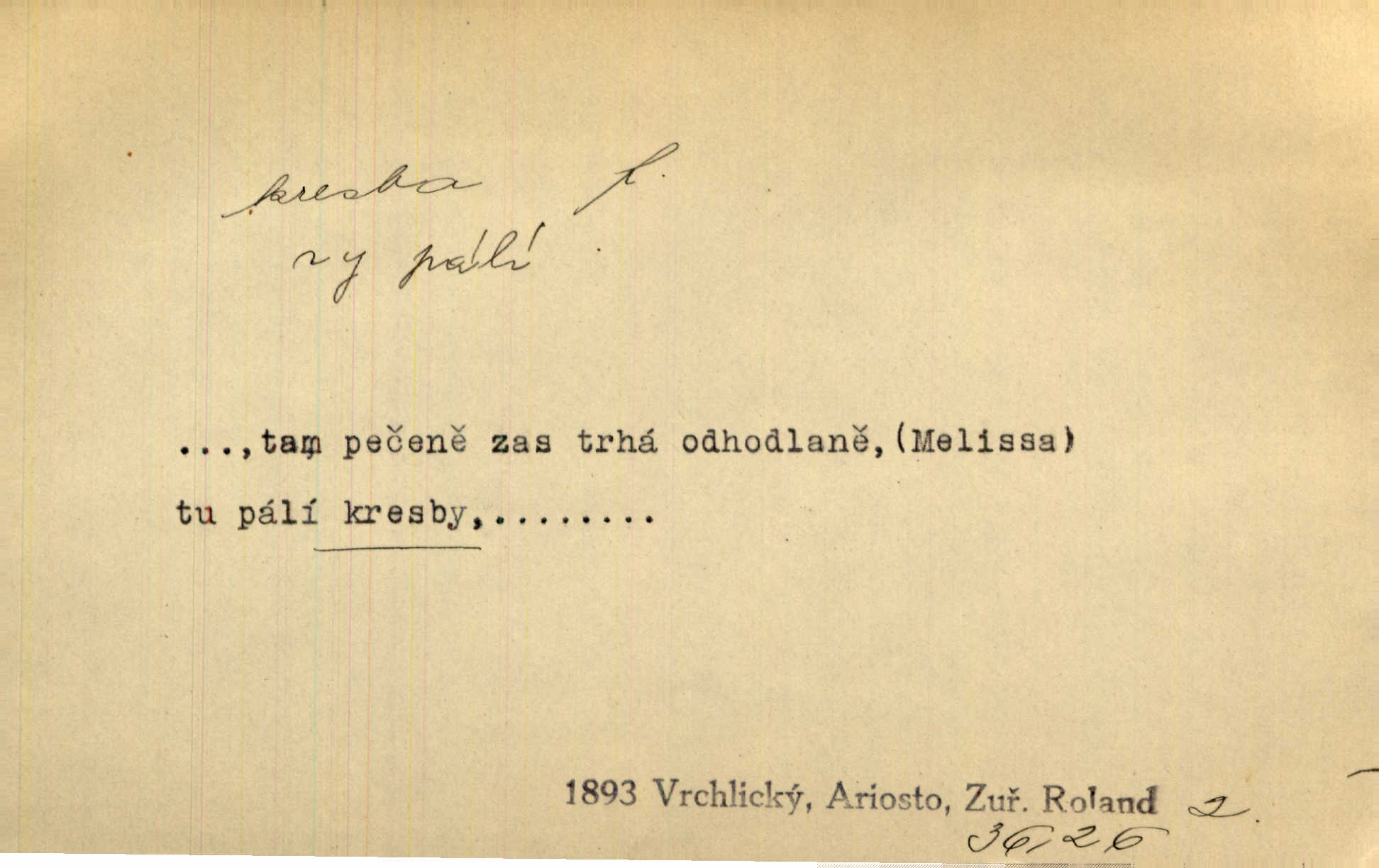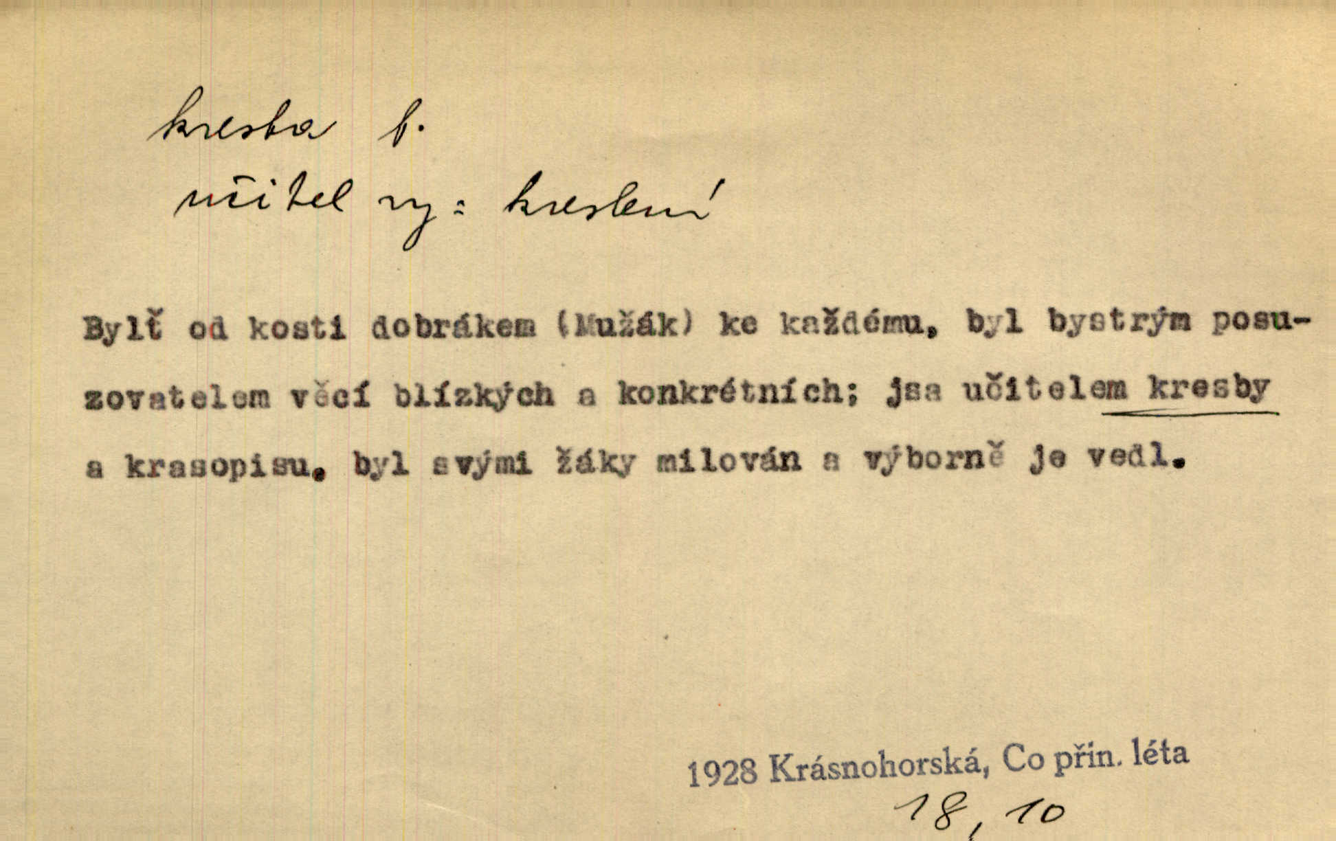 - kresba, -y f. zast. kreslení. Nepřijala ho [vévodkyně]‚ davši mu ohlásiti, že je kresbou pilně zaměstnána. Jir. D Výtv. umění zpodobovati tvary čarami. D něco nakresleného, nakreslený obraz, výkres. Kresby Kupkovy mluví řečí jasnou. Mach. Nerad opouštěl světnici, její kresby a obrazy. Jir. Červené štěnice s černými kresbami na křídelkách vyhřívaly se v houfech na kořeni topolu. Mach. D umělecké zpodobení jinak než kreslířsky, na př. literárně, hudebně, herecky. Vyniká „Lakomec“ hlavně mistrovskou kresbou Harpagona. Vrch. L. spatřuje Smetanovu dramatickou sílu při „Prodané nevěstě“ v hudební kresbě postavy Kecalovy. Smet. D drobné literární dílo. Kresby z Ještědí. Svět. Kresby z hor. Vrch.