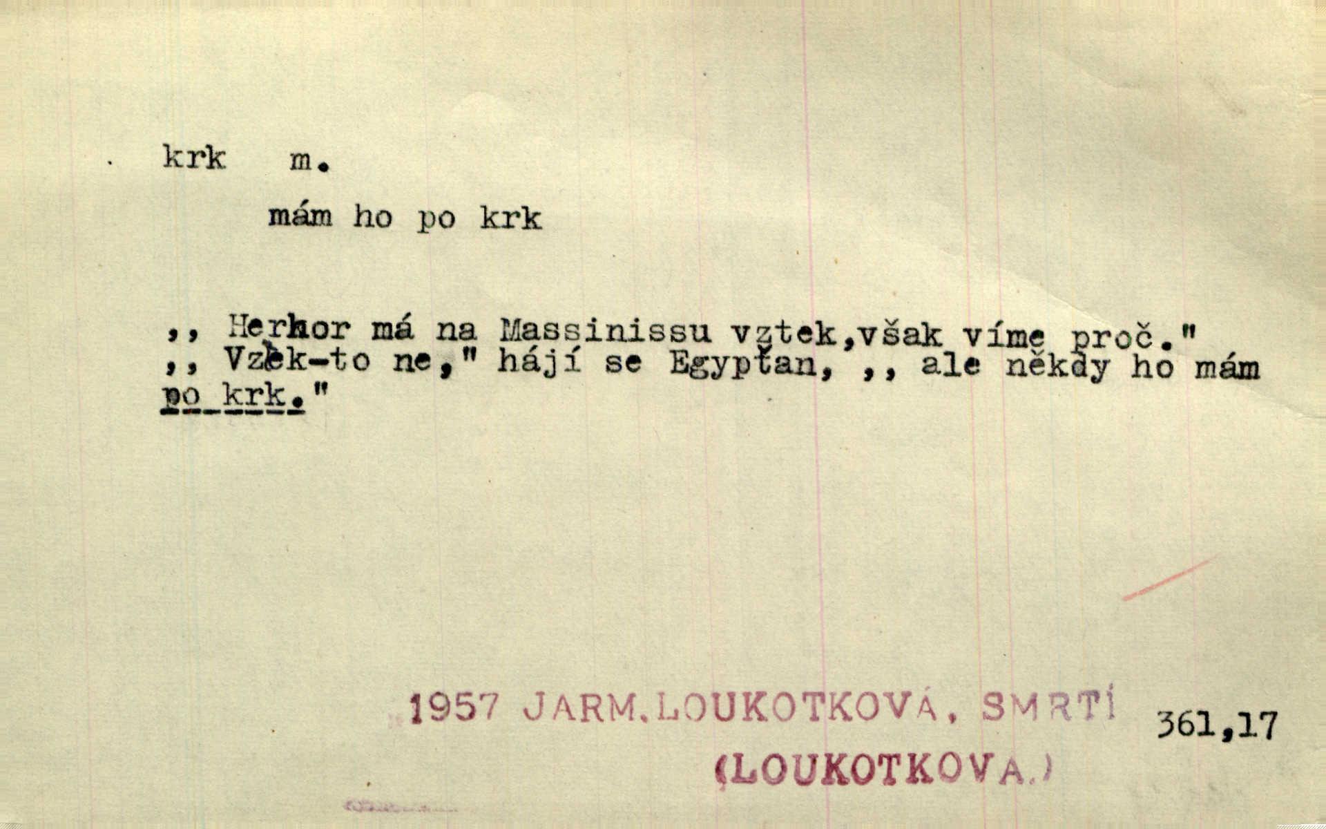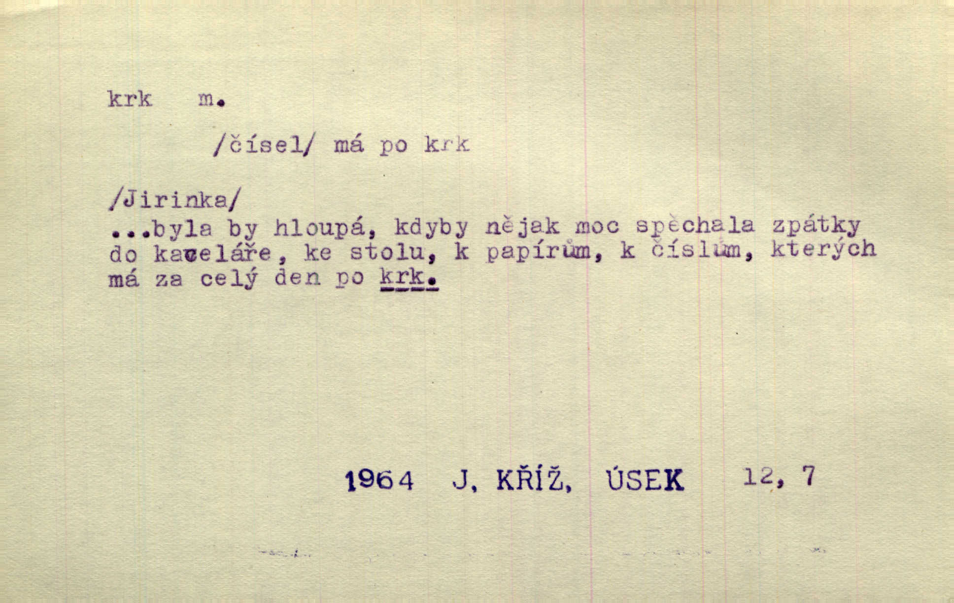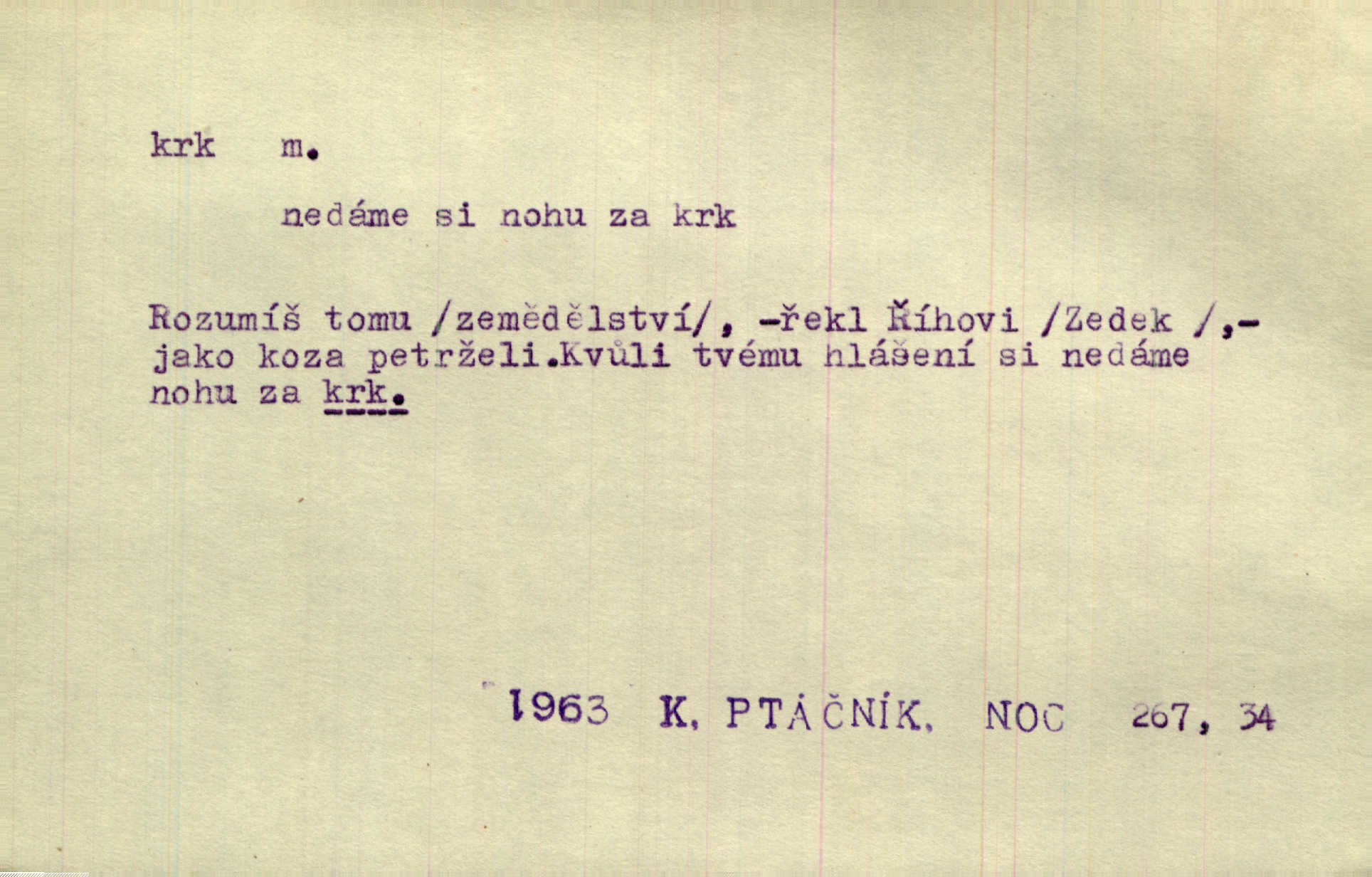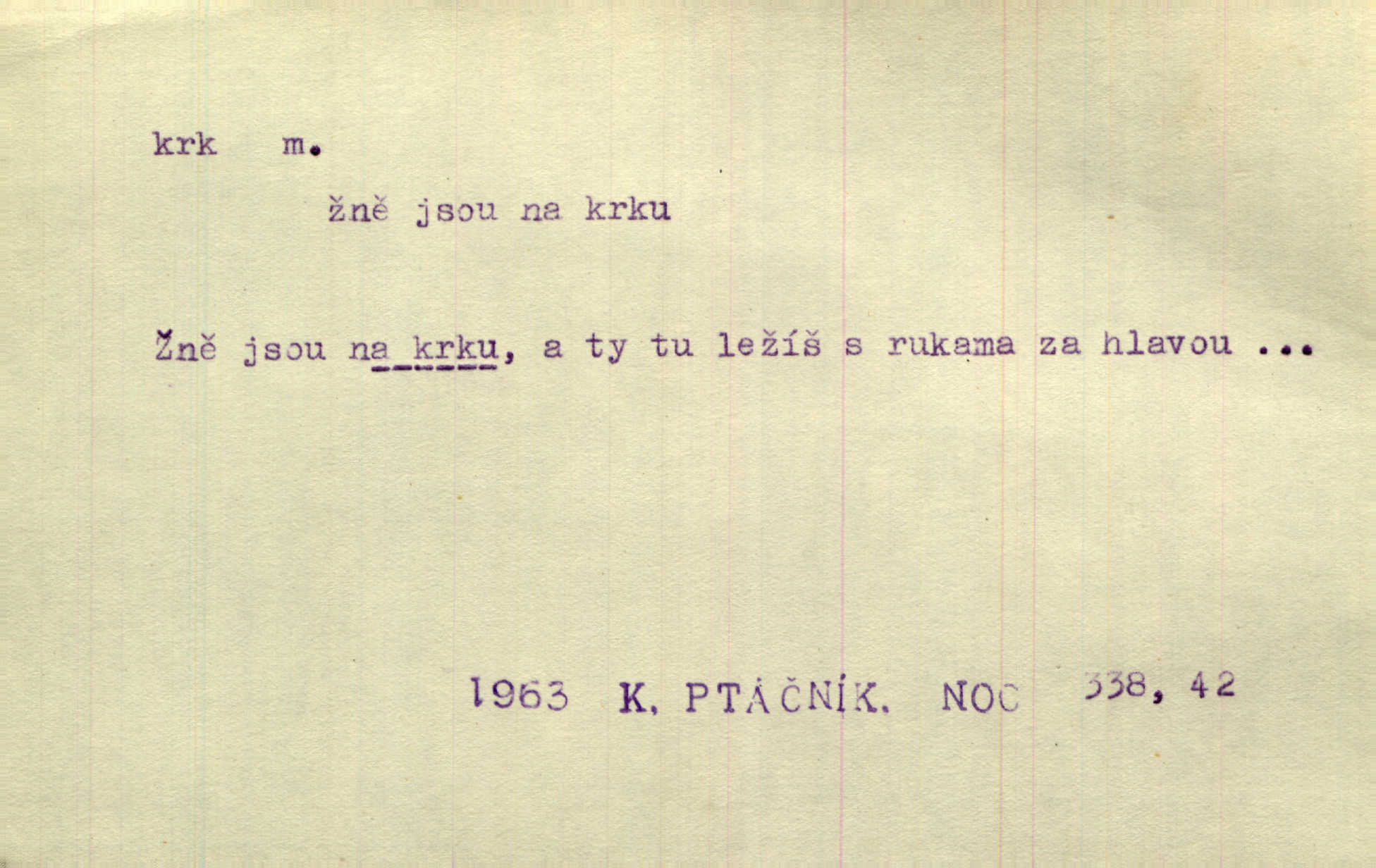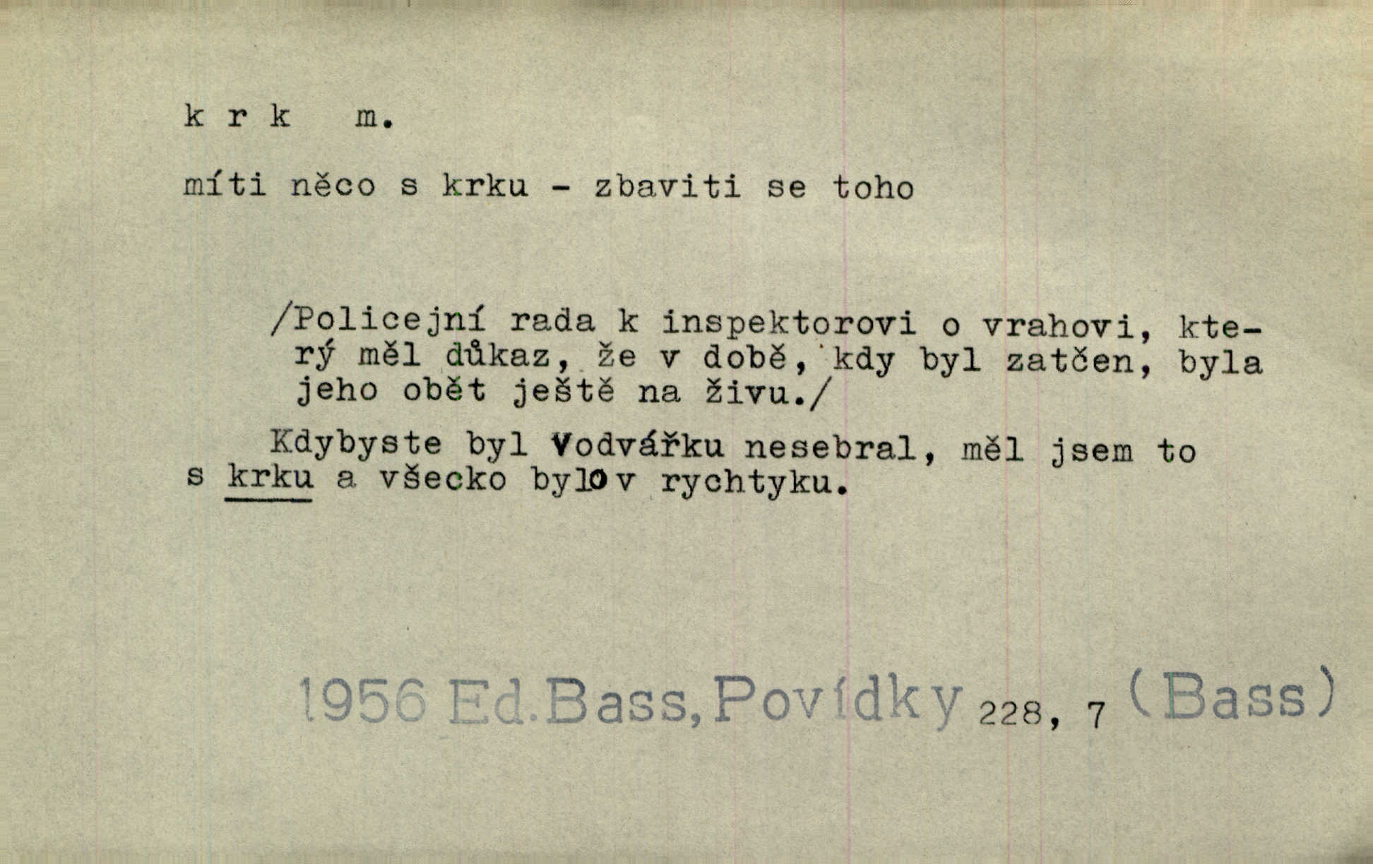- krk, -u m. část těla spojující hlavu s trupem. Cítil zvláštní tlak na prsou a nevolno v krku. Baar. Z hnízd se vztahovaly k němu žluté, nahé krky. Vrch. Hedvábnou mu [koni] srst svou rukou hladí, na krk mu tleská, utišit se radí. Hál. Žádný z hochů ji [Verunku] tolikrát co on nestrčil do závějí, kde sněhu po krk bylo. Hum. kal. Ženuška se mu na krk zavěsí. Šmil. Jednoho dne ve žních padla mladá žínka šťastnému manželu kolem krku. Bozd. Vzíti někoho kolem krku obejmouti. Měl jsem sto chutí zakroutit mu za to krk. Šmil. Otcové [dětem] hrozili, že jim krky polámají. Prav. A srazí [divoký Vítek] někde krk. J. z Hv. Ustál. sp. Poněvadž je tu několik dobrých hošíků, hodili jim [páni] na krk přípravy k sjezdu a akademii dali na starost. Mah. Bude mít co nevidět na krku několik žalob svedených jím děvčat. Klost. Škoda, že mám padesátku na krku. Svob. Farář Křišťan tomu rád byl, že cizince měl už s krku. Třeb. Tohle by ti mohlo zlomit krk zničiti tě, přivést na mizinu. Herrm. Dovedl by takový pedagog zakroutit krk Palackému při zkoušce z českých dějin. Mach. Já té sekatury a dřiny mám už po krk dost, jsem jí syt. Klost. Já už mám pomaloučku pana Beneše až po krk! Svob. Jsou [v divadelní hře] špatné role, ze kterých se nedá zhola nic udělat, i kdyby si dal člověk nohu za krk kdyby dělal cokoli. K. Čap. Nedá si asi Lukáš nohu za krk, že mu [nebožka žena] odešla. Svět. Za nic a pro nic je [peníze] házíme pánům do krku. Klost. Budeš někomu strkat naše peníze do krku! Rais. Mně už studie lezou nějak z krku protiví se. Mah. D Expr. o osobě, kterou někdo živí, strávník, zvl. o dítěti. Živit šest hladových krkův a k tomu ještě ženu, to není žádný žert. Šmil. D Expr. o životě. Nám o krk běží. Mach. Ten hospodář by položil krk za svůj statek. K. Čap. Věděl [každý], že to jen tak [Frantina] vymýšlí pro ukrácení času, a přec by byl krk za to dal, že to čistá pravda. Svět. Vy byste mě svou bojechtivostí připravily o krk. Krás. D část některých předmětů podobná krku. Počali láhvím krky lámat. Svět. Žemla strkal [kornouty] do prázdné láhve se širokým krkem. Herrm. Zejm. u strunových hudebních nástrojů zúžená horní jejich část. Houslař rukáv shrnul s dlaně, krk houslí pevně chopil, bradu opřel na ně. Krás. Pan Dundr ji [kytaru] sňal, ofoukl zaprášený hmatník, obemkl krk, zabral v struny. Herrm. Kdo chce dobře na basičku hrát, ten ji musí pěkně za krk brát. Bes. Lid. část řepy pod listy. A krky ste už zkrmily? Mrš. Těl. přední část koně n. zúžená část kužele. Voj. část pažby na pušce a lehkém kulometu. D Dial. husí krk druh pečiva. Babička upekla „husí krky“, takové stočené precle. Jah.