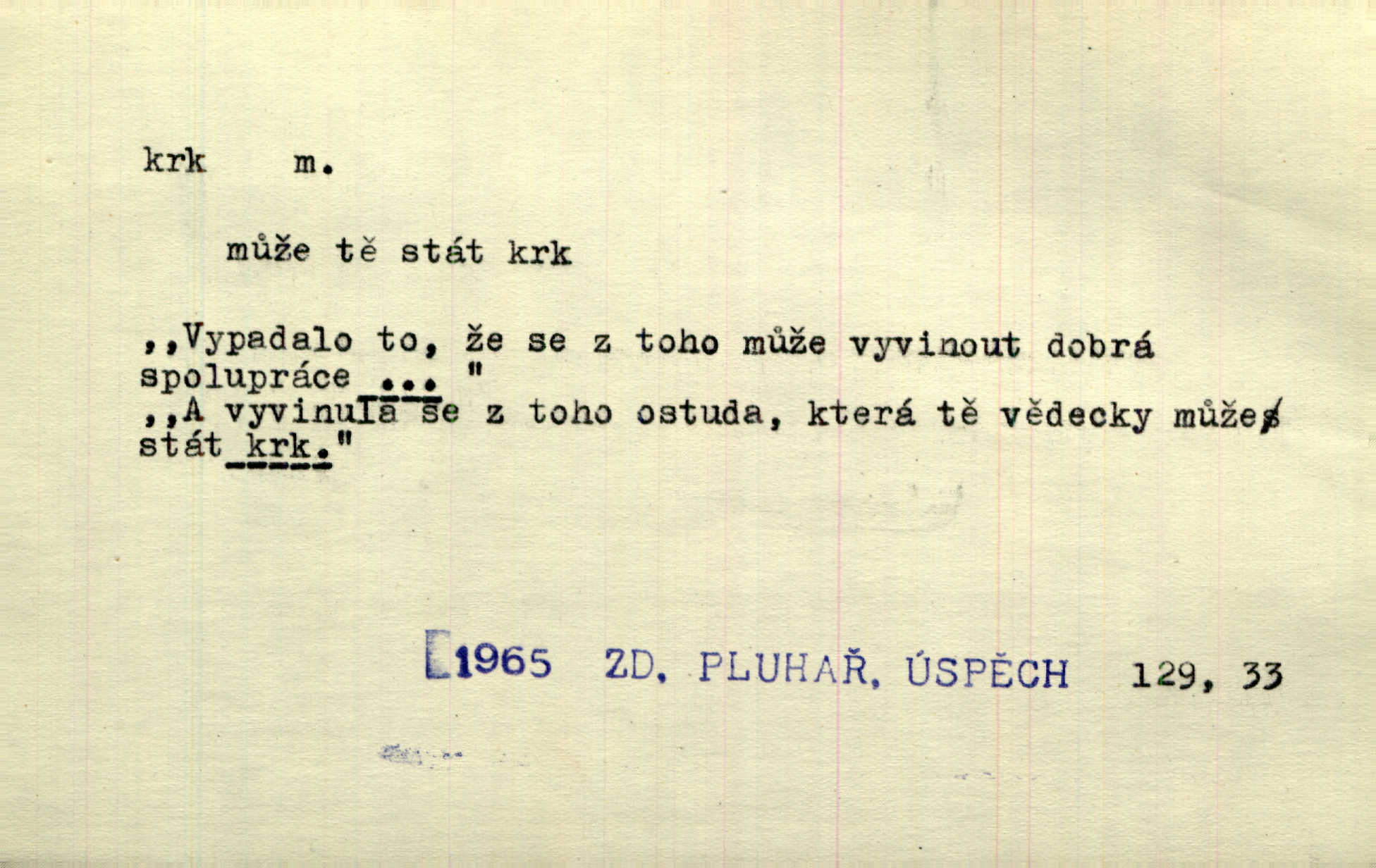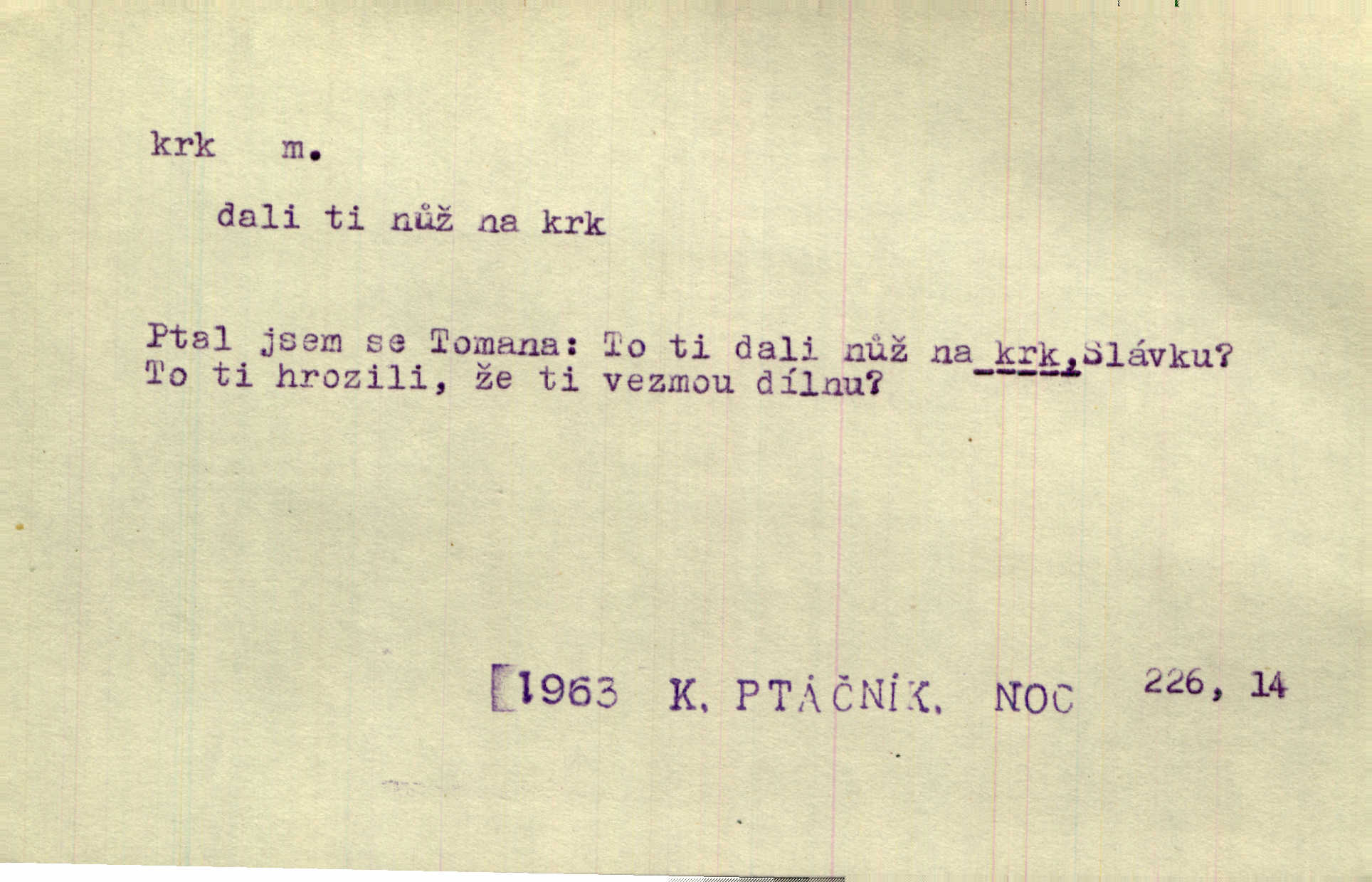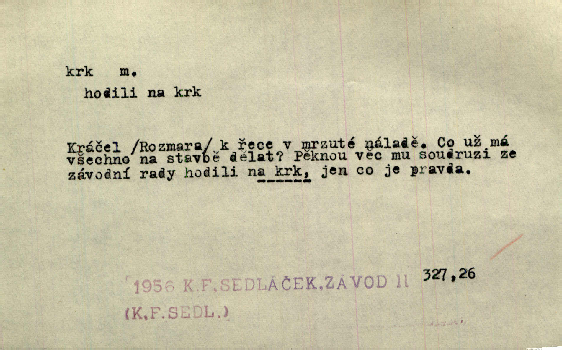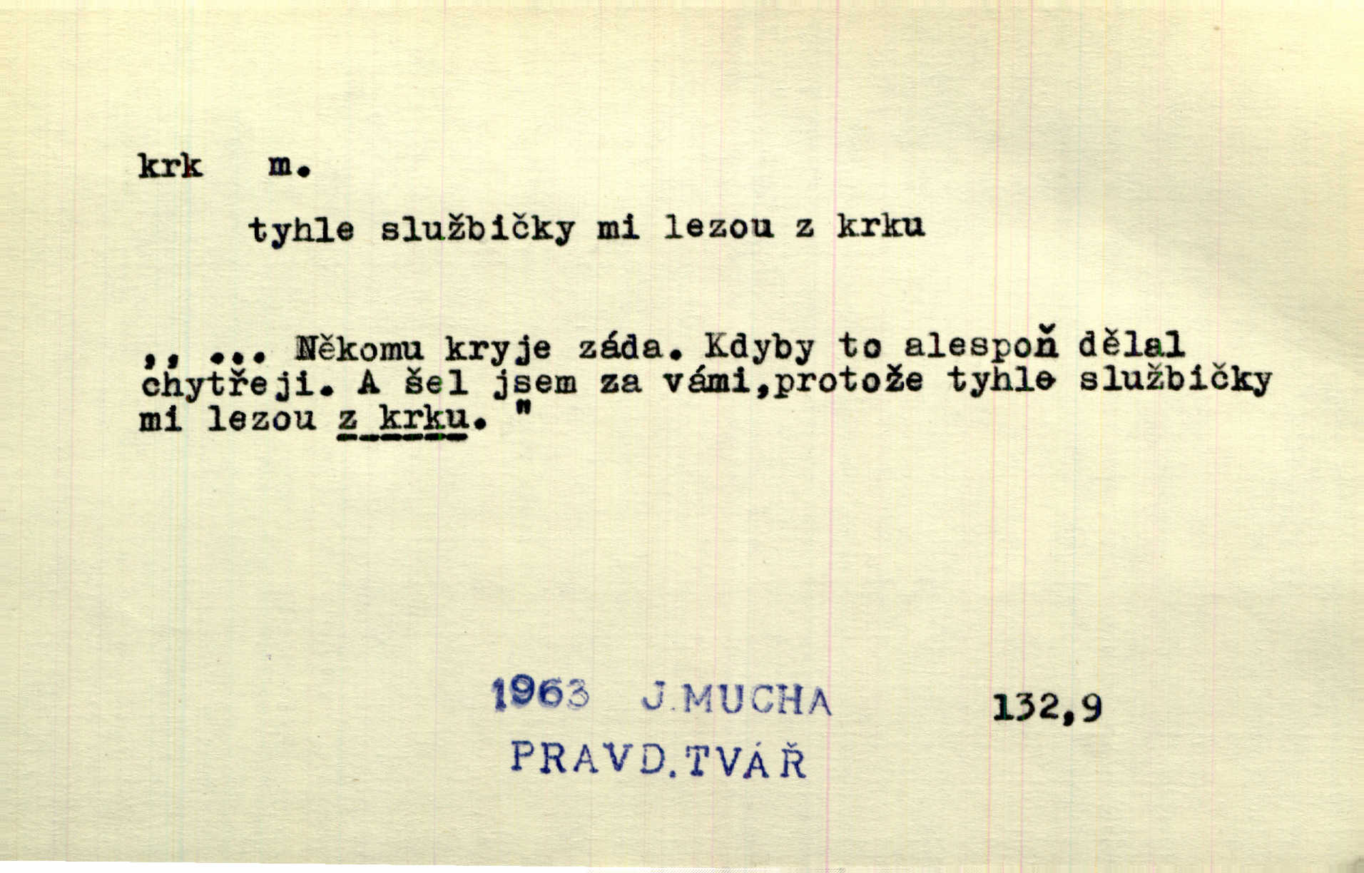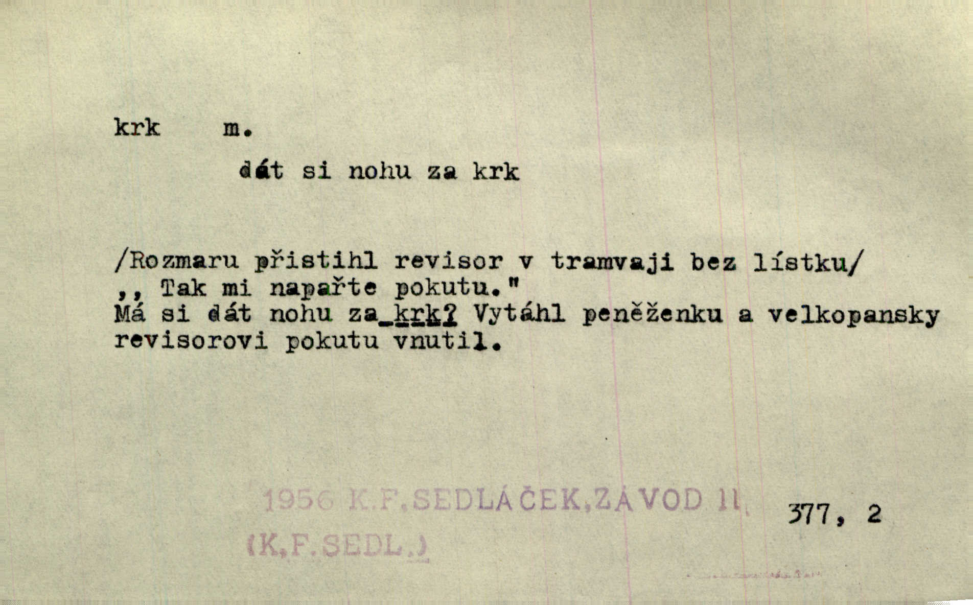 - krk, -u m. část těla spojující hlavu s trupem. Cítil zvláštní tlak na prsou a nevolno v krku. Baar. Z hnízd se vztahovaly k němu žluté, nahé krky. Vrch. Hedvábnou mu [koni] srst svou rukou hladí, na krk mu tleská, utišit se radí. Hál. Žádný z hochů ji [Verunku] tolikrát co on nestrčil do závějí, kde sněhu po krk bylo. Hum. kal. Ženuška se mu na krk zavěsí. Šmil. Jednoho dne ve žních padla mladá žínka šťastnému manželu kolem krku. Bozd. Vzíti někoho kolem krku obejmouti. Měl jsem sto chutí zakroutit mu za to krk. Šmil. Otcové [dětem] hrozili, že jim krky polámají. Prav. A srazí [divoký Vítek] někde krk. J. z Hv. Ustál. sp. Poněvadž je tu několik dobrých hošíků, hodili jim [páni] na krk přípravy k sjezdu a akademii dali na starost. Mah. Bude mít co nevidět na krku několik žalob svedených jím děvčat. Klost. Škoda, že mám padesátku na krku. Svob. Farář Křišťan tomu rád byl, že cizince měl už s krku. Třeb. Tohle by ti mohlo zlomit krk zničiti tě, přivést na mizinu. Herrm. Dovedl by takový pedagog zakroutit krk Palackému při zkoušce z českých dějin. Mach. Já té sekatury a dřiny mám už po krk dost, jsem jí syt. Klost. Já už mám pomaloučku pana Beneše až po krk! Svob. Jsou [v divadelní hře] špatné role, ze kterých se nedá zhola nic udělat, i kdyby si dal člověk nohu za krk kdyby dělal cokoli. K. Čap. Nedá si asi Lukáš nohu za krk, že mu [nebožka žena] odešla. Svět. Za nic a pro nic je [peníze] házíme pánům do krku. Klost. Budeš někomu strkat naše peníze do krku! Rais. Mně už studie lezou nějak z krku protiví se. Mah. D Expr. o osobě, kterou někdo živí, strávník, zvl. o dítěti. Živit šest hladových krkův a k tomu ještě ženu, to není žádný žert. Šmil. D Expr. o životě. Nám o krk běží. Mach. Ten hospodář by položil krk za svůj statek. K. Čap. Věděl [každý], že to jen tak [Frantina] vymýšlí pro ukrácení času, a přec by byl krk za to dal, že to čistá pravda. Svět. Vy byste mě svou bojechtivostí připravily o krk. Krás. D část některých předmětů podobná krku. Počali láhvím krky lámat. Svět. Žemla strkal [kornouty] do prázdné láhve se širokým krkem. Herrm. Zejm. u strunových hudebních nástrojů zúžená horní jejich část. Houslař rukáv shrnul s dlaně, krk houslí pevně chopil, bradu opřel na ně. Krás. Pan Dundr ji [kytaru] sňal, ofoukl zaprášený hmatník, obemkl krk, zabral v struny. Herrm. Kdo chce dobře na basičku hrát, ten ji musí pěkně za krk brát. Bes. Lid. část řepy pod listy. A krky ste už zkrmily? Mrš. Těl. přední část koně n. zúžená část kužele. Voj. část pažby na pušce a lehkém kulometu. D Dial. husí krk druh pečiva. Babička upekla „husí krky“, takové stočené precle. Jah.