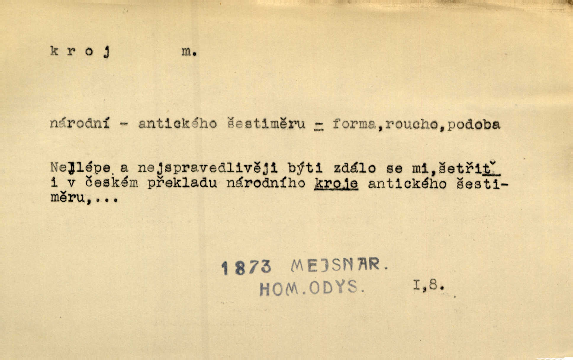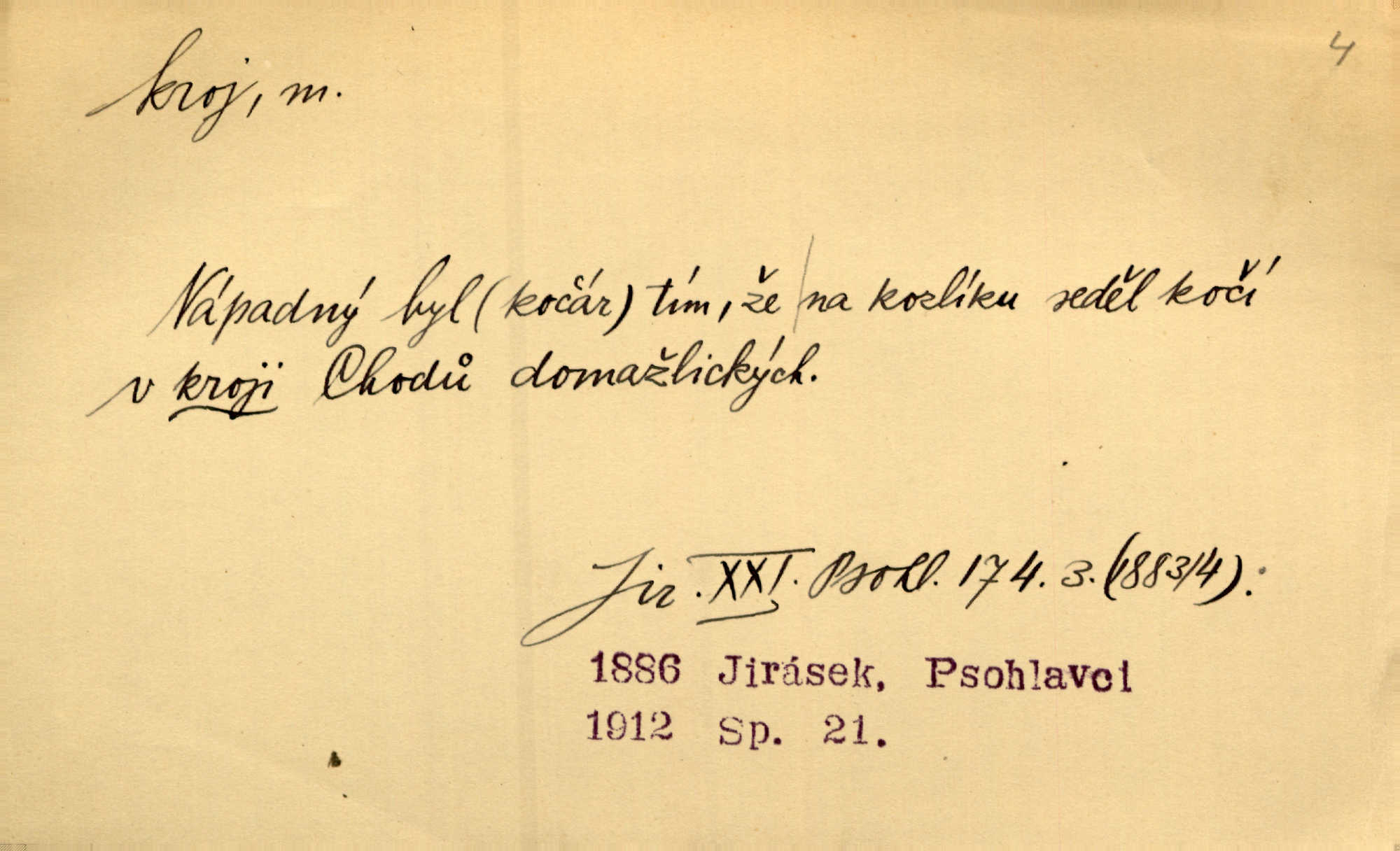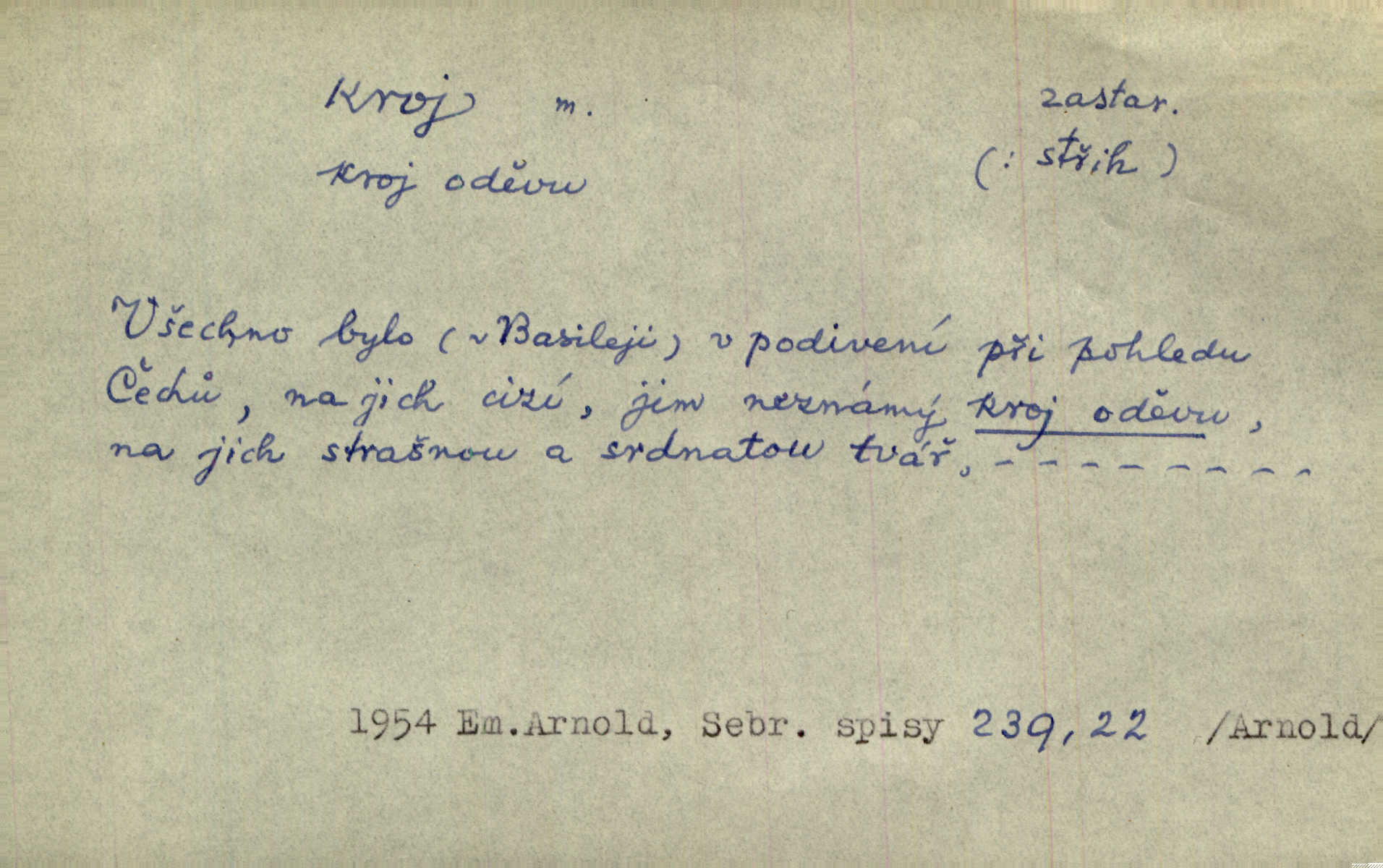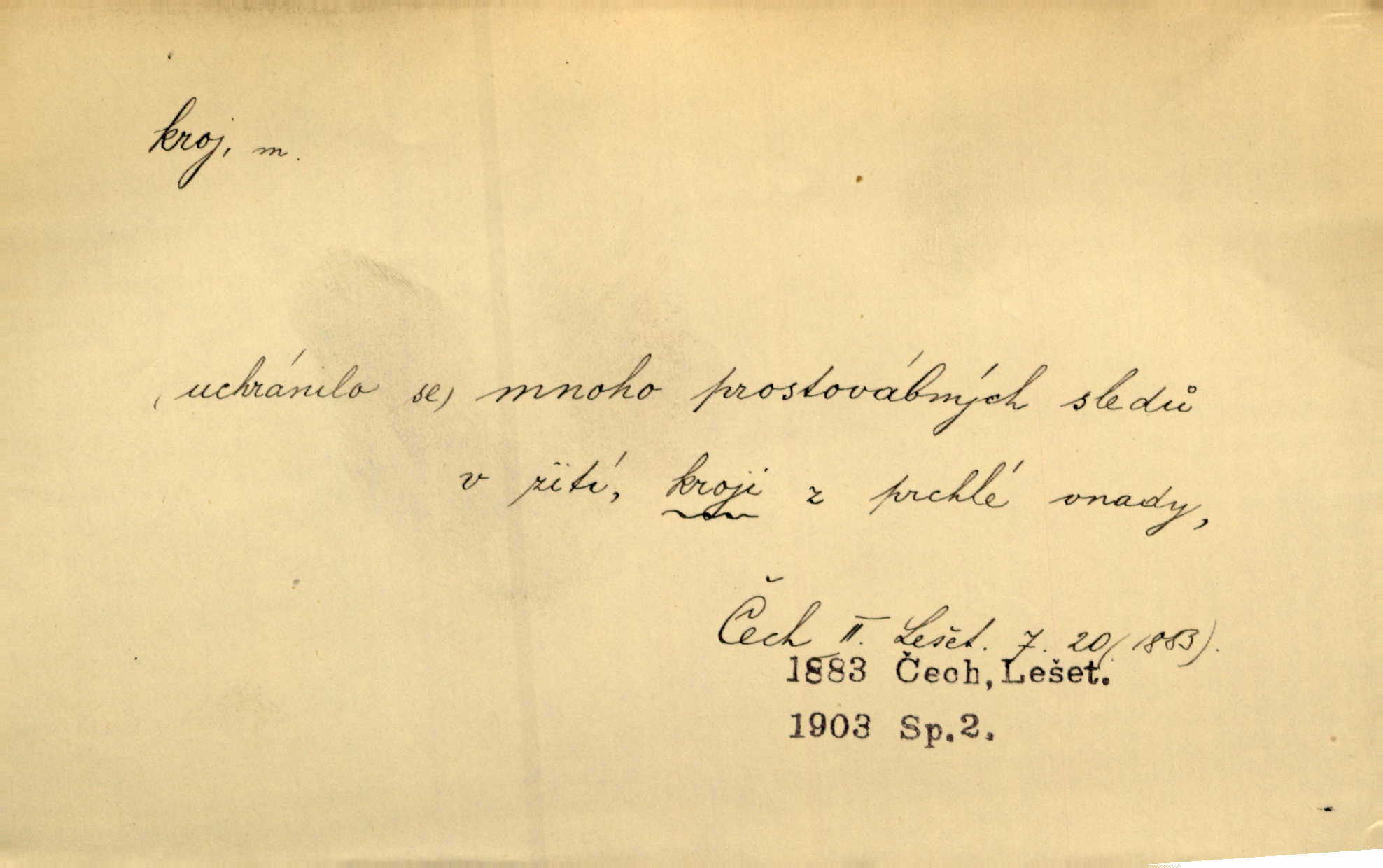 - kroj, -e m. svérázný šat, oděv vyznačující obyvatele jistého kraje n. příslušníky některých spolků n. tříd. [Na Slovácku] lid ještě má svůj krásný kroj. V. Mrš. Dámy v národních krojích. Kam. Vzácný kyjovský kroj. K. Čap. Dlouholetý Sokol Stýblo [Müller, Růžička atd.] — všichni se objeví v kroji sokolském stejnokroji. Herrm. Což mu blaze ve vojenském kroji! uniformě. Quis. D Kniž. oděv, způsob odívání. Dle kroje, mluvy šlechtic polský byl. Zey. Podle panského kroje nebyl by nikdo tušil jeho původ. Herb. Měšťané [v Uhrách] kroje francouzského užívají. Pal. Ustál. sp. Třetí [muž]‚ dle kroje a stroje panský dráb celým svým zevnějškem. Šmil. Přen. [Jak vábně hledí] štít šedý z révy malebného kroje. Čech. Zast. úprava (o překladu). Selanky v kroji českém. Čel. D móda. Jinoch, vyšňořen dle nejnovějšího kroje. Rub. Jaký kroj, tak se stroj! Přísl. D Zř. střih. Starý Malina neuměl již podle nových krojů přistřihovati. Tyl. Šat její měl panský kroj. Něm. [Nanynka] každé ráda posloužila nějakým vzorcem na zástěru, na kajdu, majíc vždy kroje z brusu nové. Herrm.