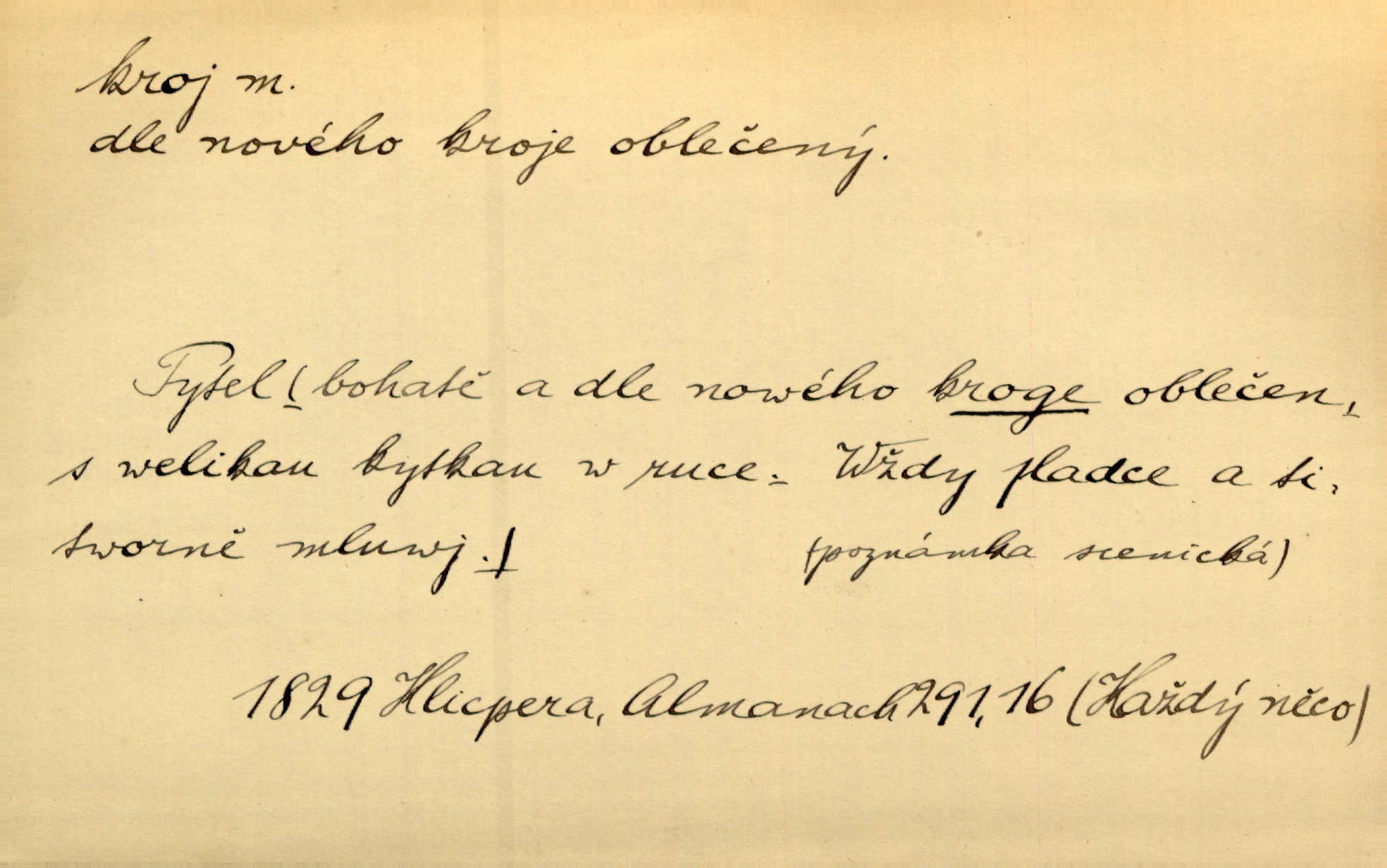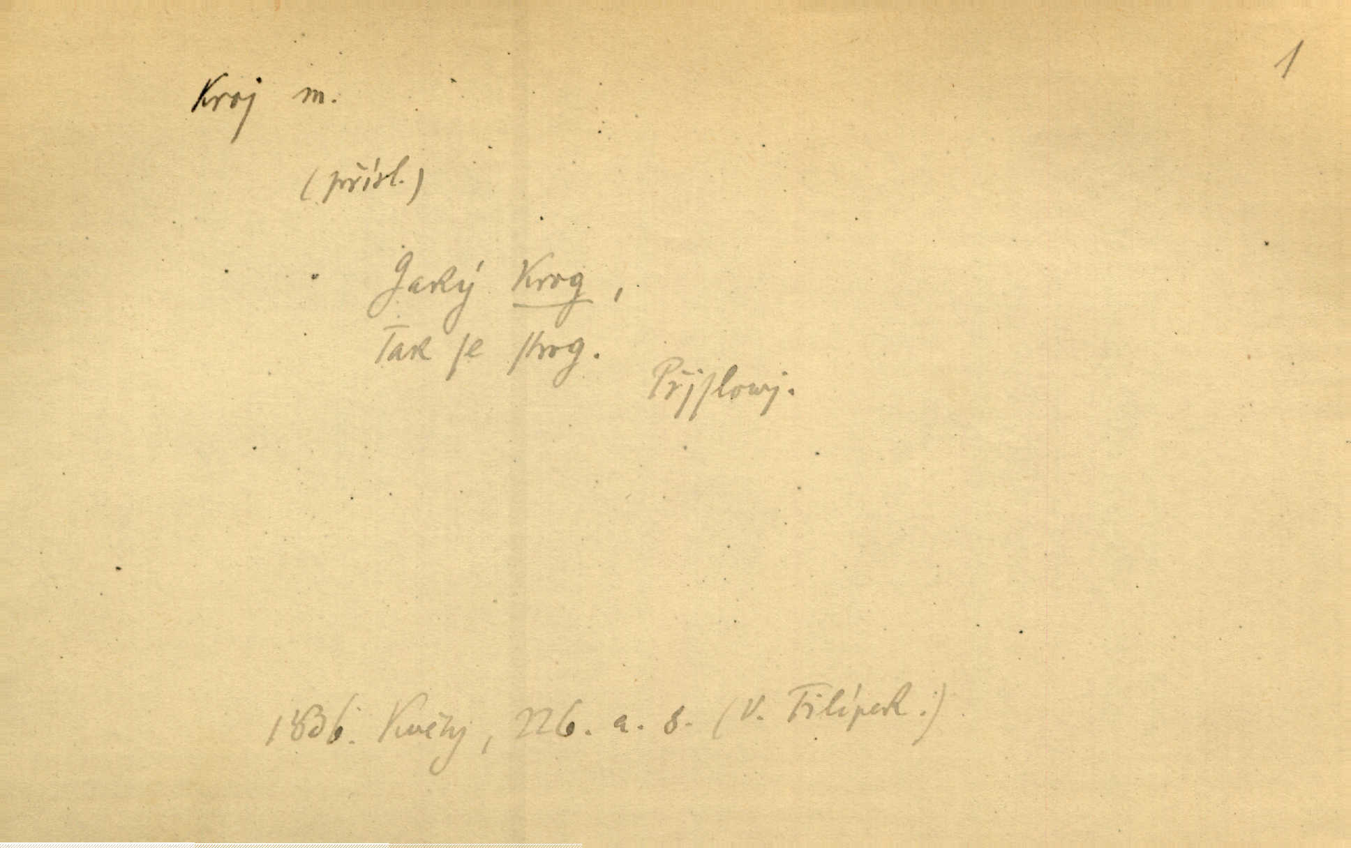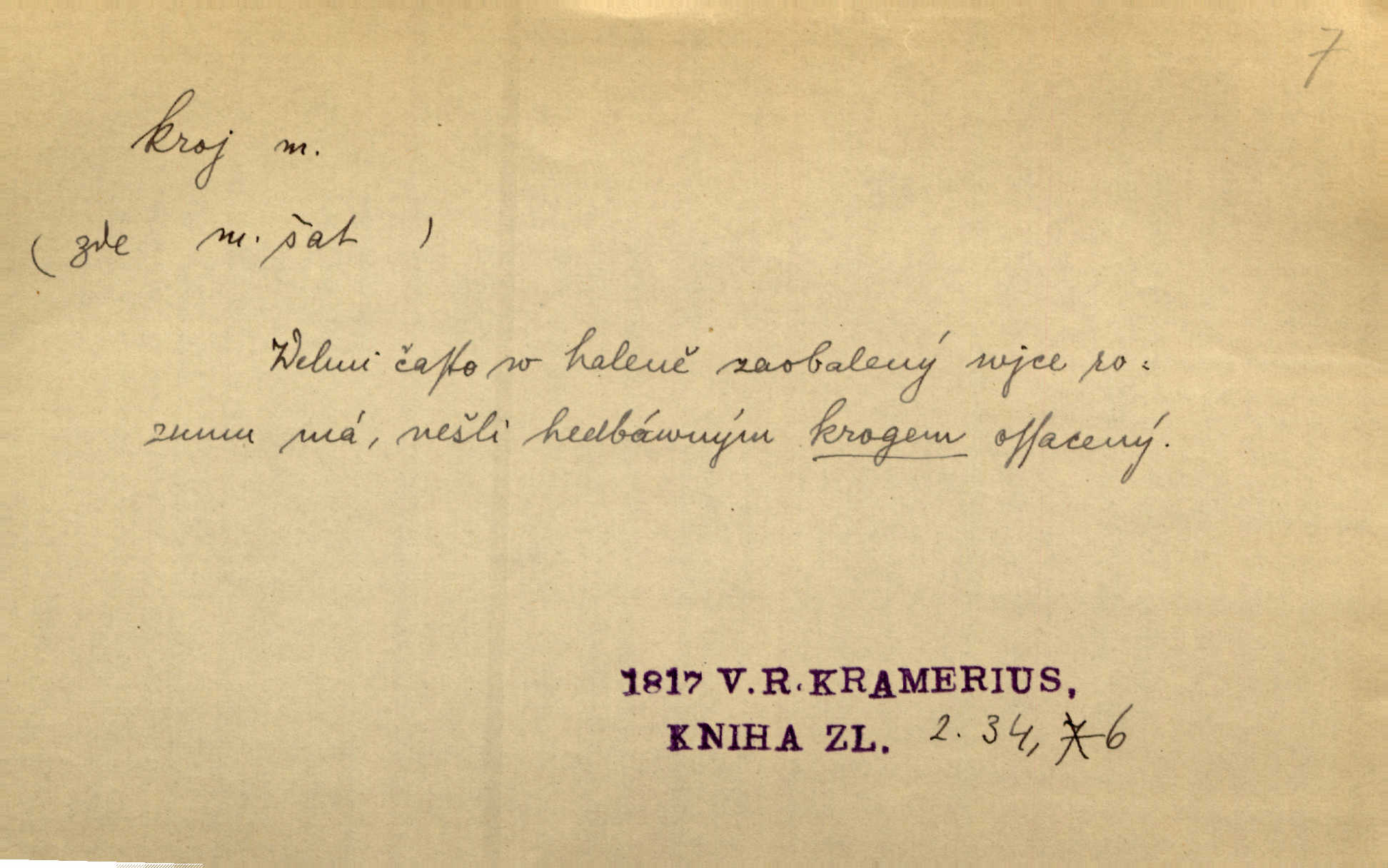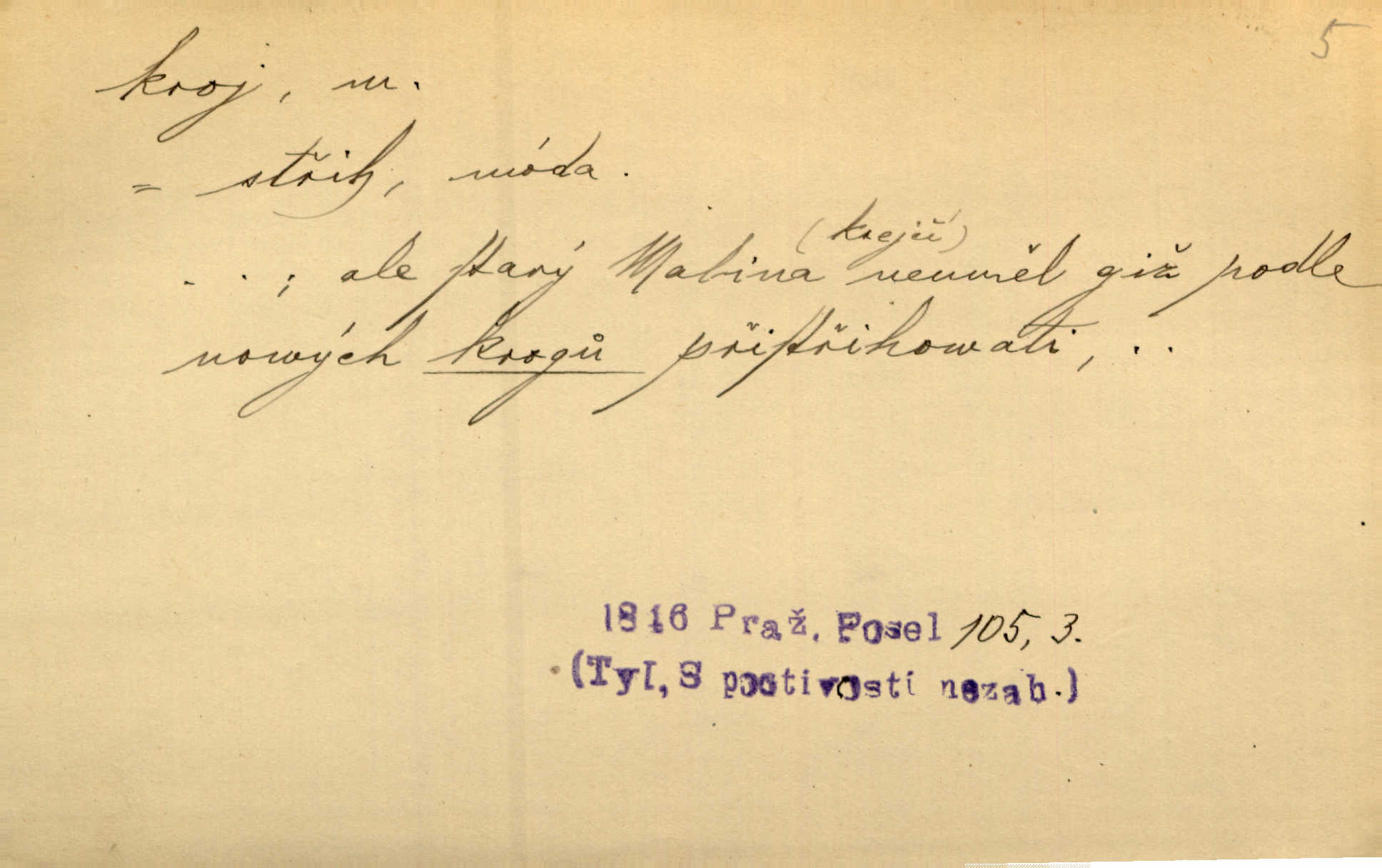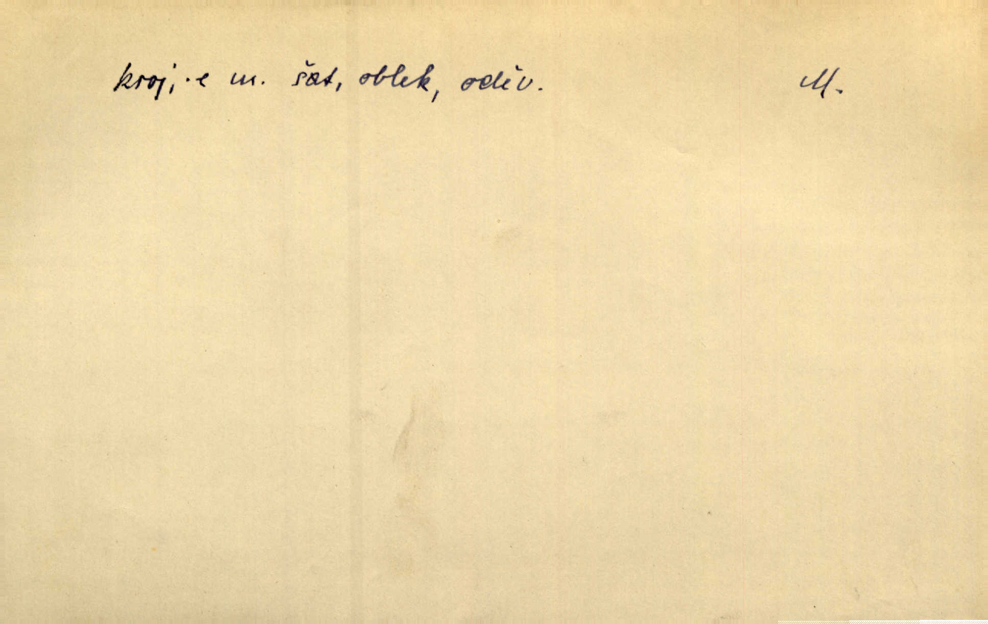 - kroj, -e m. svérázný šat, oděv vyznačující obyvatele jistého kraje n. příslušníky některých spolků n. tříd. [Na Slovácku] lid ještě má svůj krásný kroj. V. Mrš. Dámy v národních krojích. Kam. Vzácný kyjovský kroj. K. Čap. Dlouholetý Sokol Stýblo [Müller, Růžička atd.] — všichni se objeví v kroji sokolském stejnokroji. Herrm. Což mu blaze ve vojenském kroji! uniformě. Quis. D Kniž. oděv, způsob odívání. Dle kroje, mluvy šlechtic polský byl. Zey. Podle panského kroje nebyl by nikdo tušil jeho původ. Herb. Měšťané [v Uhrách] kroje francouzského užívají. Pal. Ustál. sp. Třetí [muž]‚ dle kroje a stroje panský dráb celým svým zevnějškem. Šmil. Přen. [Jak vábně hledí] štít šedý z révy malebného kroje. Čech. Zast. úprava (o překladu). Selanky v kroji českém. Čel. D móda. Jinoch, vyšňořen dle nejnovějšího kroje. Rub. Jaký kroj, tak se stroj! Přísl. D Zř. střih. Starý Malina neuměl již podle nových krojů přistřihovati. Tyl. Šat její měl panský kroj. Něm. [Nanynka] každé ráda posloužila nějakým vzorcem na zástěru, na kajdu, majíc vždy kroje z brusu nové. Herrm.