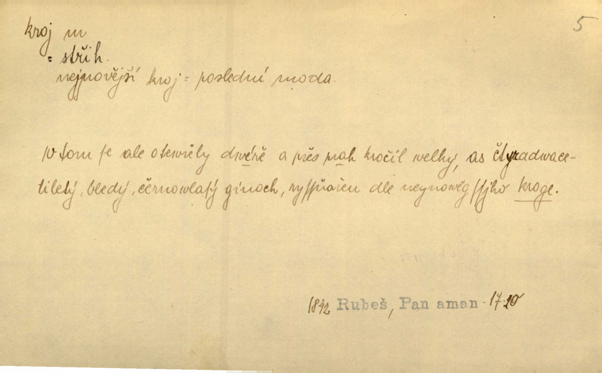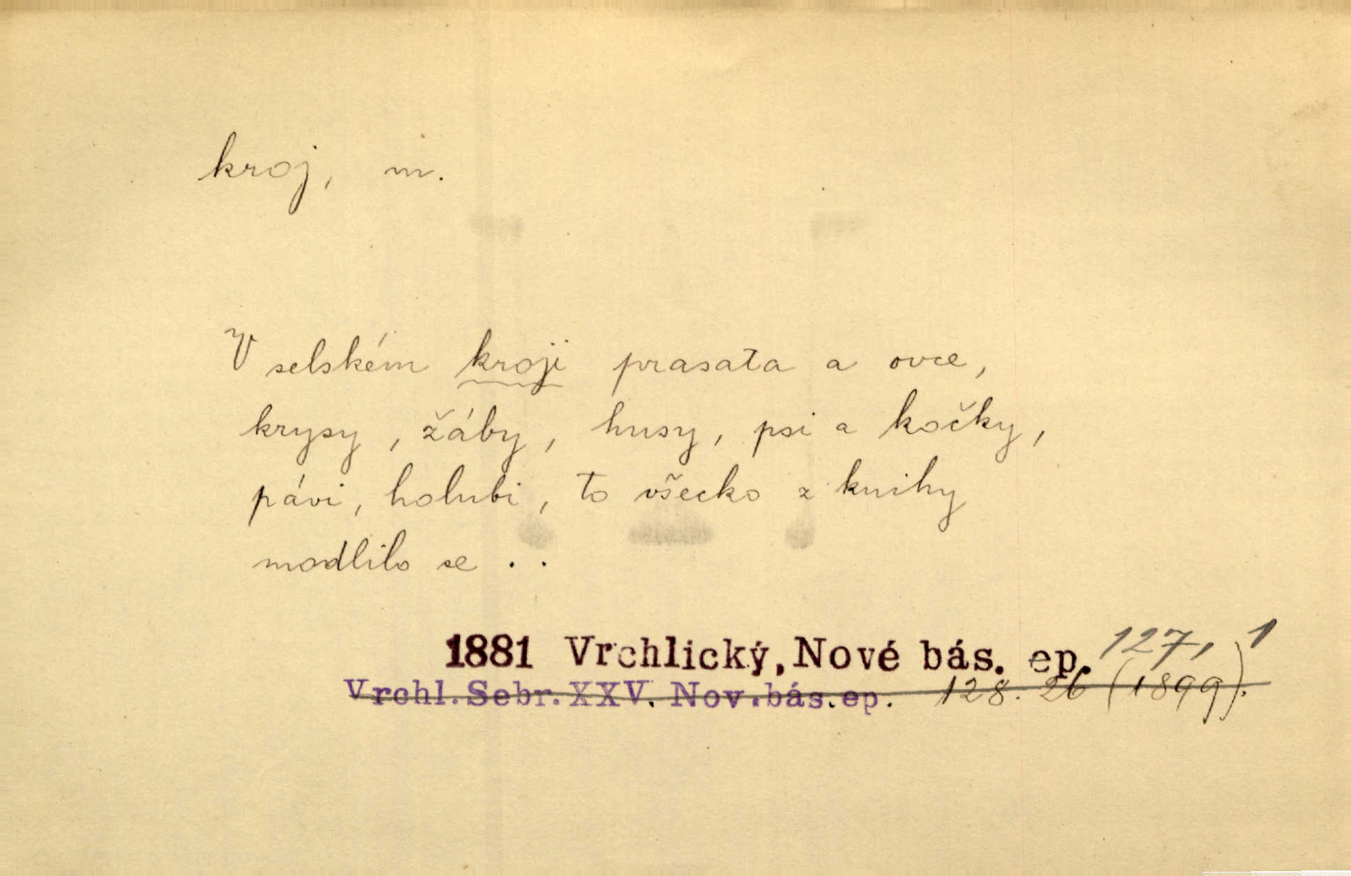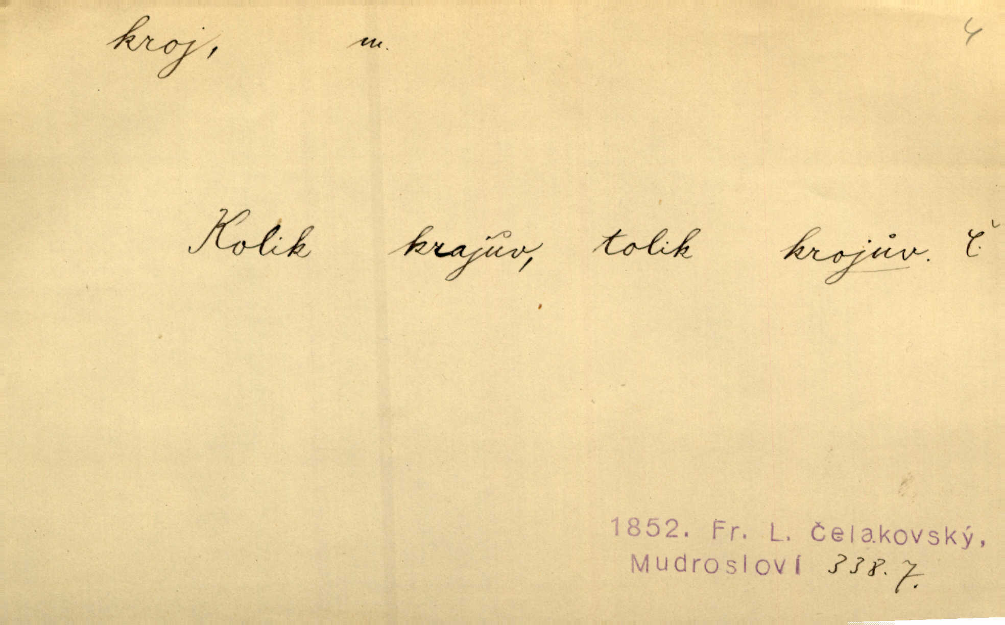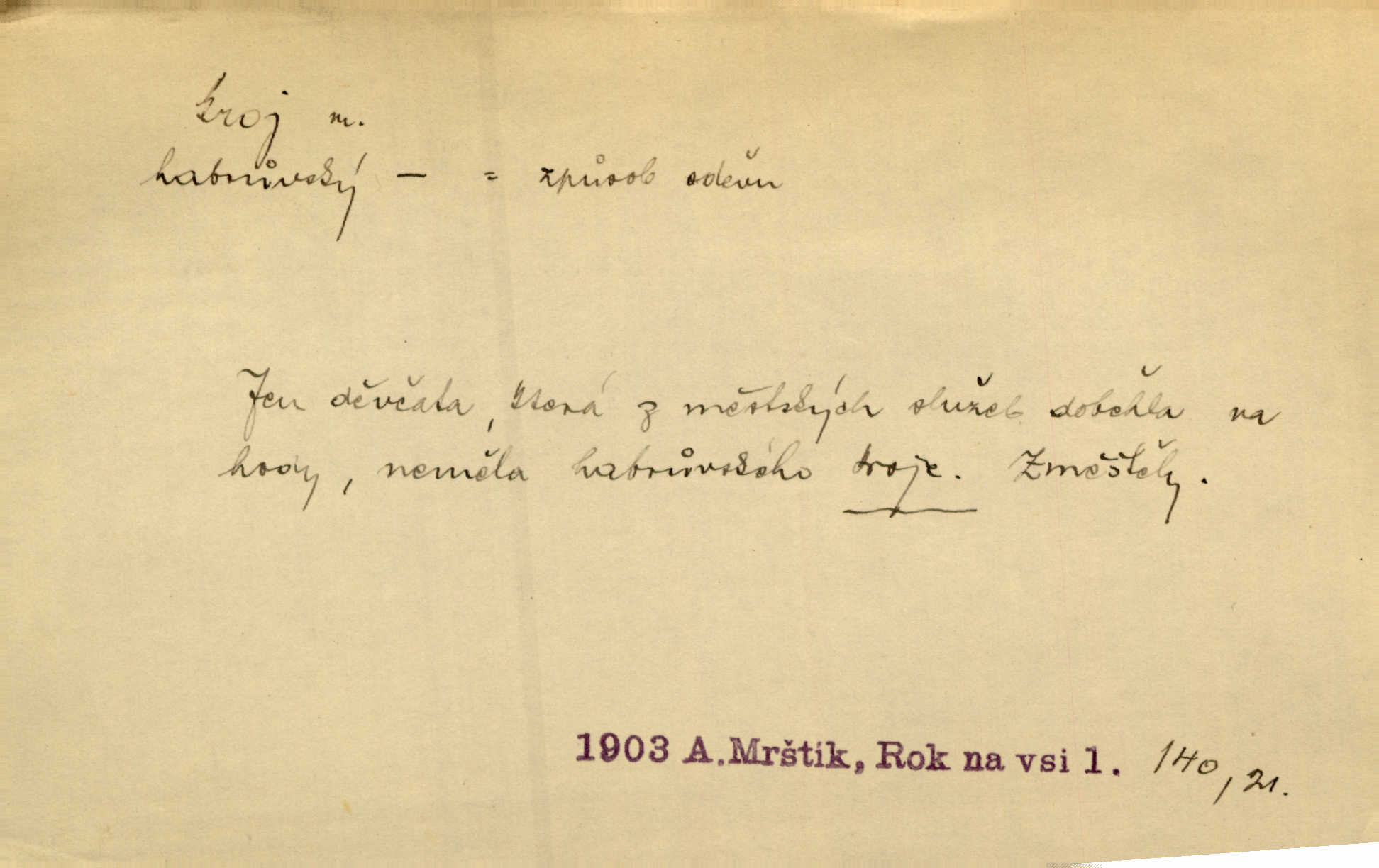 - kroj, -e m. svérázný šat, oděv vyznačující obyvatele jistého kraje n. příslušníky některých spolků n. tříd. [Na Slovácku] lid ještě má svůj krásný kroj. V. Mrš. Dámy v národních krojích. Kam. Vzácný kyjovský kroj. K. Čap. Dlouholetý Sokol Stýblo [Müller, Růžička atd.] — všichni se objeví v kroji sokolském stejnokroji. Herrm. Což mu blaze ve vojenském kroji! uniformě. Quis. D Kniž. oděv, způsob odívání. Dle kroje, mluvy šlechtic polský byl. Zey. Podle panského kroje nebyl by nikdo tušil jeho původ. Herb. Měšťané [v Uhrách] kroje francouzského užívají. Pal. Ustál. sp. Třetí [muž]‚ dle kroje a stroje panský dráb celým svým zevnějškem. Šmil. Přen. [Jak vábně hledí] štít šedý z révy malebného kroje. Čech. Zast. úprava (o překladu). Selanky v kroji českém. Čel. D móda. Jinoch, vyšňořen dle nejnovějšího kroje. Rub. Jaký kroj, tak se stroj! Přísl. D Zř. střih. Starý Malina neuměl již podle nových krojů přistřihovati. Tyl. Šat její měl panský kroj. Něm. [Nanynka] každé ráda posloužila nějakým vzorcem na zástěru, na kajdu, majíc vždy kroje z brusu nové. Herrm.
