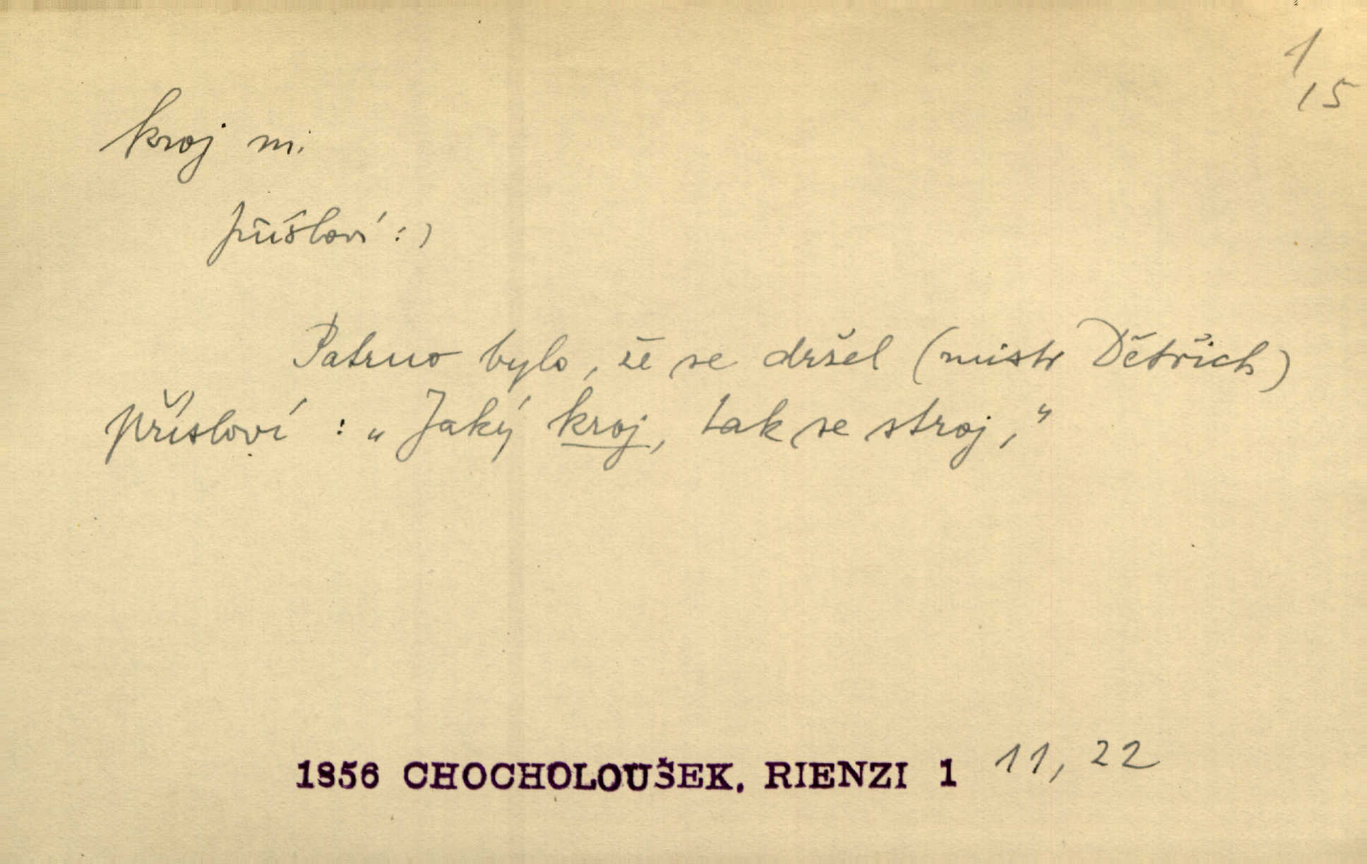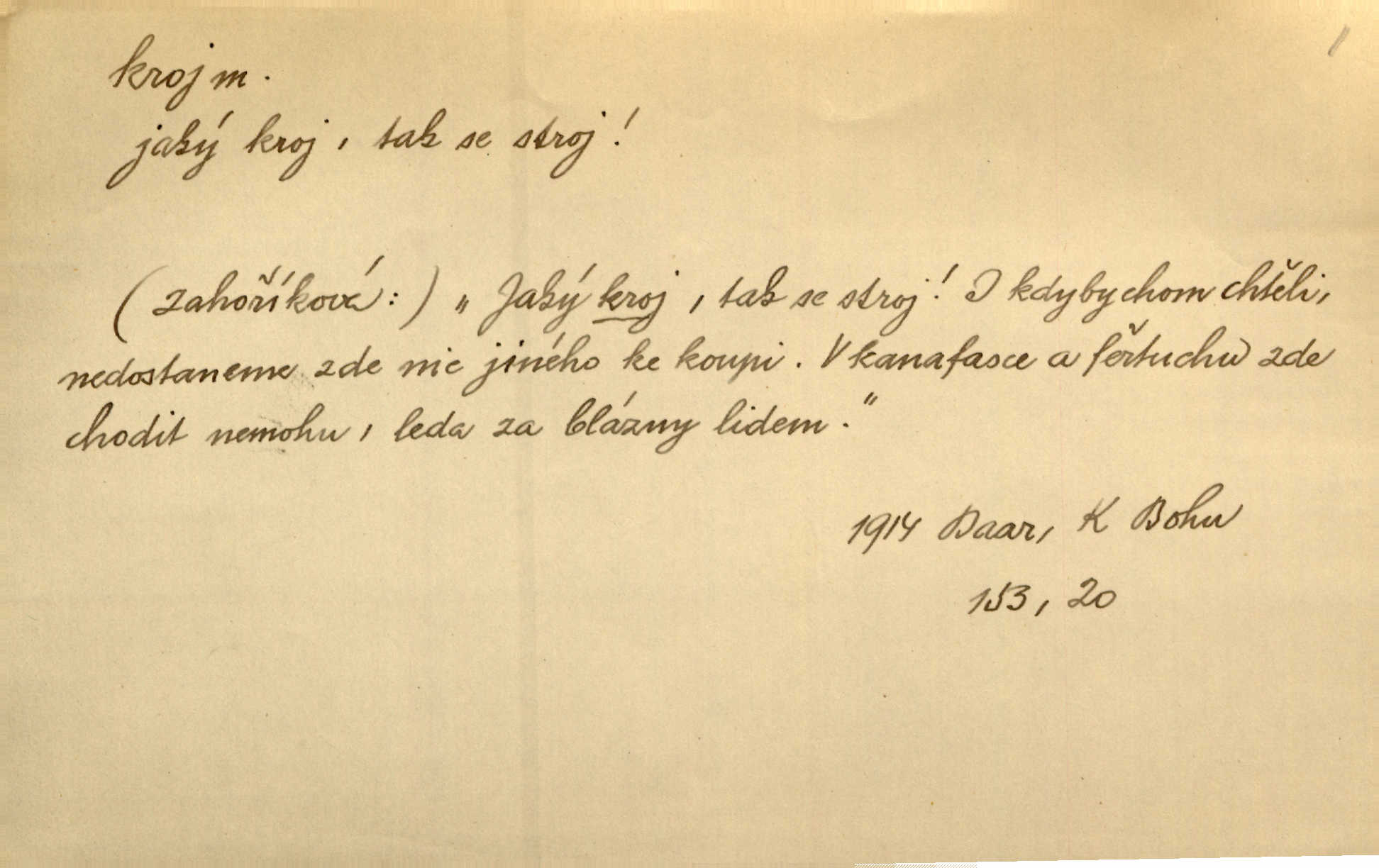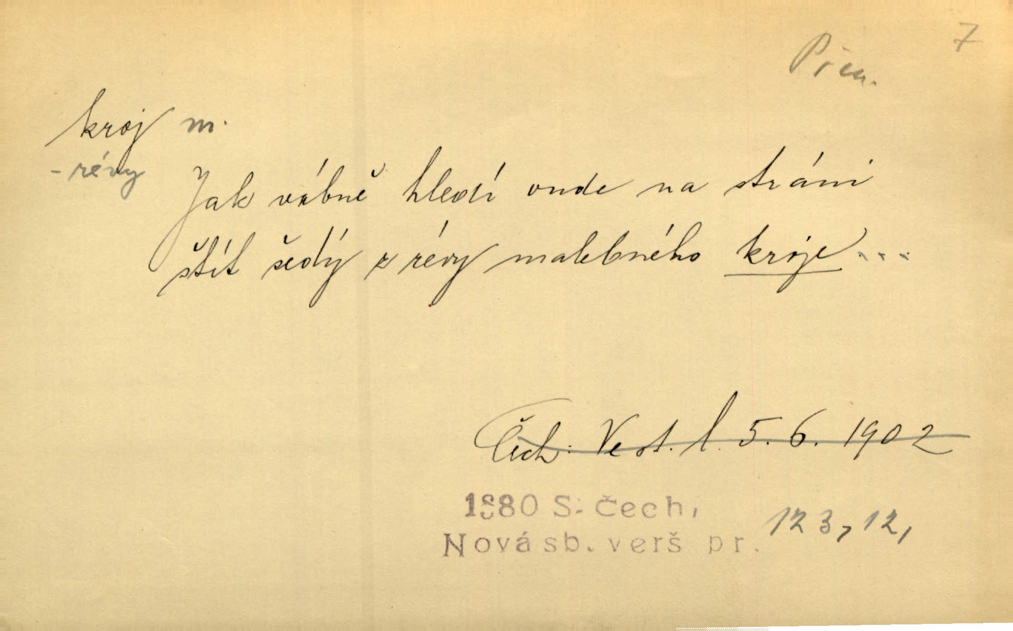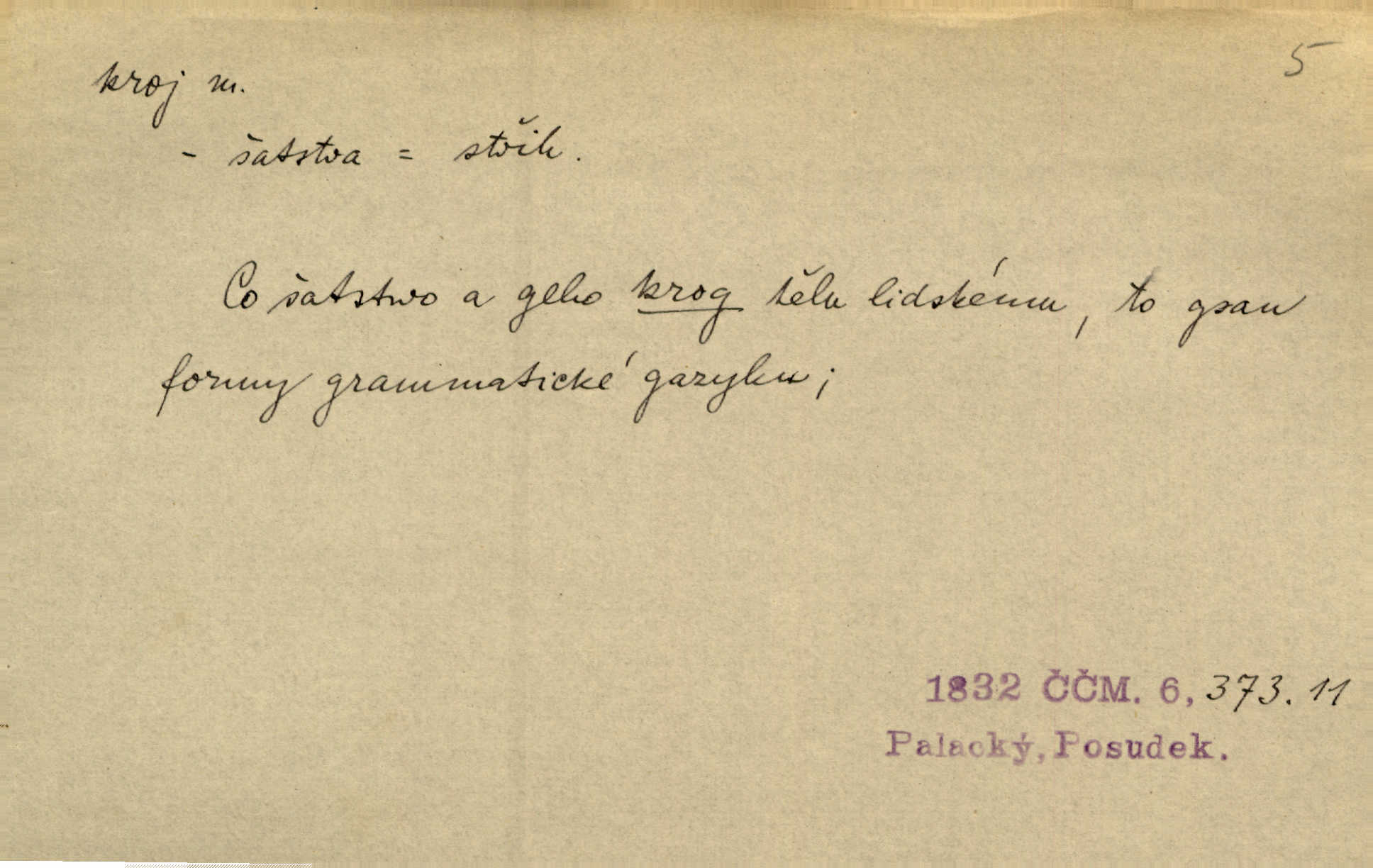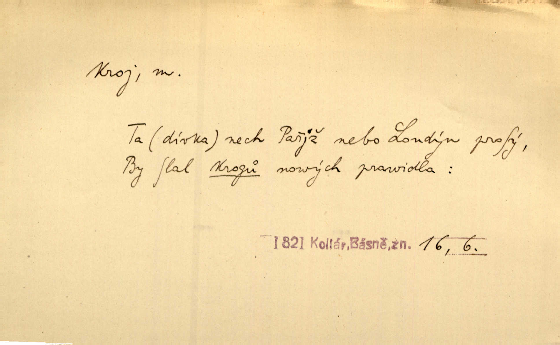 - kroj, -e m. svérázný šat, oděv vyznačující obyvatele jistého kraje n. příslušníky některých spolků n. tříd. [Na Slovácku] lid ještě má svůj krásný kroj. V. Mrš. Dámy v národních krojích. Kam. Vzácný kyjovský kroj. K. Čap. Dlouholetý Sokol Stýblo [Müller, Růžička atd.] — všichni se objeví v kroji sokolském stejnokroji. Herrm. Což mu blaze ve vojenském kroji! uniformě. Quis. D Kniž. oděv, způsob odívání. Dle kroje, mluvy šlechtic polský byl. Zey. Podle panského kroje nebyl by nikdo tušil jeho původ. Herb. Měšťané [v Uhrách] kroje francouzského užívají. Pal. Ustál. sp. Třetí [muž]‚ dle kroje a stroje panský dráb celým svým zevnějškem. Šmil. Přen. [Jak vábně hledí] štít šedý z révy malebného kroje. Čech. Zast. úprava (o překladu). Selanky v kroji českém. Čel. D móda. Jinoch, vyšňořen dle nejnovějšího kroje. Rub. Jaký kroj, tak se stroj! Přísl. D Zř. střih. Starý Malina neuměl již podle nových krojů přistřihovati. Tyl. Šat její měl panský kroj. Něm. [Nanynka] každé ráda posloužila nějakým vzorcem na zástěru, na kajdu, majíc vždy kroje z brusu nové. Herrm.