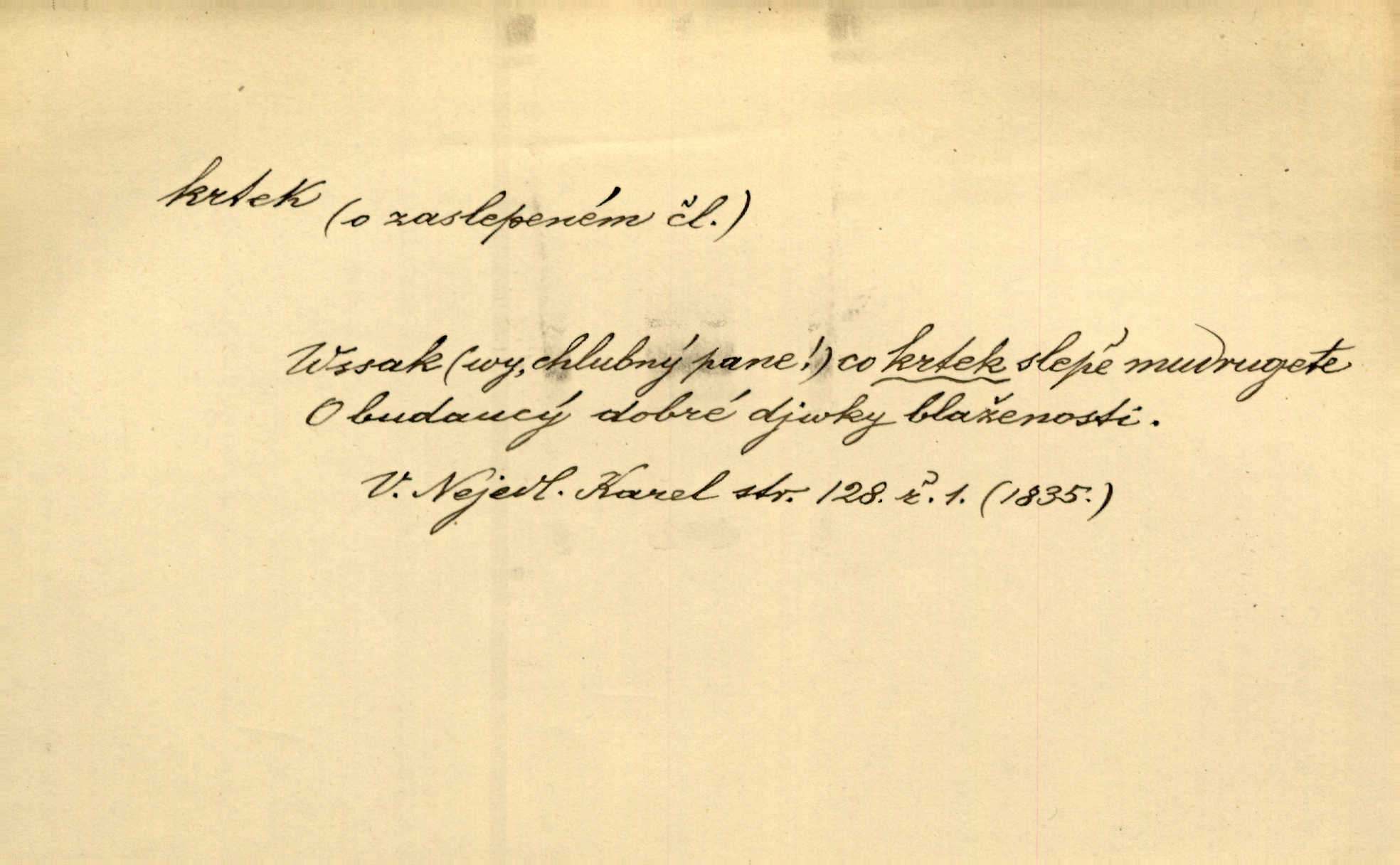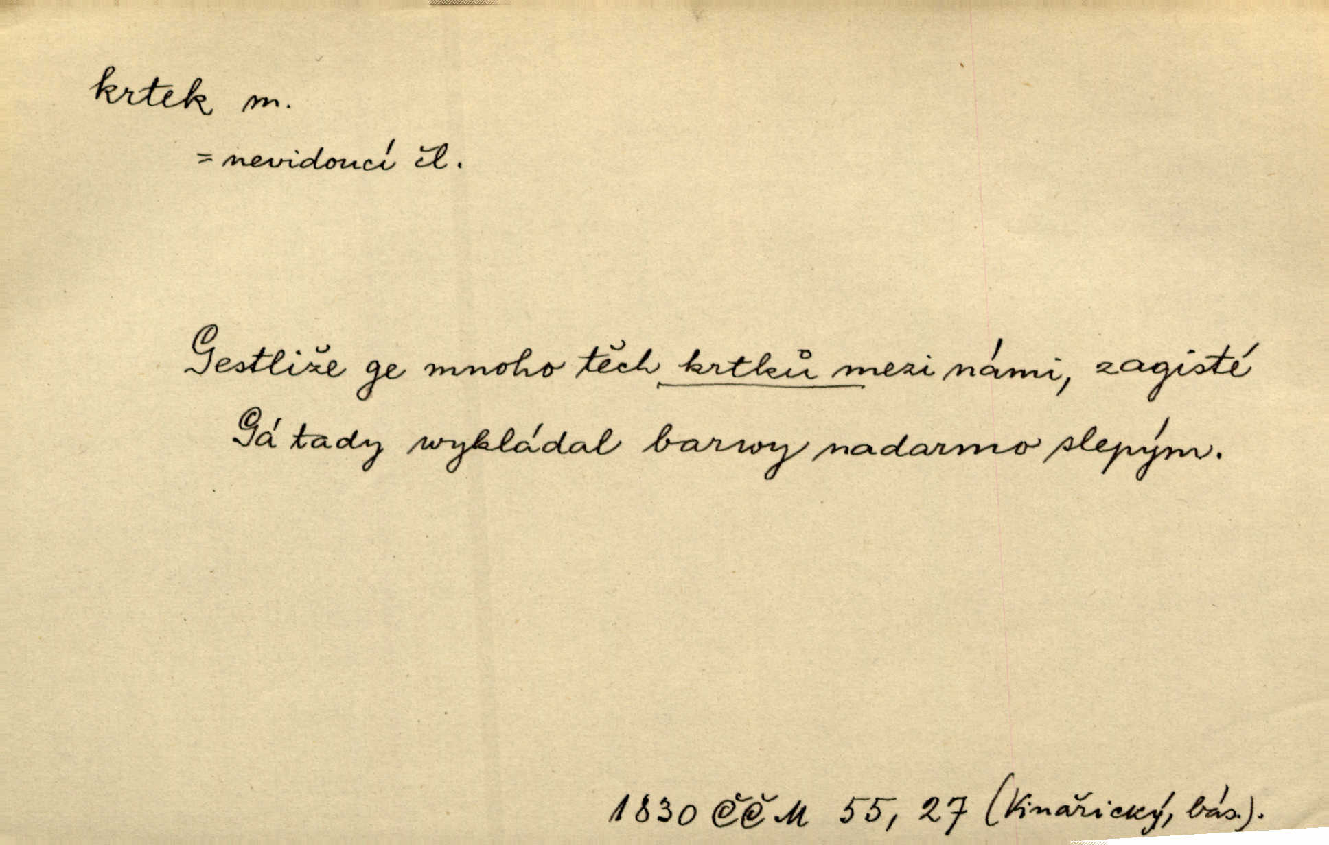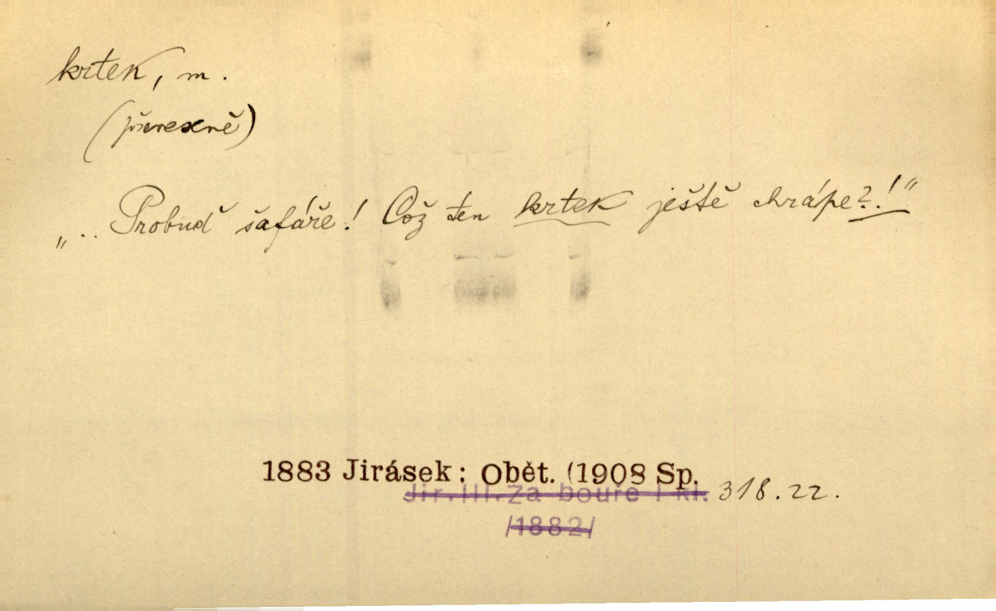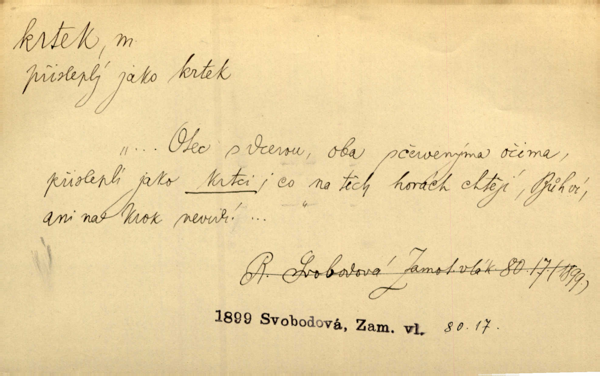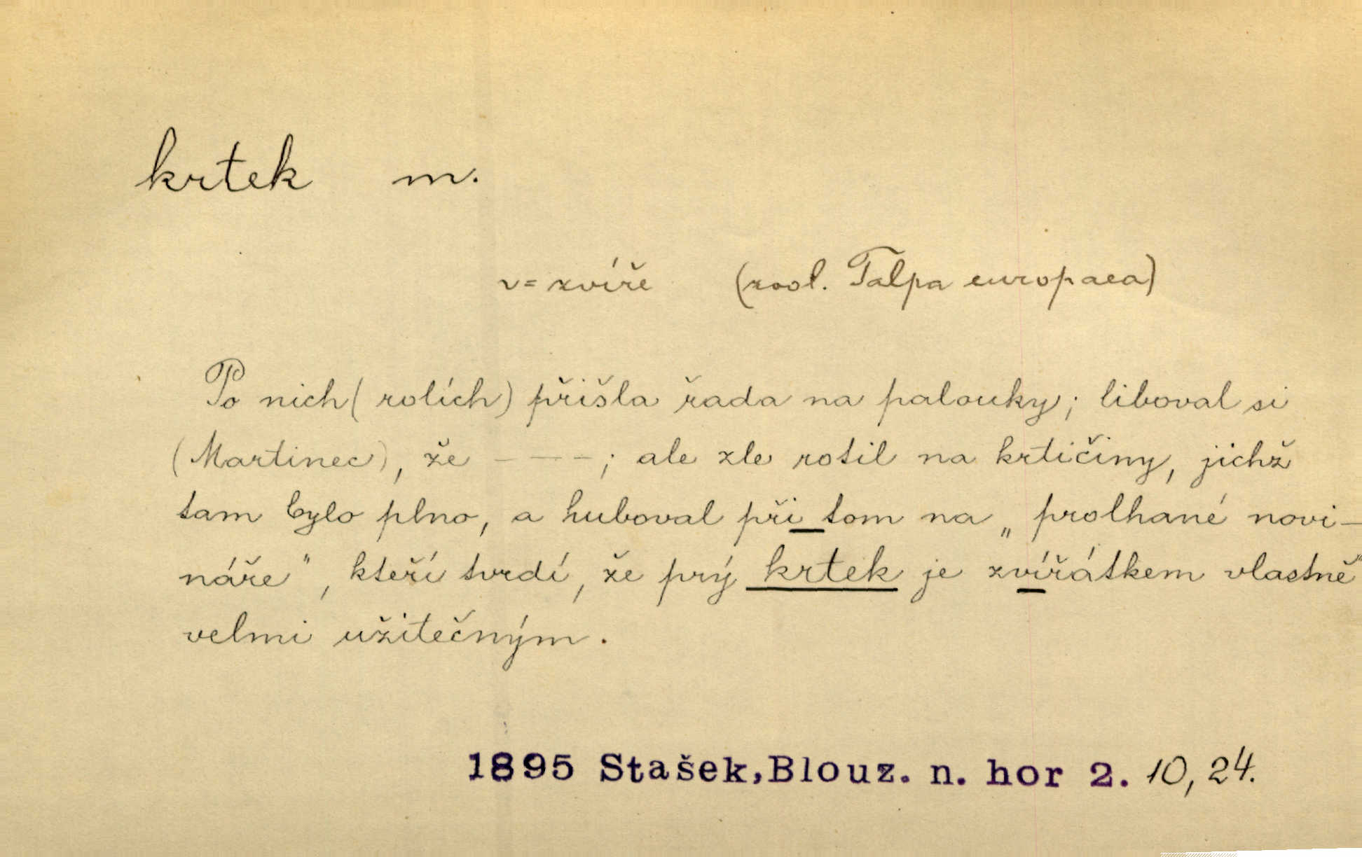 - krtek, -tka m. zool. krtkové čeleď ssavců hmyzožravých, Talpidae. Krtek obecný, slepý, hvězdonosý. K čemu živiti mezi sebou lidi, již nás jako krtci podrývají? Šmil. Celý den byl zahrabán v knihách jako krtek. Něm. Jak si člověk namlouvá, je slepý jako krtek. Herrm. Přen. Stal jsem se krtkem. Již ani nevycházím do přírody. Pořád ryji se v práci své. Podl. Probuď šafáře! Což ten krtek ještě chrápe?! Jir.