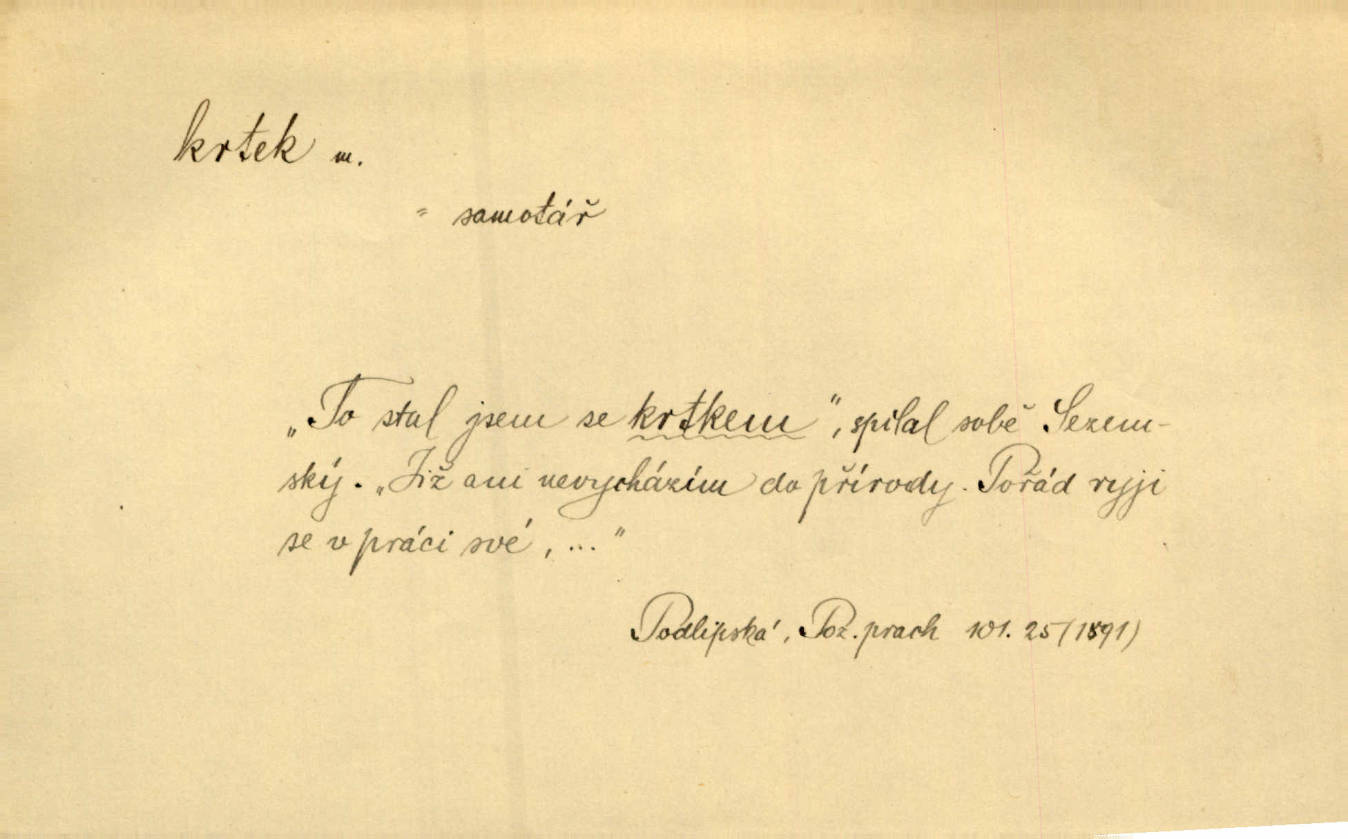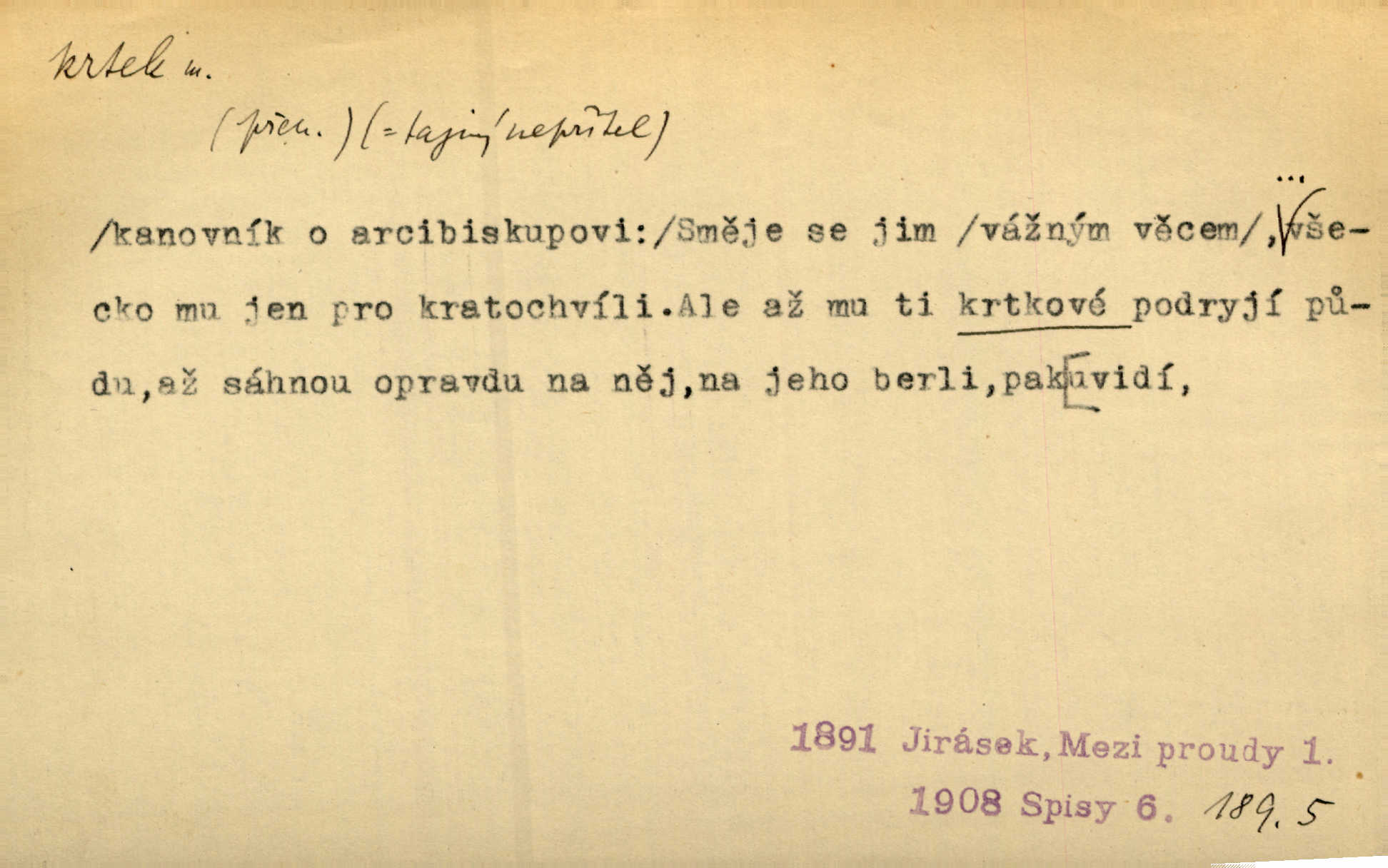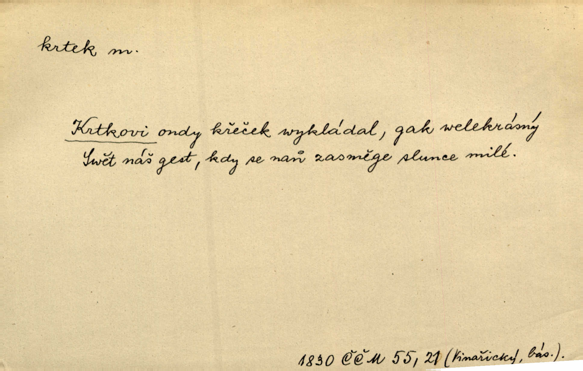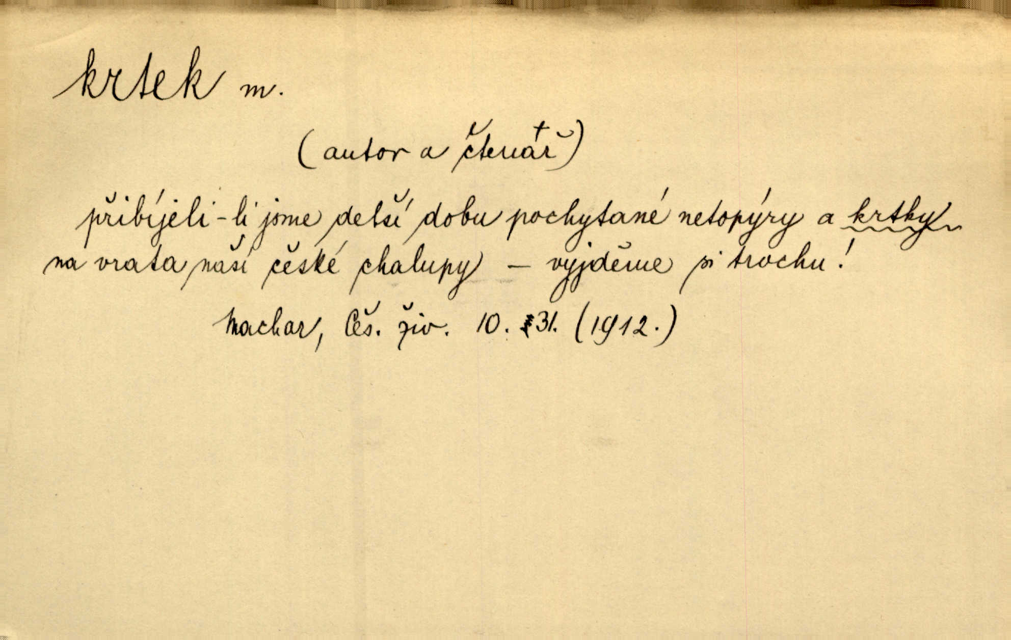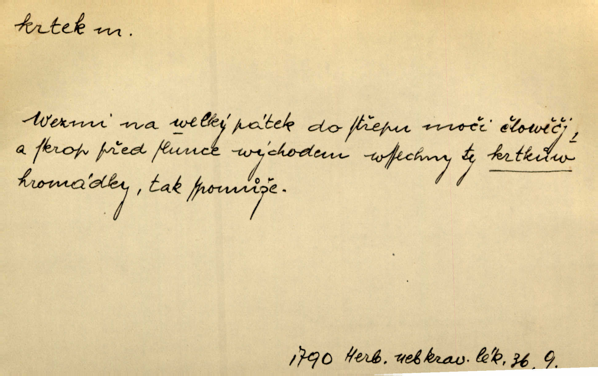 - krtek, -tka m. zool. krtkové čeleď ssavců hmyzožravých, Talpidae. Krtek obecný, slepý, hvězdonosý. K čemu živiti mezi sebou lidi, již nás jako krtci podrývají? Šmil. Celý den byl zahrabán v knihách jako krtek. Něm. Jak si člověk namlouvá, je slepý jako krtek. Herrm. Přen. Stal jsem se krtkem. Již ani nevycházím do přírody. Pořád ryji se v práci své. Podl. Probuď šafáře! Což ten krtek ještě chrápe?! Jir.