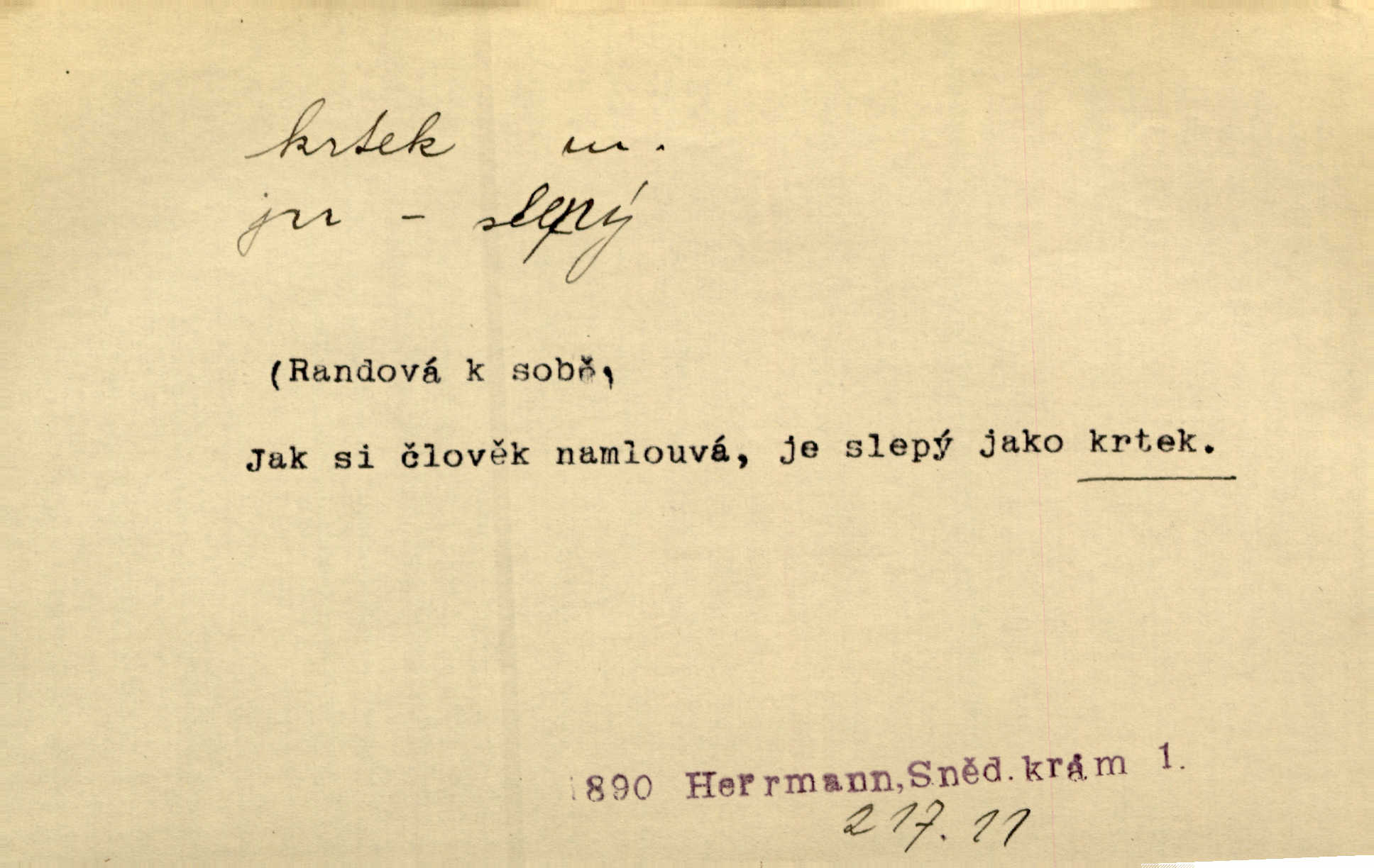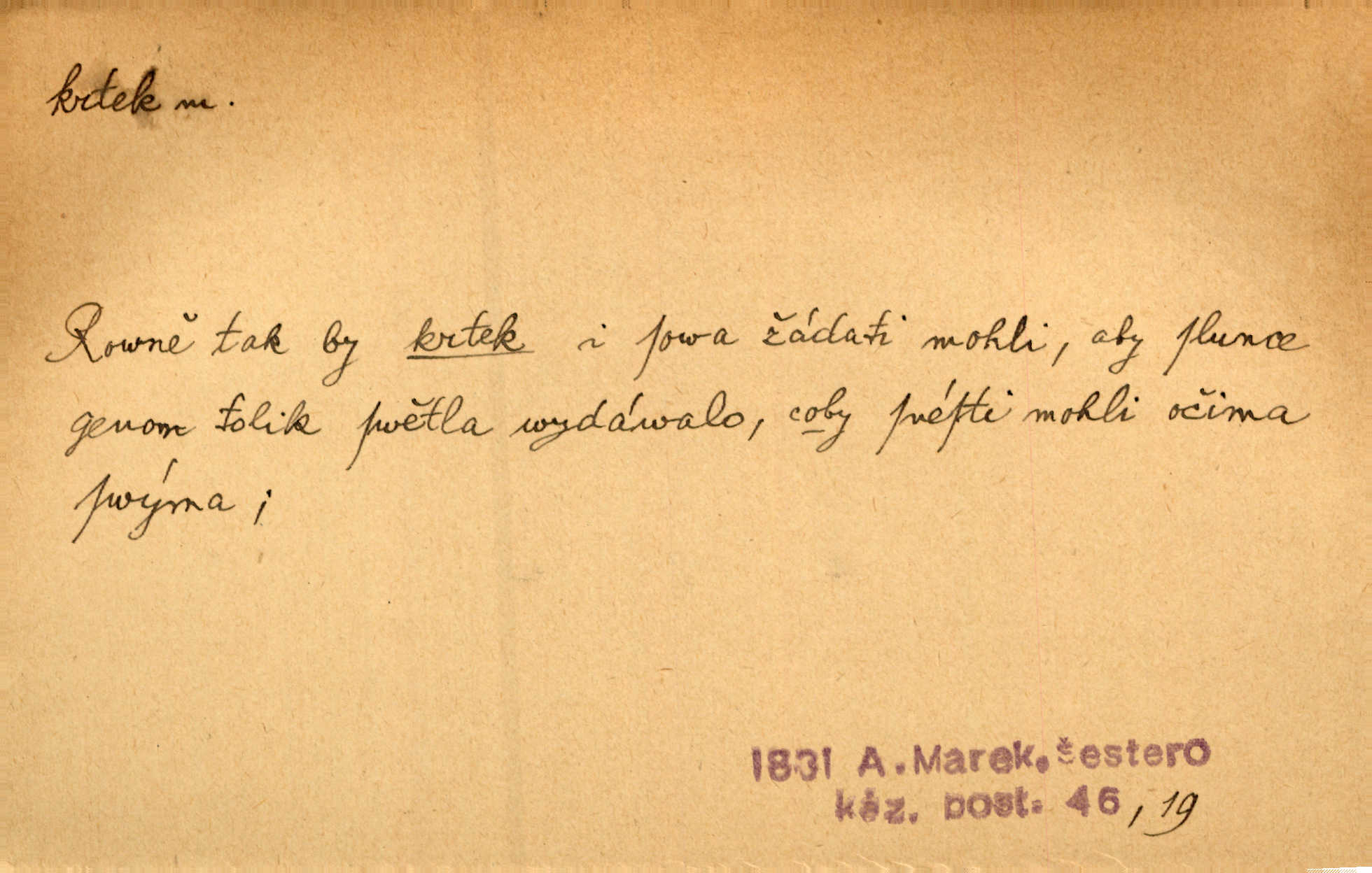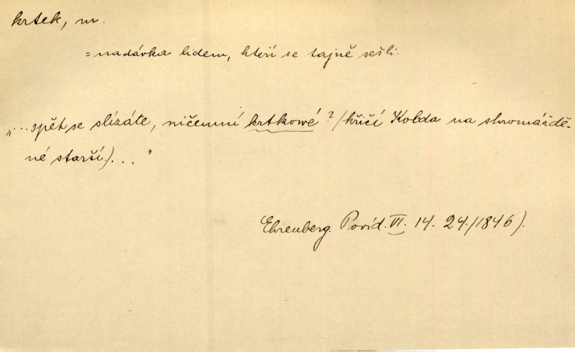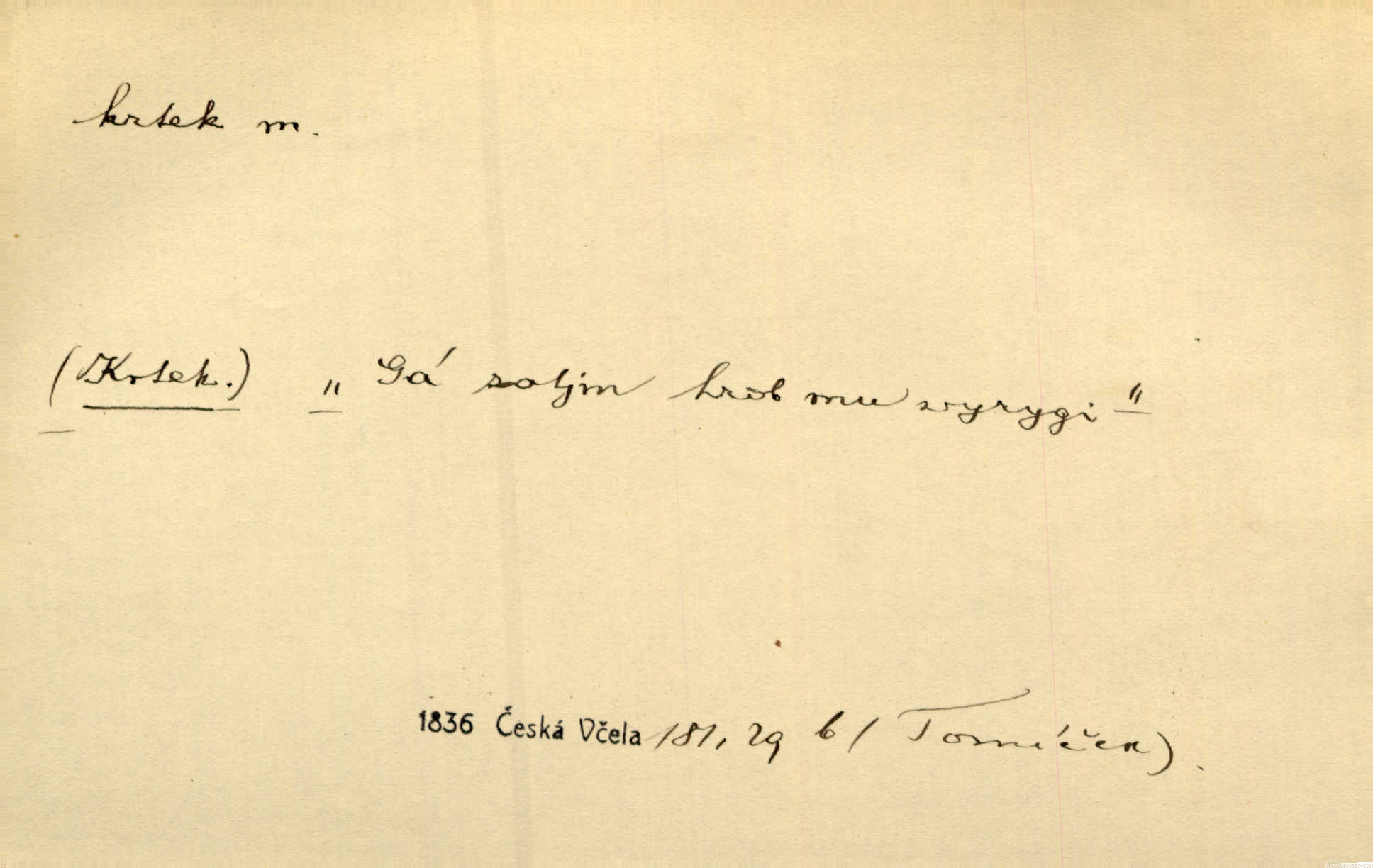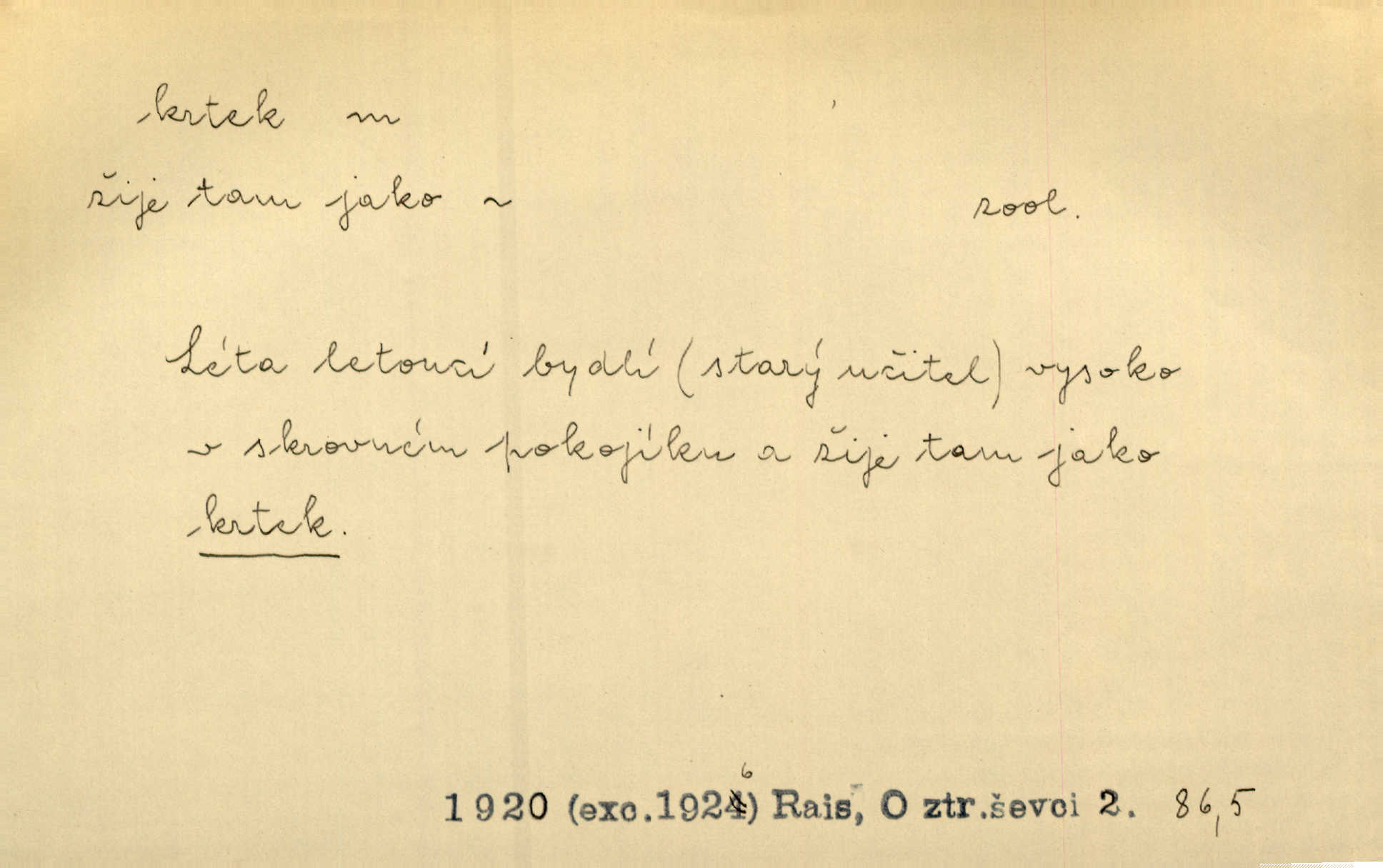 - krtek, -tka m. zool. krtkové čeleď ssavců hmyzožravých, Talpidae. Krtek obecný, slepý, hvězdonosý. K čemu živiti mezi sebou lidi, již nás jako krtci podrývají? Šmil. Celý den byl zahrabán v knihách jako krtek. Něm. Jak si člověk namlouvá, je slepý jako krtek. Herrm. Přen. Stal jsem se krtkem. Již ani nevycházím do přírody. Pořád ryji se v práci své. Podl. Probuď šafáře! Což ten krtek ještě chrápe?! Jir.
