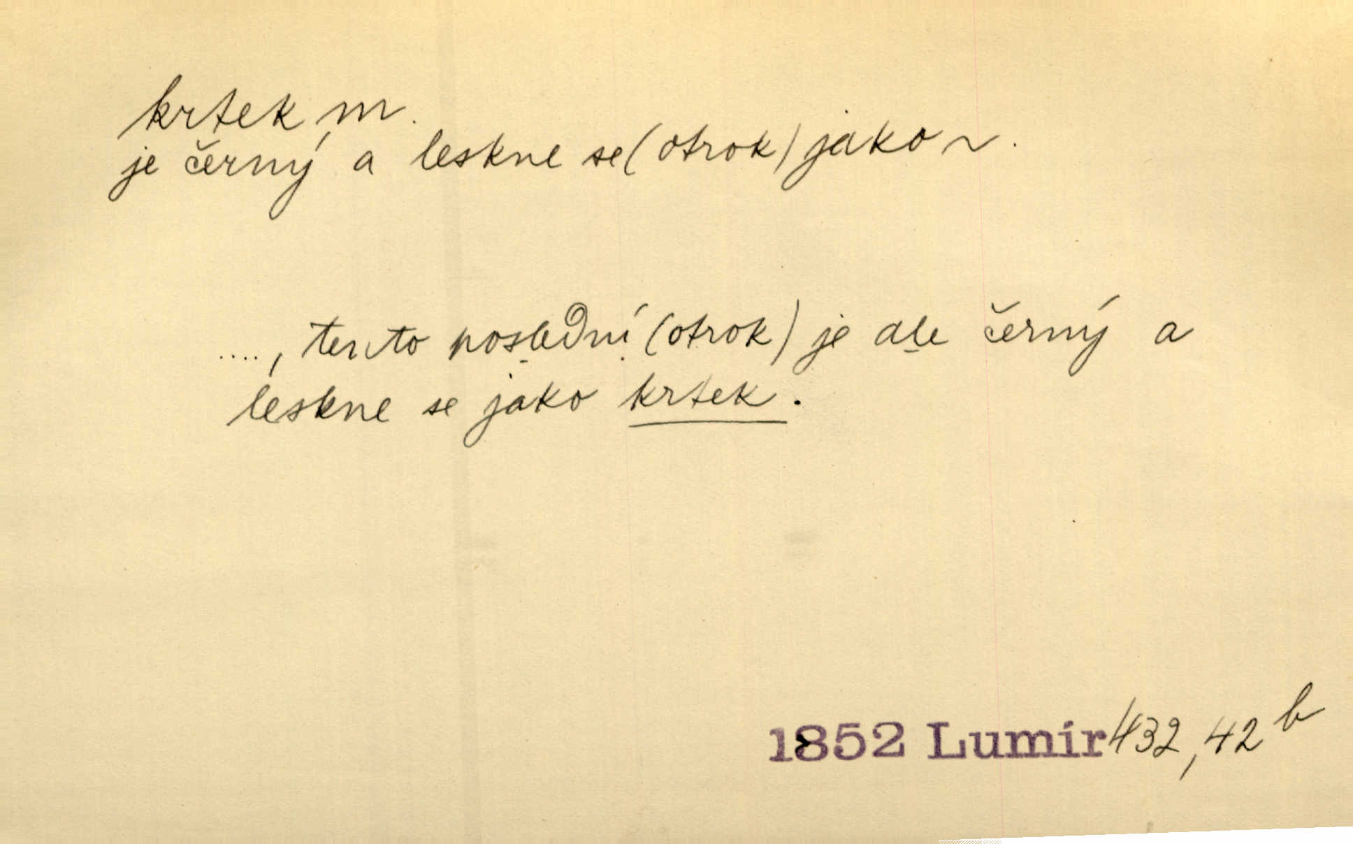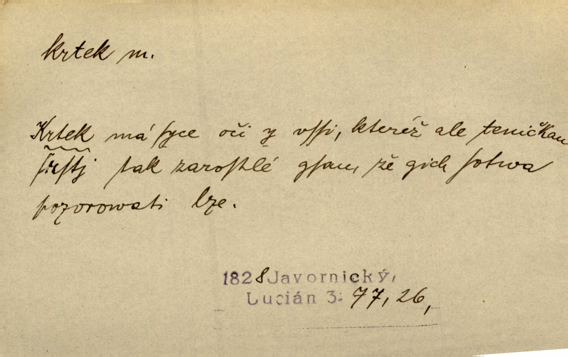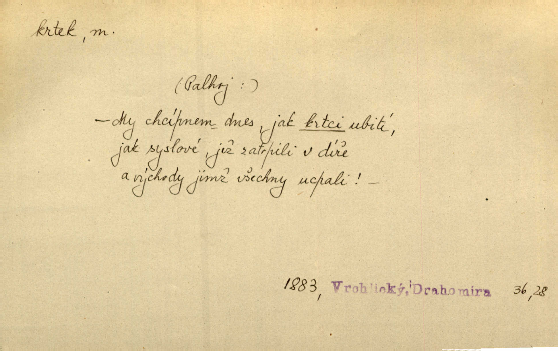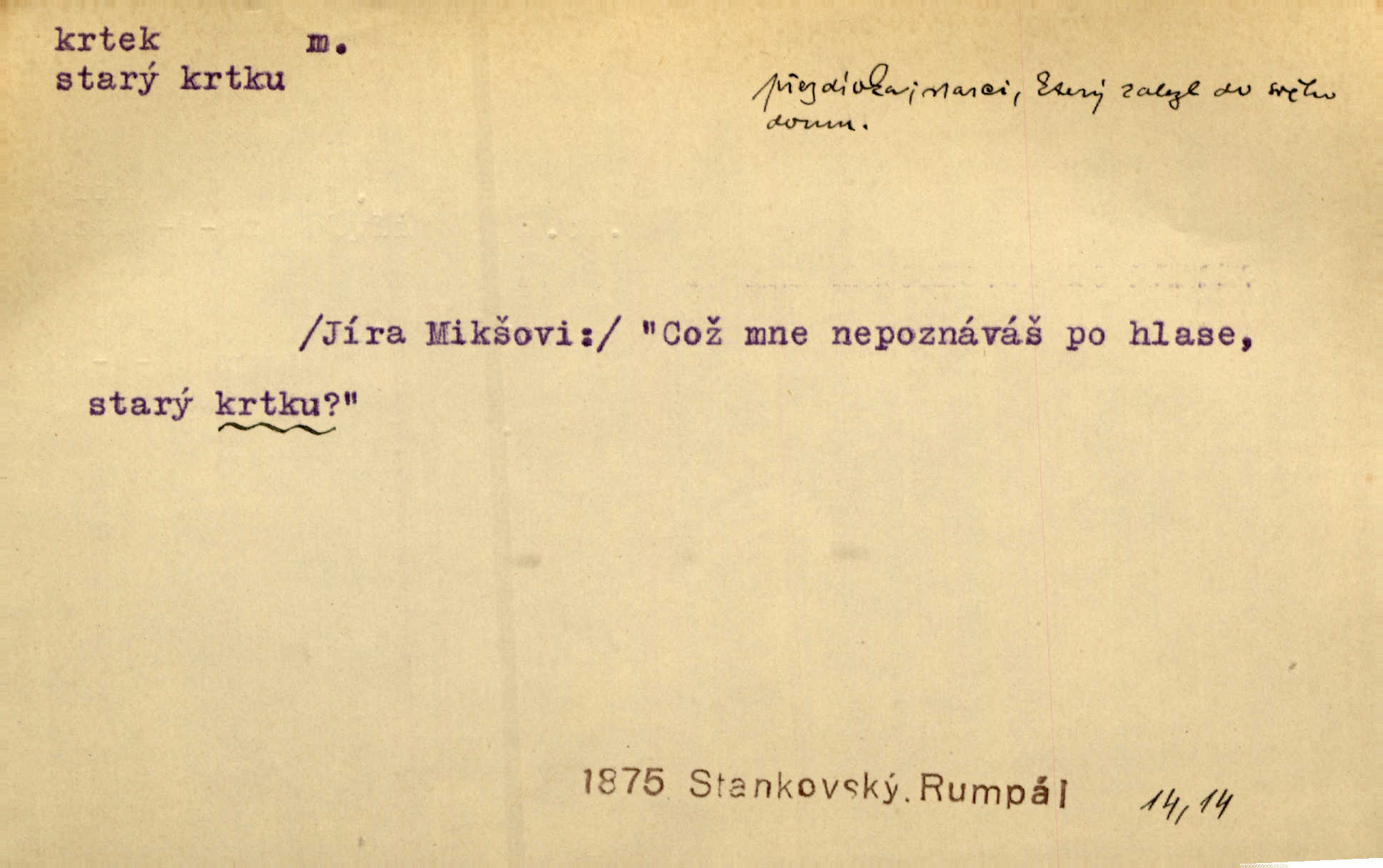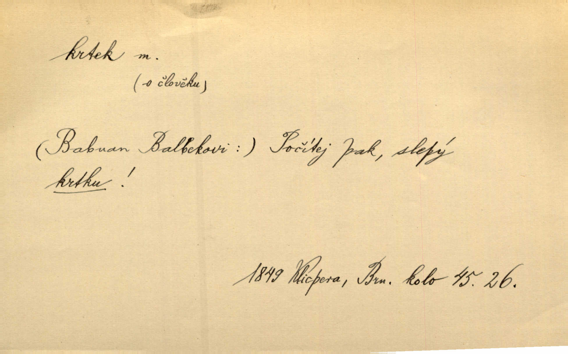 - krtek, -tka m. zool. krtkové čeleď ssavců hmyzožravých, Talpidae. Krtek obecný, slepý, hvězdonosý. K čemu živiti mezi sebou lidi, již nás jako krtci podrývají? Šmil. Celý den byl zahrabán v knihách jako krtek. Něm. Jak si člověk namlouvá, je slepý jako krtek. Herrm. Přen. Stal jsem se krtkem. Již ani nevycházím do přírody. Pořád ryji se v práci své. Podl. Probuď šafáře! Což ten krtek ještě chrápe?! Jir.