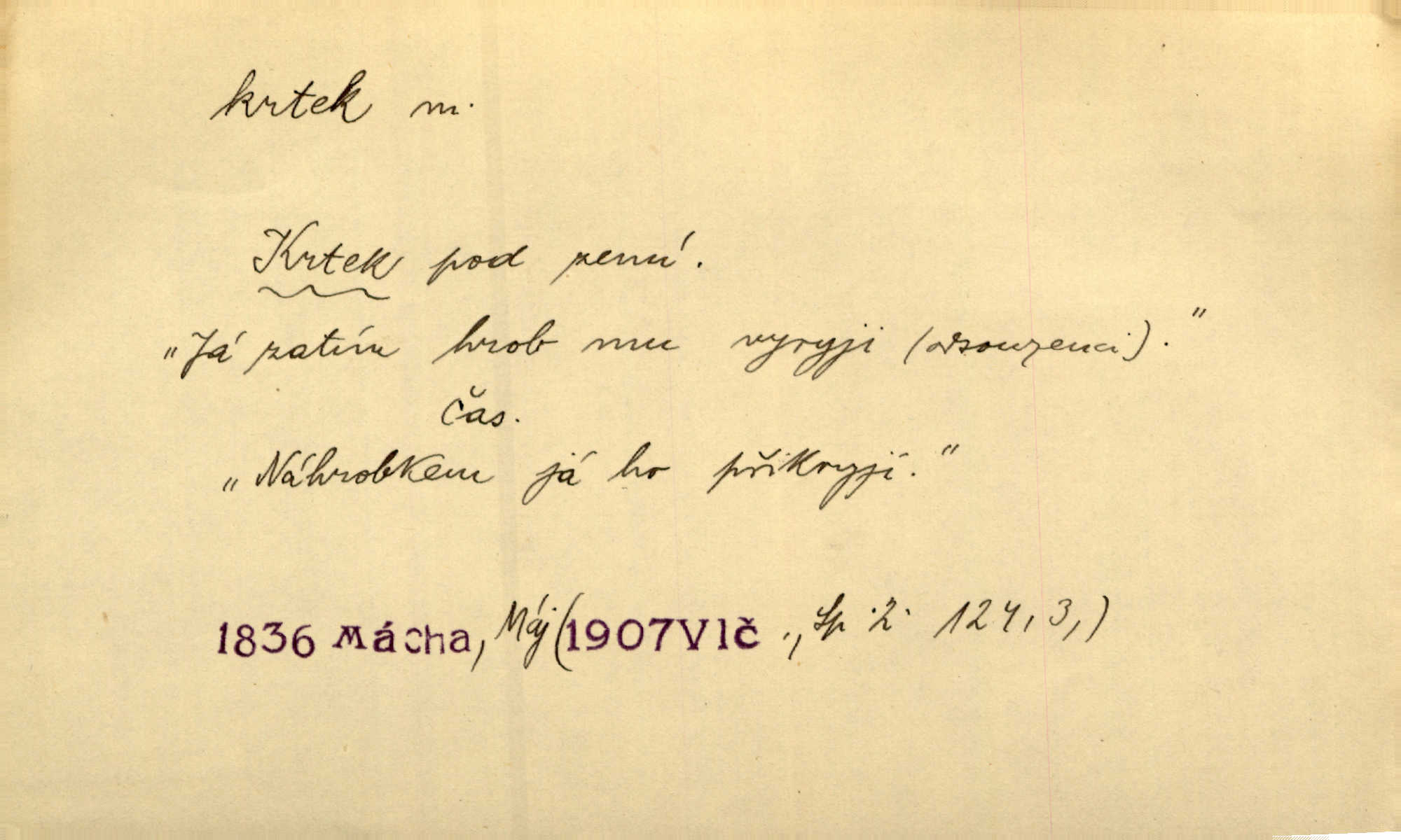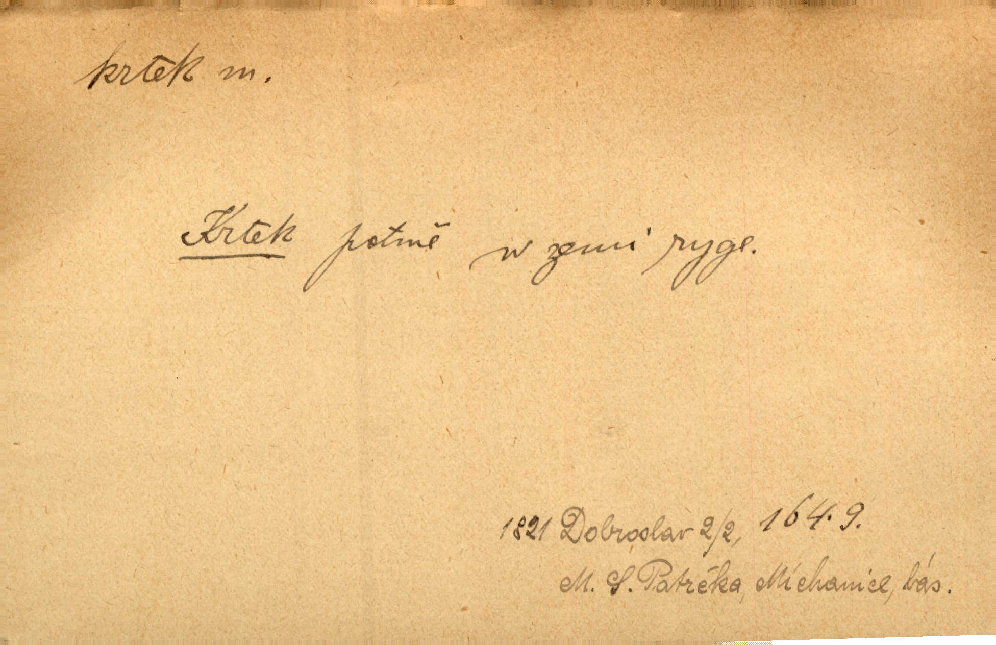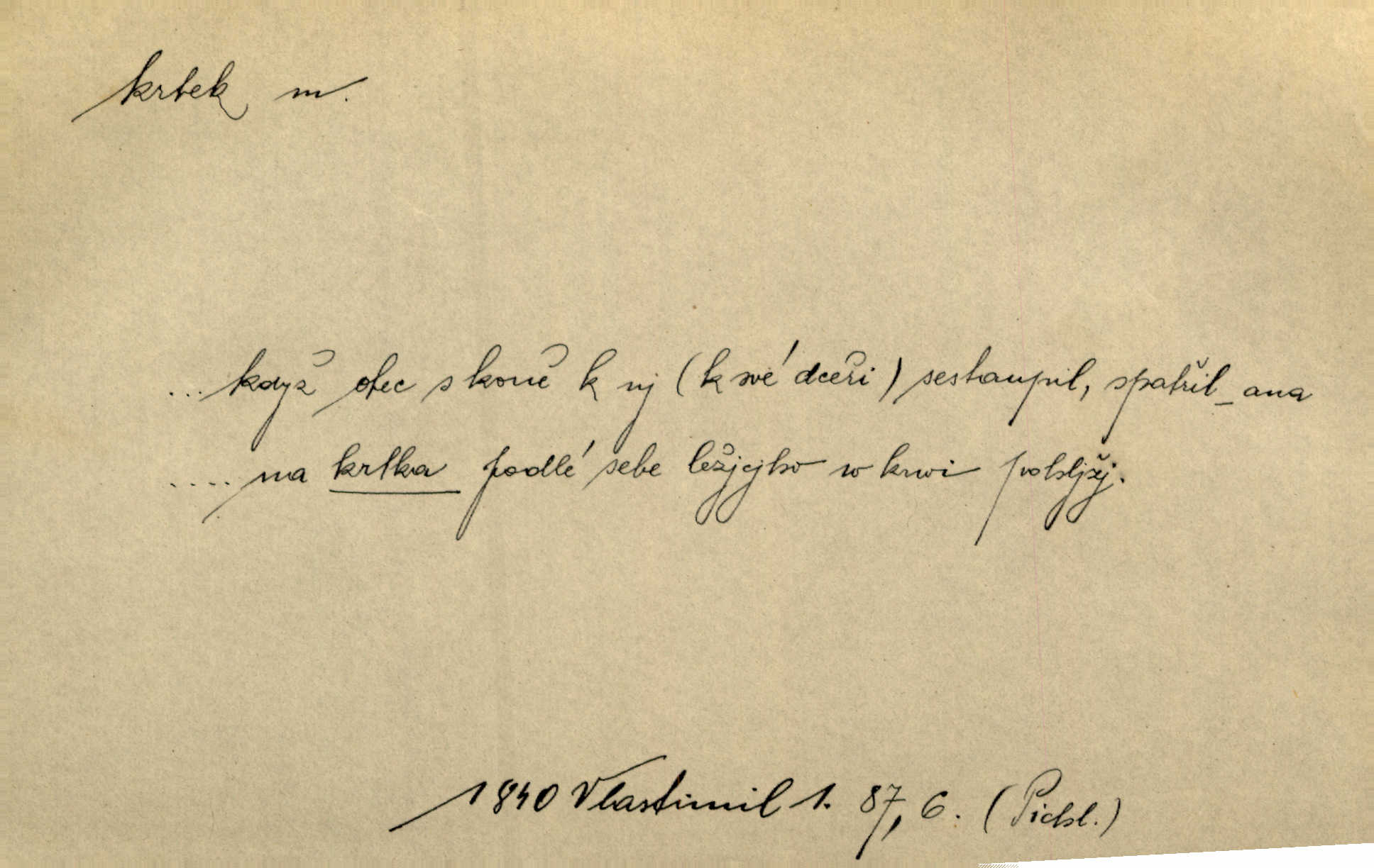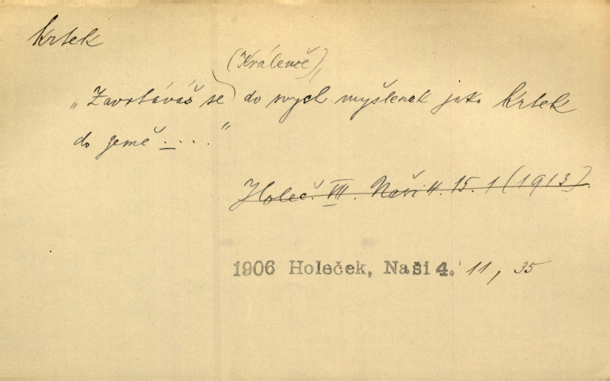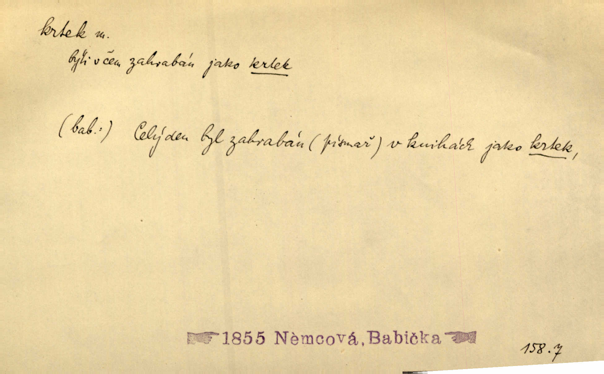 - krtek, -tka m. zool. krtkové čeleď ssavců hmyzožravých, Talpidae. Krtek obecný, slepý, hvězdonosý. K čemu živiti mezi sebou lidi, již nás jako krtci podrývají? Šmil. Celý den byl zahrabán v knihách jako krtek. Něm. Jak si člověk namlouvá, je slepý jako krtek. Herrm. Přen. Stal jsem se krtkem. Již ani nevycházím do přírody. Pořád ryji se v práci své. Podl. Probuď šafáře! Což ten krtek ještě chrápe?! Jir.