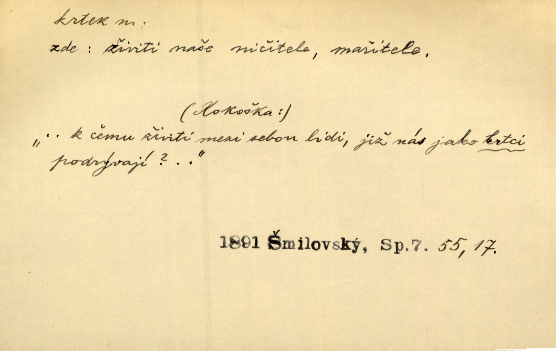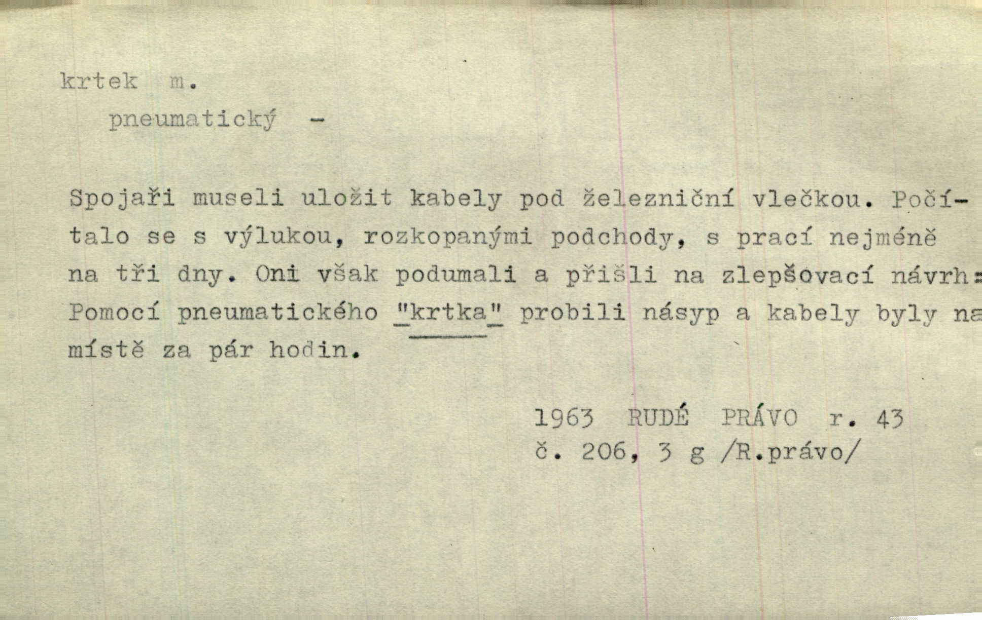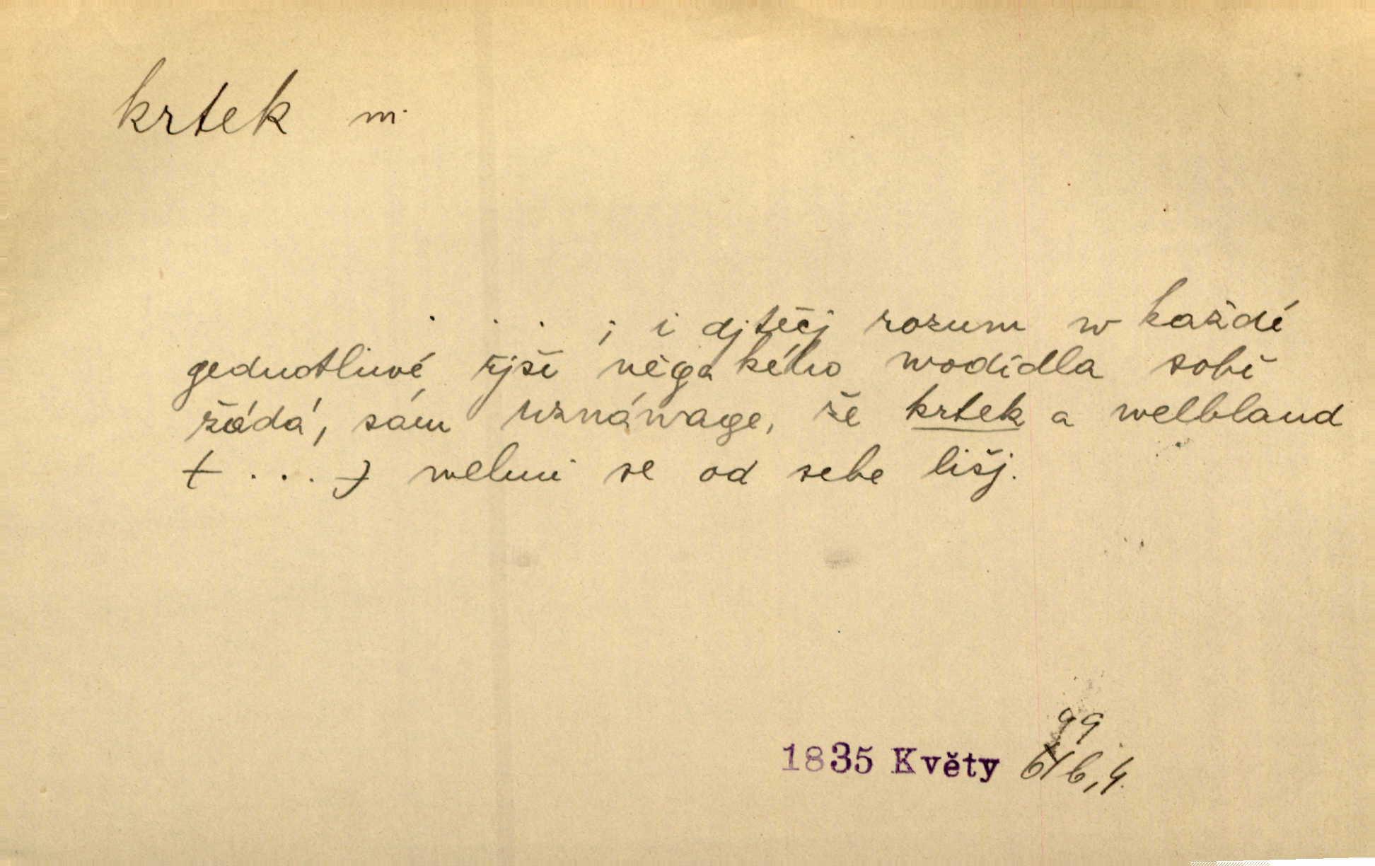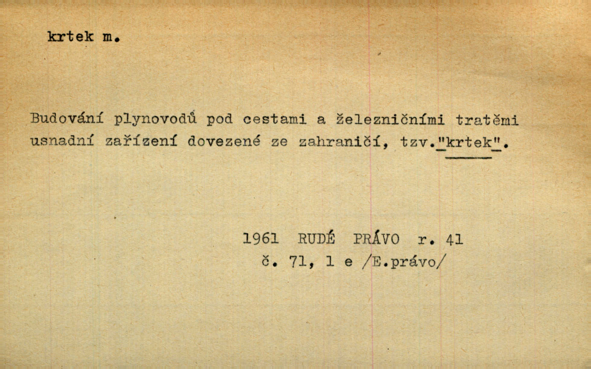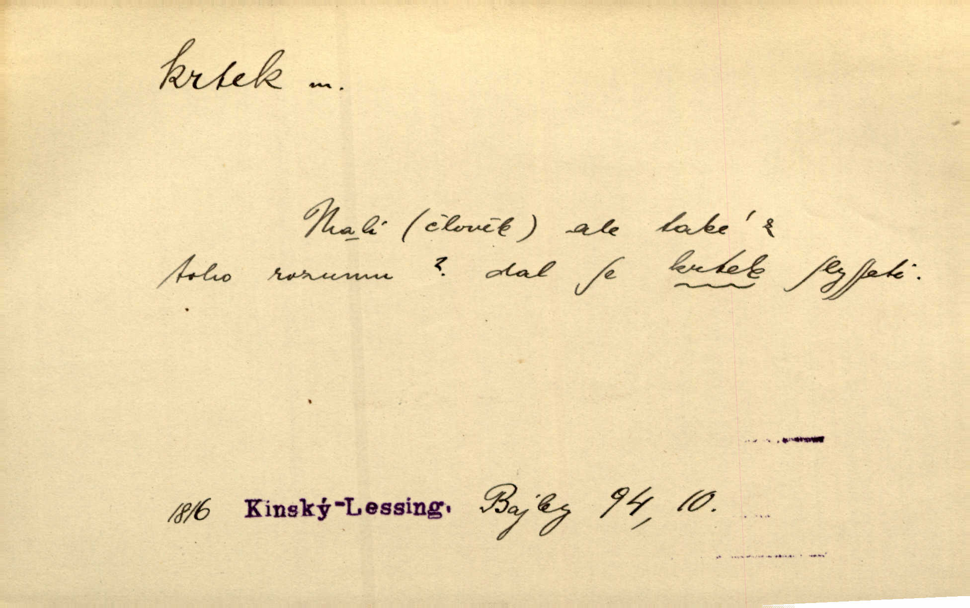- krtek, -tka m. zool. krtkové čeleď ssavců hmyzožravých, Talpidae. Krtek obecný, slepý, hvězdonosý. K čemu živiti mezi sebou lidi, již nás jako krtci podrývají? Šmil. Celý den byl zahrabán v knihách jako krtek. Něm. Jak si člověk namlouvá, je slepý jako krtek. Herrm. Přen. Stal jsem se krtkem. Již ani nevycházím do přírody. Pořád ryji se v práci své. Podl. Probuď šafáře! Což ten krtek ještě chrápe?! Jir.