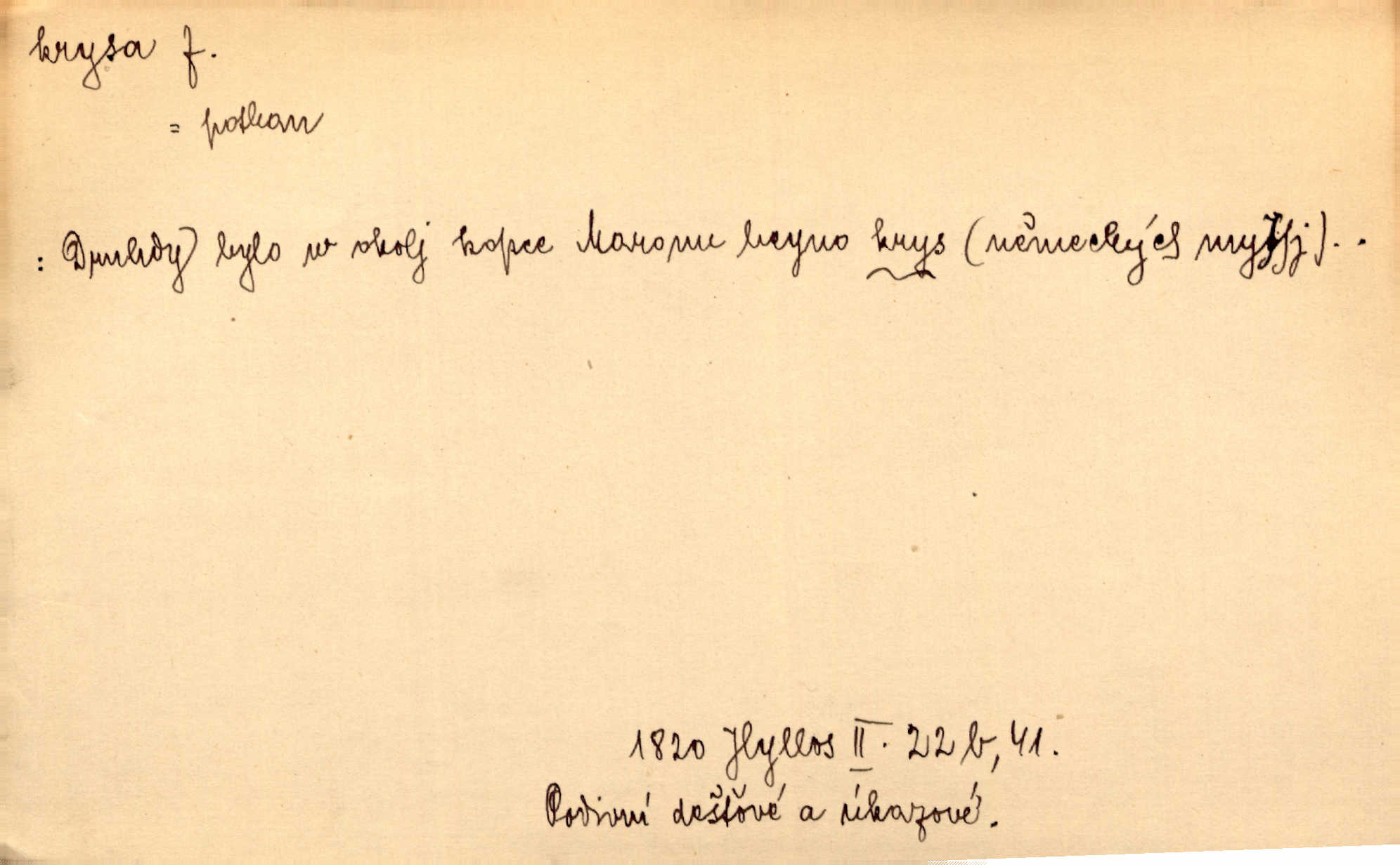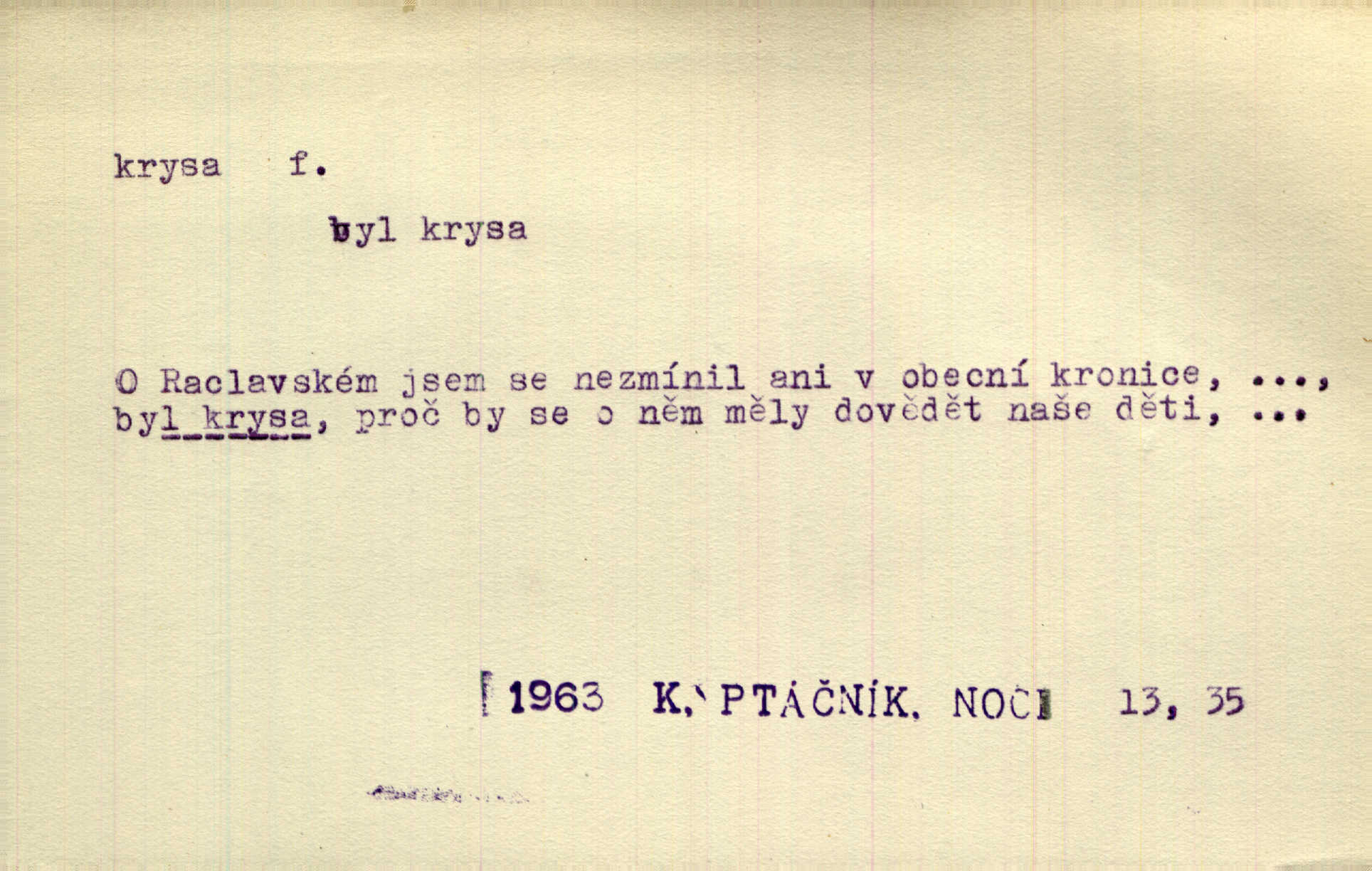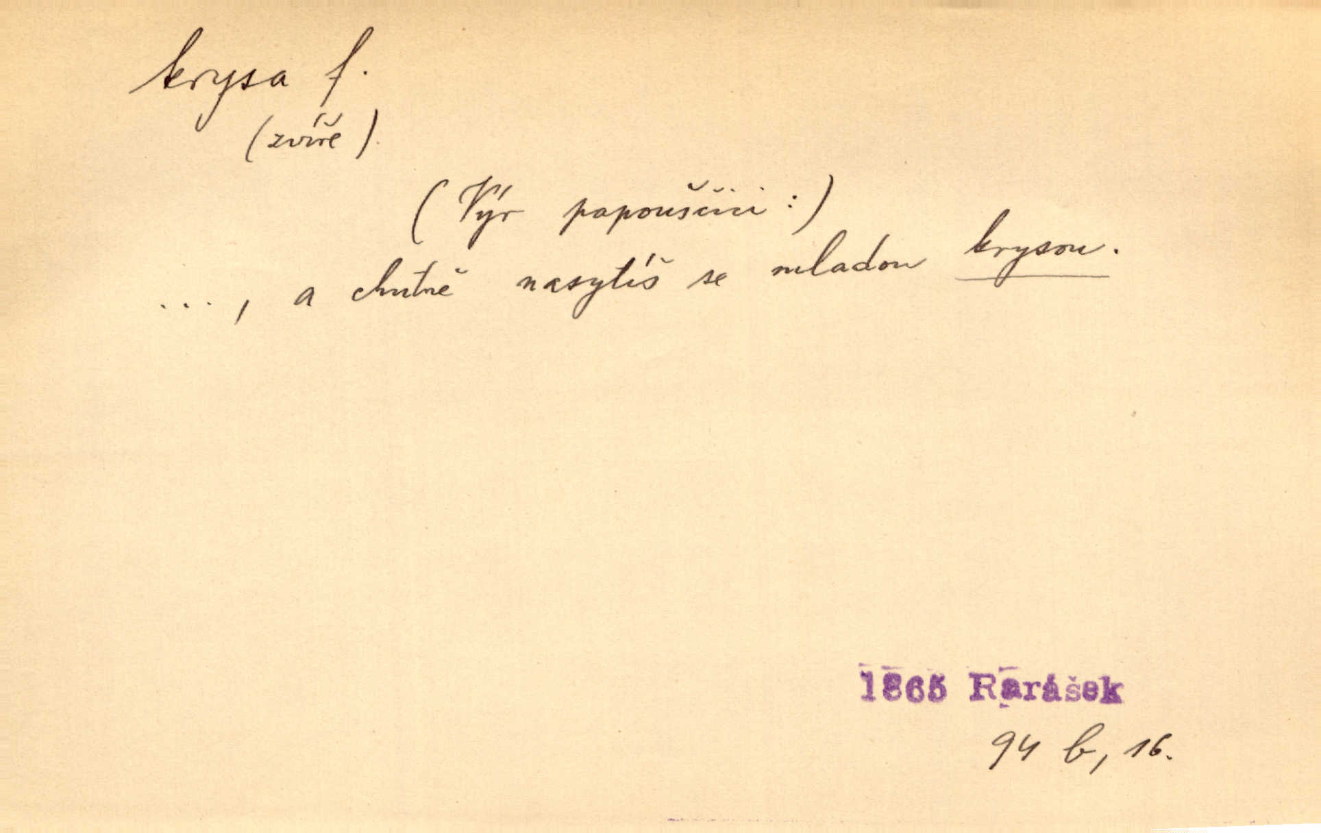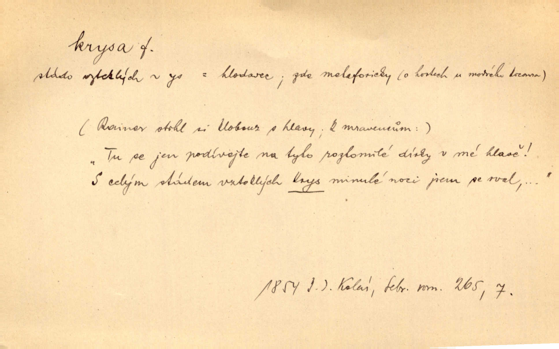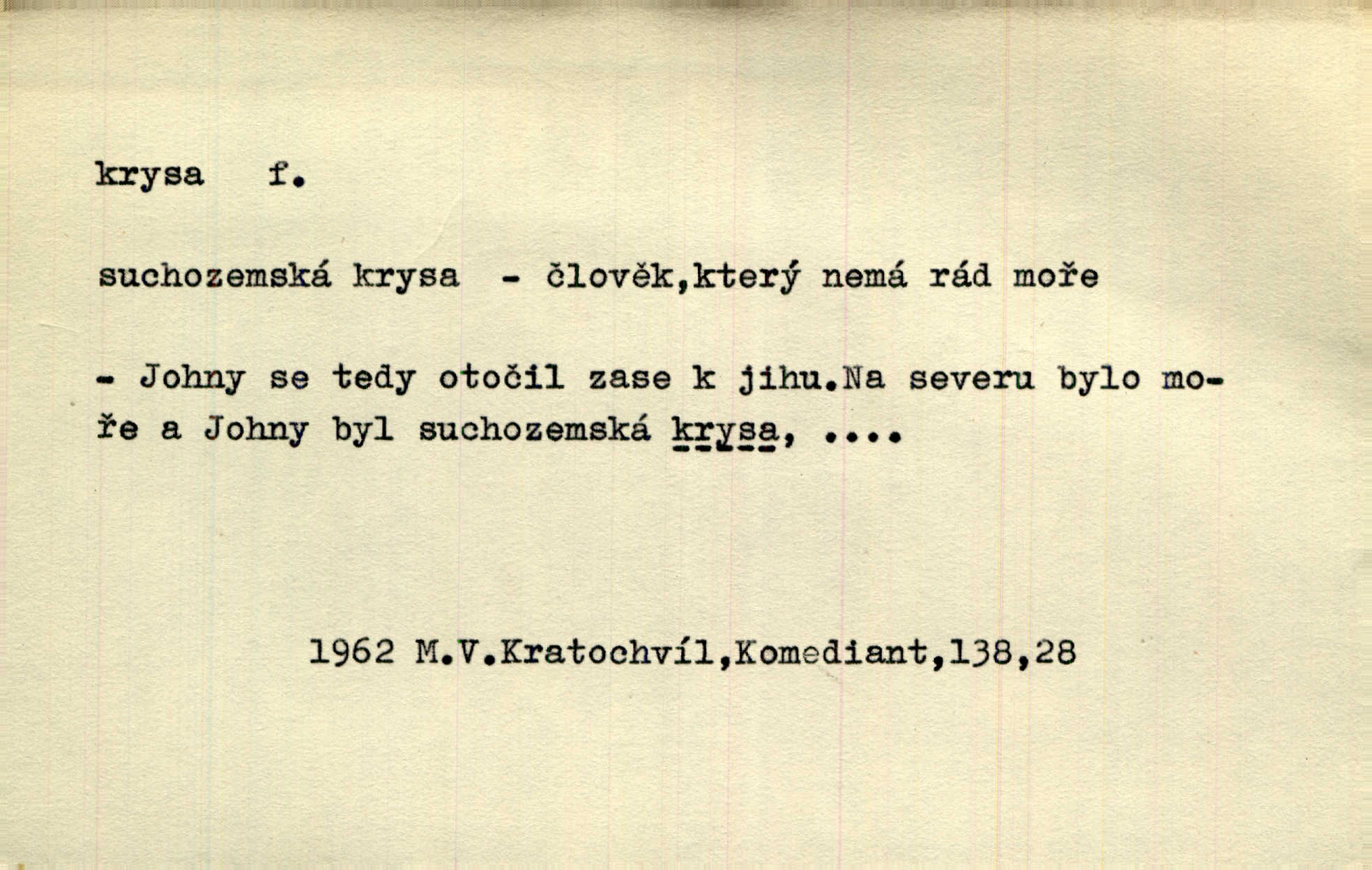 - krysa, -y f. veliká myš. Podél stěny kráčela klidně veliká krysa, snad královna zdejšího početného národa německých myší. Čap. Ch. „Snad že to bude vodní krysa“, pomyslíme si. Thom. Dal jste mu do kafe jed na krysy. K. Čap. Jako pronásledovaná krysa zmizela [Veruna] někde v bludišti chalup, dvorků a mezírek. Mrš. Zool. druh hlodavců z čeledi myší, Epimys norvegicus. Krysa pižmová Fiber zibethicus, ondatra. D Expr. o lidech připomínajících svými vlastnostmi nějak krysy. U [mořského] přístavu bylo pro suchozemské krysy, jakými jsme my, národ bez moře, ustavičně nač se dívati. Lang. Pracovali a přičiňovali jsme se [aspiranti]‚ strhujíce každý práce za deset starých, definitivních krys kancelářských. Šlej. Ta krysa [domácí pán] zakeťasovala byt za skladiště. Olb. Jeden člověk, který se schoval v pokoji, kde se porady konávaly, byl personálem pokládán za hotelovou krysu zloděje. Maj.