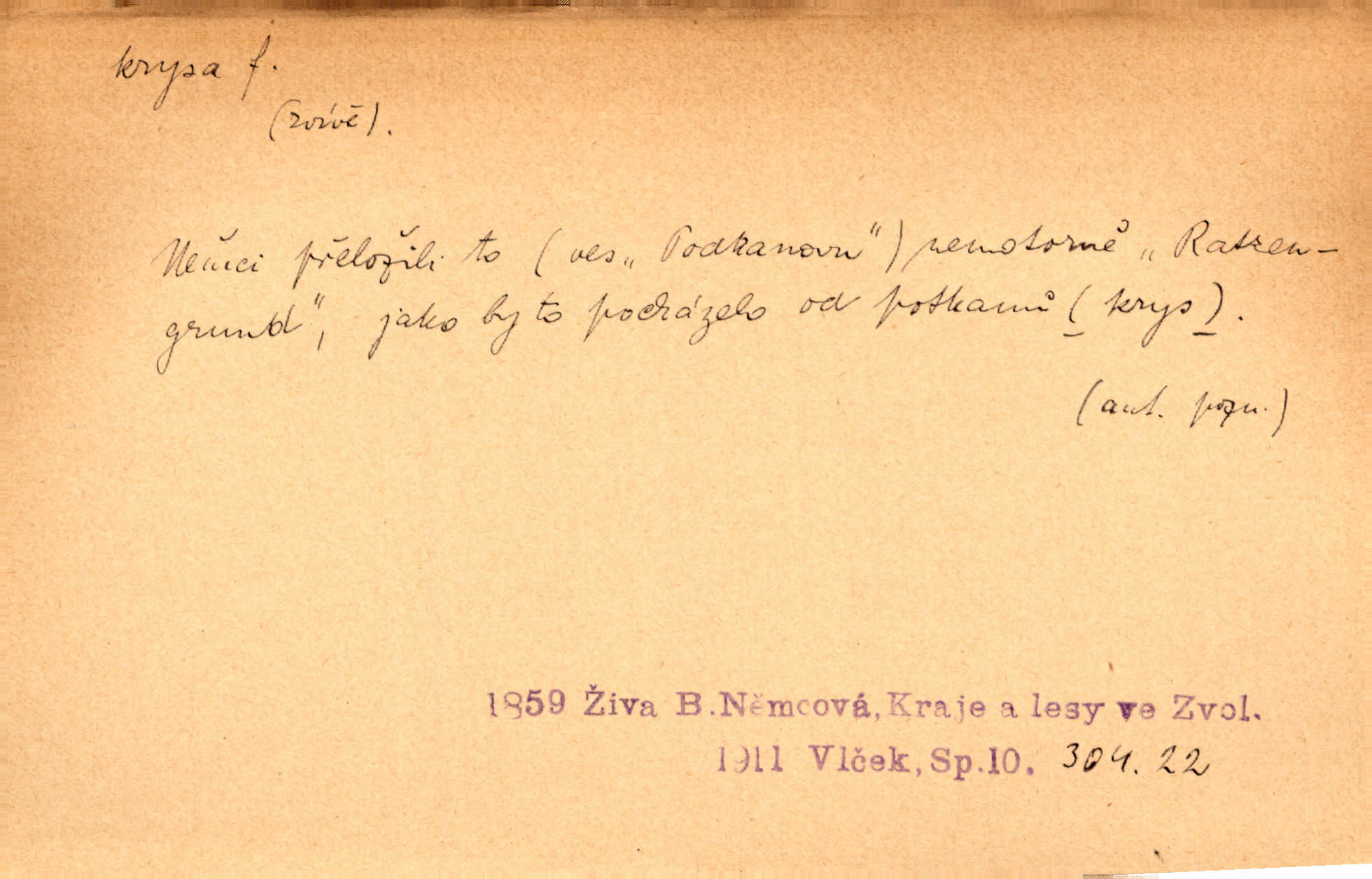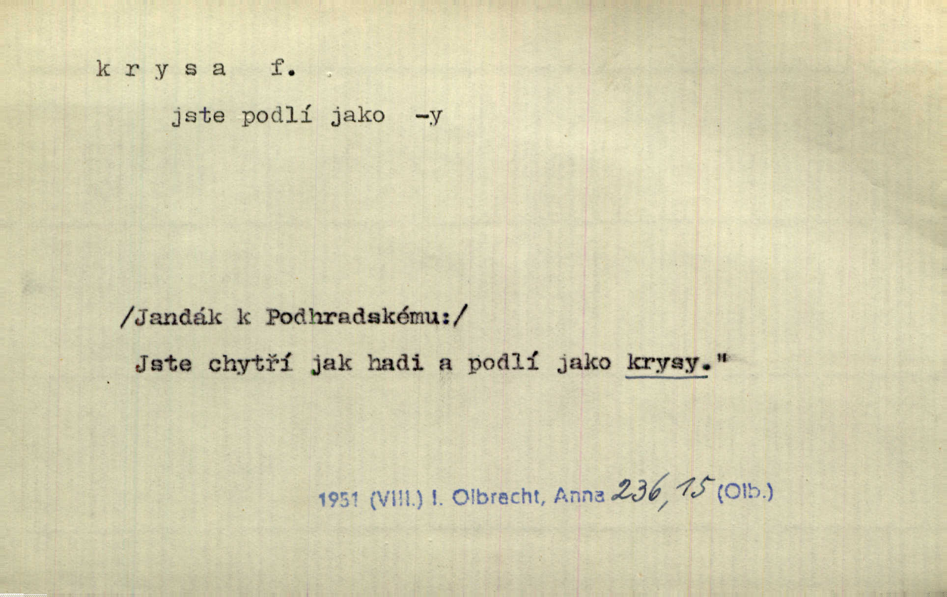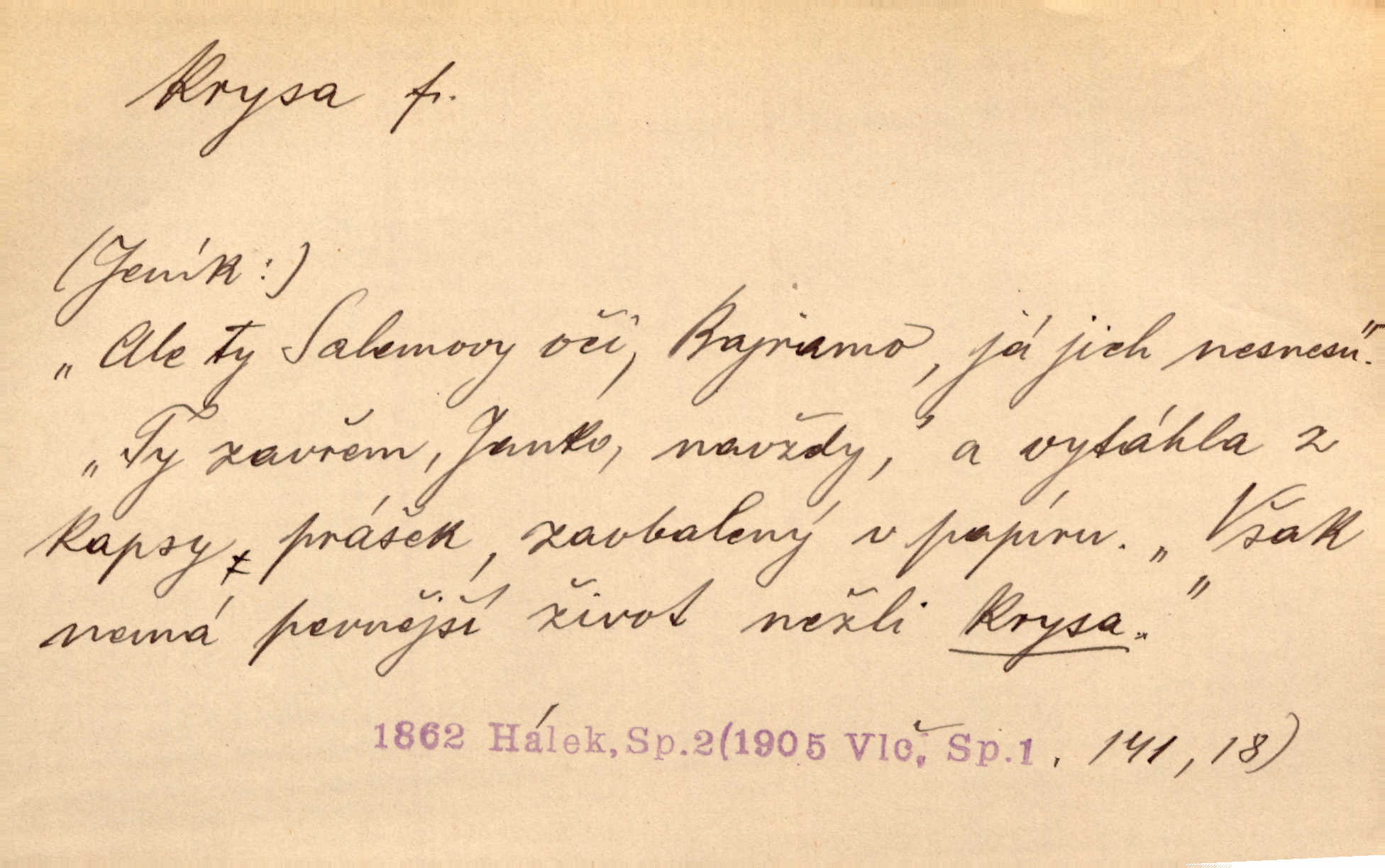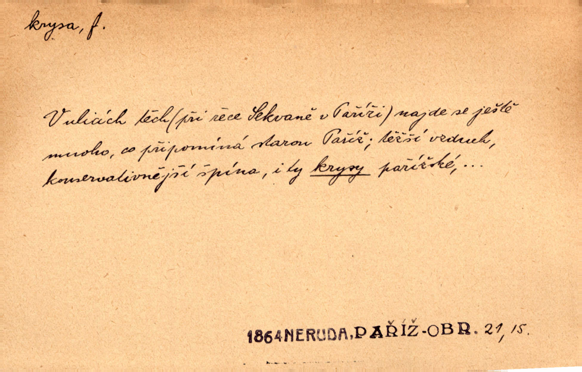 - krysa, -y f. veliká myš. Podél stěny kráčela klidně veliká krysa, snad královna zdejšího početného národa německých myší. Čap. Ch. „Snad že to bude vodní krysa“, pomyslíme si. Thom. Dal jste mu do kafe jed na krysy. K. Čap. Jako pronásledovaná krysa zmizela [Veruna] někde v bludišti chalup, dvorků a mezírek. Mrš. Zool. druh hlodavců z čeledi myší, Epimys norvegicus. Krysa pižmová Fiber zibethicus, ondatra. D Expr. o lidech připomínajících svými vlastnostmi nějak krysy. U [mořského] přístavu bylo pro suchozemské krysy, jakými jsme my, národ bez moře, ustavičně nač se dívati. Lang. Pracovali a přičiňovali jsme se [aspiranti]‚ strhujíce každý práce za deset starých, definitivních krys kancelářských. Šlej. Ta krysa [domácí pán] zakeťasovala byt za skladiště. Olb. Jeden člověk, který se schoval v pokoji, kde se porady konávaly, byl personálem pokládán za hotelovou krysu zloděje. Maj.