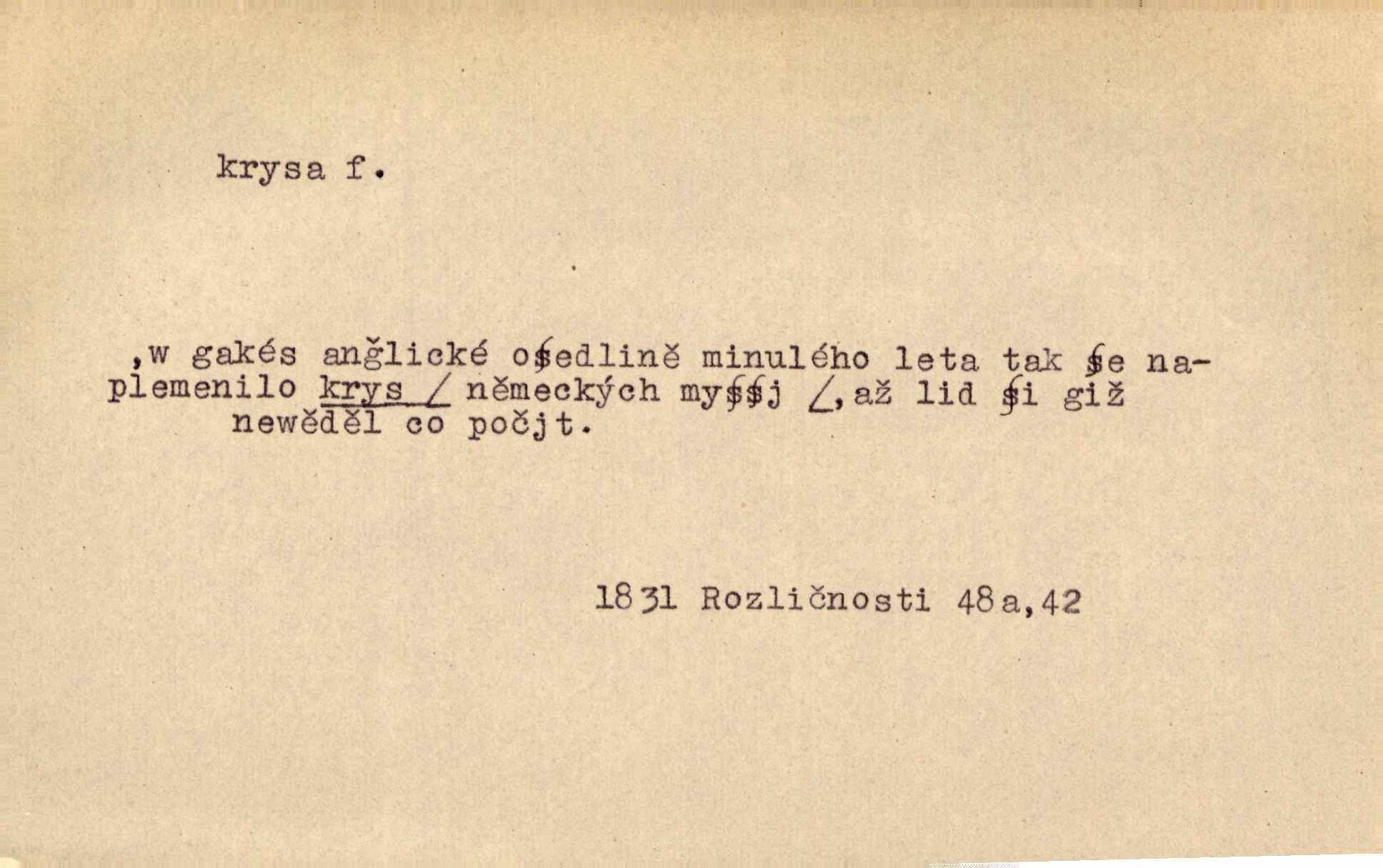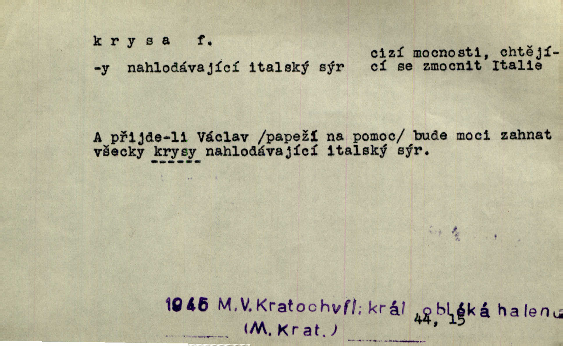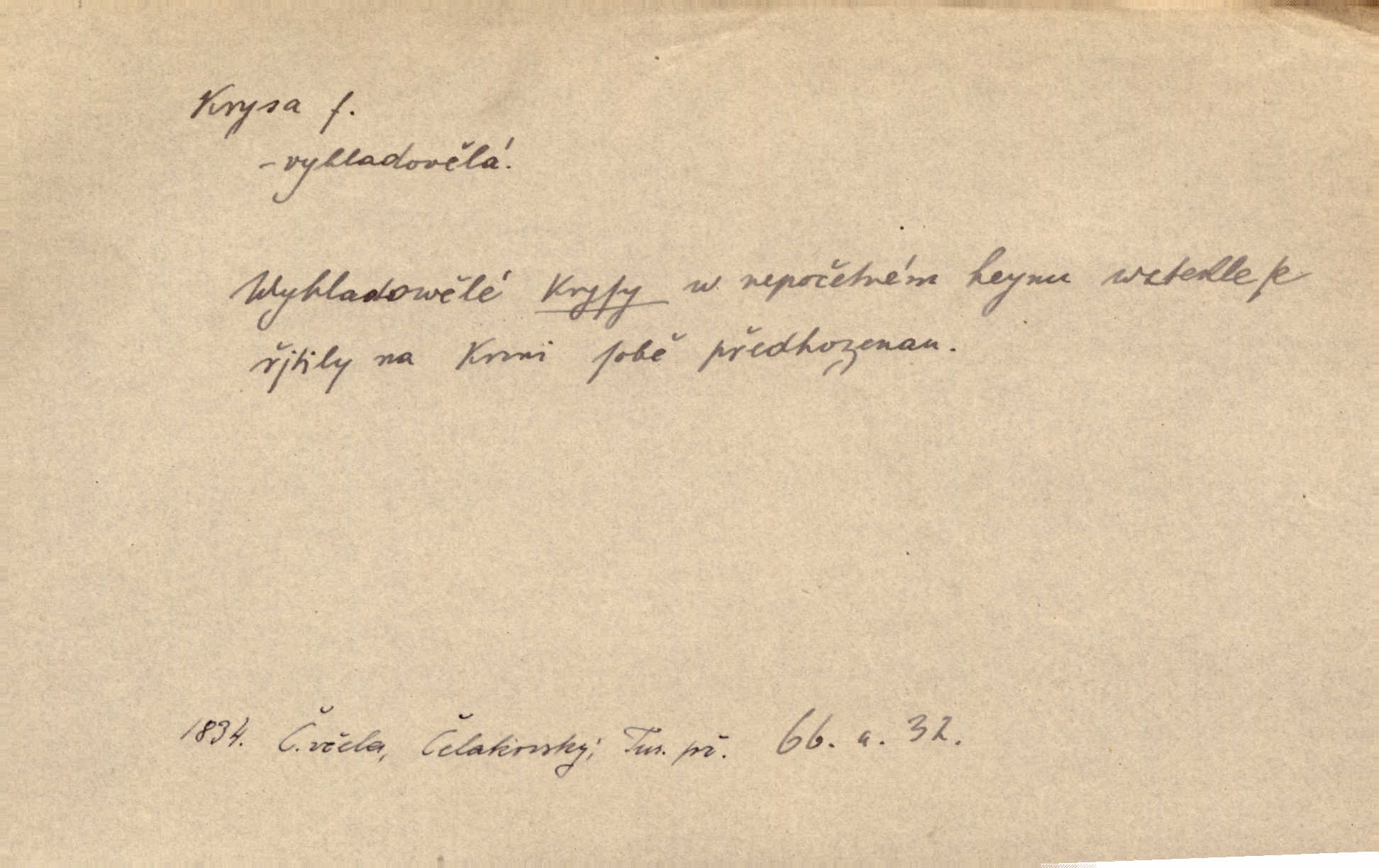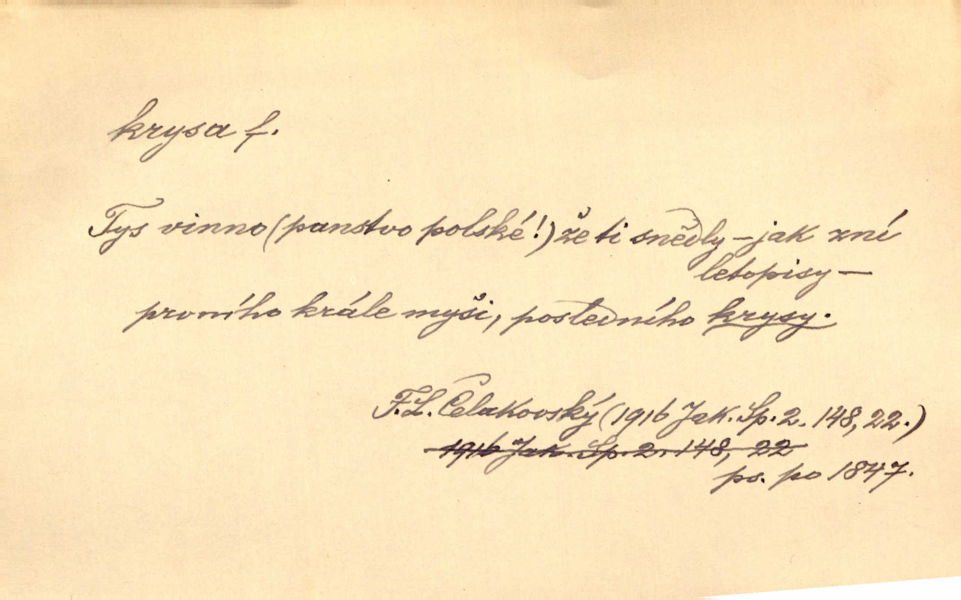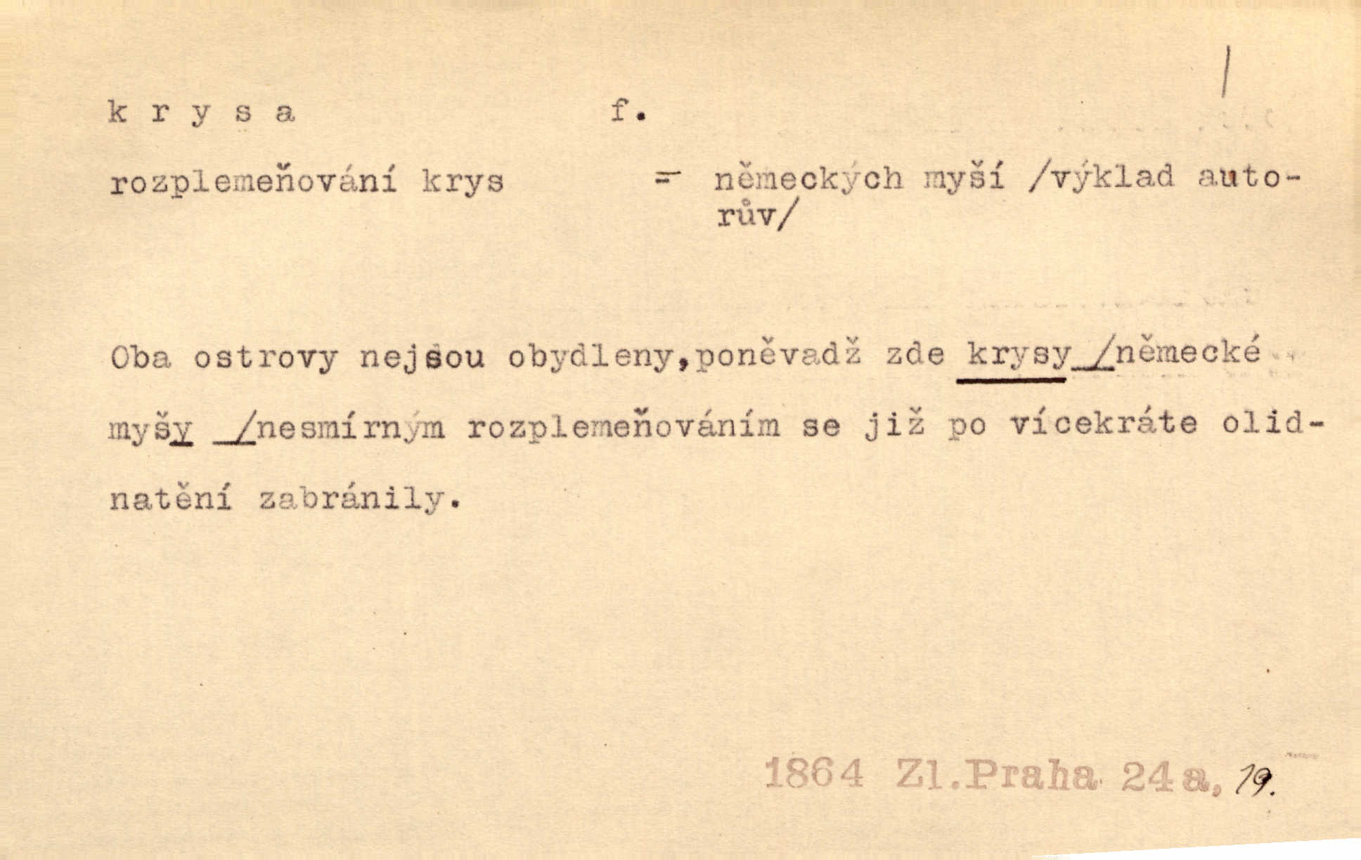 - krysa, -y f. veliká myš. Podél stěny kráčela klidně veliká krysa, snad královna zdejšího početného národa německých myší. Čap. Ch. „Snad že to bude vodní krysa“, pomyslíme si. Thom. Dal jste mu do kafe jed na krysy. K. Čap. Jako pronásledovaná krysa zmizela [Veruna] někde v bludišti chalup, dvorků a mezírek. Mrš. Zool. druh hlodavců z čeledi myší, Epimys norvegicus. Krysa pižmová Fiber zibethicus, ondatra. D Expr. o lidech připomínajících svými vlastnostmi nějak krysy. U [mořského] přístavu bylo pro suchozemské krysy, jakými jsme my, národ bez moře, ustavičně nač se dívati. Lang. Pracovali a přičiňovali jsme se [aspiranti]‚ strhujíce každý práce za deset starých, definitivních krys kancelářských. Šlej. Ta krysa [domácí pán] zakeťasovala byt za skladiště. Olb. Jeden člověk, který se schoval v pokoji, kde se porady konávaly, byl personálem pokládán za hotelovou krysu zloděje. Maj.