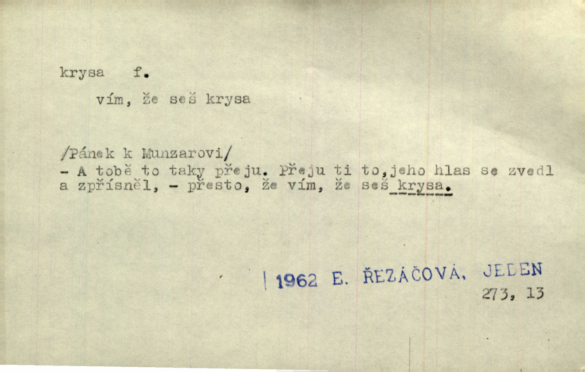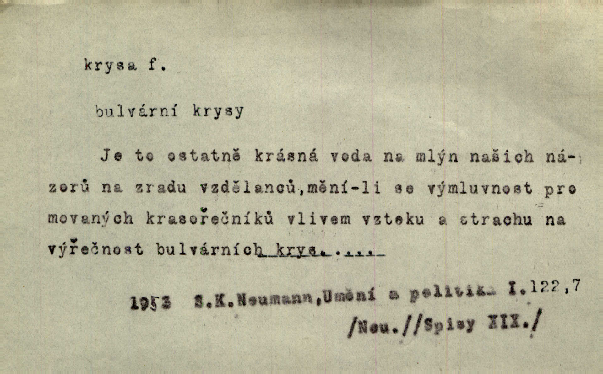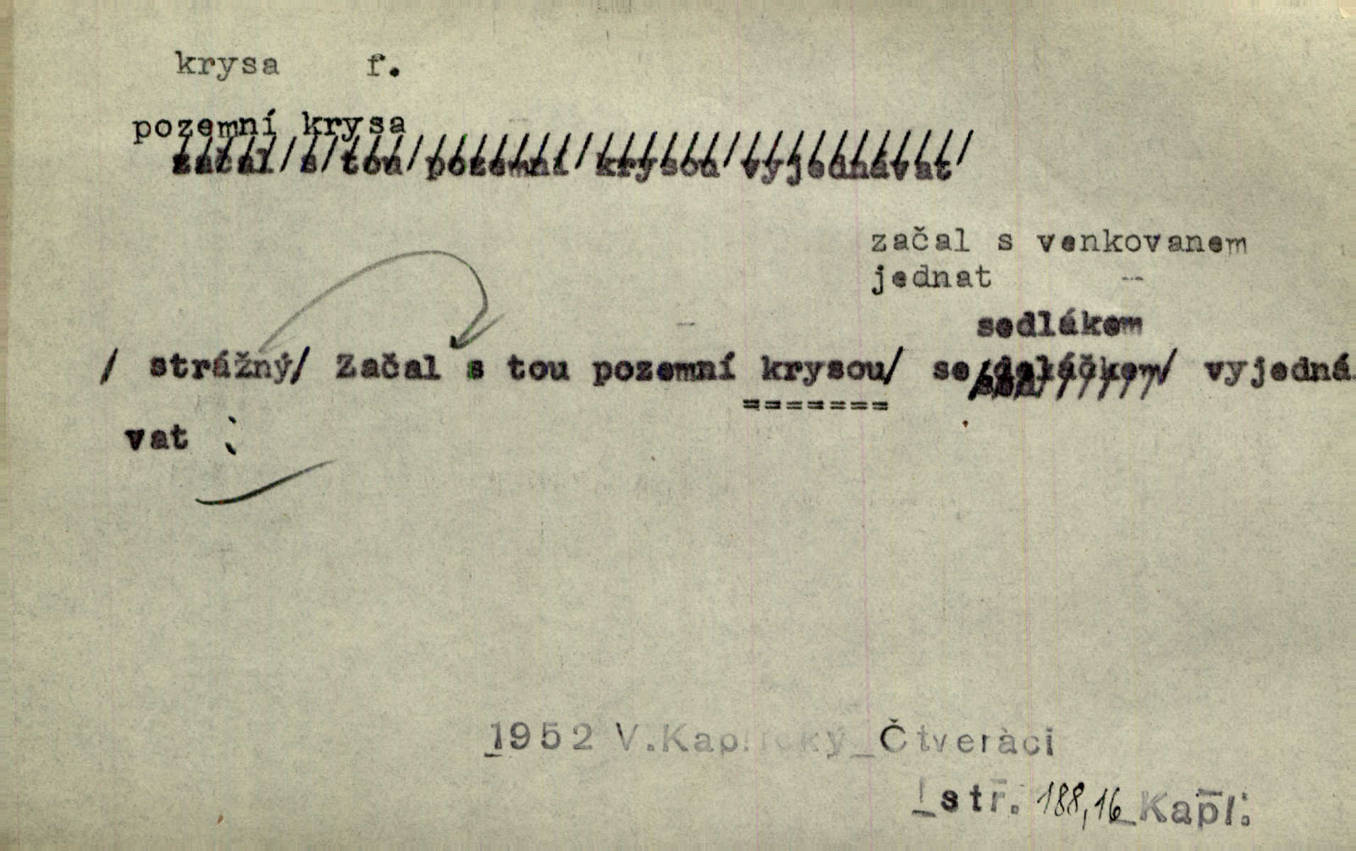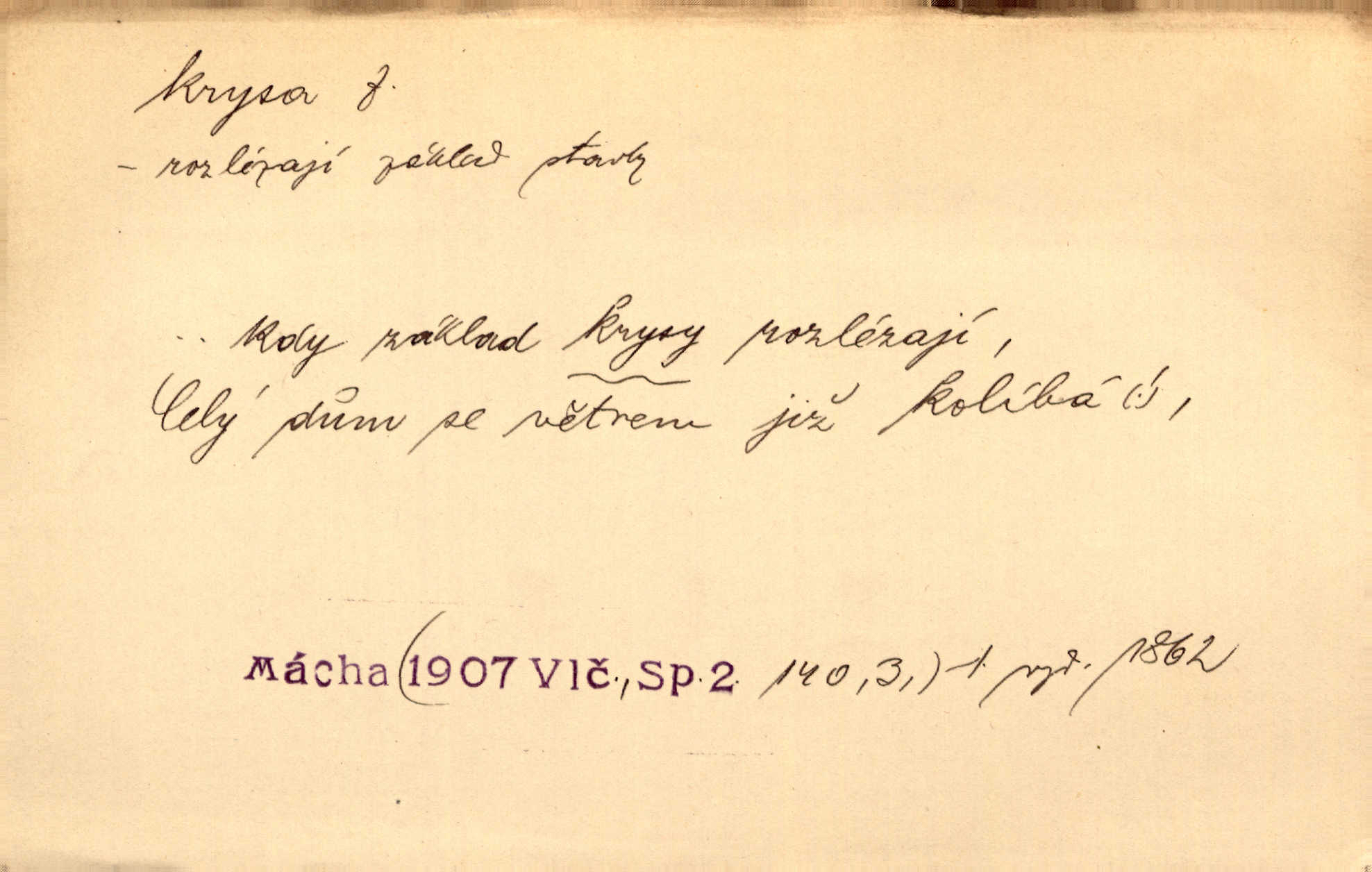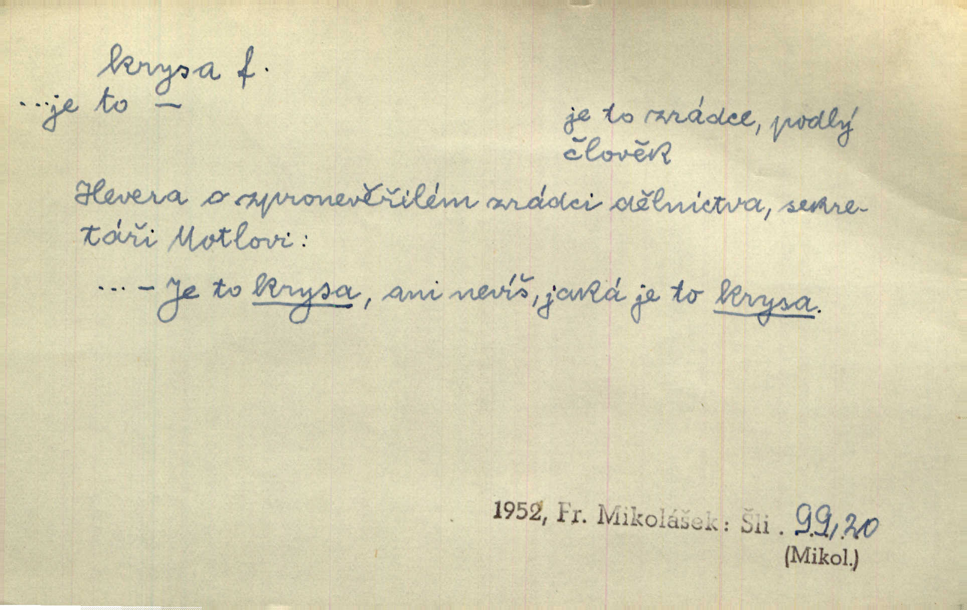 - krysa, -y f. veliká myš. Podél stěny kráčela klidně veliká krysa, snad královna zdejšího početného národa německých myší. Čap. Ch. „Snad že to bude vodní krysa“, pomyslíme si. Thom. Dal jste mu do kafe jed na krysy. K. Čap. Jako pronásledovaná krysa zmizela [Veruna] někde v bludišti chalup, dvorků a mezírek. Mrš. Zool. druh hlodavců z čeledi myší, Epimys norvegicus. Krysa pižmová Fiber zibethicus, ondatra. D Expr. o lidech připomínajících svými vlastnostmi nějak krysy. U [mořského] přístavu bylo pro suchozemské krysy, jakými jsme my, národ bez moře, ustavičně nač se dívati. Lang. Pracovali a přičiňovali jsme se [aspiranti]‚ strhujíce každý práce za deset starých, definitivních krys kancelářských. Šlej. Ta krysa [domácí pán] zakeťasovala byt za skladiště. Olb. Jeden člověk, který se schoval v pokoji, kde se porady konávaly, byl personálem pokládán za hotelovou krysu zloděje. Maj.
