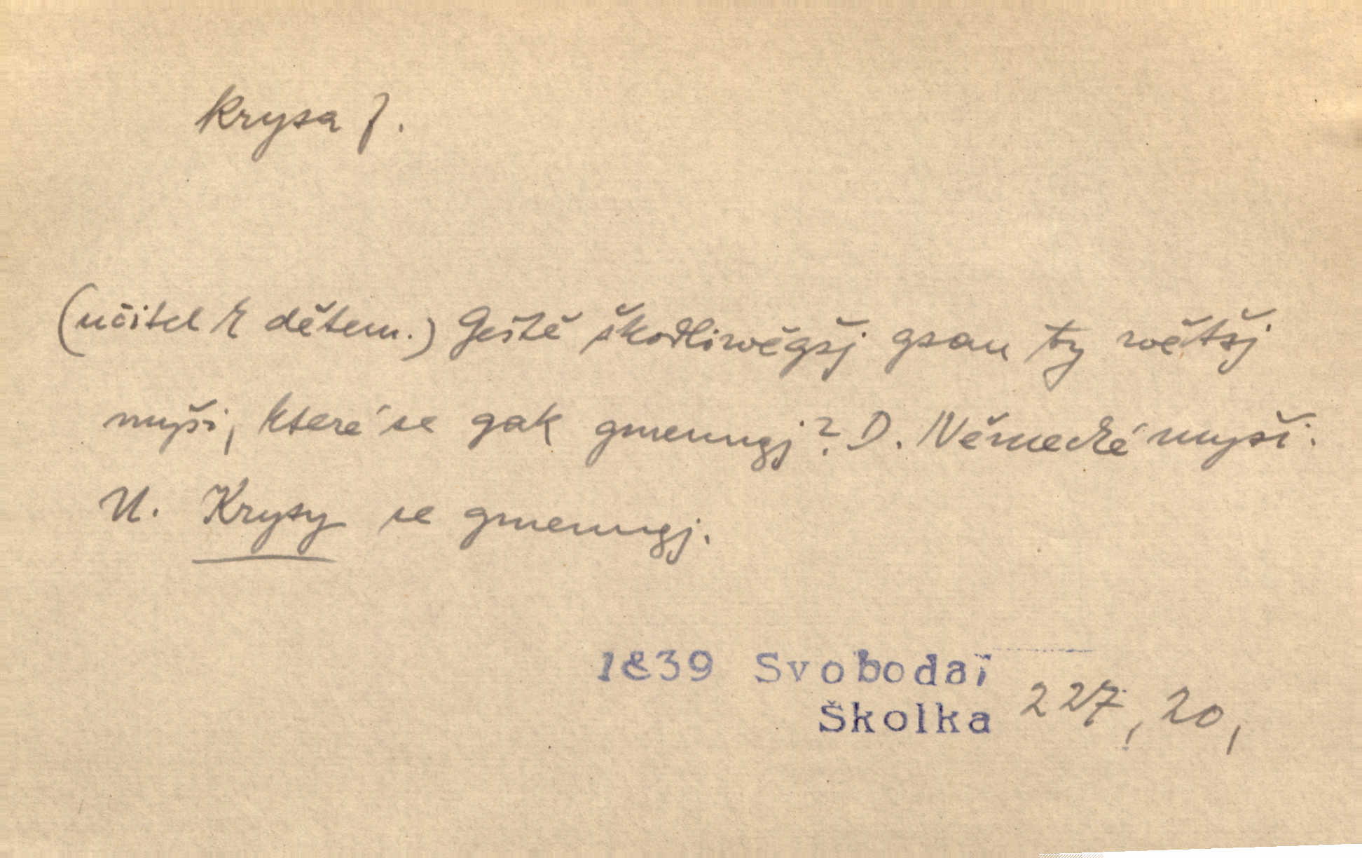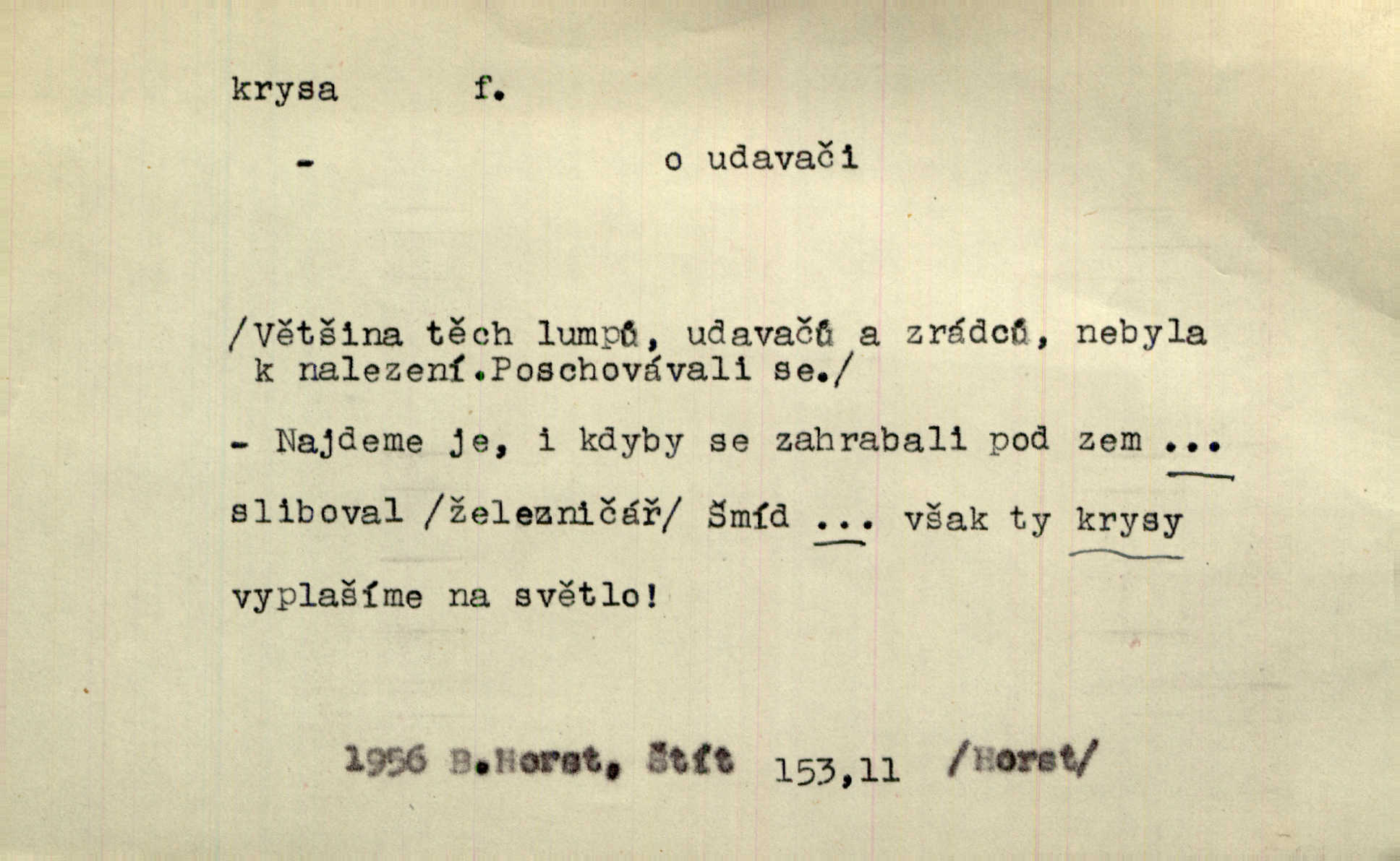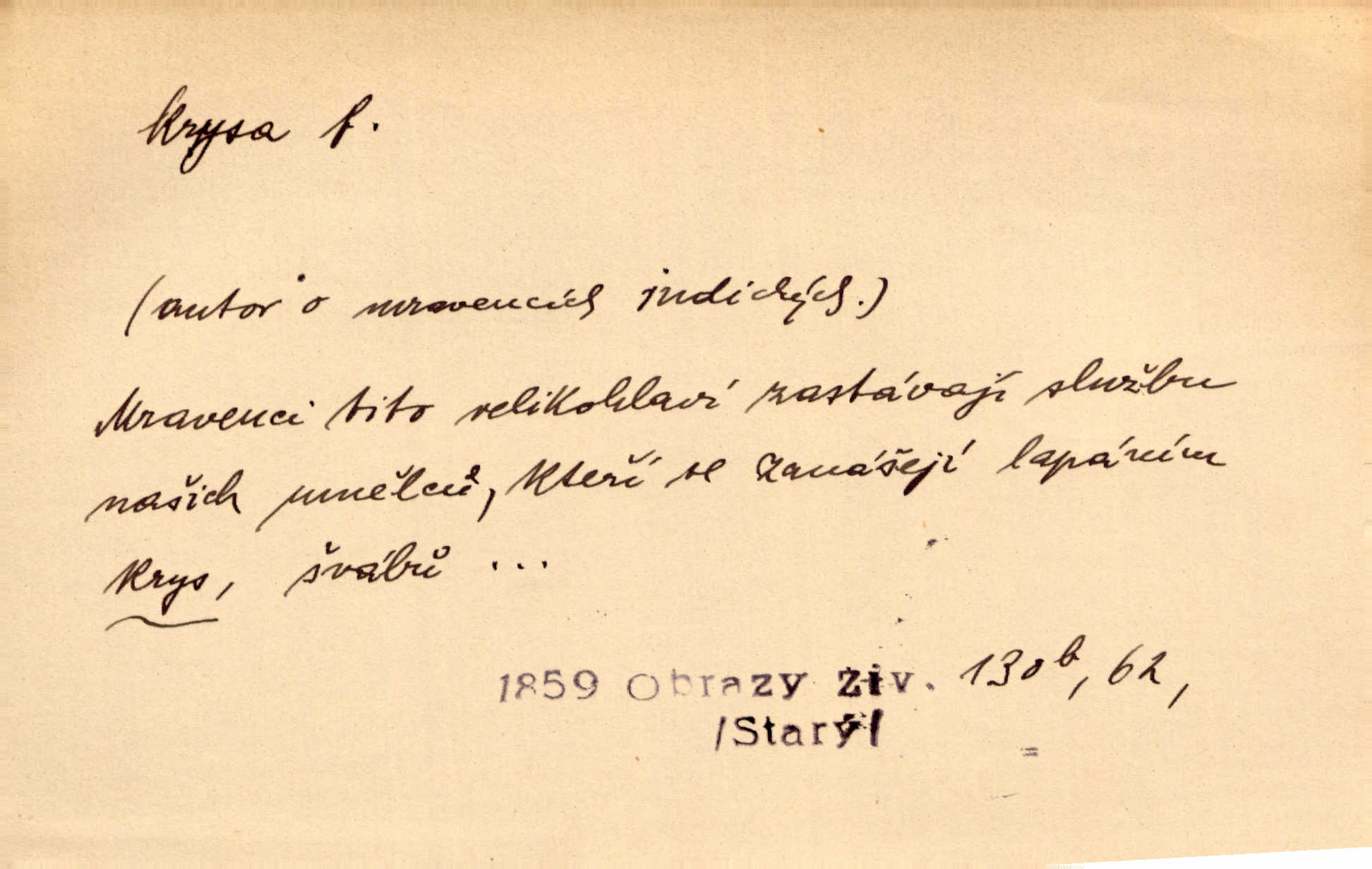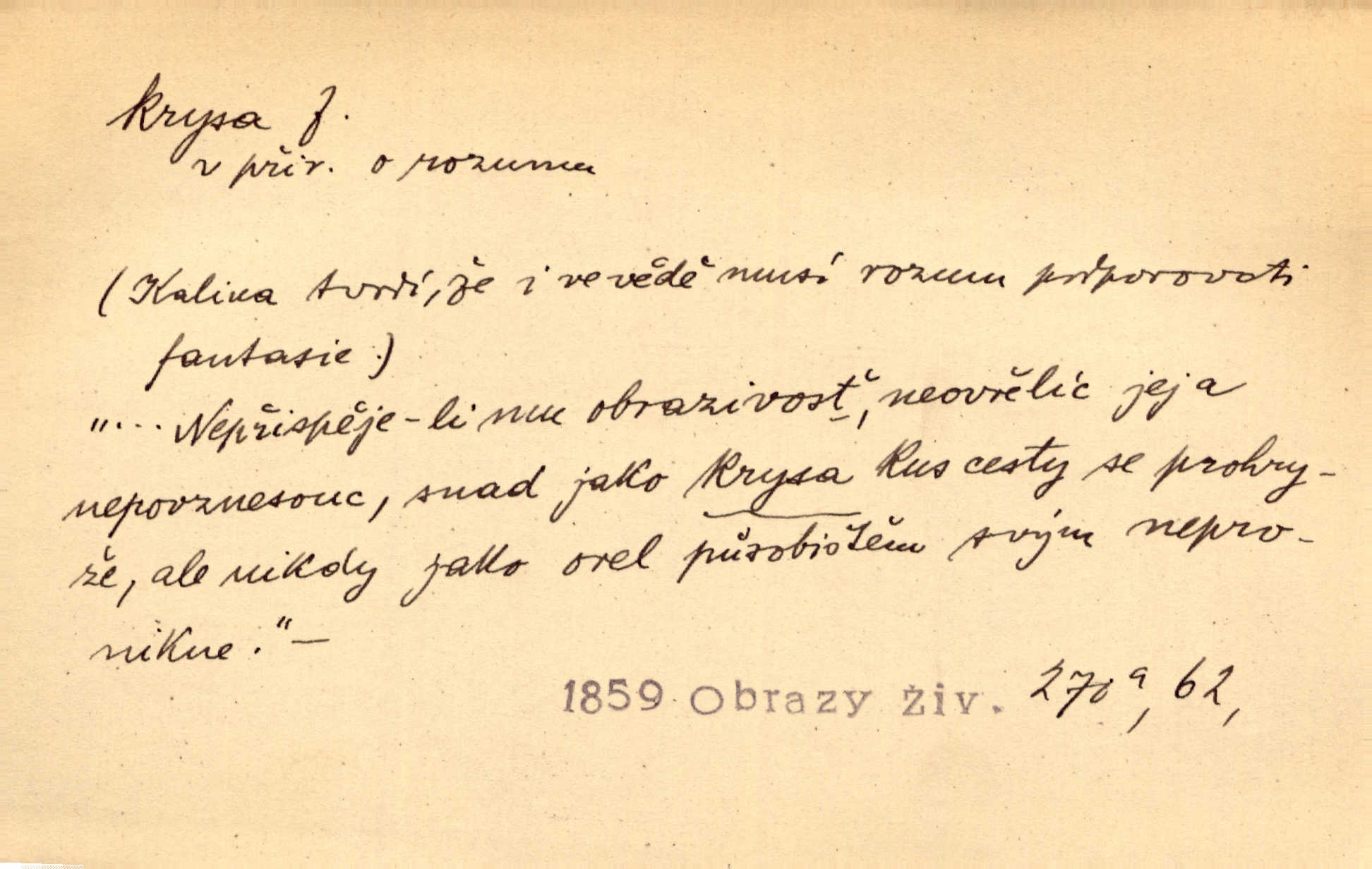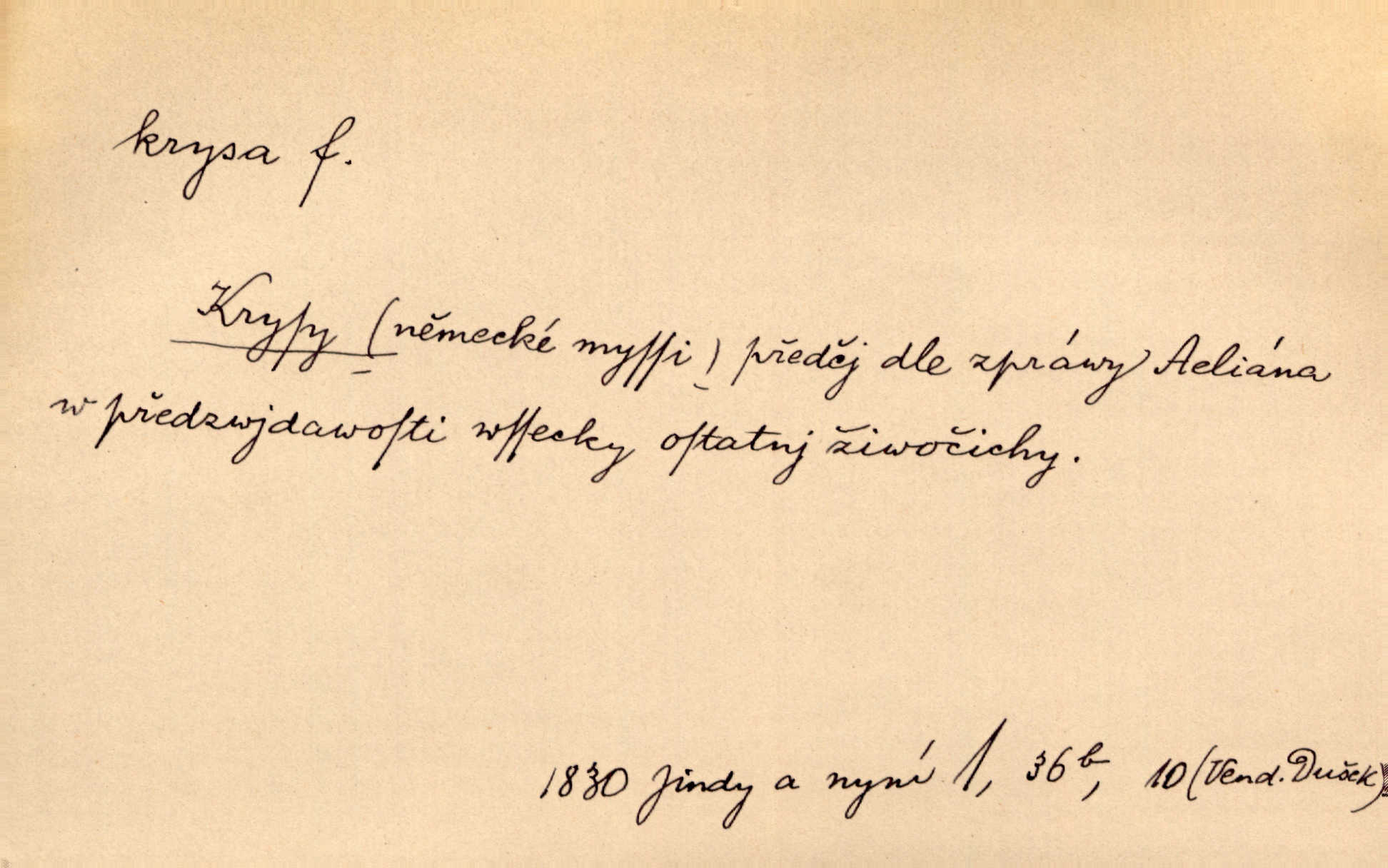 - krysa, -y f. veliká myš. Podél stěny kráčela klidně veliká krysa, snad královna zdejšího početného národa německých myší. Čap. Ch. „Snad že to bude vodní krysa“, pomyslíme si. Thom. Dal jste mu do kafe jed na krysy. K. Čap. Jako pronásledovaná krysa zmizela [Veruna] někde v bludišti chalup, dvorků a mezírek. Mrš. Zool. druh hlodavců z čeledi myší, Epimys norvegicus. Krysa pižmová Fiber zibethicus, ondatra. D Expr. o lidech připomínajících svými vlastnostmi nějak krysy. U [mořského] přístavu bylo pro suchozemské krysy, jakými jsme my, národ bez moře, ustavičně nač se dívati. Lang. Pracovali a přičiňovali jsme se [aspiranti]‚ strhujíce každý práce za deset starých, definitivních krys kancelářských. Šlej. Ta krysa [domácí pán] zakeťasovala byt za skladiště. Olb. Jeden člověk, který se schoval v pokoji, kde se porady konávaly, byl personálem pokládán za hotelovou krysu zloděje. Maj.