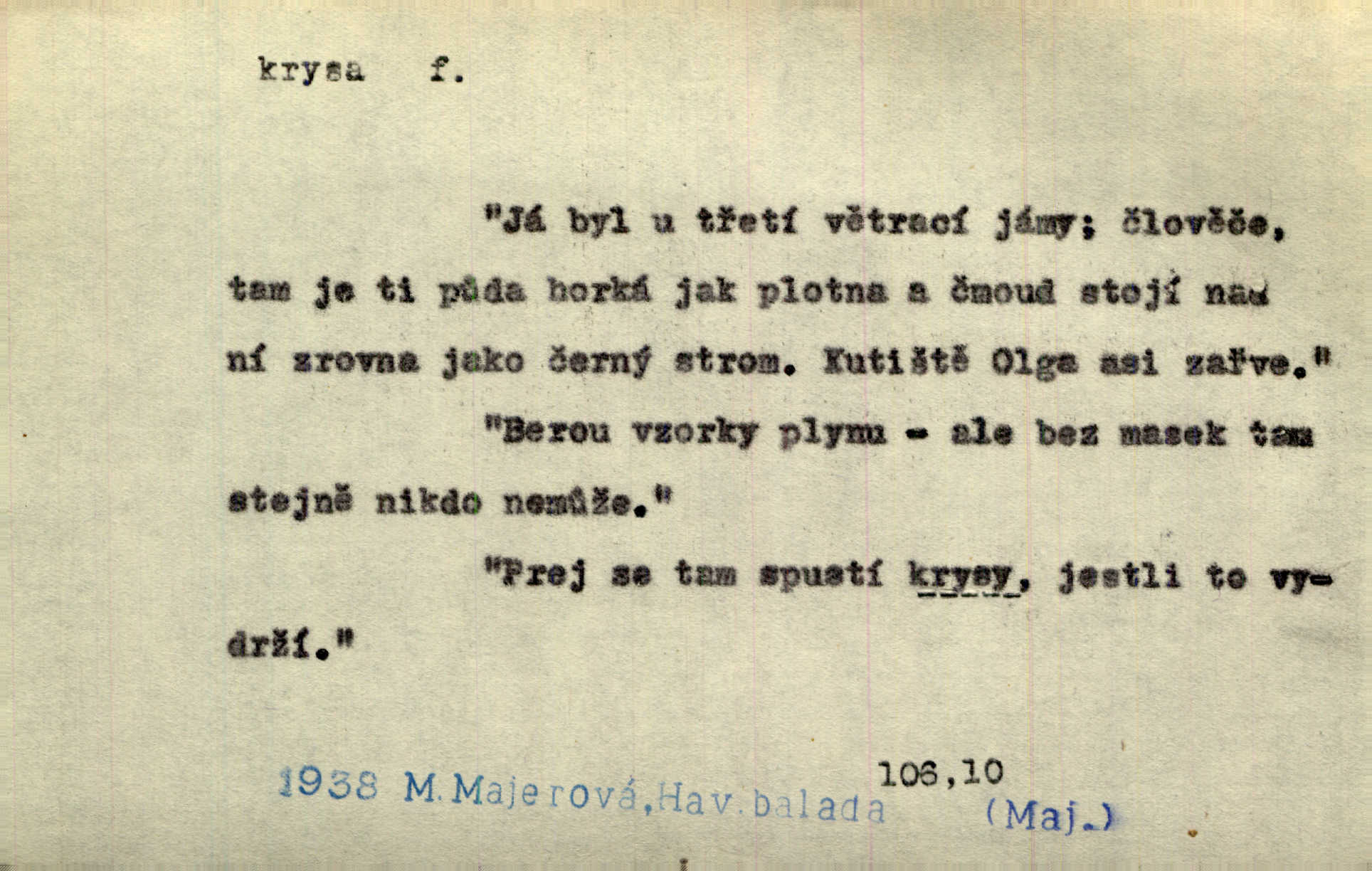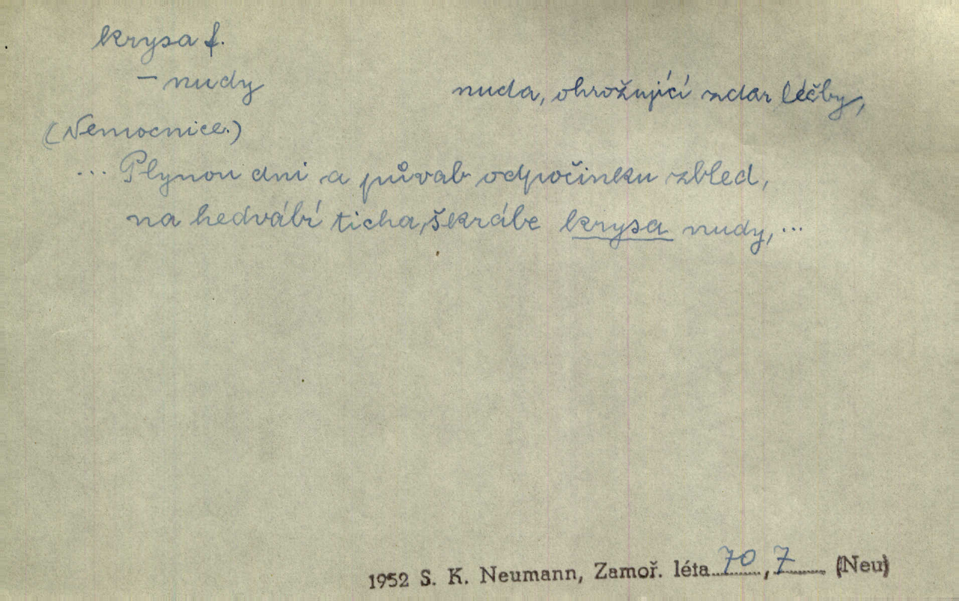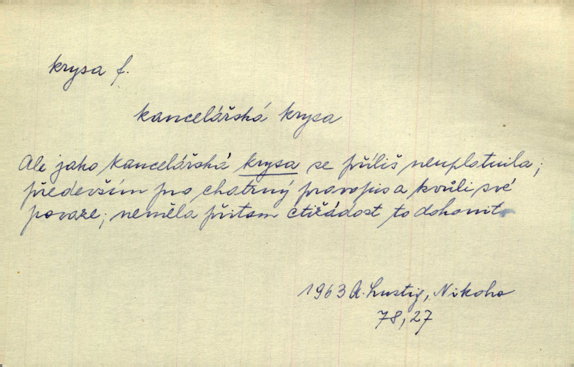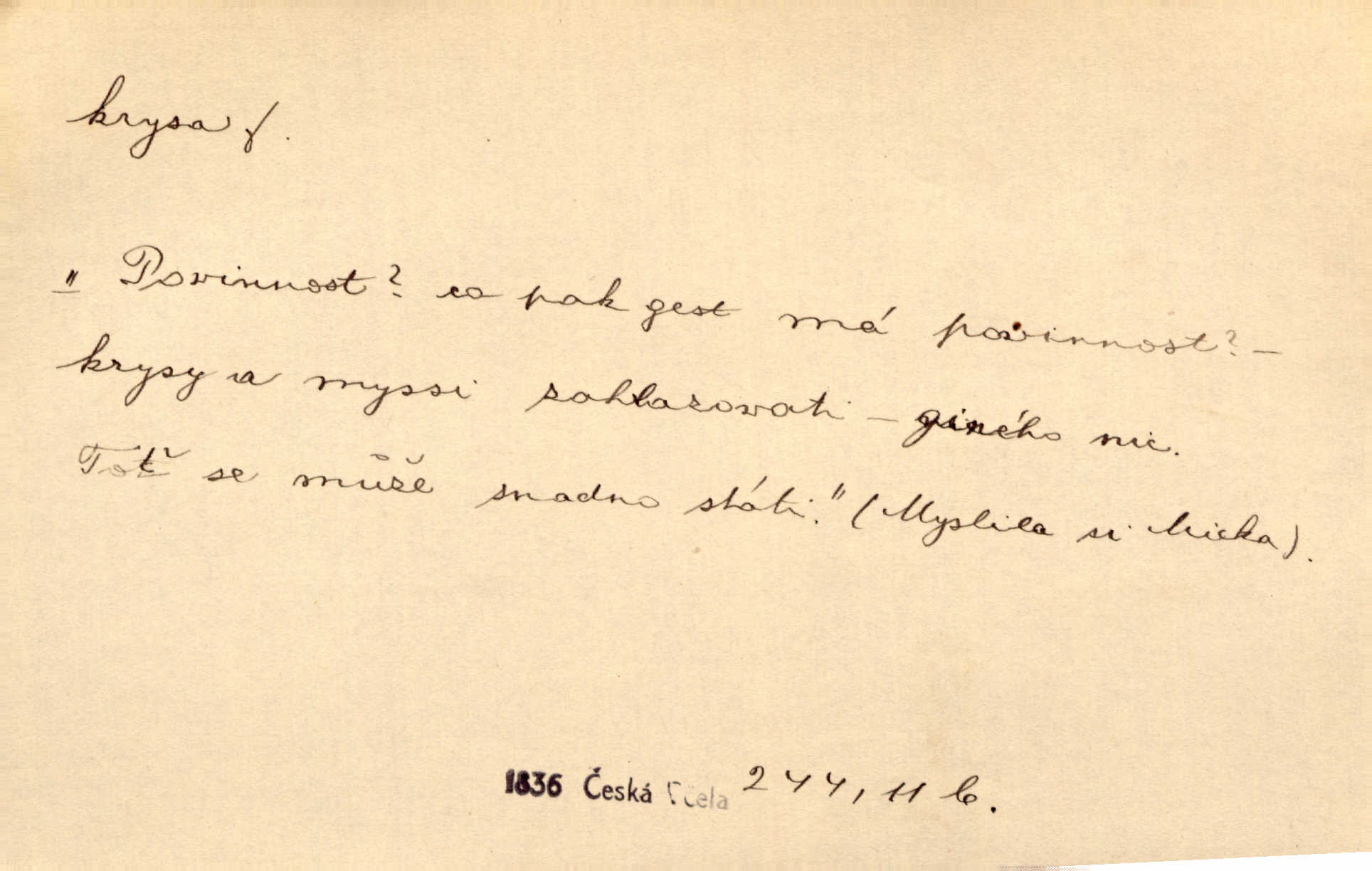 - krysa, -y f. veliká myš. Podél stěny kráčela klidně veliká krysa, snad královna zdejšího početného národa německých myší. Čap. Ch. „Snad že to bude vodní krysa“, pomyslíme si. Thom. Dal jste mu do kafe jed na krysy. K. Čap. Jako pronásledovaná krysa zmizela [Veruna] někde v bludišti chalup, dvorků a mezírek. Mrš. Zool. druh hlodavců z čeledi myší, Epimys norvegicus. Krysa pižmová Fiber zibethicus, ondatra. D Expr. o lidech připomínajících svými vlastnostmi nějak krysy. U [mořského] přístavu bylo pro suchozemské krysy, jakými jsme my, národ bez moře, ustavičně nač se dívati. Lang. Pracovali a přičiňovali jsme se [aspiranti]‚ strhujíce každý práce za deset starých, definitivních krys kancelářských. Šlej. Ta krysa [domácí pán] zakeťasovala byt za skladiště. Olb. Jeden člověk, který se schoval v pokoji, kde se porady konávaly, byl personálem pokládán za hotelovou krysu zloděje. Maj.