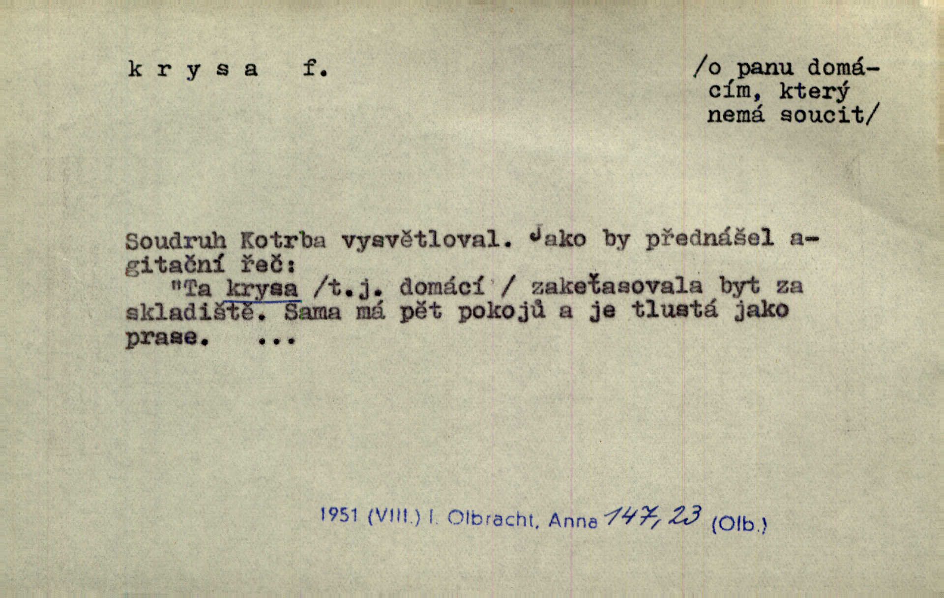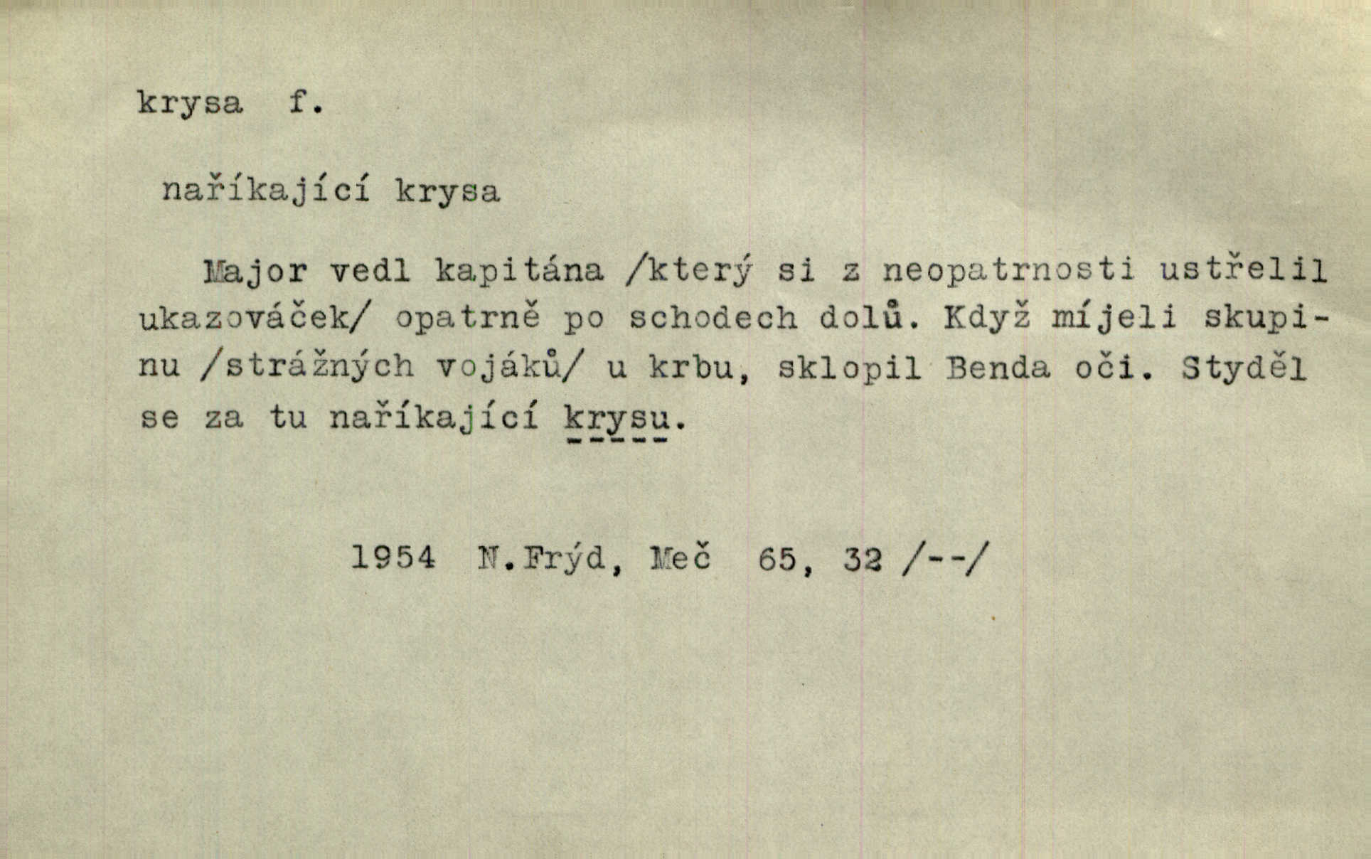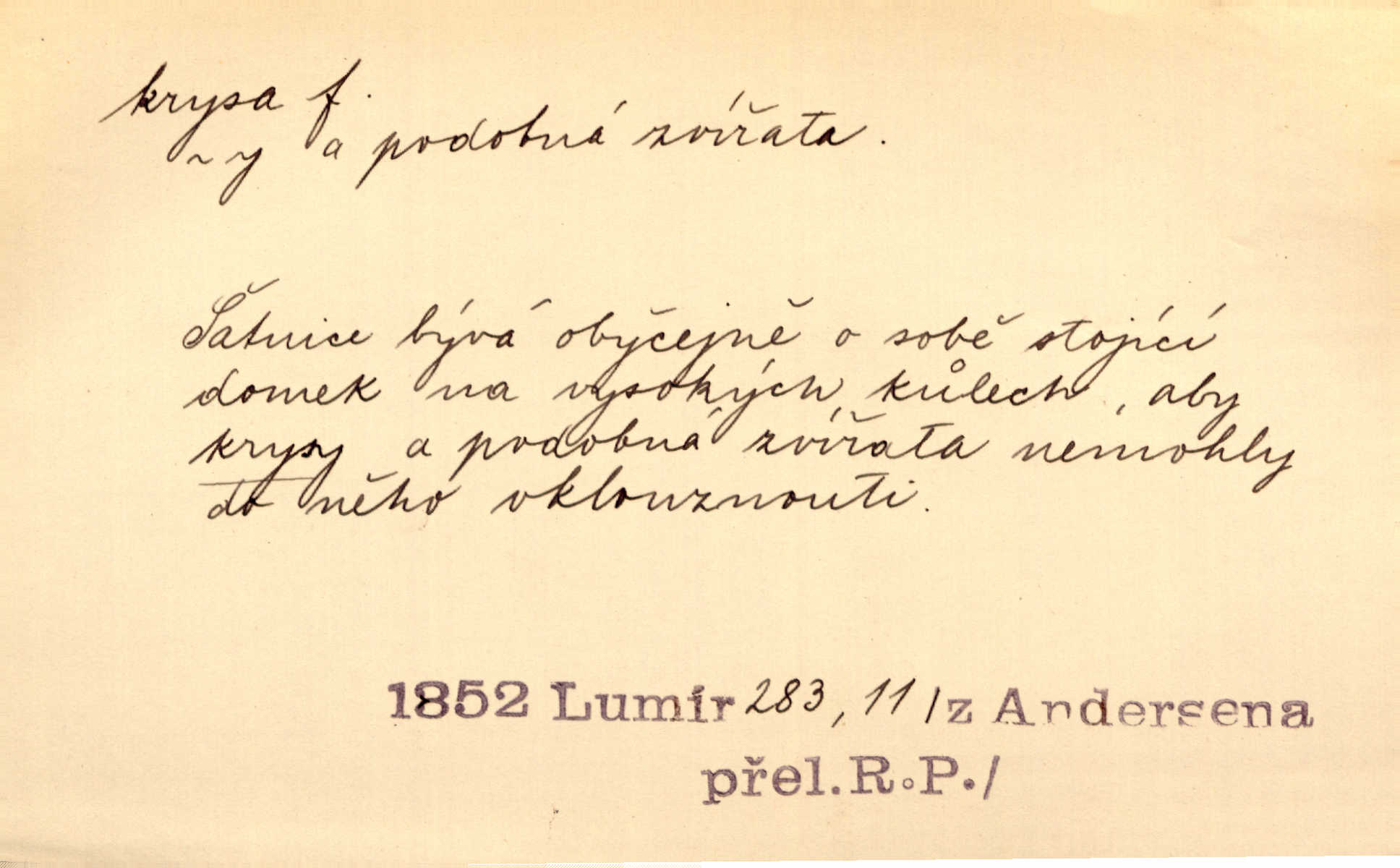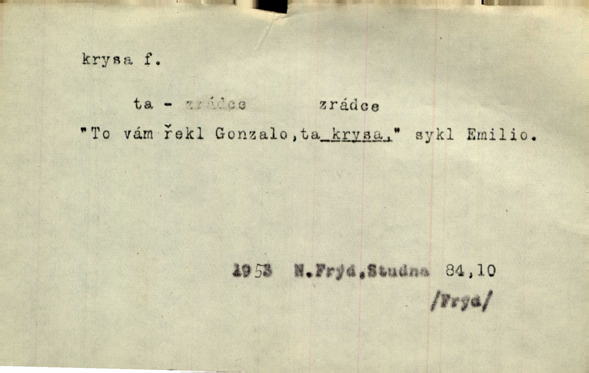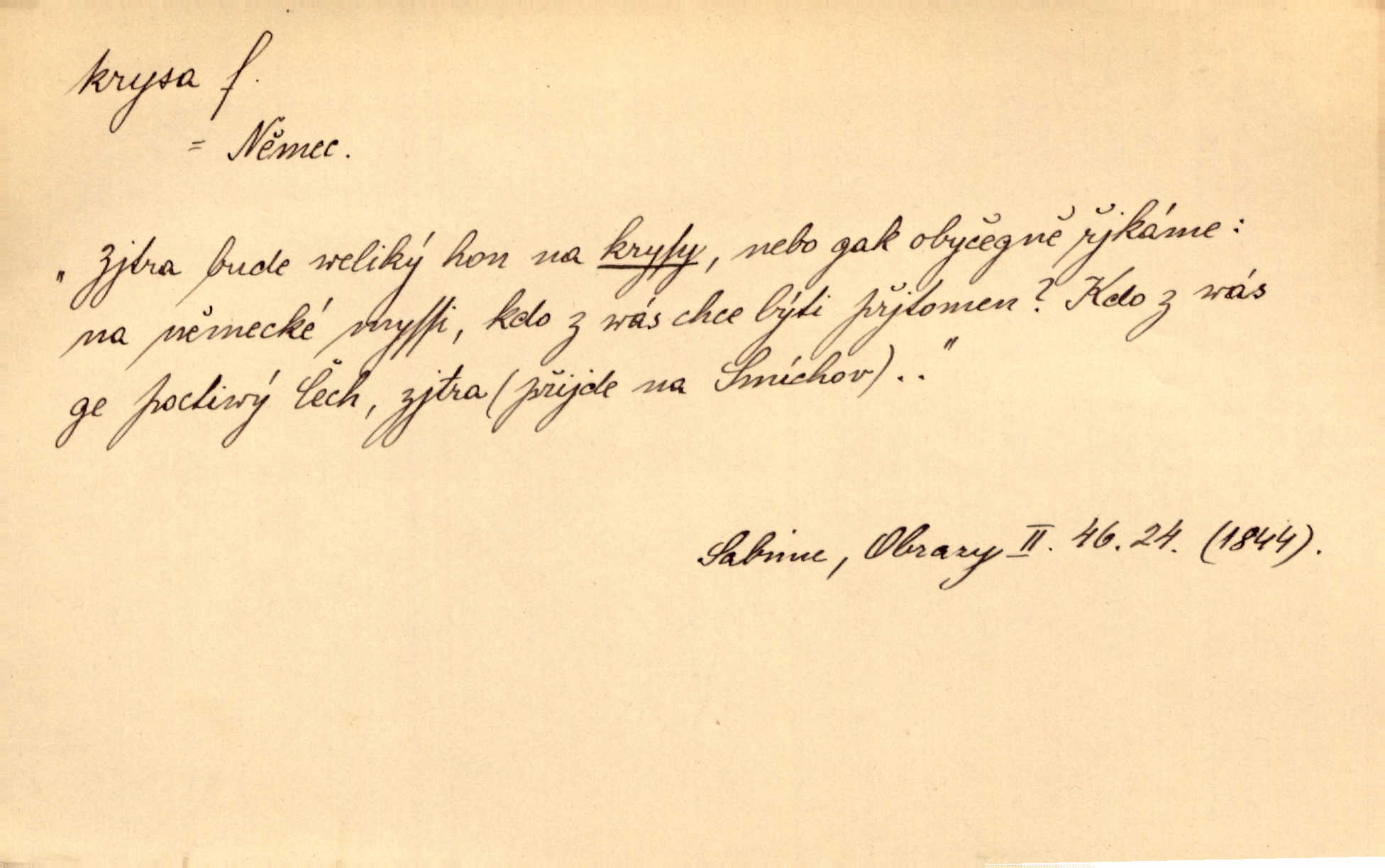 - krysa, -y f. veliká myš. Podél stěny kráčela klidně veliká krysa, snad královna zdejšího početného národa německých myší. Čap. Ch. „Snad že to bude vodní krysa“, pomyslíme si. Thom. Dal jste mu do kafe jed na krysy. K. Čap. Jako pronásledovaná krysa zmizela [Veruna] někde v bludišti chalup, dvorků a mezírek. Mrš. Zool. druh hlodavců z čeledi myší, Epimys norvegicus. Krysa pižmová Fiber zibethicus, ondatra. D Expr. o lidech připomínajících svými vlastnostmi nějak krysy. U [mořského] přístavu bylo pro suchozemské krysy, jakými jsme my, národ bez moře, ustavičně nač se dívati. Lang. Pracovali a přičiňovali jsme se [aspiranti]‚ strhujíce každý práce za deset starých, definitivních krys kancelářských. Šlej. Ta krysa [domácí pán] zakeťasovala byt za skladiště. Olb. Jeden člověk, který se schoval v pokoji, kde se porady konávaly, byl personálem pokládán za hotelovou krysu zloděje. Maj.