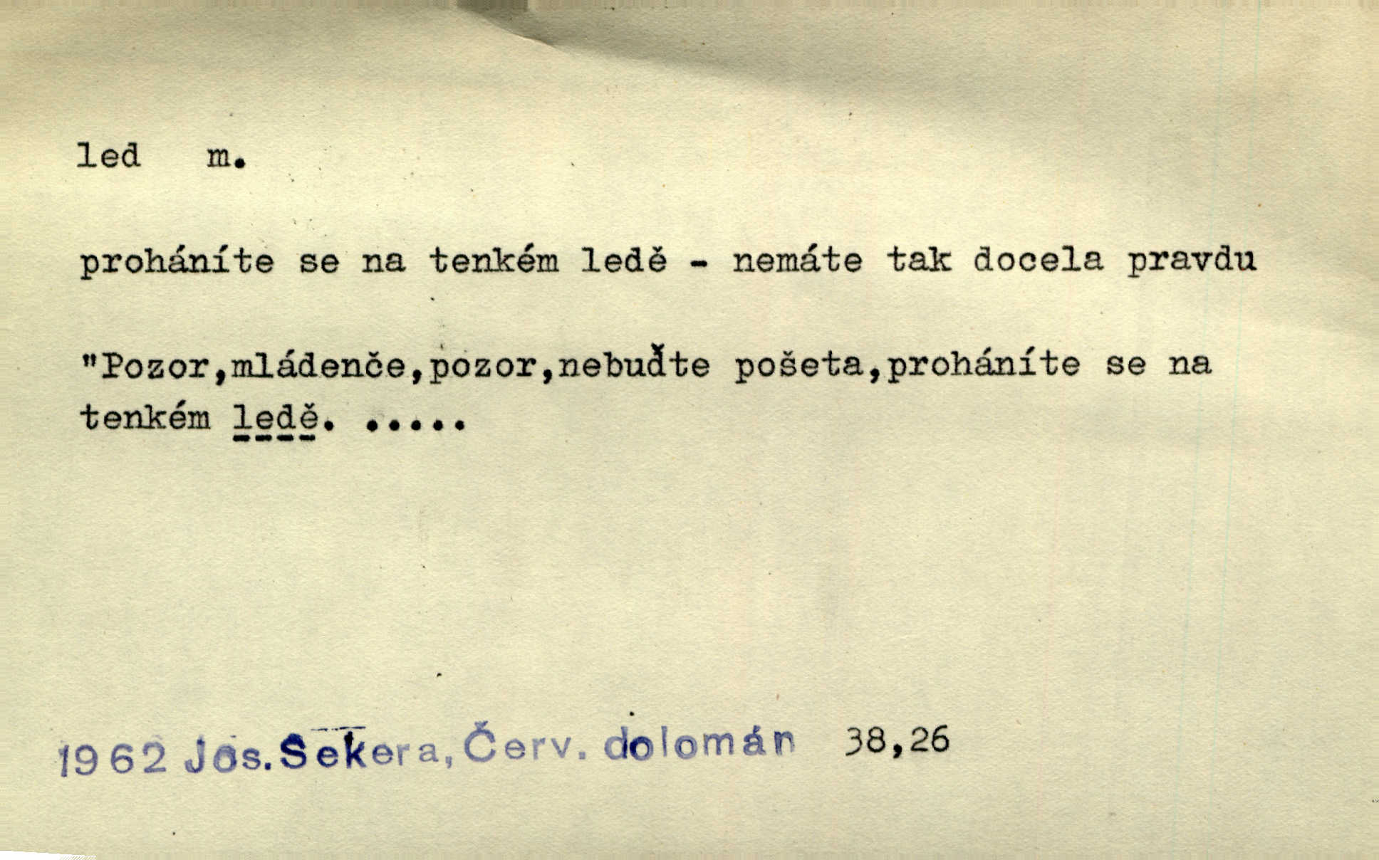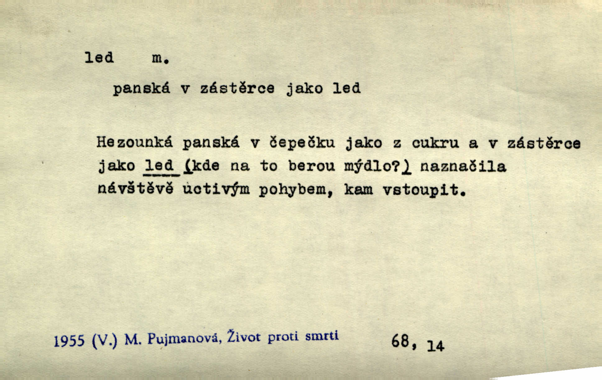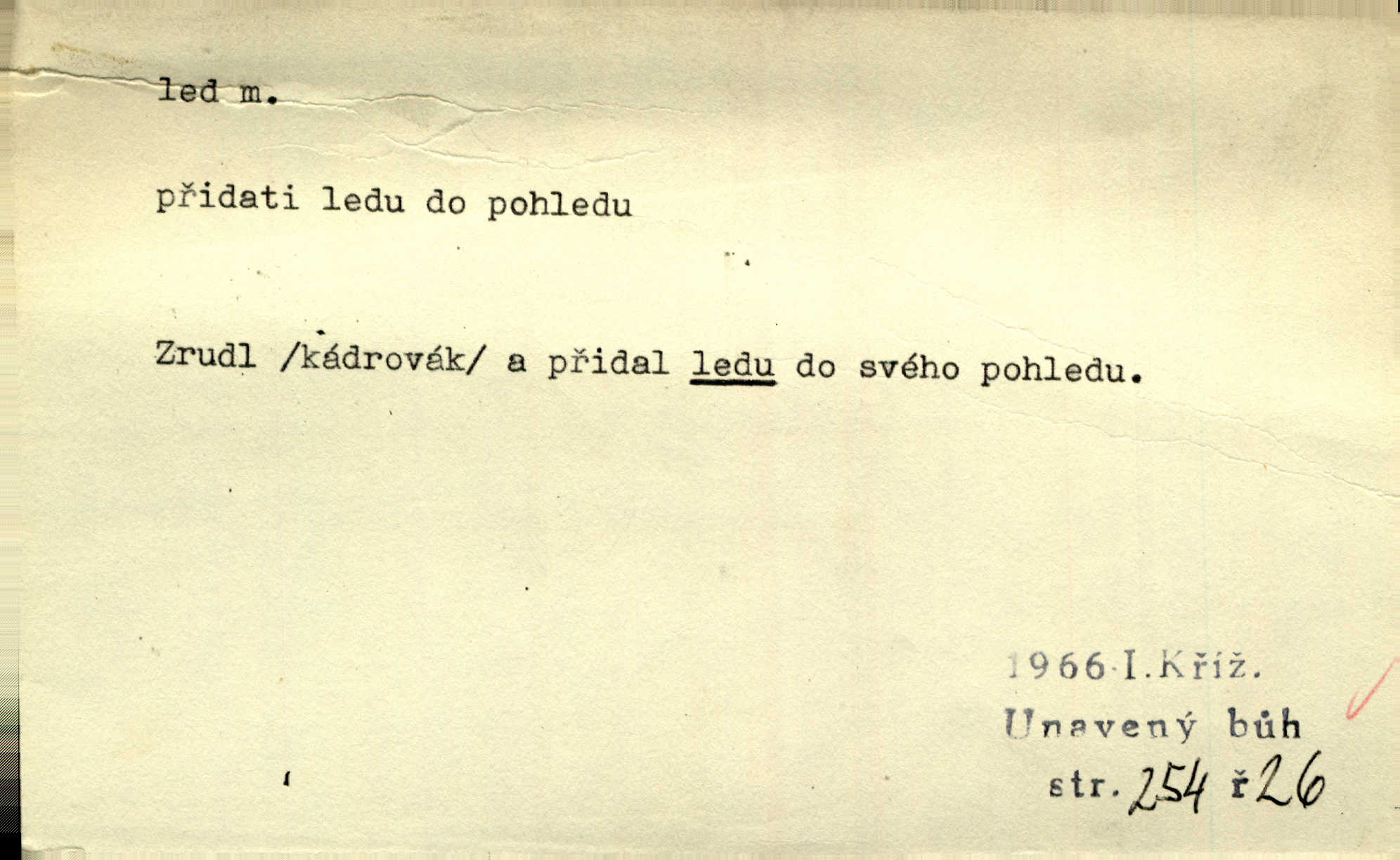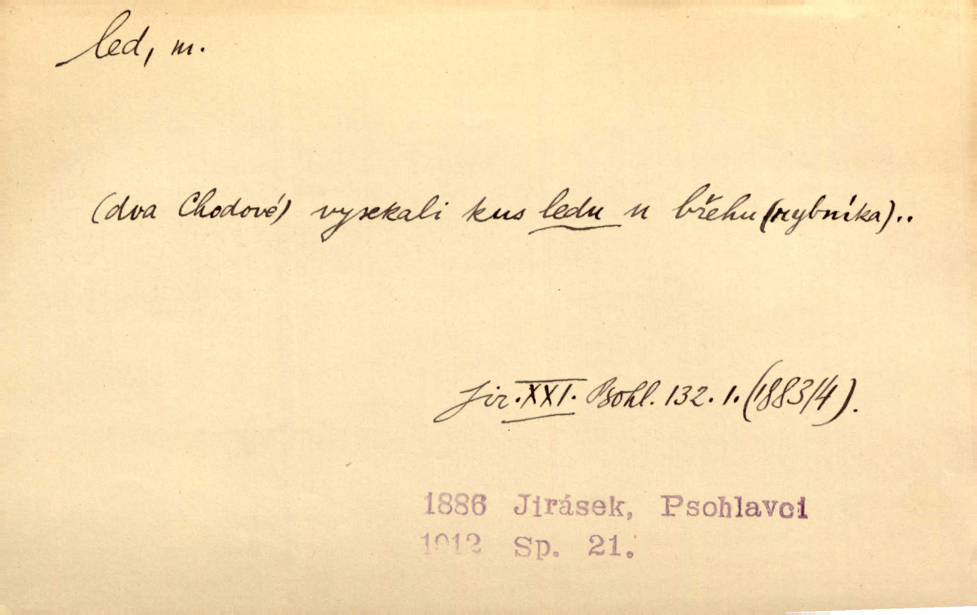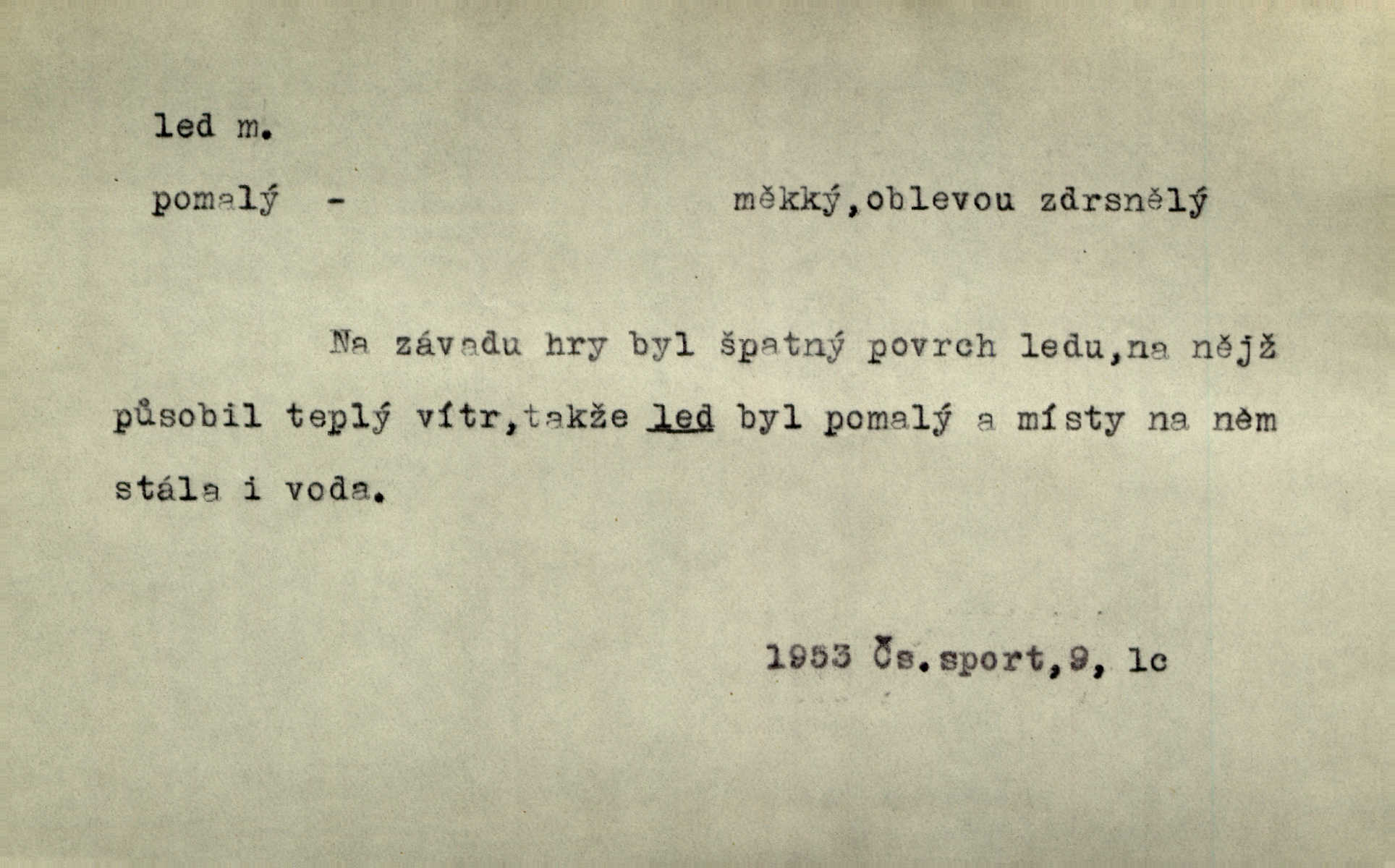 - led, -u m. voda v stavu tuhém, zmrzlá. Potok [byl] zamrzlý čistým, pouze při březích zachumeleným ledem. Rais. Vysekali kus ledu u břehu. Jir. „Hajdy pro brusle a doprovodíte mne na led!“ (na kluziště). Čap. Ch. [Z jara na řece u mlýna s mostem] ledy jdou, o kozy se tříští, řečiště ucpou ledové kry. Baar. Na sklenici piva od ledu zastavil se pan rechtor. A. Mrš. K ledu se uložilo historické právo zrovna tak jako přirozené přestalo jednání o něm. Dyk. [Tvář nebožtíkova] byla zsinalá a studená jako led. Něm. Svědomí měl jak ten led; studené, tvrdé. Šmil. Nožky se jim [dětem] zklouzaly po podlaze [v saloně] hladké co led. Něm. Řeč mi jela jako po ledě. Šmil. přízeň panská chodí po ledě je nestálá, vrtkavá. Šmil. To rozehřívá [koňak]‚ trhá ledy a připravuje žaloudeček na dobré sousto vzbuzuje dobrou náladu. Herrm. Větrovec mluvil hlasem, z něhož čišel přímo led bezcitnost, nepřízeň. Třeb. Tech. suchý led pevný kysličník uhličitý.