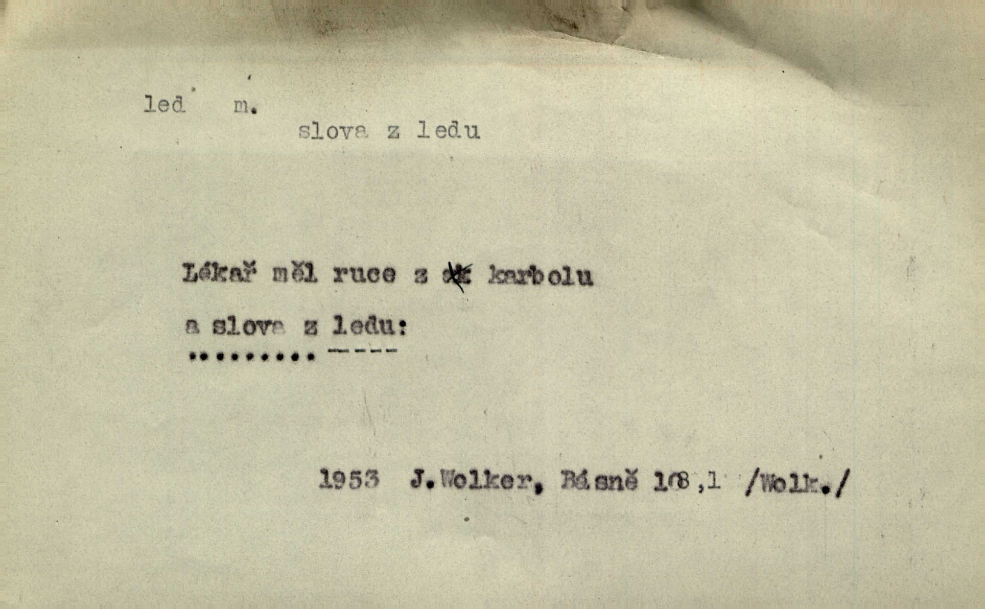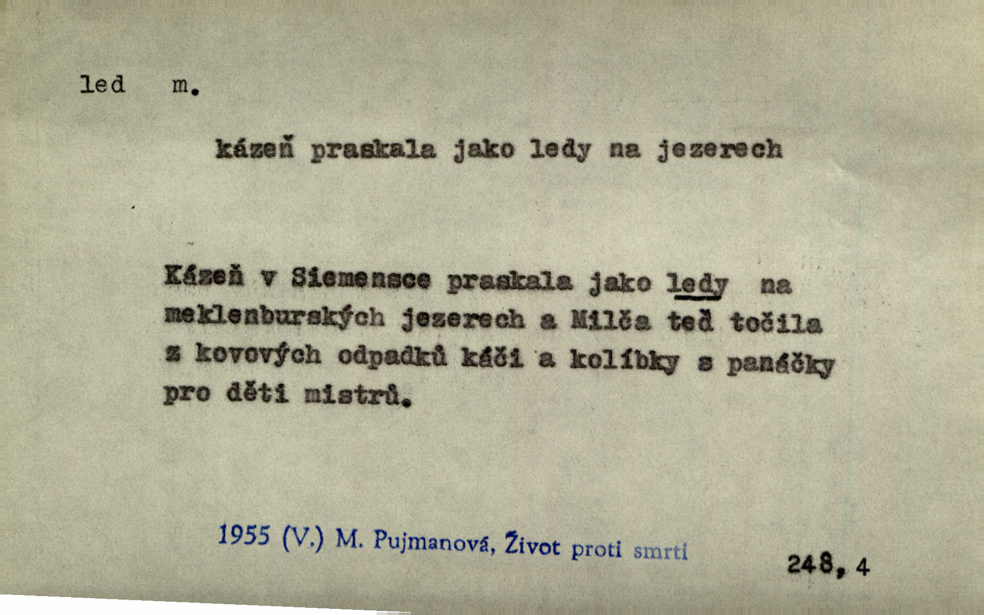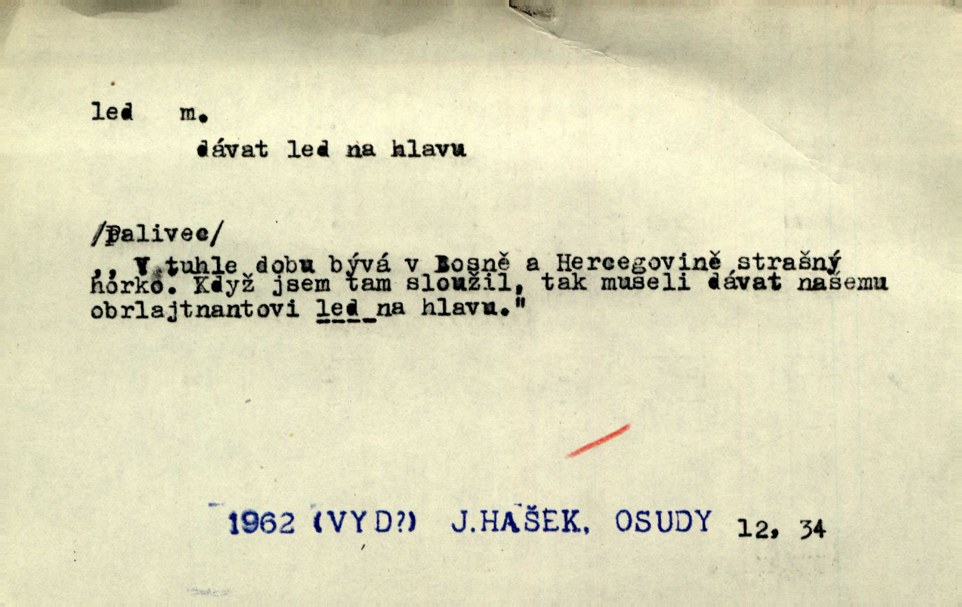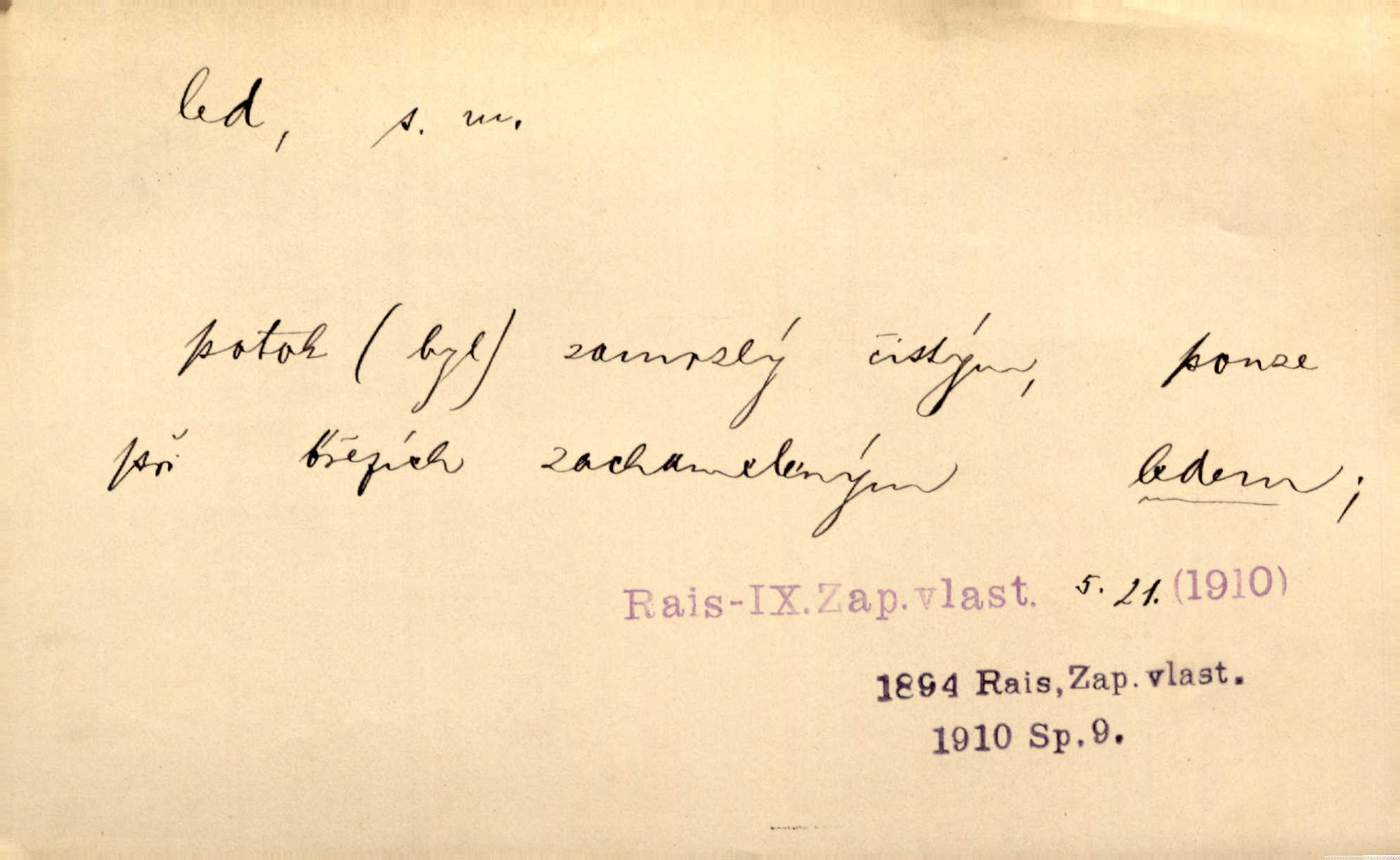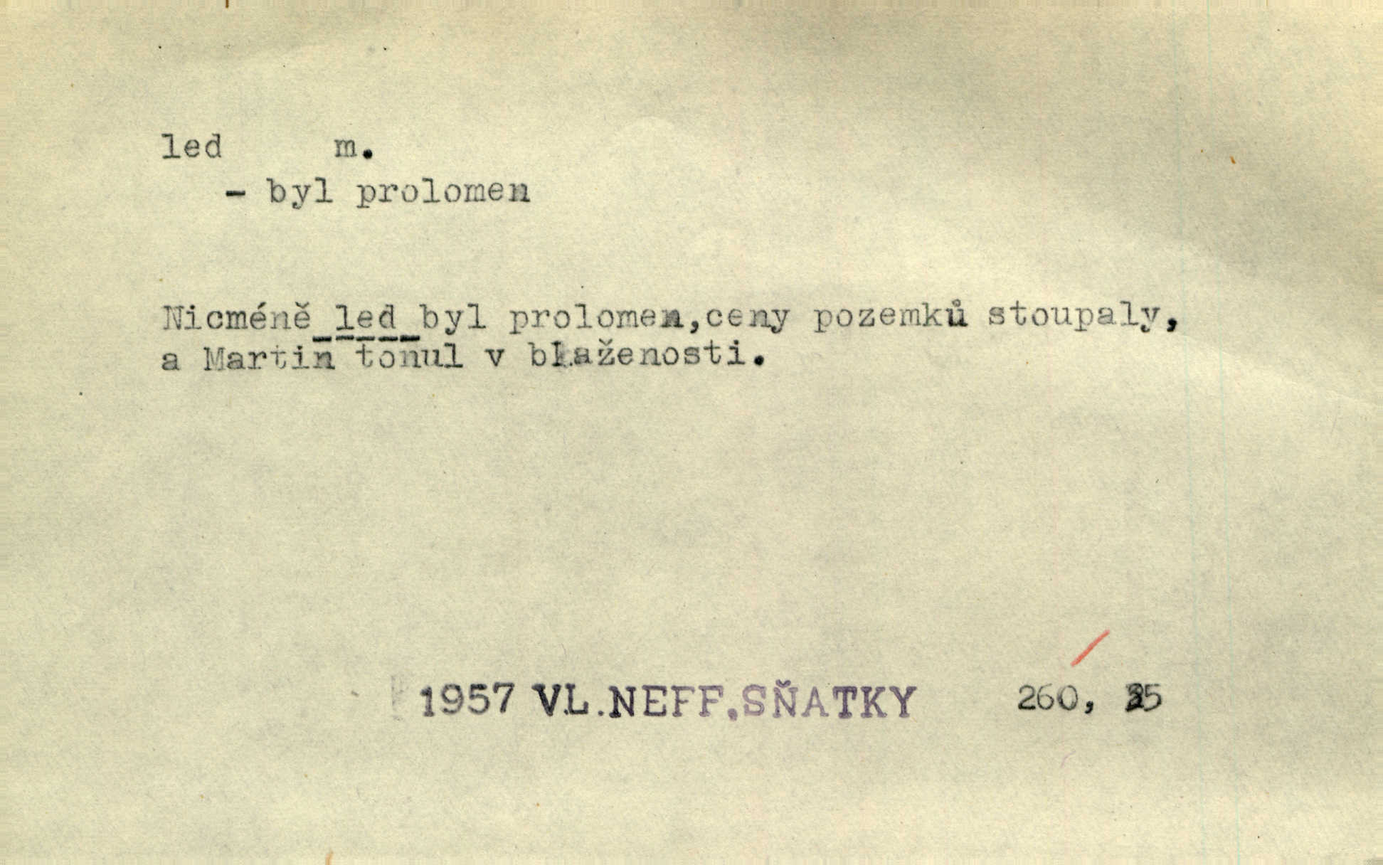 - led, -u m. voda v stavu tuhém, zmrzlá. Potok [byl] zamrzlý čistým, pouze při březích zachumeleným ledem. Rais. Vysekali kus ledu u břehu. Jir. „Hajdy pro brusle a doprovodíte mne na led!“ (na kluziště). Čap. Ch. [Z jara na řece u mlýna s mostem] ledy jdou, o kozy se tříští, řečiště ucpou ledové kry. Baar. Na sklenici piva od ledu zastavil se pan rechtor. A. Mrš. K ledu se uložilo historické právo zrovna tak jako přirozené přestalo jednání o něm. Dyk. [Tvář nebožtíkova] byla zsinalá a studená jako led. Něm. Svědomí měl jak ten led; studené, tvrdé. Šmil. Nožky se jim [dětem] zklouzaly po podlaze [v saloně] hladké co led. Něm. Řeč mi jela jako po ledě. Šmil. přízeň panská chodí po ledě je nestálá, vrtkavá. Šmil. To rozehřívá [koňak]‚ trhá ledy a připravuje žaloudeček na dobré sousto vzbuzuje dobrou náladu. Herrm. Větrovec mluvil hlasem, z něhož čišel přímo led bezcitnost, nepřízeň. Třeb. Tech. suchý led pevný kysličník uhličitý.
