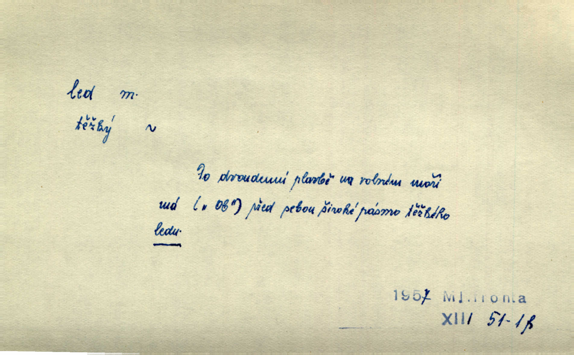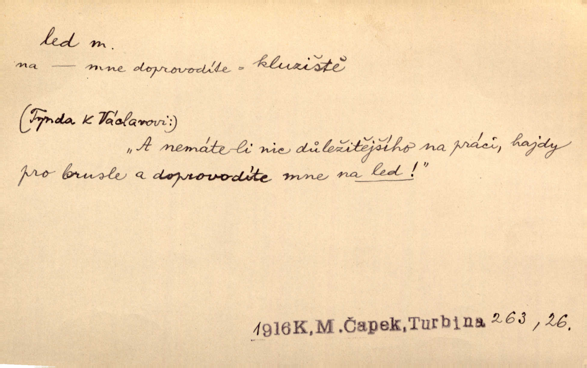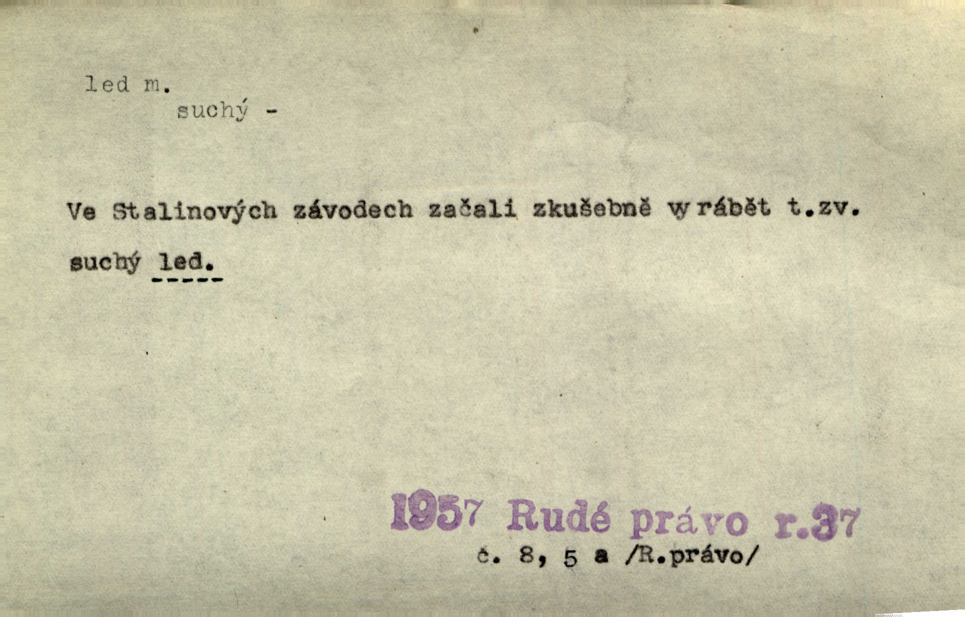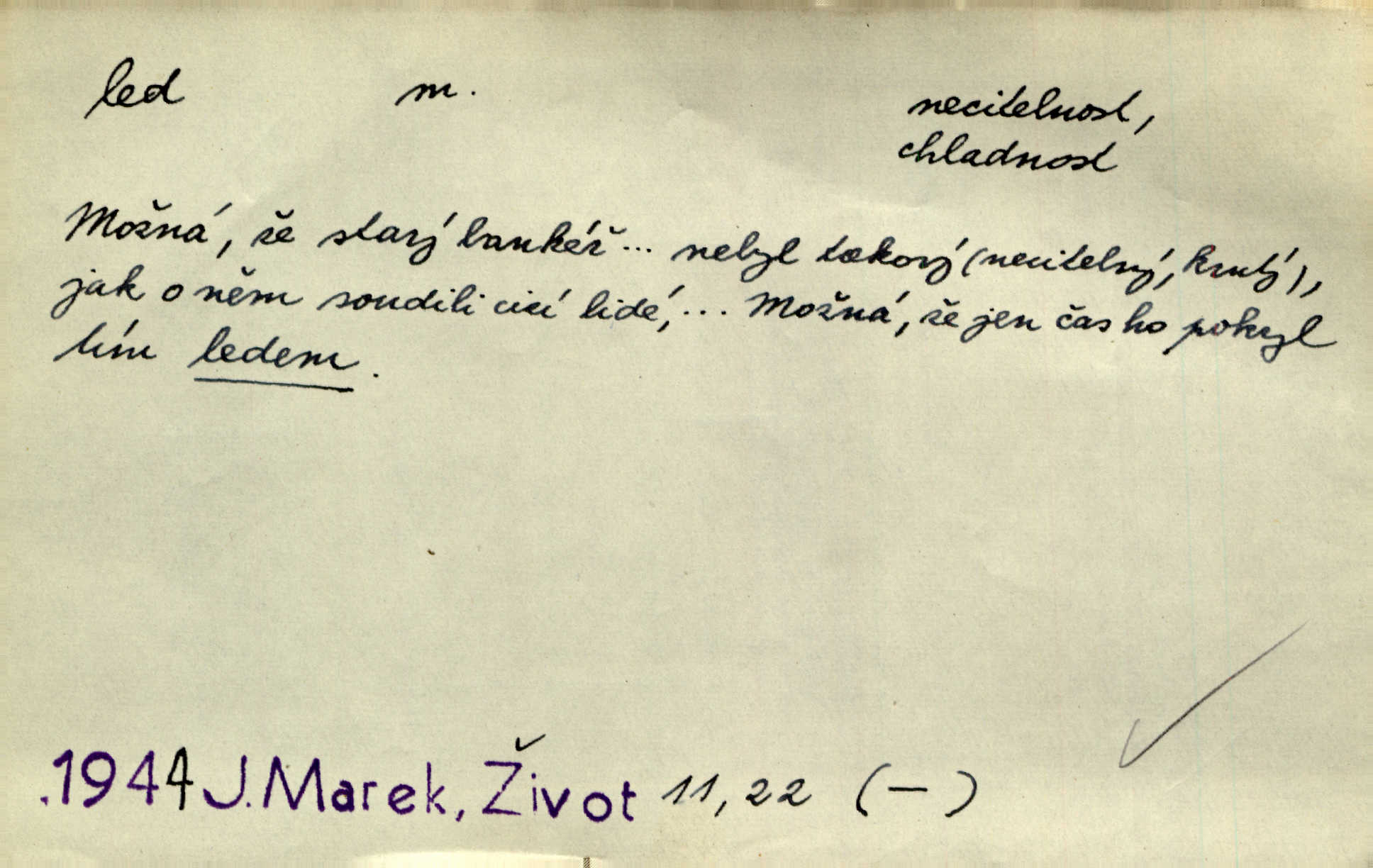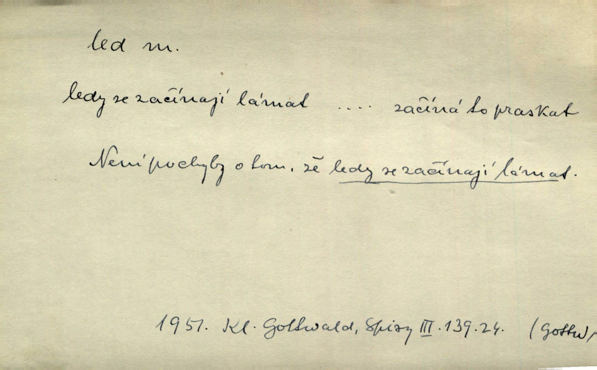- led, -u m. voda v stavu tuhém, zmrzlá. Potok [byl] zamrzlý čistým, pouze při březích zachumeleným ledem. Rais. Vysekali kus ledu u břehu. Jir. „Hajdy pro brusle a doprovodíte mne na led!“ (na kluziště). Čap. Ch. [Z jara na řece u mlýna s mostem] ledy jdou, o kozy se tříští, řečiště ucpou ledové kry. Baar. Na sklenici piva od ledu zastavil se pan rechtor. A. Mrš. K ledu se uložilo historické právo zrovna tak jako přirozené přestalo jednání o něm. Dyk. [Tvář nebožtíkova] byla zsinalá a studená jako led. Něm. Svědomí měl jak ten led; studené, tvrdé. Šmil. Nožky se jim [dětem] zklouzaly po podlaze [v saloně] hladké co led. Něm. Řeč mi jela jako po ledě. Šmil. přízeň panská chodí po ledě je nestálá, vrtkavá. Šmil. To rozehřívá [koňak]‚ trhá ledy a připravuje žaloudeček na dobré sousto vzbuzuje dobrou náladu. Herrm. Větrovec mluvil hlasem, z něhož čišel přímo led bezcitnost, nepřízeň. Třeb. Tech. suchý led pevný kysličník uhličitý.