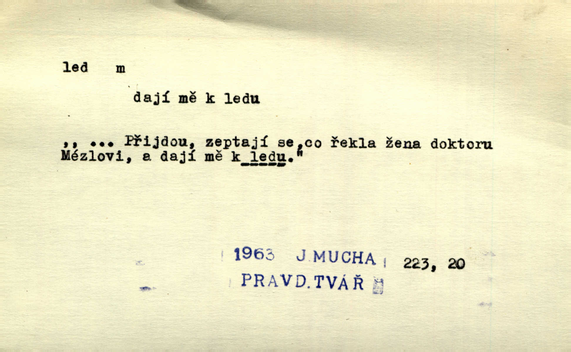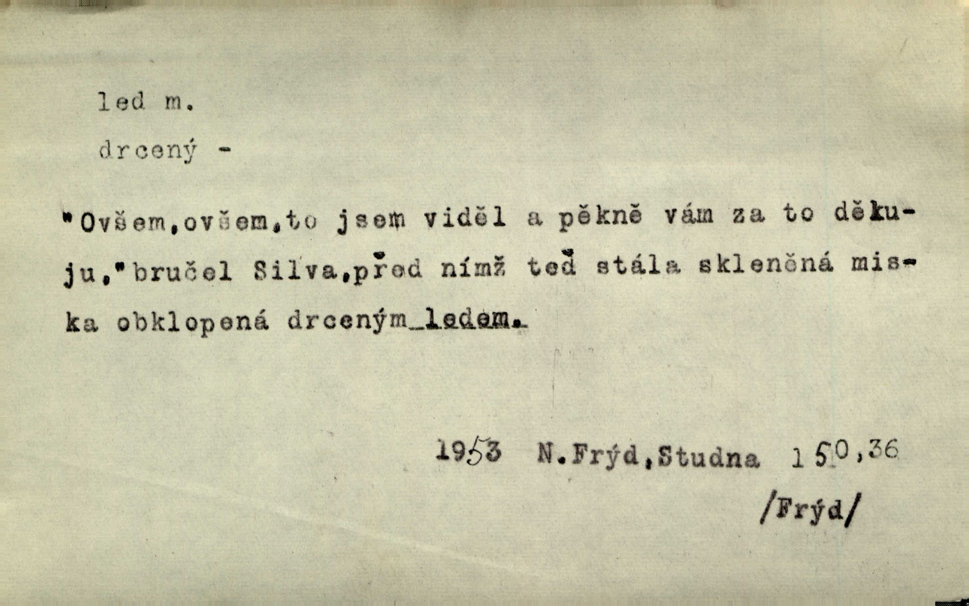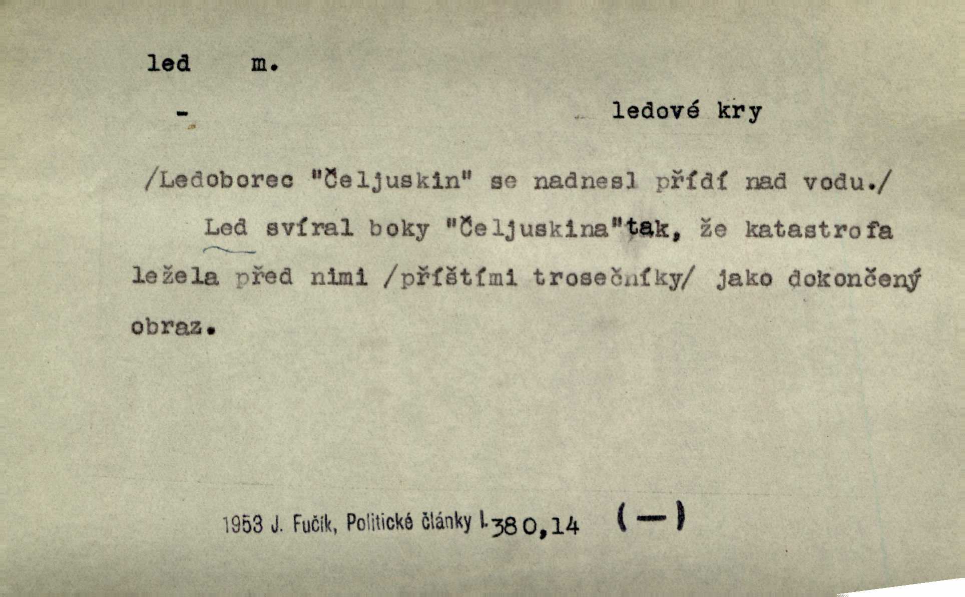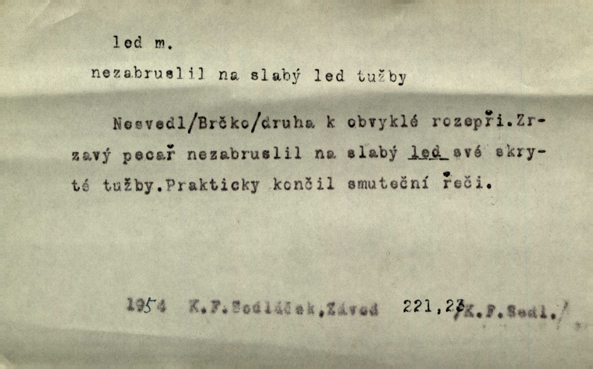 - led, -u m. voda v stavu tuhém, zmrzlá. Potok [byl] zamrzlý čistým, pouze při březích zachumeleným ledem. Rais. Vysekali kus ledu u břehu. Jir. „Hajdy pro brusle a doprovodíte mne na led!“ (na kluziště). Čap. Ch. [Z jara na řece u mlýna s mostem] ledy jdou, o kozy se tříští, řečiště ucpou ledové kry. Baar. Na sklenici piva od ledu zastavil se pan rechtor. A. Mrš. K ledu se uložilo historické právo zrovna tak jako přirozené přestalo jednání o něm. Dyk. [Tvář nebožtíkova] byla zsinalá a studená jako led. Něm. Svědomí měl jak ten led; studené, tvrdé. Šmil. Nožky se jim [dětem] zklouzaly po podlaze [v saloně] hladké co led. Něm. Řeč mi jela jako po ledě. Šmil. přízeň panská chodí po ledě je nestálá, vrtkavá. Šmil. To rozehřívá [koňak]‚ trhá ledy a připravuje žaloudeček na dobré sousto vzbuzuje dobrou náladu. Herrm. Větrovec mluvil hlasem, z něhož čišel přímo led bezcitnost, nepřízeň. Třeb. Tech. suchý led pevný kysličník uhličitý.