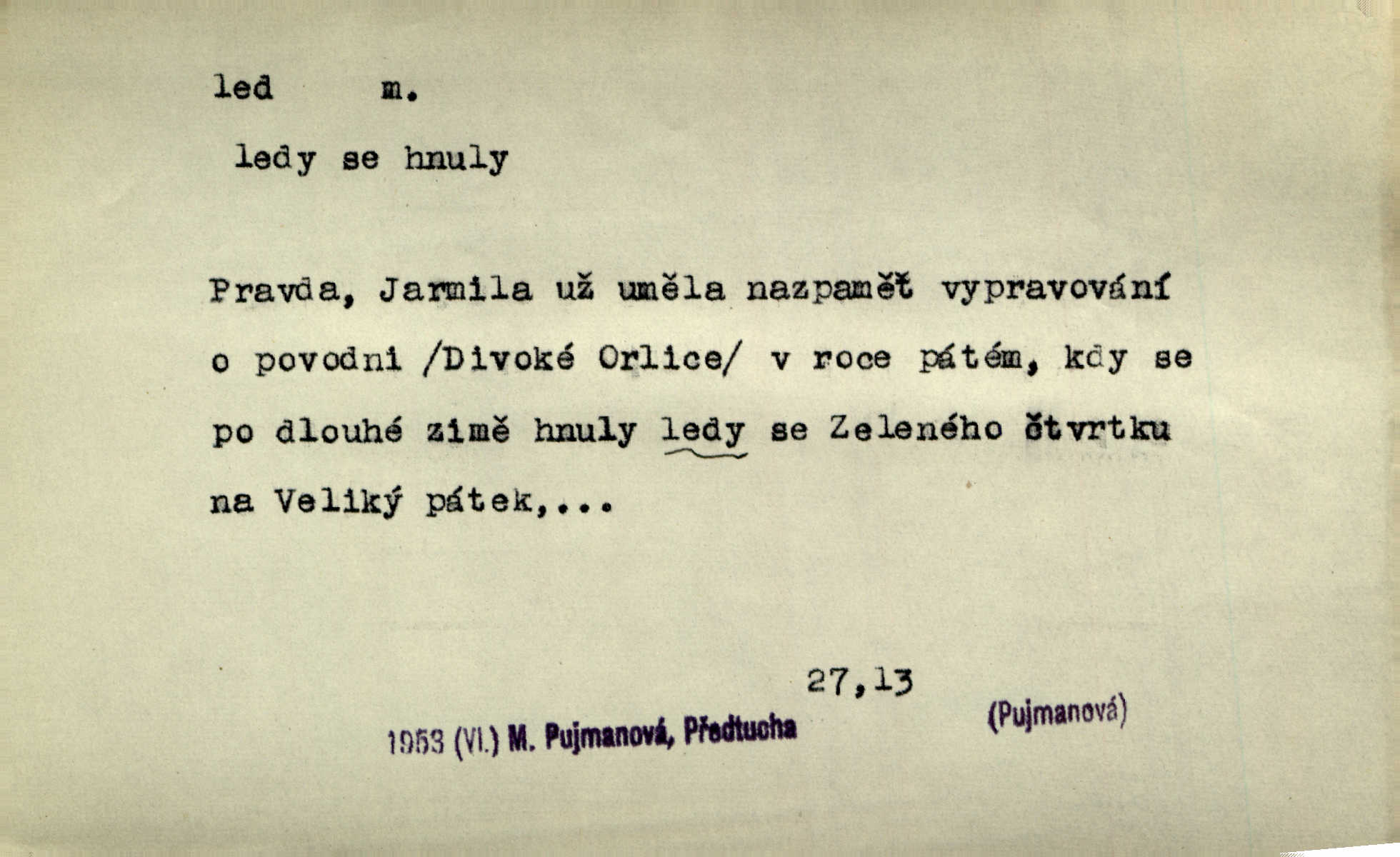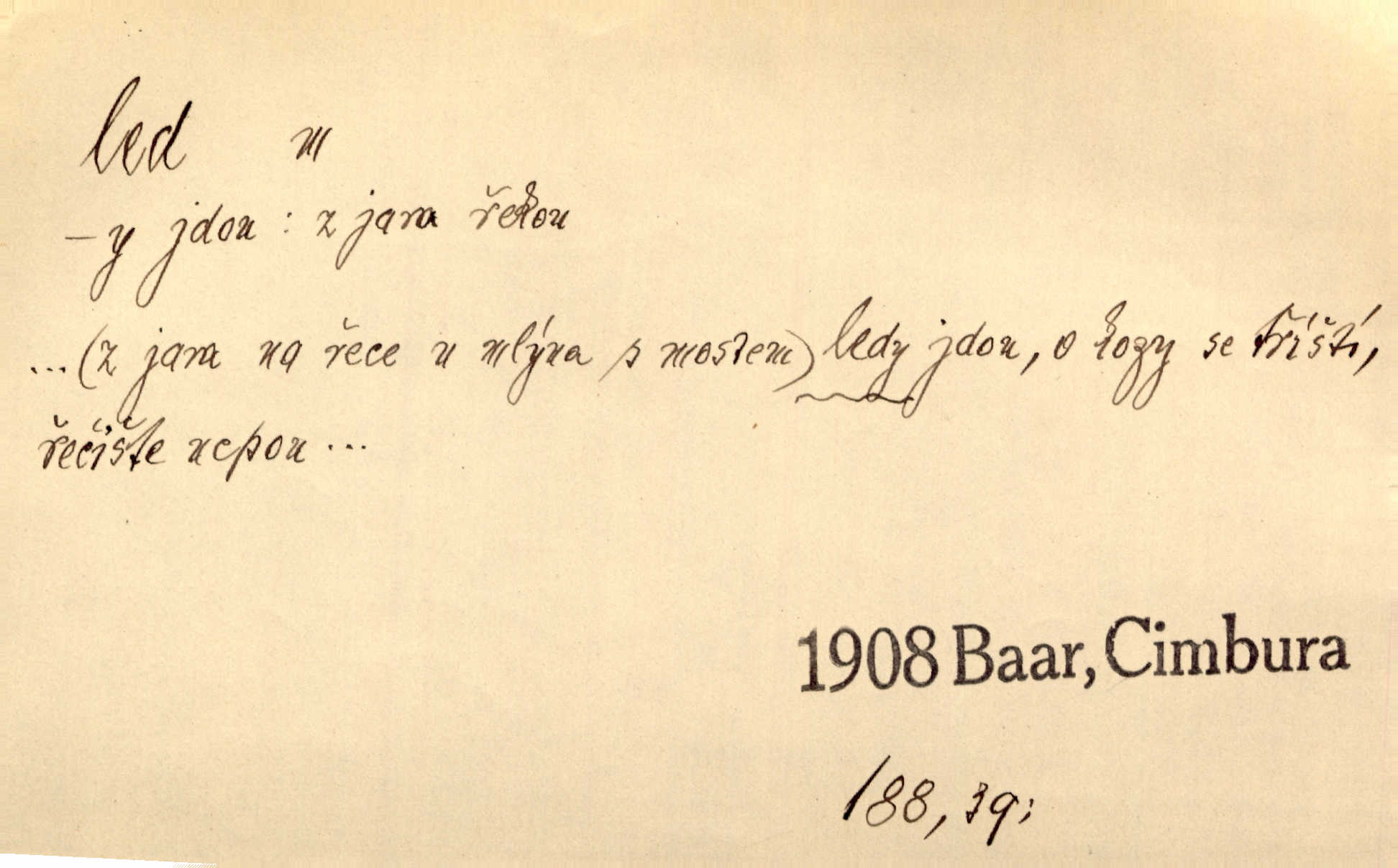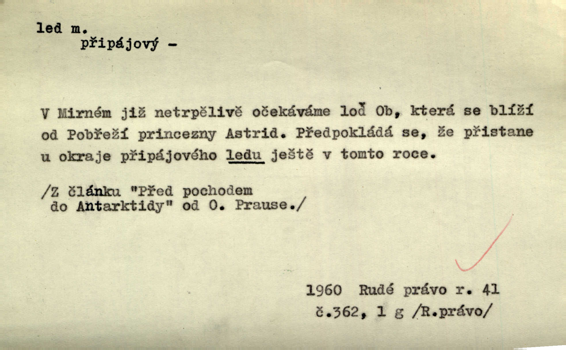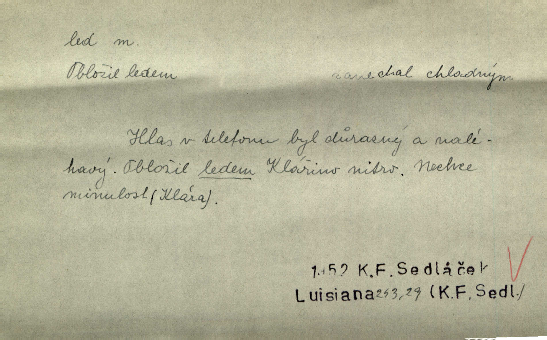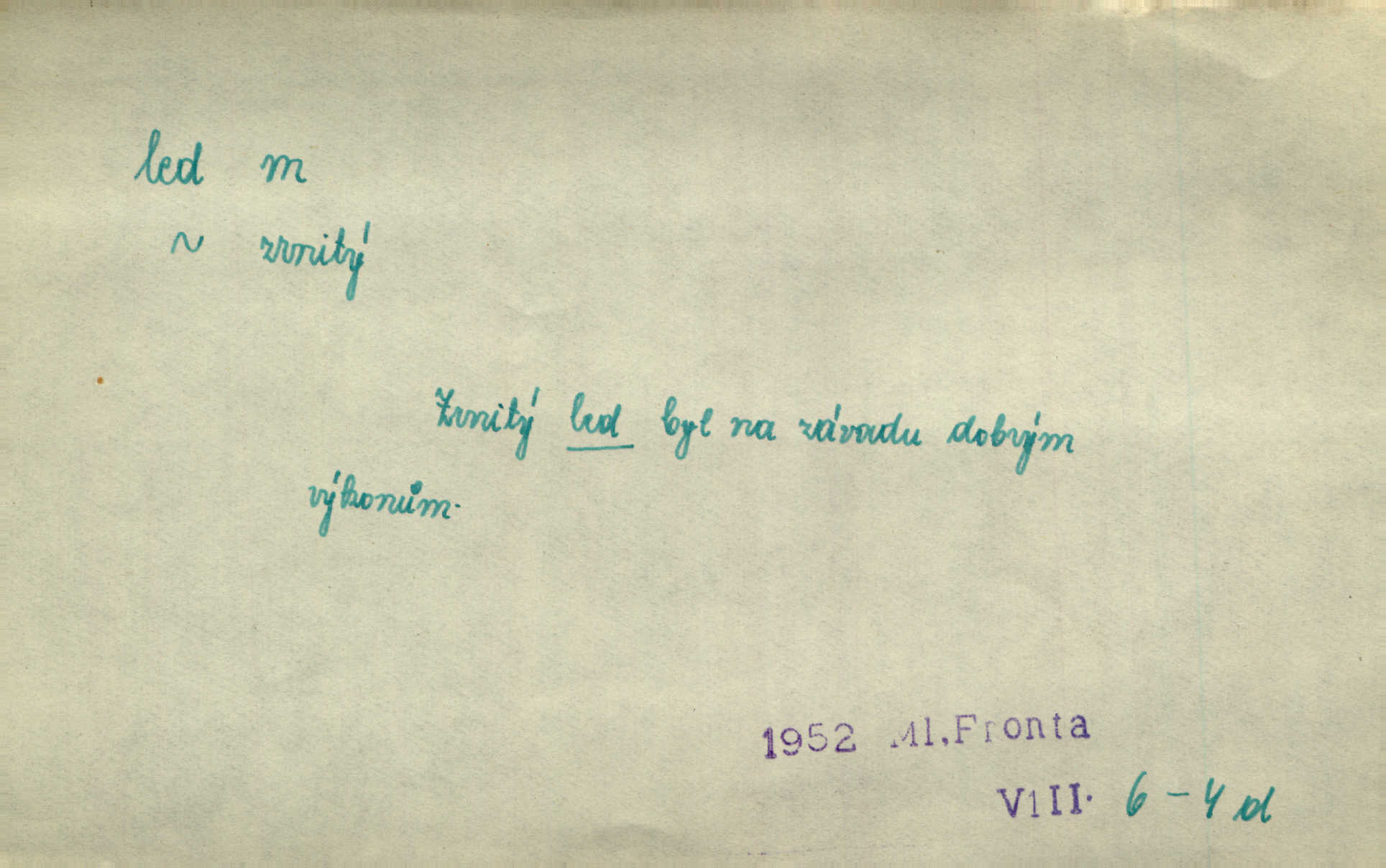 - led, -u m. voda v stavu tuhém, zmrzlá. Potok [byl] zamrzlý čistým, pouze při březích zachumeleným ledem. Rais. Vysekali kus ledu u břehu. Jir. „Hajdy pro brusle a doprovodíte mne na led!“ (na kluziště). Čap. Ch. [Z jara na řece u mlýna s mostem] ledy jdou, o kozy se tříští, řečiště ucpou ledové kry. Baar. Na sklenici piva od ledu zastavil se pan rechtor. A. Mrš. K ledu se uložilo historické právo zrovna tak jako přirozené přestalo jednání o něm. Dyk. [Tvář nebožtíkova] byla zsinalá a studená jako led. Něm. Svědomí měl jak ten led; studené, tvrdé. Šmil. Nožky se jim [dětem] zklouzaly po podlaze [v saloně] hladké co led. Něm. Řeč mi jela jako po ledě. Šmil. přízeň panská chodí po ledě je nestálá, vrtkavá. Šmil. To rozehřívá [koňak]‚ trhá ledy a připravuje žaloudeček na dobré sousto vzbuzuje dobrou náladu. Herrm. Větrovec mluvil hlasem, z něhož čišel přímo led bezcitnost, nepřízeň. Třeb. Tech. suchý led pevný kysličník uhličitý.