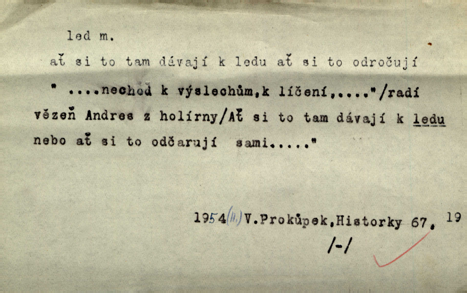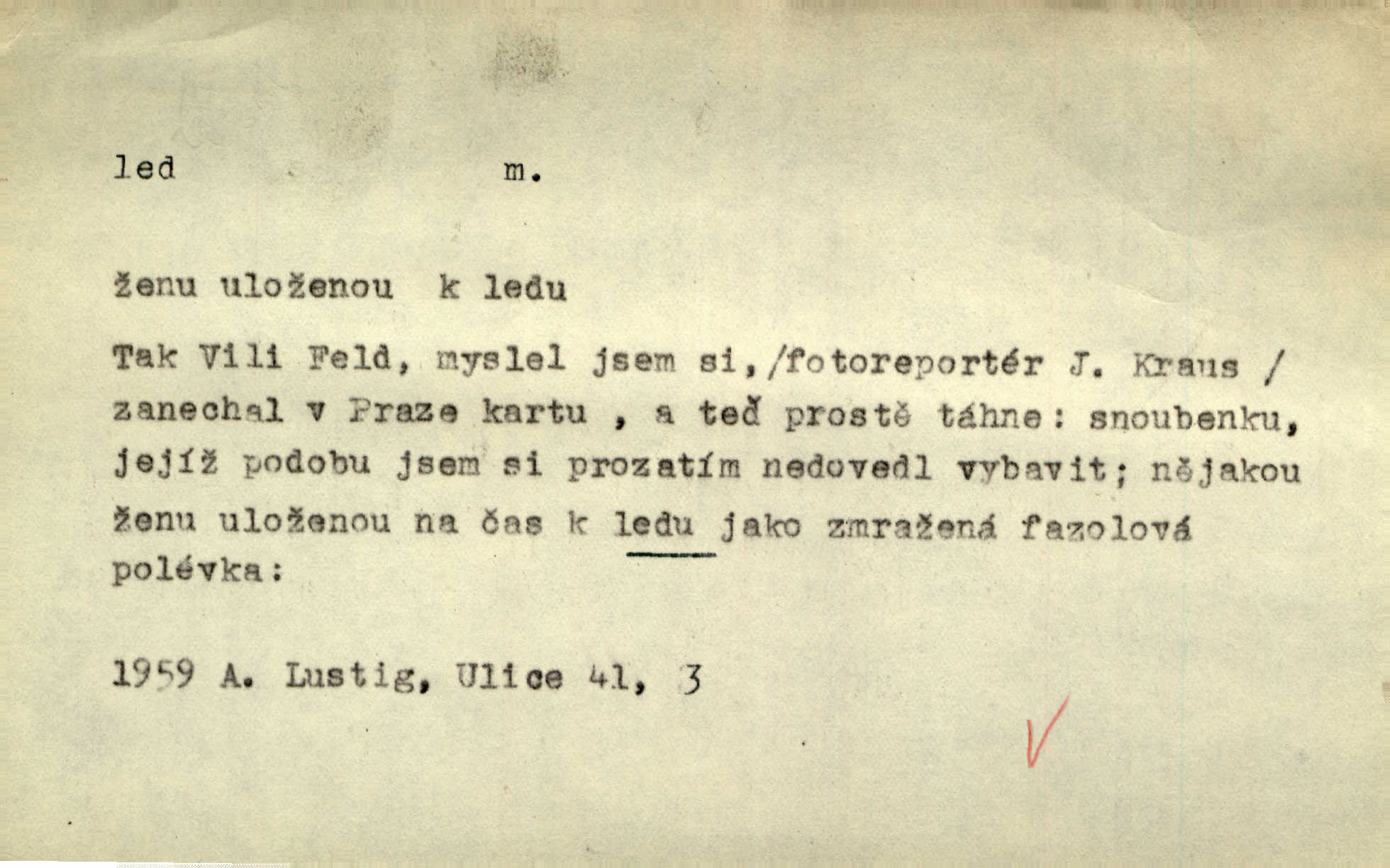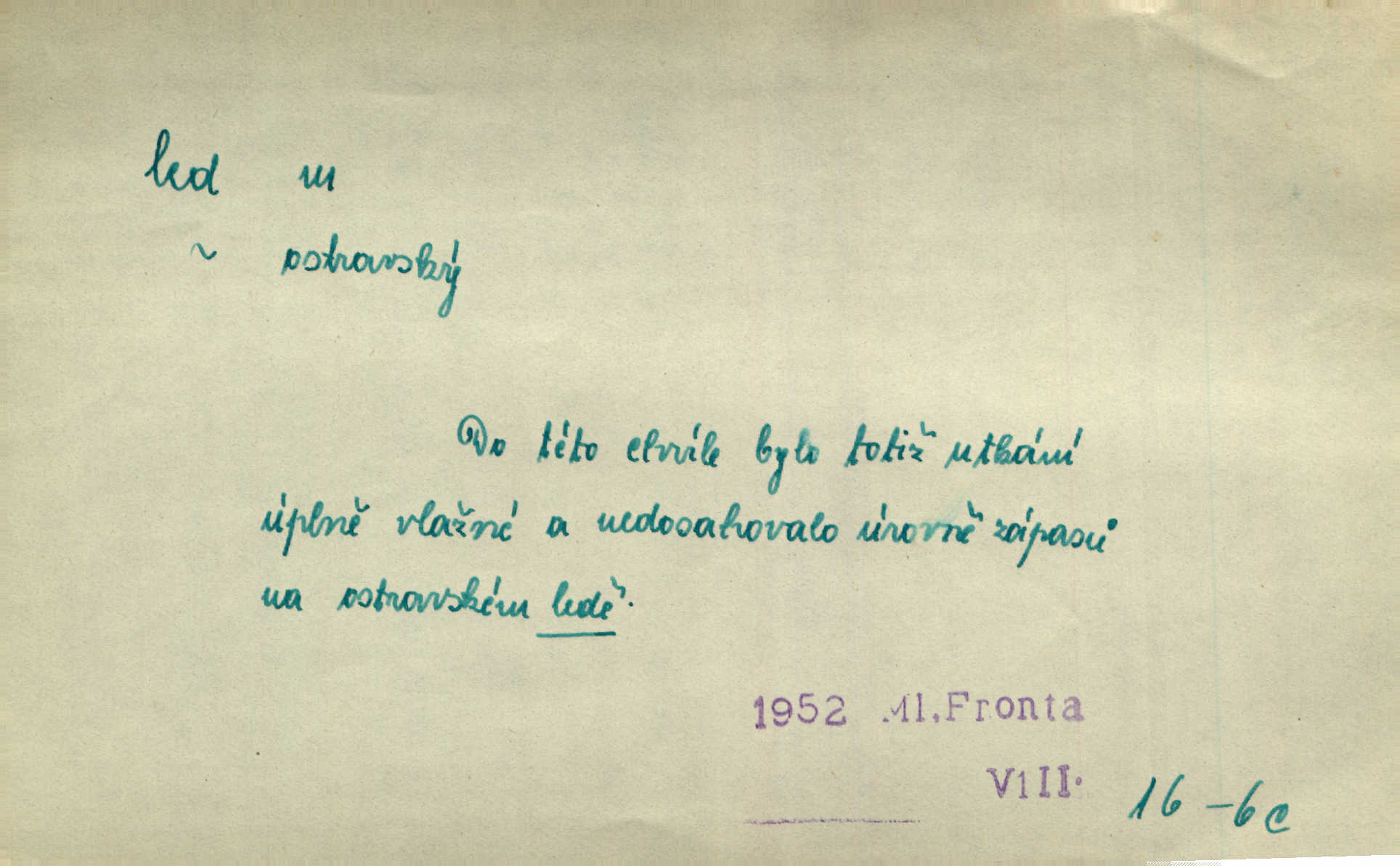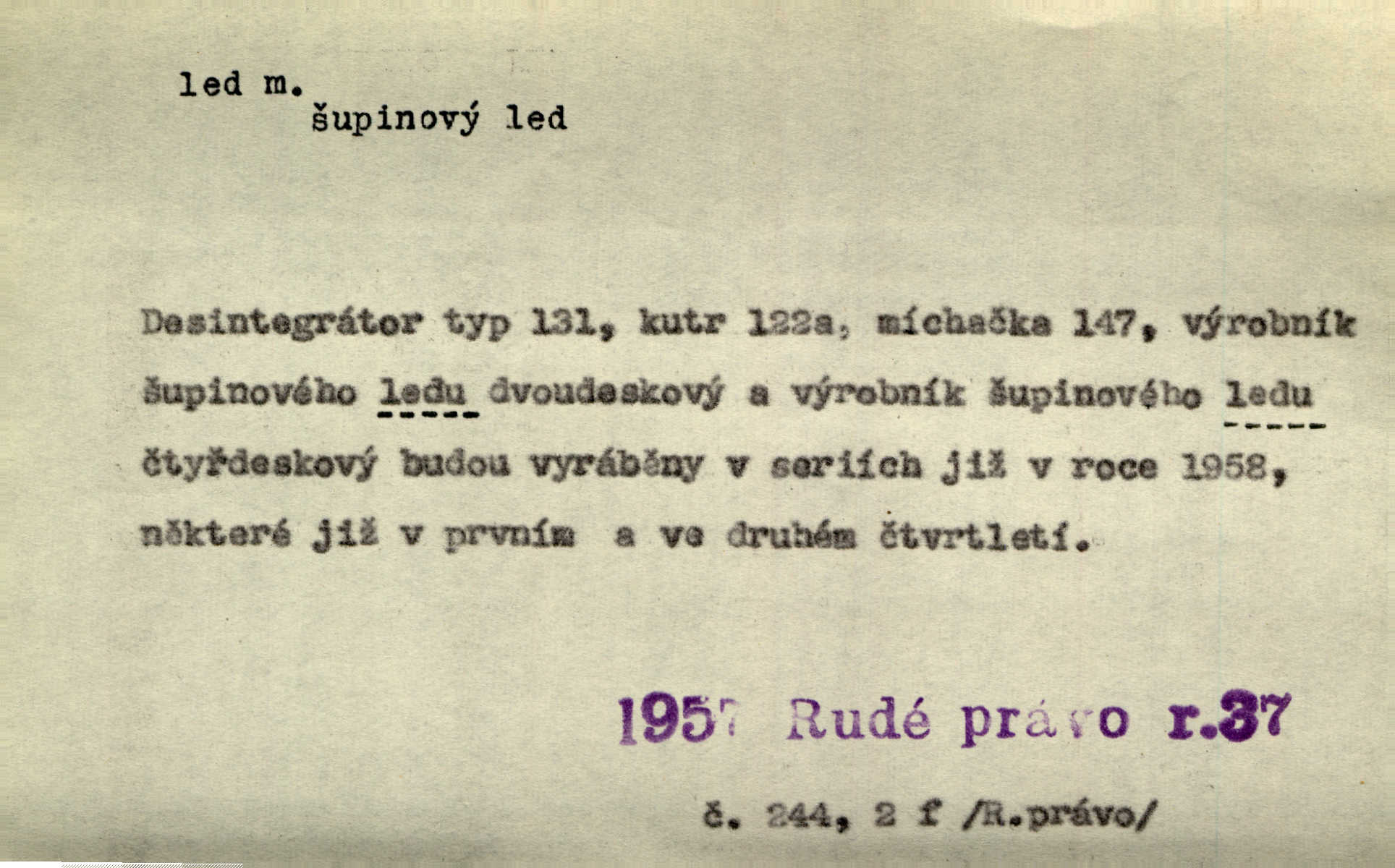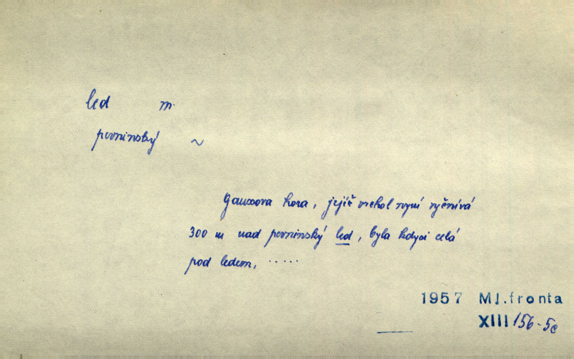 - led, -u m. voda v stavu tuhém, zmrzlá. Potok [byl] zamrzlý čistým, pouze při březích zachumeleným ledem. Rais. Vysekali kus ledu u břehu. Jir. „Hajdy pro brusle a doprovodíte mne na led!“ (na kluziště). Čap. Ch. [Z jara na řece u mlýna s mostem] ledy jdou, o kozy se tříští, řečiště ucpou ledové kry. Baar. Na sklenici piva od ledu zastavil se pan rechtor. A. Mrš. K ledu se uložilo historické právo zrovna tak jako přirozené přestalo jednání o něm. Dyk. [Tvář nebožtíkova] byla zsinalá a studená jako led. Něm. Svědomí měl jak ten led; studené, tvrdé. Šmil. Nožky se jim [dětem] zklouzaly po podlaze [v saloně] hladké co led. Něm. Řeč mi jela jako po ledě. Šmil. přízeň panská chodí po ledě je nestálá, vrtkavá. Šmil. To rozehřívá [koňak]‚ trhá ledy a připravuje žaloudeček na dobré sousto vzbuzuje dobrou náladu. Herrm. Větrovec mluvil hlasem, z něhož čišel přímo led bezcitnost, nepřízeň. Třeb. Tech. suchý led pevný kysličník uhličitý.