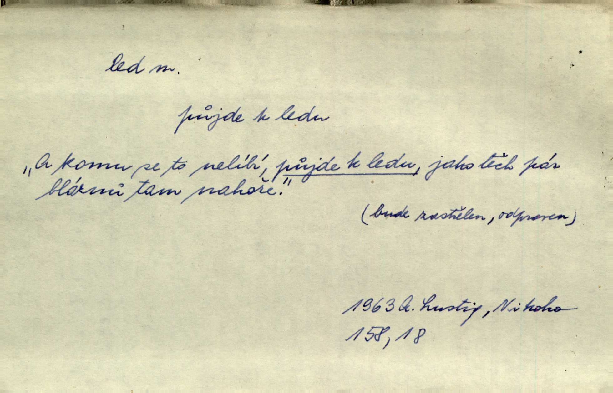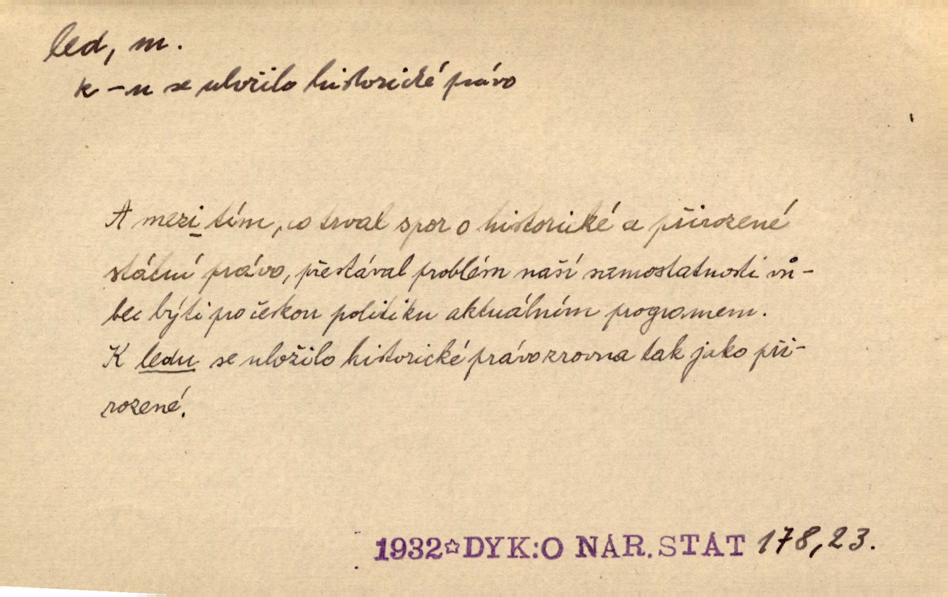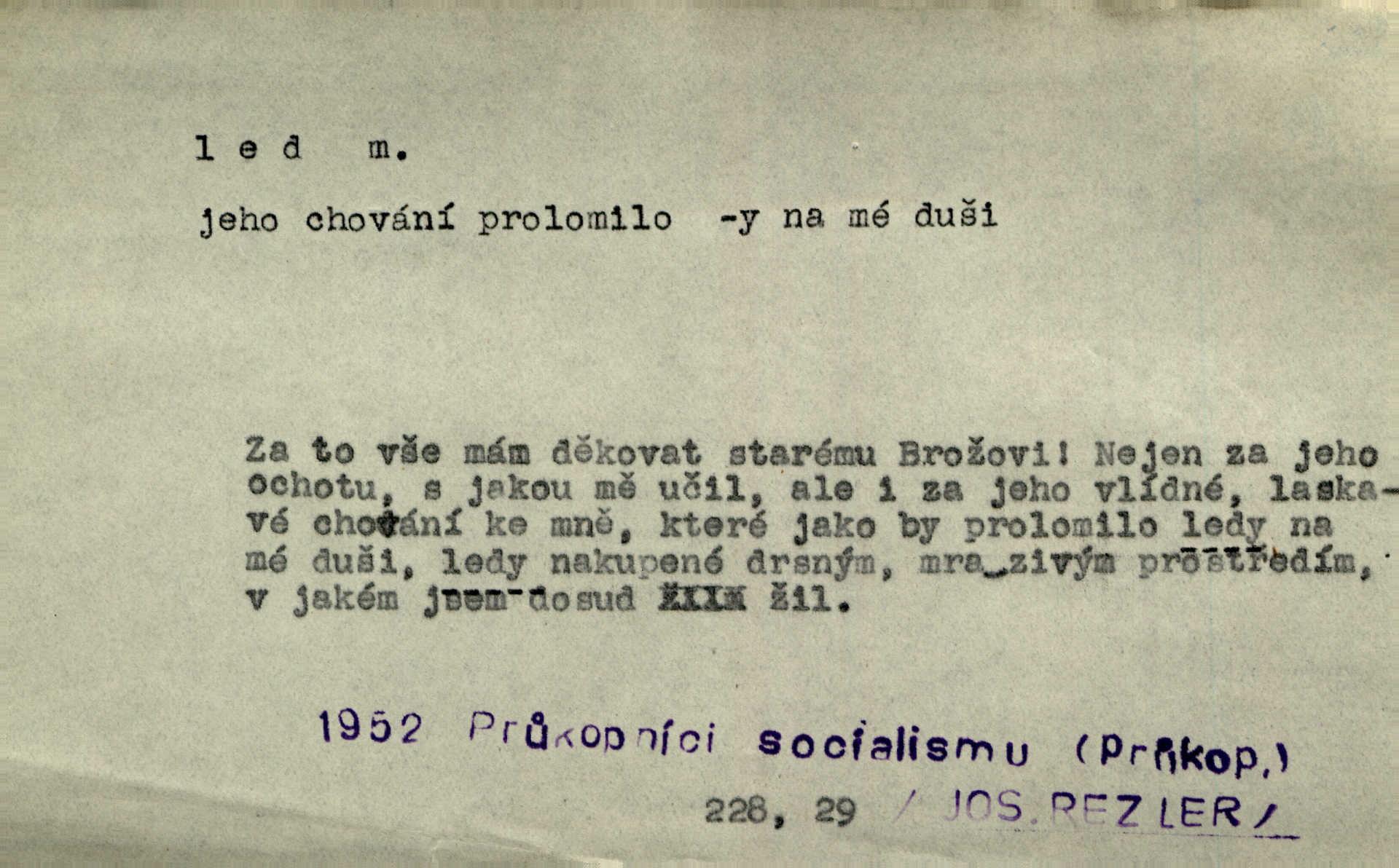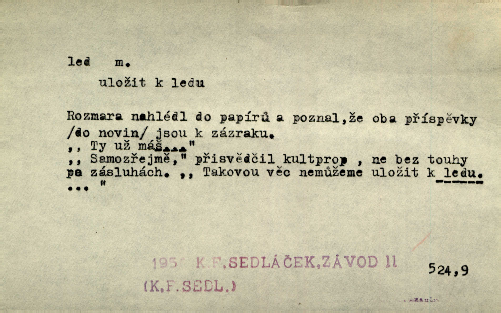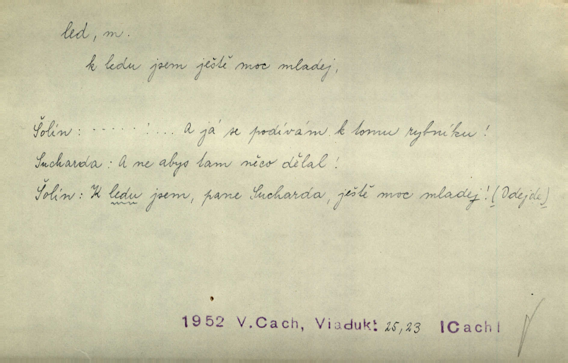 - led, -u m. voda v stavu tuhém, zmrzlá. Potok [byl] zamrzlý čistým, pouze při březích zachumeleným ledem. Rais. Vysekali kus ledu u břehu. Jir. „Hajdy pro brusle a doprovodíte mne na led!“ (na kluziště). Čap. Ch. [Z jara na řece u mlýna s mostem] ledy jdou, o kozy se tříští, řečiště ucpou ledové kry. Baar. Na sklenici piva od ledu zastavil se pan rechtor. A. Mrš. K ledu se uložilo historické právo zrovna tak jako přirozené přestalo jednání o něm. Dyk. [Tvář nebožtíkova] byla zsinalá a studená jako led. Něm. Svědomí měl jak ten led; studené, tvrdé. Šmil. Nožky se jim [dětem] zklouzaly po podlaze [v saloně] hladké co led. Něm. Řeč mi jela jako po ledě. Šmil. přízeň panská chodí po ledě je nestálá, vrtkavá. Šmil. To rozehřívá [koňak]‚ trhá ledy a připravuje žaloudeček na dobré sousto vzbuzuje dobrou náladu. Herrm. Větrovec mluvil hlasem, z něhož čišel přímo led bezcitnost, nepřízeň. Třeb. Tech. suchý led pevný kysličník uhličitý.