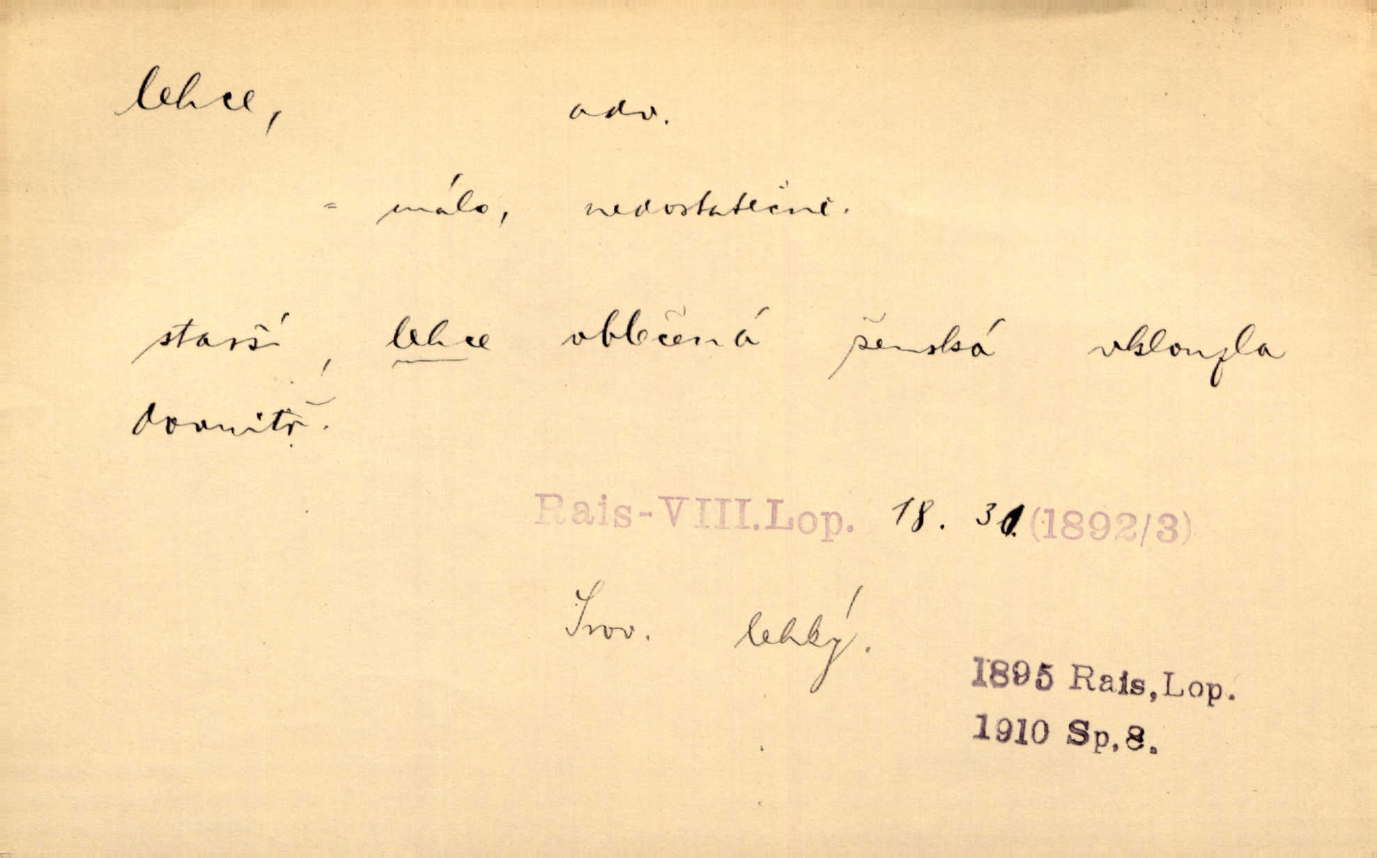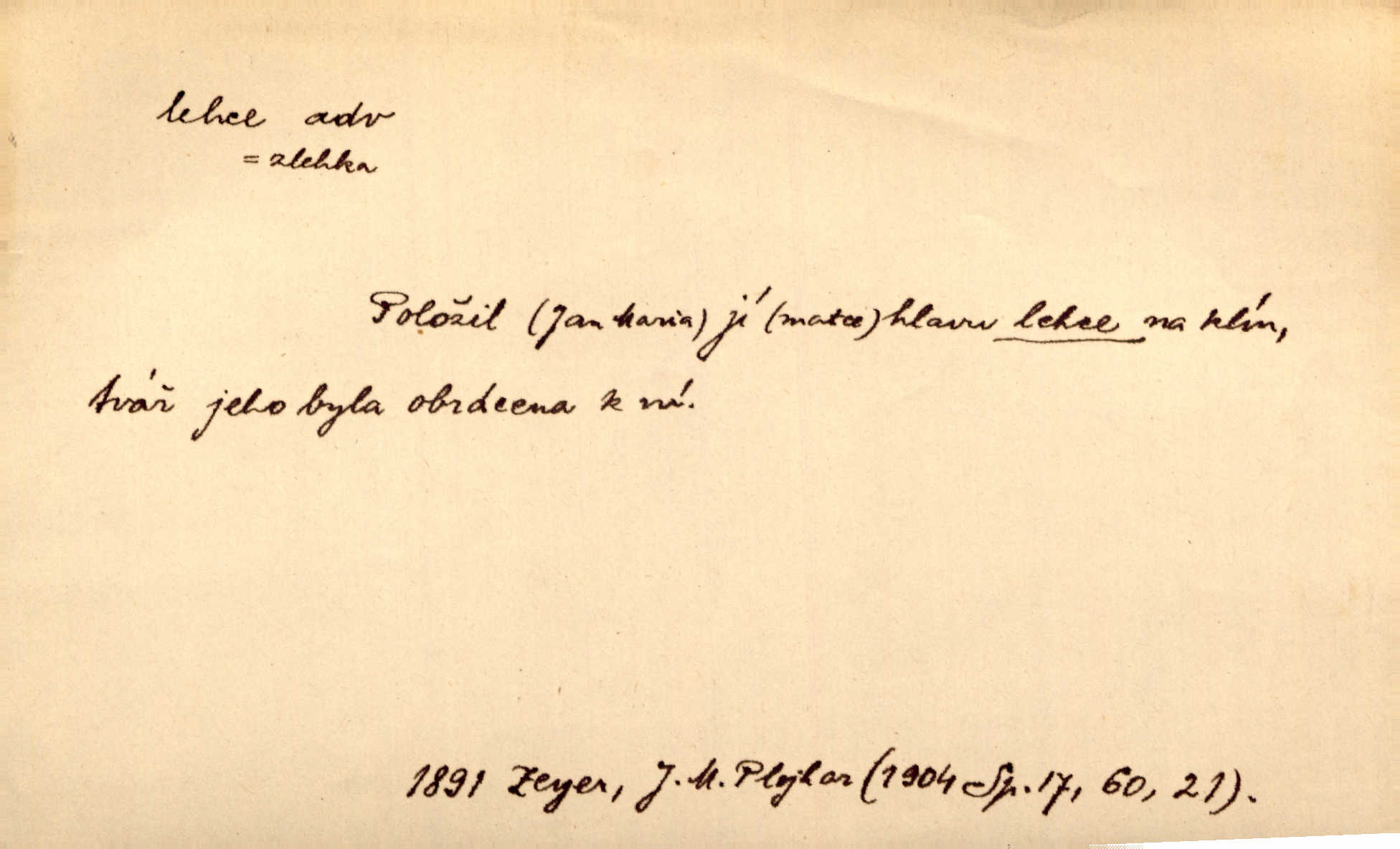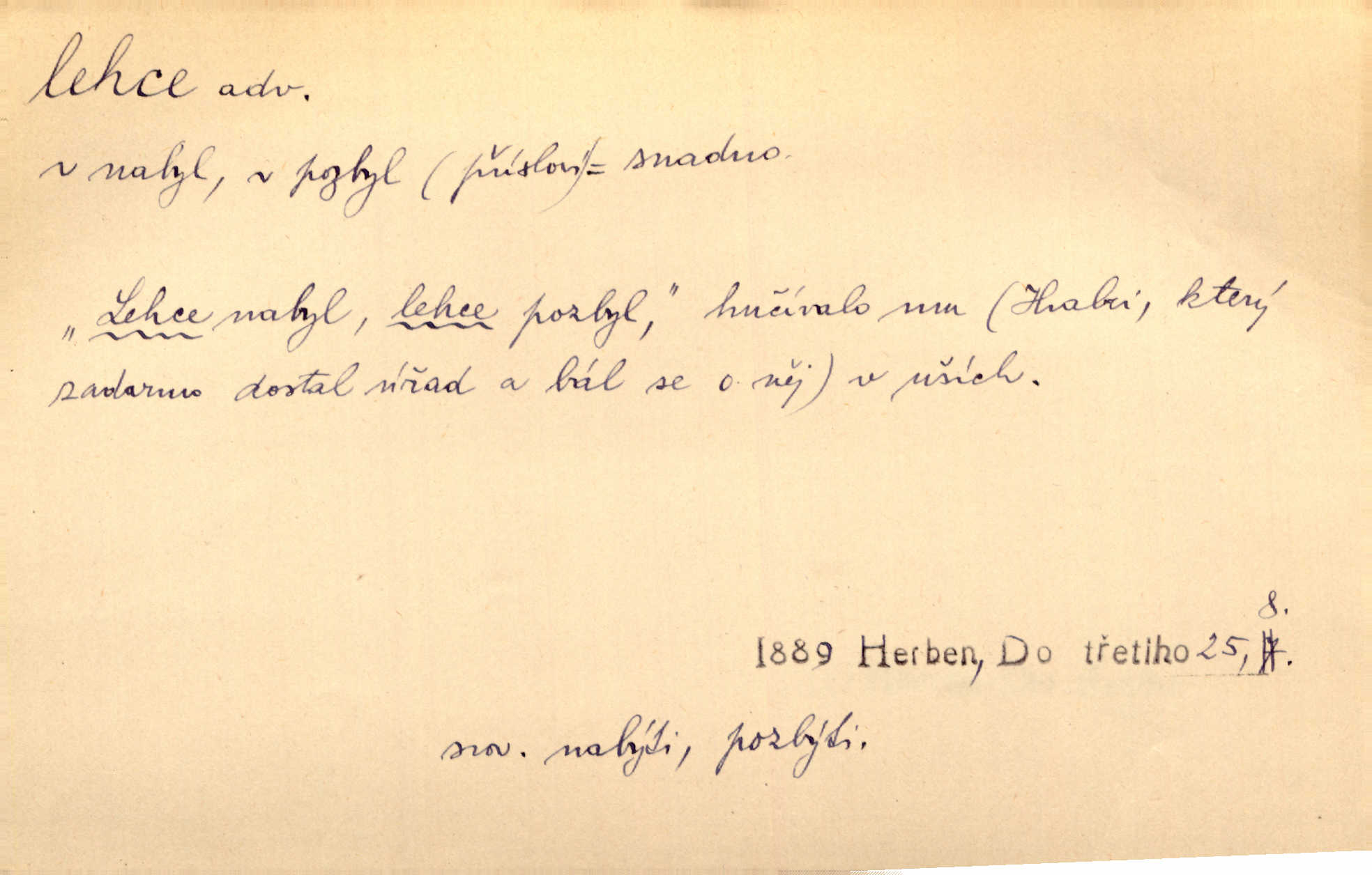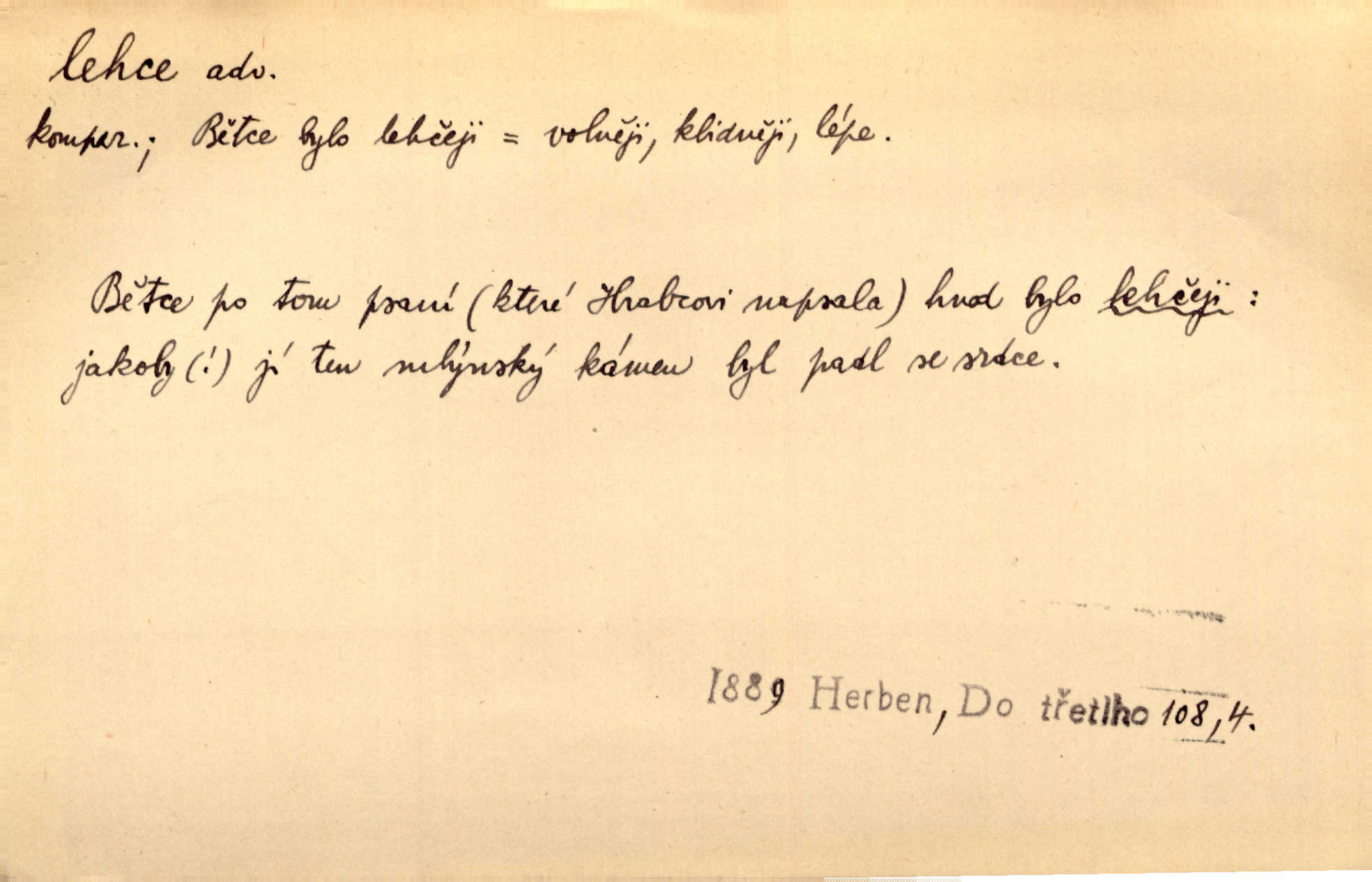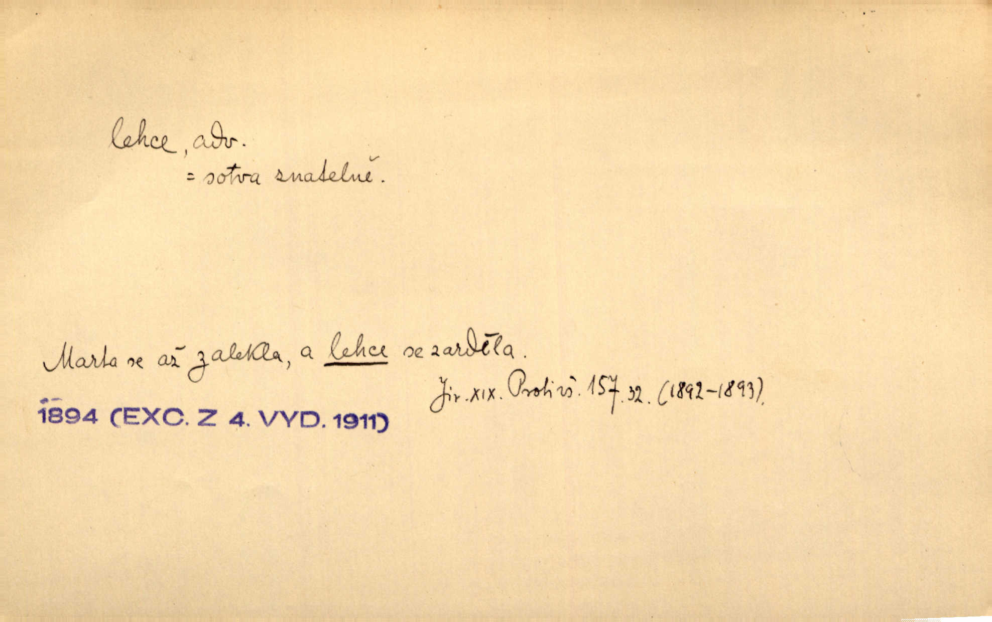 - lehce adv. k lehký, bez projevení tíže, bez velkého zatížení. Položil jí [matce] hlavu lehce na klín. Zey. Pavézníci i lehčeji odění střelci. Jir. Starší, lehce oblečená ženská vklouzla dovnitř v lehkém šatě. Rais. D hbitě, svižně. Šel lehce, a holí švihácky se rozpřáhaje, klátil hoření půlí těla. Rais. Lehce svezla se [kněžna] s koně. Něm. Přišla jako srna lehce. Jir. Přehoupl se lehce přes zábradlí [mostu]. Vach. D lehkomyslně, nerozvážně. „Nechápu, jak může sedlák chodit do hospody každý den, karbanit — opíjet se — lehce žit.“ Baar. „A to [nepříjemnost s hraběnkou] vy tak lehce berete?“ R. Svob. D slabě, málo usilovně, nepatrně, poněkud. Neodpověděl, jenom lehce odkašlal. Rais. Kapitán lehce vykřikl radostí. K. Čap. V pružnou půdu čerstvé koleje těžkých povozů byly jen lehce vtisknuty. Podl. Odstrčila ho, ale zcela lehce. Vach. Věděl, že je raněn, ač jen lehce. Staš. Starší sestra má lehce ochuravěla. Krás. D volně, nepevně. Kabanici přehodil přes ramena a lehce ji přes prsa řemínkem upevnil. Něm. Hlava pokryta je bílým malým šátkem, jehož přední dva konce jen lehce do zadu se zavážou. Něm. D nedůkladně, povrchně, zběžně. Salaše lehce srubené. Něm. Všecko jest tu [ve Vzpomínkách S. K. N.] lehce a ledabyle nahozeno. Lum. Voldan lehce přehlídl svůj zevnějšek v zrcadlech. Hlad. D klidně, bezstarostně. Náhle bylo tak klidno v jeho srdci, bylo mu tak lehce! Zey. Pohovoříme si a bude ti alespoň u srdce lehčeji. Třeb. Bětce po tom psaní bylo lehčeji: jakoby jí mlýnský kámen byl spadl se srdce. Herb. D snadno. Rybář, potěšen, že tak lehce z nouze vyvázl, radoval se z výdělku. Něm. Co se tak člověk na tom venkově nastará! A tam [v městě] se tak lehce vydělává! R. Svob. Lehce nabyl, lehce pozbyl. Přísl. Lehce se boří, ale těžko se staví. Baar.