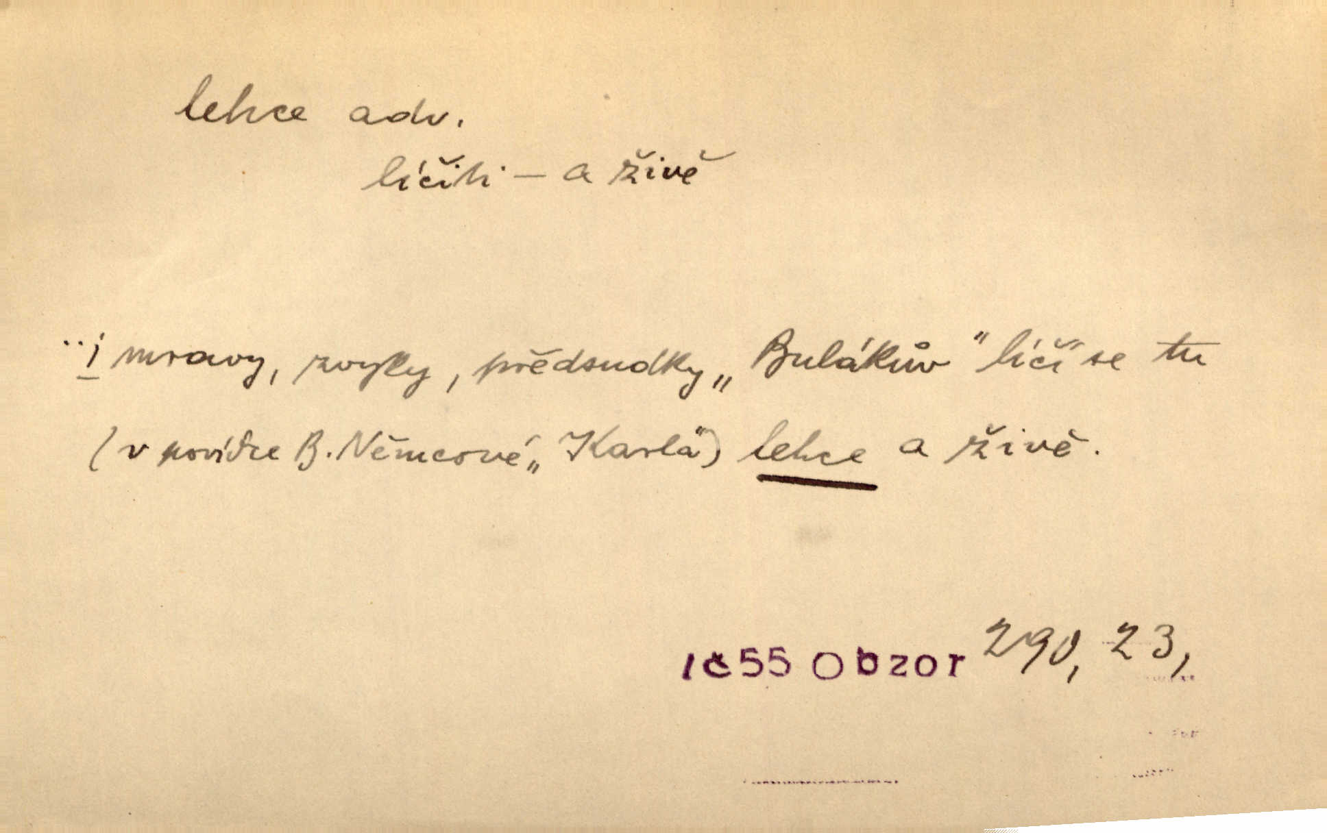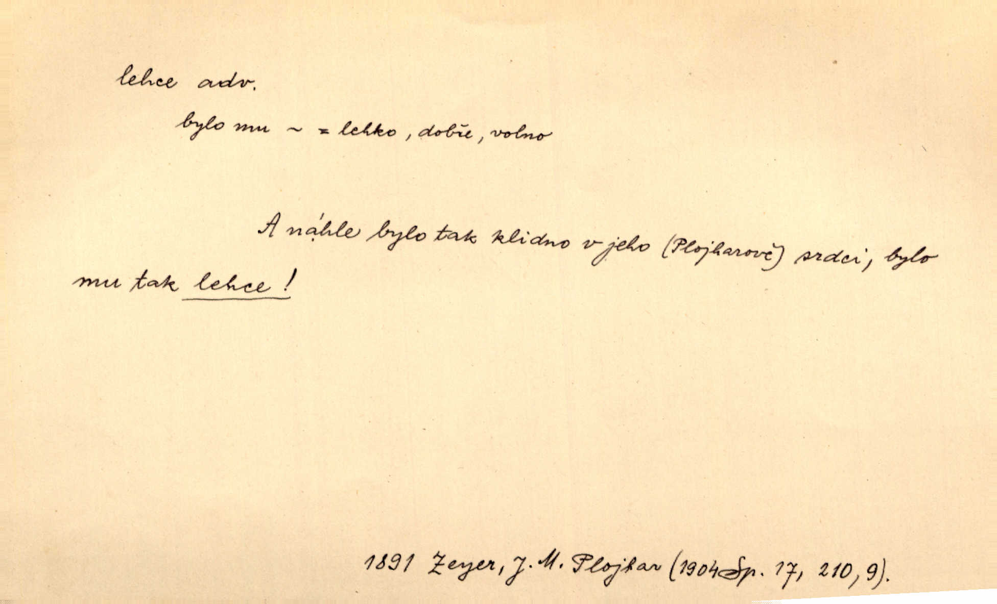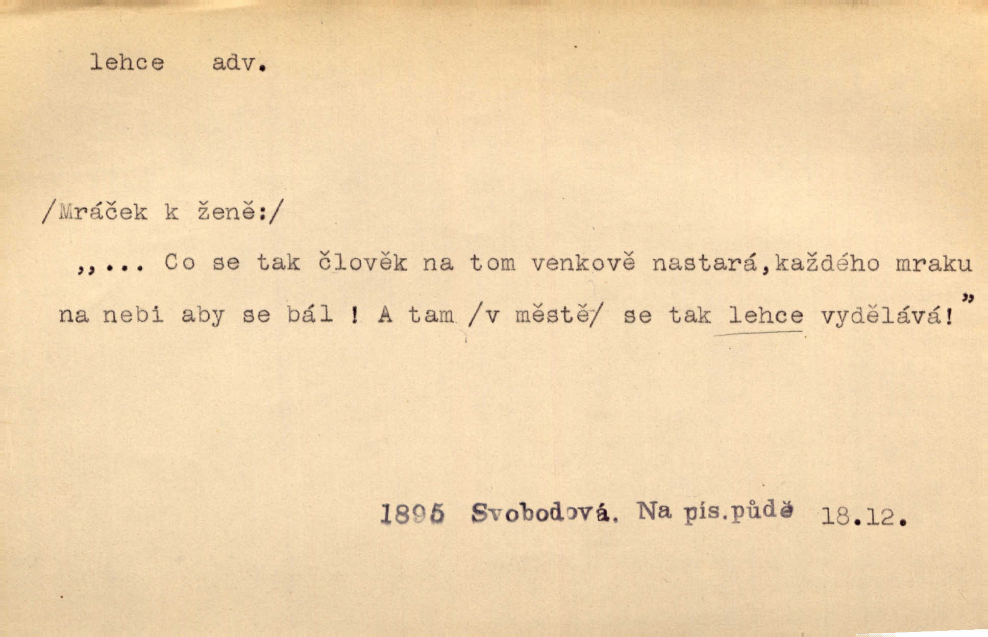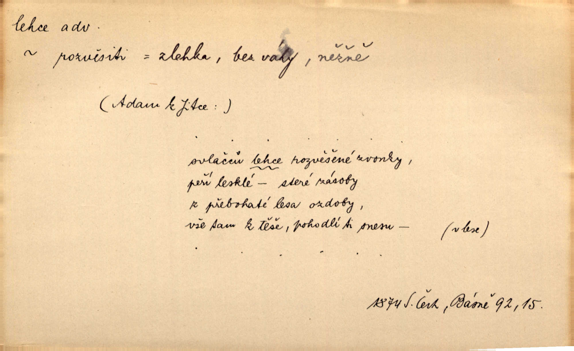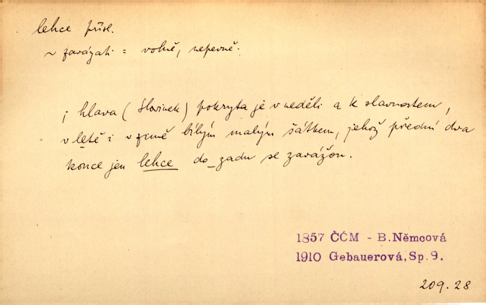 - lehce adv. k lehký, bez projevení tíže, bez velkého zatížení. Položil jí [matce] hlavu lehce na klín. Zey. Pavézníci i lehčeji odění střelci. Jir. Starší, lehce oblečená ženská vklouzla dovnitř v lehkém šatě. Rais. D hbitě, svižně. Šel lehce, a holí švihácky se rozpřáhaje, klátil hoření půlí těla. Rais. Lehce svezla se [kněžna] s koně. Něm. Přišla jako srna lehce. Jir. Přehoupl se lehce přes zábradlí [mostu]. Vach. D lehkomyslně, nerozvážně. „Nechápu, jak může sedlák chodit do hospody každý den, karbanit — opíjet se — lehce žit.“ Baar. „A to [nepříjemnost s hraběnkou] vy tak lehce berete?“ R. Svob. D slabě, málo usilovně, nepatrně, poněkud. Neodpověděl, jenom lehce odkašlal. Rais. Kapitán lehce vykřikl radostí. K. Čap. V pružnou půdu čerstvé koleje těžkých povozů byly jen lehce vtisknuty. Podl. Odstrčila ho, ale zcela lehce. Vach. Věděl, že je raněn, ač jen lehce. Staš. Starší sestra má lehce ochuravěla. Krás. D volně, nepevně. Kabanici přehodil přes ramena a lehce ji přes prsa řemínkem upevnil. Něm. Hlava pokryta je bílým malým šátkem, jehož přední dva konce jen lehce do zadu se zavážou. Něm. D nedůkladně, povrchně, zběžně. Salaše lehce srubené. Něm. Všecko jest tu [ve Vzpomínkách S. K. N.] lehce a ledabyle nahozeno. Lum. Voldan lehce přehlídl svůj zevnějšek v zrcadlech. Hlad. D klidně, bezstarostně. Náhle bylo tak klidno v jeho srdci, bylo mu tak lehce! Zey. Pohovoříme si a bude ti alespoň u srdce lehčeji. Třeb. Bětce po tom psaní bylo lehčeji: jakoby jí mlýnský kámen byl spadl se srdce. Herb. D snadno. Rybář, potěšen, že tak lehce z nouze vyvázl, radoval se z výdělku. Něm. Co se tak člověk na tom venkově nastará! A tam [v městě] se tak lehce vydělává! R. Svob. Lehce nabyl, lehce pozbyl. Přísl. Lehce se boří, ale těžko se staví. Baar.