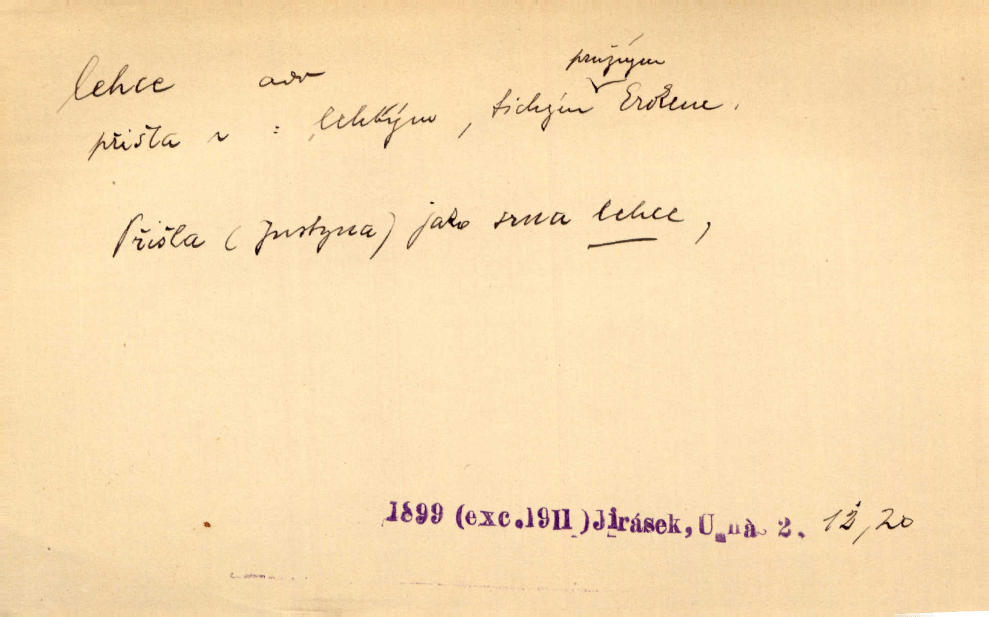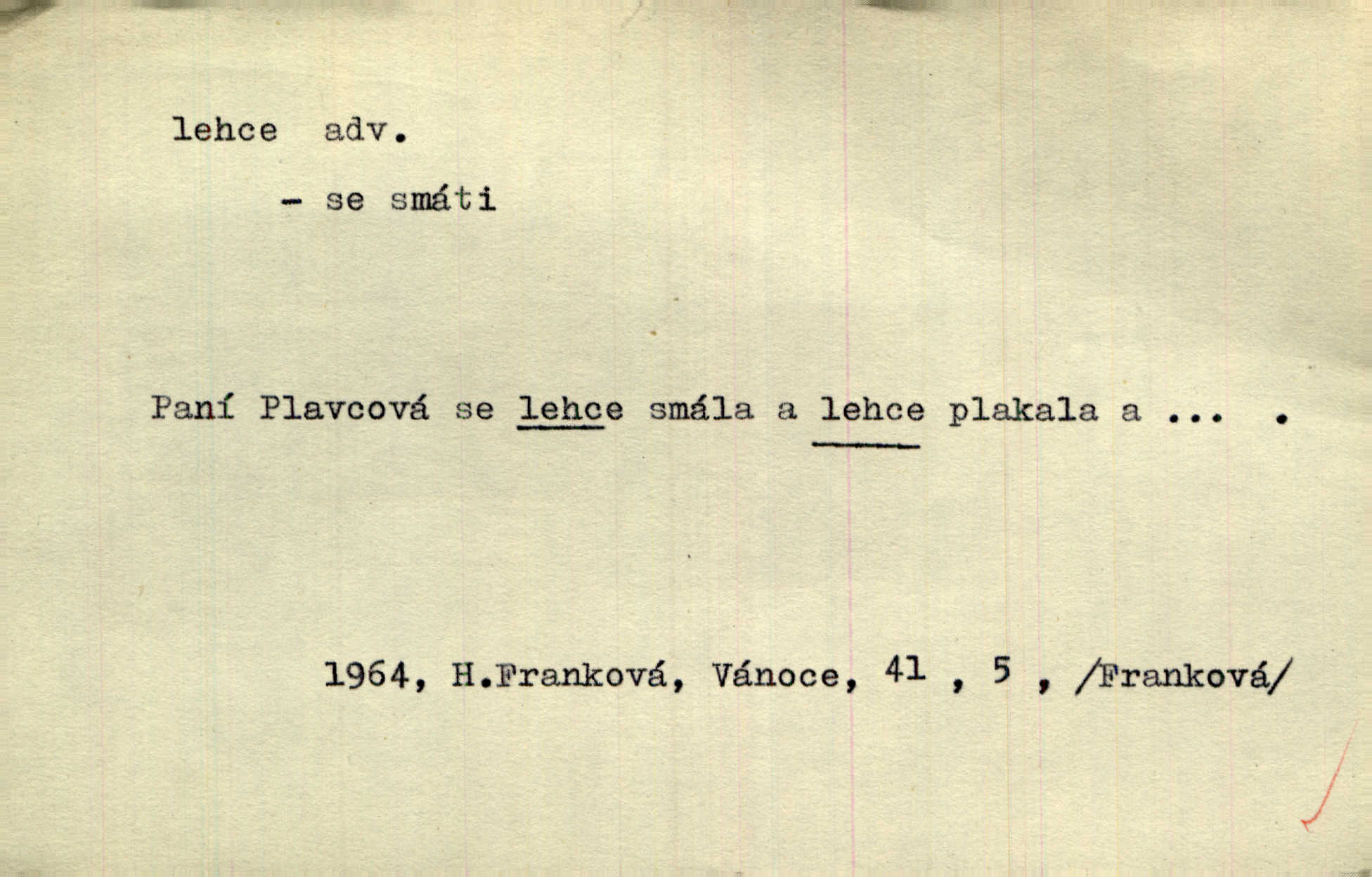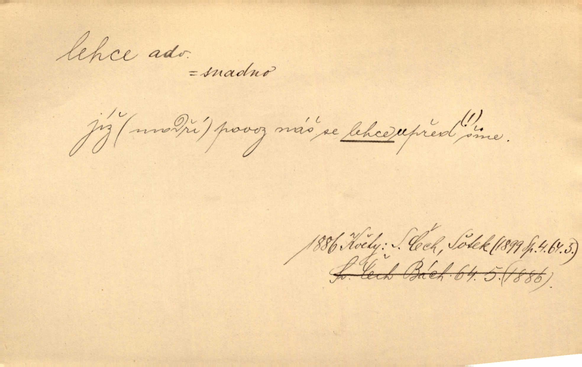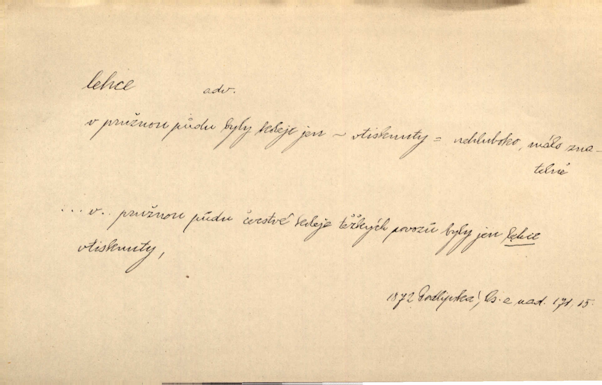 - lehce adv. k lehký, bez projevení tíže, bez velkého zatížení. Položil jí [matce] hlavu lehce na klín. Zey. Pavézníci i lehčeji odění střelci. Jir. Starší, lehce oblečená ženská vklouzla dovnitř v lehkém šatě. Rais. D hbitě, svižně. Šel lehce, a holí švihácky se rozpřáhaje, klátil hoření půlí těla. Rais. Lehce svezla se [kněžna] s koně. Něm. Přišla jako srna lehce. Jir. Přehoupl se lehce přes zábradlí [mostu]. Vach. D lehkomyslně, nerozvážně. „Nechápu, jak může sedlák chodit do hospody každý den, karbanit — opíjet se — lehce žit.“ Baar. „A to [nepříjemnost s hraběnkou] vy tak lehce berete?“ R. Svob. D slabě, málo usilovně, nepatrně, poněkud. Neodpověděl, jenom lehce odkašlal. Rais. Kapitán lehce vykřikl radostí. K. Čap. V pružnou půdu čerstvé koleje těžkých povozů byly jen lehce vtisknuty. Podl. Odstrčila ho, ale zcela lehce. Vach. Věděl, že je raněn, ač jen lehce. Staš. Starší sestra má lehce ochuravěla. Krás. D volně, nepevně. Kabanici přehodil přes ramena a lehce ji přes prsa řemínkem upevnil. Něm. Hlava pokryta je bílým malým šátkem, jehož přední dva konce jen lehce do zadu se zavážou. Něm. D nedůkladně, povrchně, zběžně. Salaše lehce srubené. Něm. Všecko jest tu [ve Vzpomínkách S. K. N.] lehce a ledabyle nahozeno. Lum. Voldan lehce přehlídl svůj zevnějšek v zrcadlech. Hlad. D klidně, bezstarostně. Náhle bylo tak klidno v jeho srdci, bylo mu tak lehce! Zey. Pohovoříme si a bude ti alespoň u srdce lehčeji. Třeb. Bětce po tom psaní bylo lehčeji: jakoby jí mlýnský kámen byl spadl se srdce. Herb. D snadno. Rybář, potěšen, že tak lehce z nouze vyvázl, radoval se z výdělku. Něm. Co se tak člověk na tom venkově nastará! A tam [v městě] se tak lehce vydělává! R. Svob. Lehce nabyl, lehce pozbyl. Přísl. Lehce se boří, ale těžko se staví. Baar.
