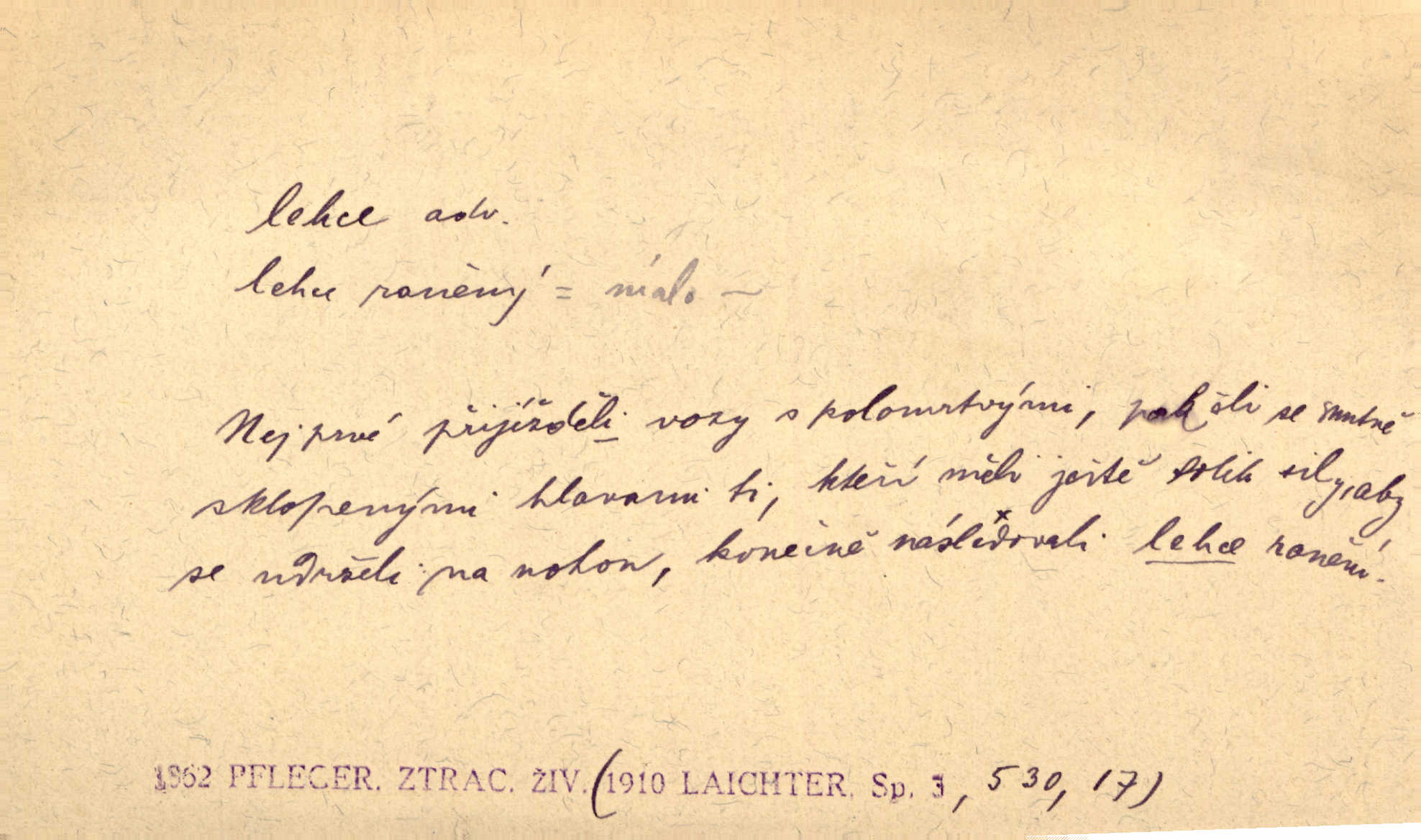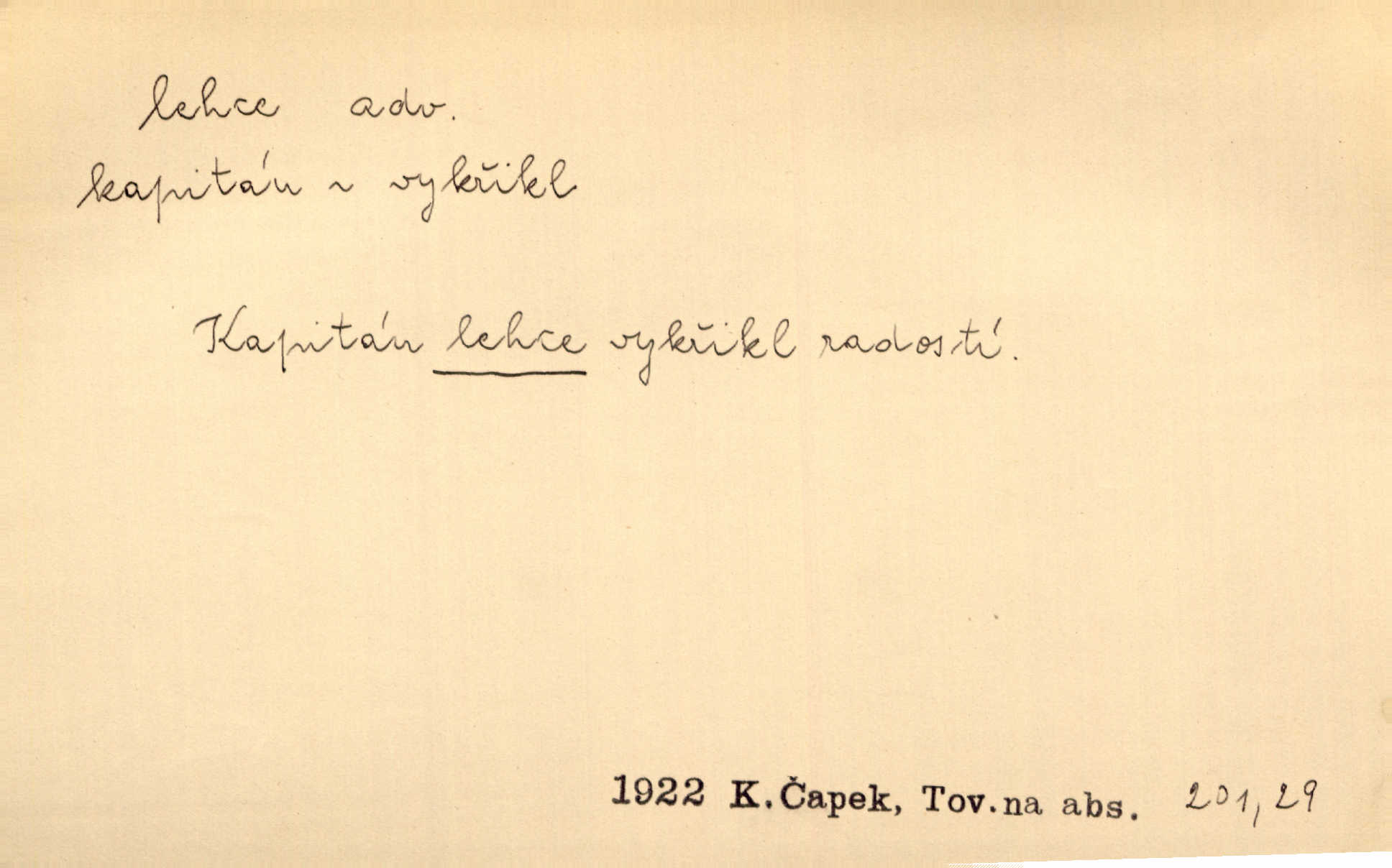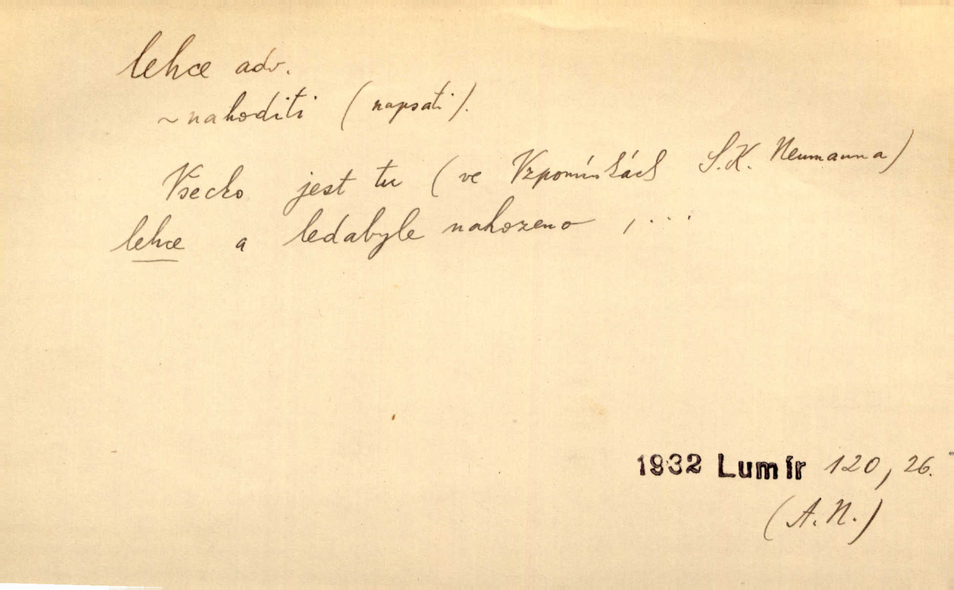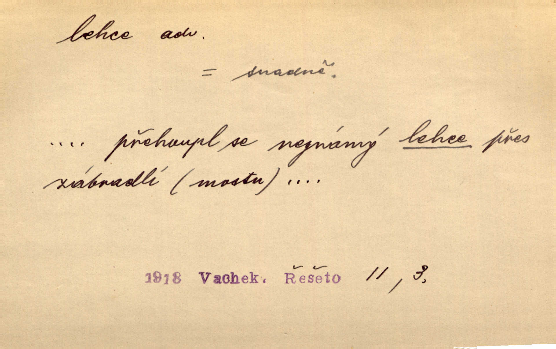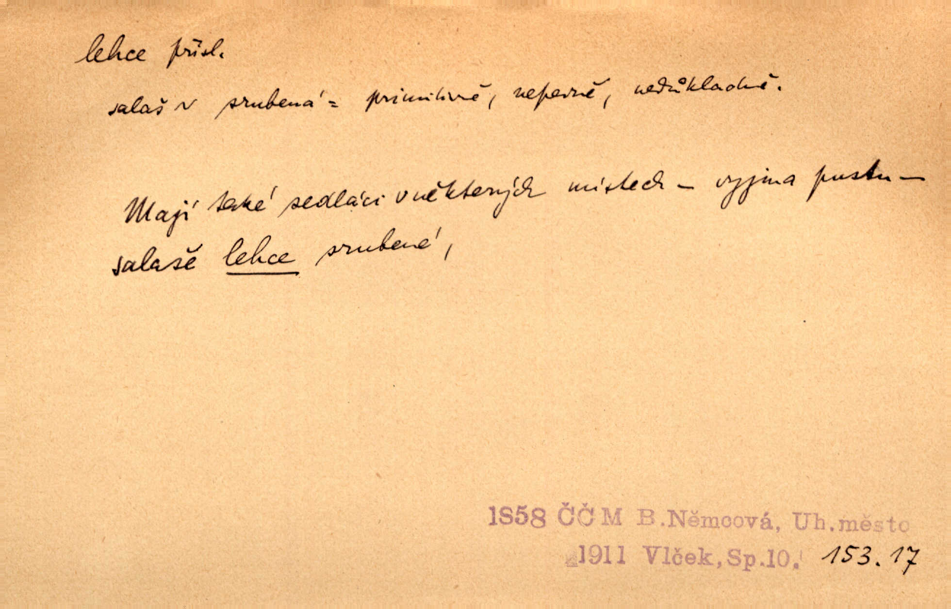 - lehce adv. k lehký, bez projevení tíže, bez velkého zatížení. Položil jí [matce] hlavu lehce na klín. Zey. Pavézníci i lehčeji odění střelci. Jir. Starší, lehce oblečená ženská vklouzla dovnitř v lehkém šatě. Rais. D hbitě, svižně. Šel lehce, a holí švihácky se rozpřáhaje, klátil hoření půlí těla. Rais. Lehce svezla se [kněžna] s koně. Něm. Přišla jako srna lehce. Jir. Přehoupl se lehce přes zábradlí [mostu]. Vach. D lehkomyslně, nerozvážně. „Nechápu, jak může sedlák chodit do hospody každý den, karbanit — opíjet se — lehce žit.“ Baar. „A to [nepříjemnost s hraběnkou] vy tak lehce berete?“ R. Svob. D slabě, málo usilovně, nepatrně, poněkud. Neodpověděl, jenom lehce odkašlal. Rais. Kapitán lehce vykřikl radostí. K. Čap. V pružnou půdu čerstvé koleje těžkých povozů byly jen lehce vtisknuty. Podl. Odstrčila ho, ale zcela lehce. Vach. Věděl, že je raněn, ač jen lehce. Staš. Starší sestra má lehce ochuravěla. Krás. D volně, nepevně. Kabanici přehodil přes ramena a lehce ji přes prsa řemínkem upevnil. Něm. Hlava pokryta je bílým malým šátkem, jehož přední dva konce jen lehce do zadu se zavážou. Něm. D nedůkladně, povrchně, zběžně. Salaše lehce srubené. Něm. Všecko jest tu [ve Vzpomínkách S. K. N.] lehce a ledabyle nahozeno. Lum. Voldan lehce přehlídl svůj zevnějšek v zrcadlech. Hlad. D klidně, bezstarostně. Náhle bylo tak klidno v jeho srdci, bylo mu tak lehce! Zey. Pohovoříme si a bude ti alespoň u srdce lehčeji. Třeb. Bětce po tom psaní bylo lehčeji: jakoby jí mlýnský kámen byl spadl se srdce. Herb. D snadno. Rybář, potěšen, že tak lehce z nouze vyvázl, radoval se z výdělku. Něm. Co se tak člověk na tom venkově nastará! A tam [v městě] se tak lehce vydělává! R. Svob. Lehce nabyl, lehce pozbyl. Přísl. Lehce se boří, ale těžko se staví. Baar.