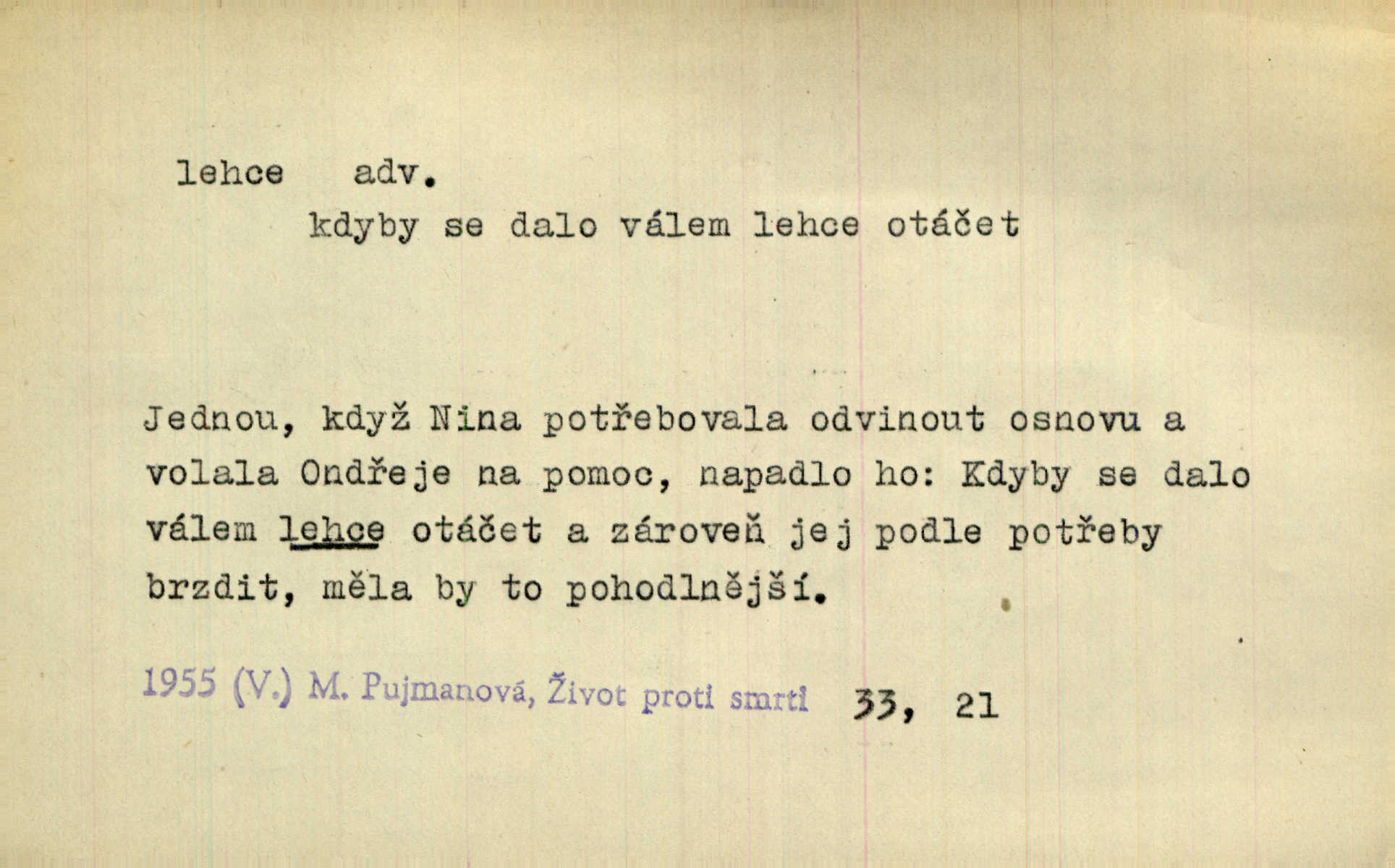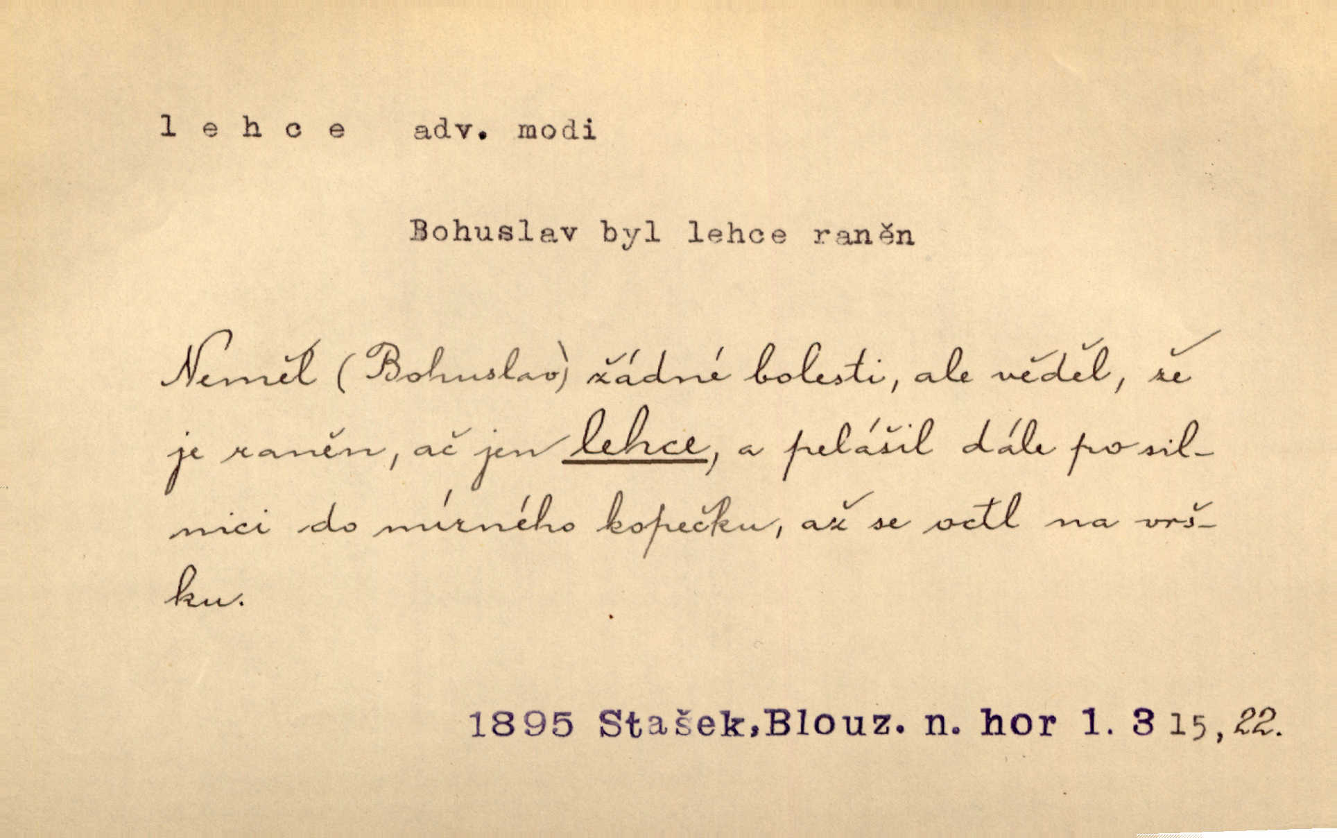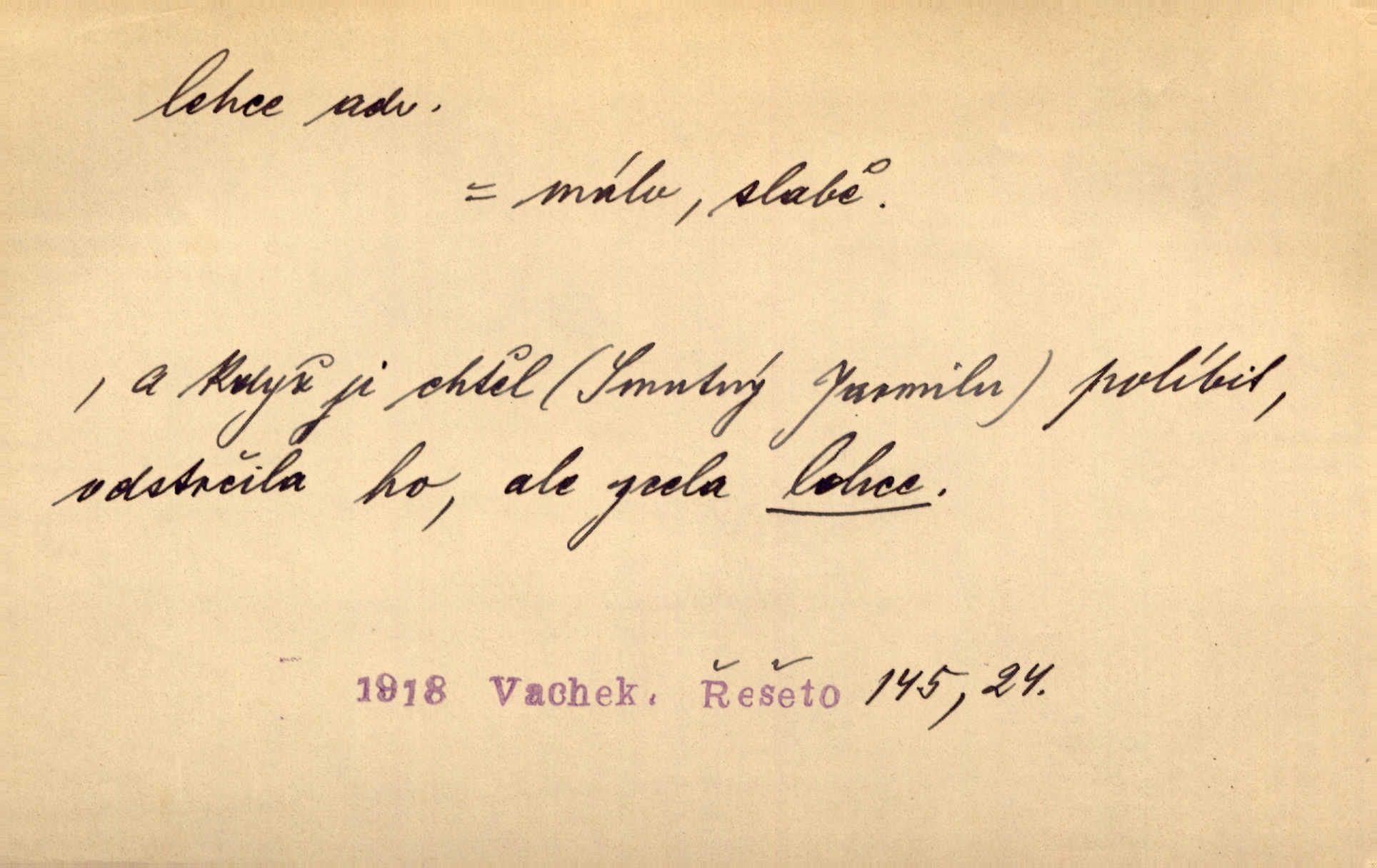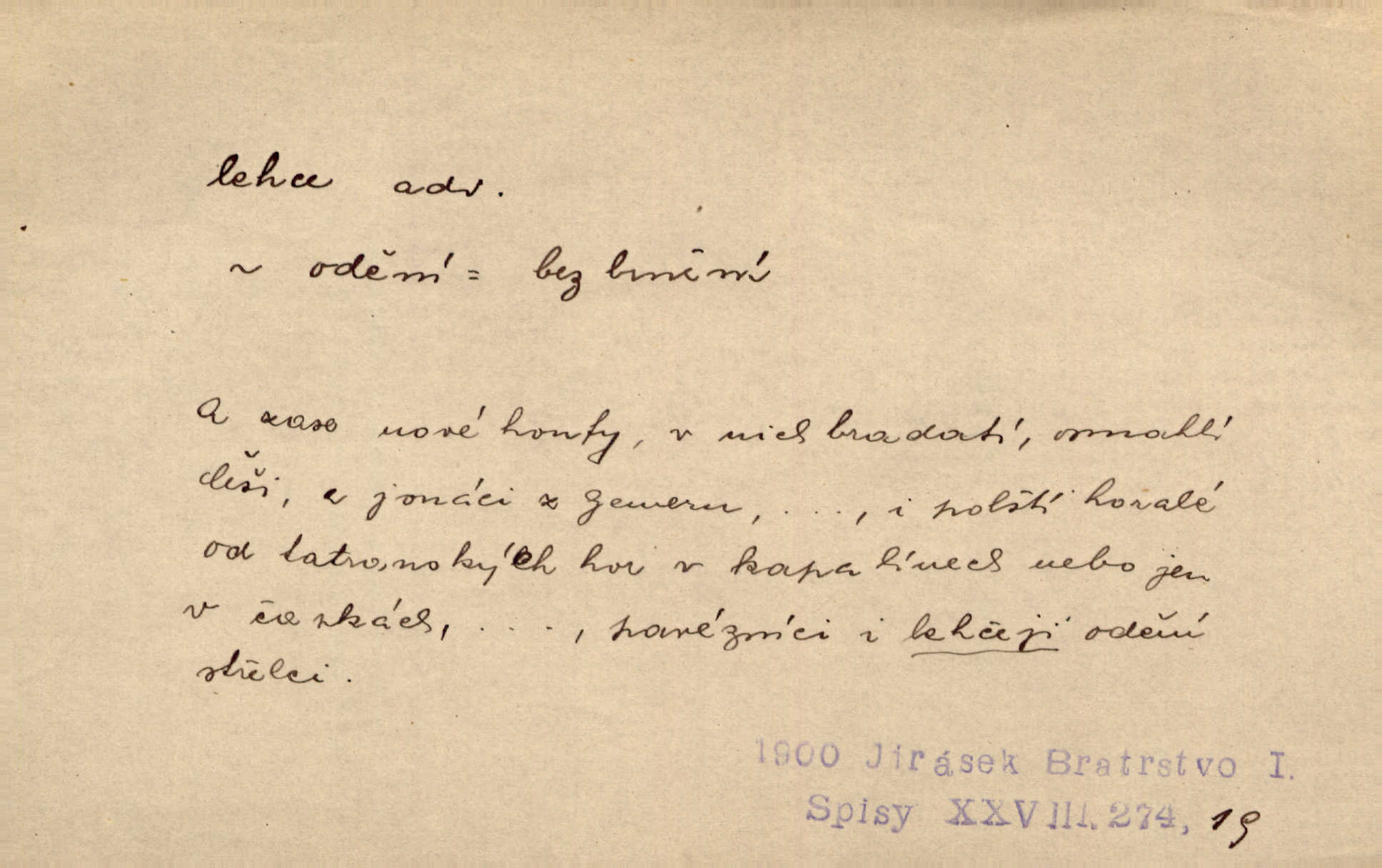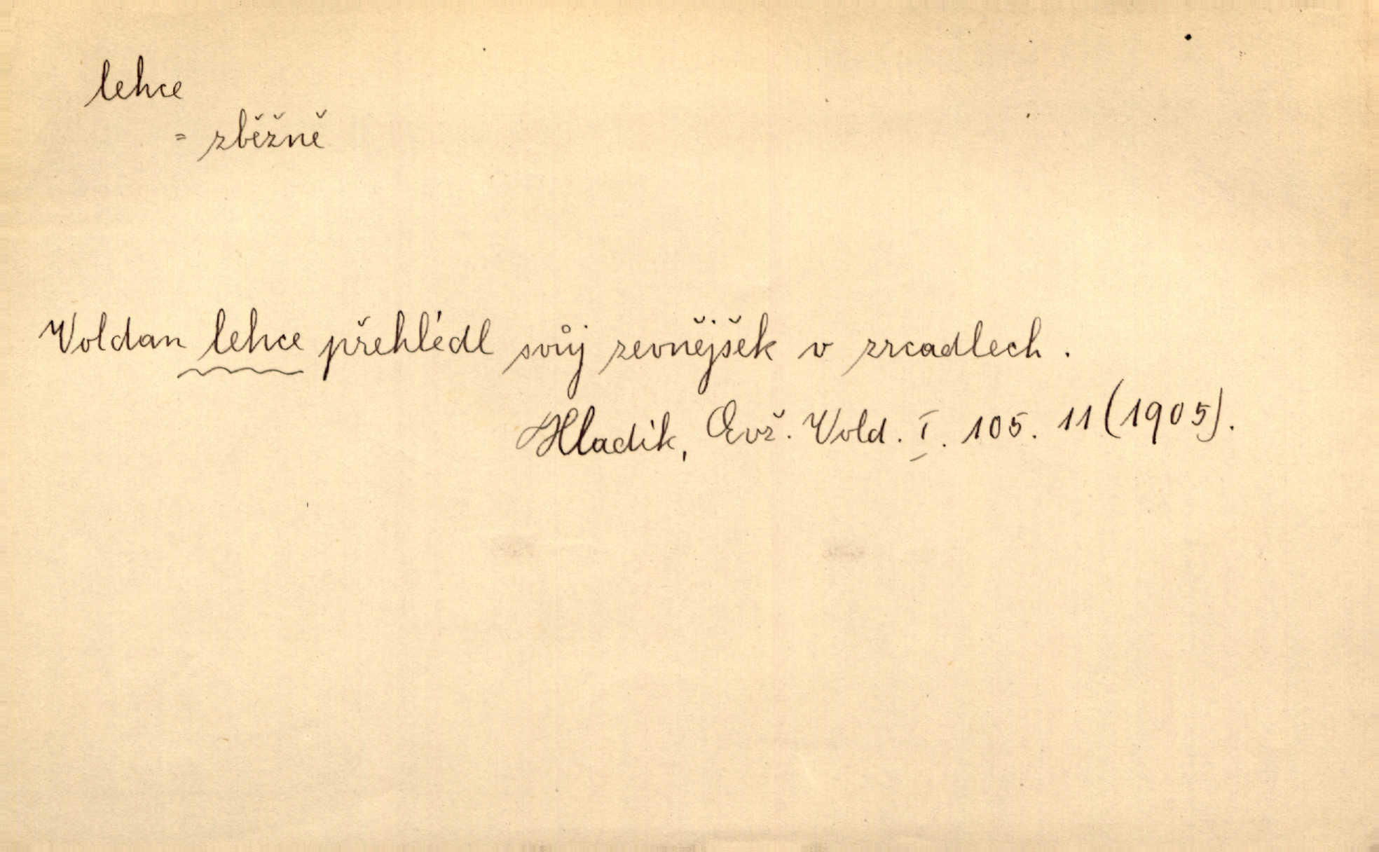 - lehce adv. k lehký, bez projevení tíže, bez velkého zatížení. Položil jí [matce] hlavu lehce na klín. Zey. Pavézníci i lehčeji odění střelci. Jir. Starší, lehce oblečená ženská vklouzla dovnitř v lehkém šatě. Rais. D hbitě, svižně. Šel lehce, a holí švihácky se rozpřáhaje, klátil hoření půlí těla. Rais. Lehce svezla se [kněžna] s koně. Něm. Přišla jako srna lehce. Jir. Přehoupl se lehce přes zábradlí [mostu]. Vach. D lehkomyslně, nerozvážně. „Nechápu, jak může sedlák chodit do hospody každý den, karbanit — opíjet se — lehce žit.“ Baar. „A to [nepříjemnost s hraběnkou] vy tak lehce berete?“ R. Svob. D slabě, málo usilovně, nepatrně, poněkud. Neodpověděl, jenom lehce odkašlal. Rais. Kapitán lehce vykřikl radostí. K. Čap. V pružnou půdu čerstvé koleje těžkých povozů byly jen lehce vtisknuty. Podl. Odstrčila ho, ale zcela lehce. Vach. Věděl, že je raněn, ač jen lehce. Staš. Starší sestra má lehce ochuravěla. Krás. D volně, nepevně. Kabanici přehodil přes ramena a lehce ji přes prsa řemínkem upevnil. Něm. Hlava pokryta je bílým malým šátkem, jehož přední dva konce jen lehce do zadu se zavážou. Něm. D nedůkladně, povrchně, zběžně. Salaše lehce srubené. Něm. Všecko jest tu [ve Vzpomínkách S. K. N.] lehce a ledabyle nahozeno. Lum. Voldan lehce přehlídl svůj zevnějšek v zrcadlech. Hlad. D klidně, bezstarostně. Náhle bylo tak klidno v jeho srdci, bylo mu tak lehce! Zey. Pohovoříme si a bude ti alespoň u srdce lehčeji. Třeb. Bětce po tom psaní bylo lehčeji: jakoby jí mlýnský kámen byl spadl se srdce. Herb. D snadno. Rybář, potěšen, že tak lehce z nouze vyvázl, radoval se z výdělku. Něm. Co se tak člověk na tom venkově nastará! A tam [v městě] se tak lehce vydělává! R. Svob. Lehce nabyl, lehce pozbyl. Přísl. Lehce se boří, ale těžko se staví. Baar.
