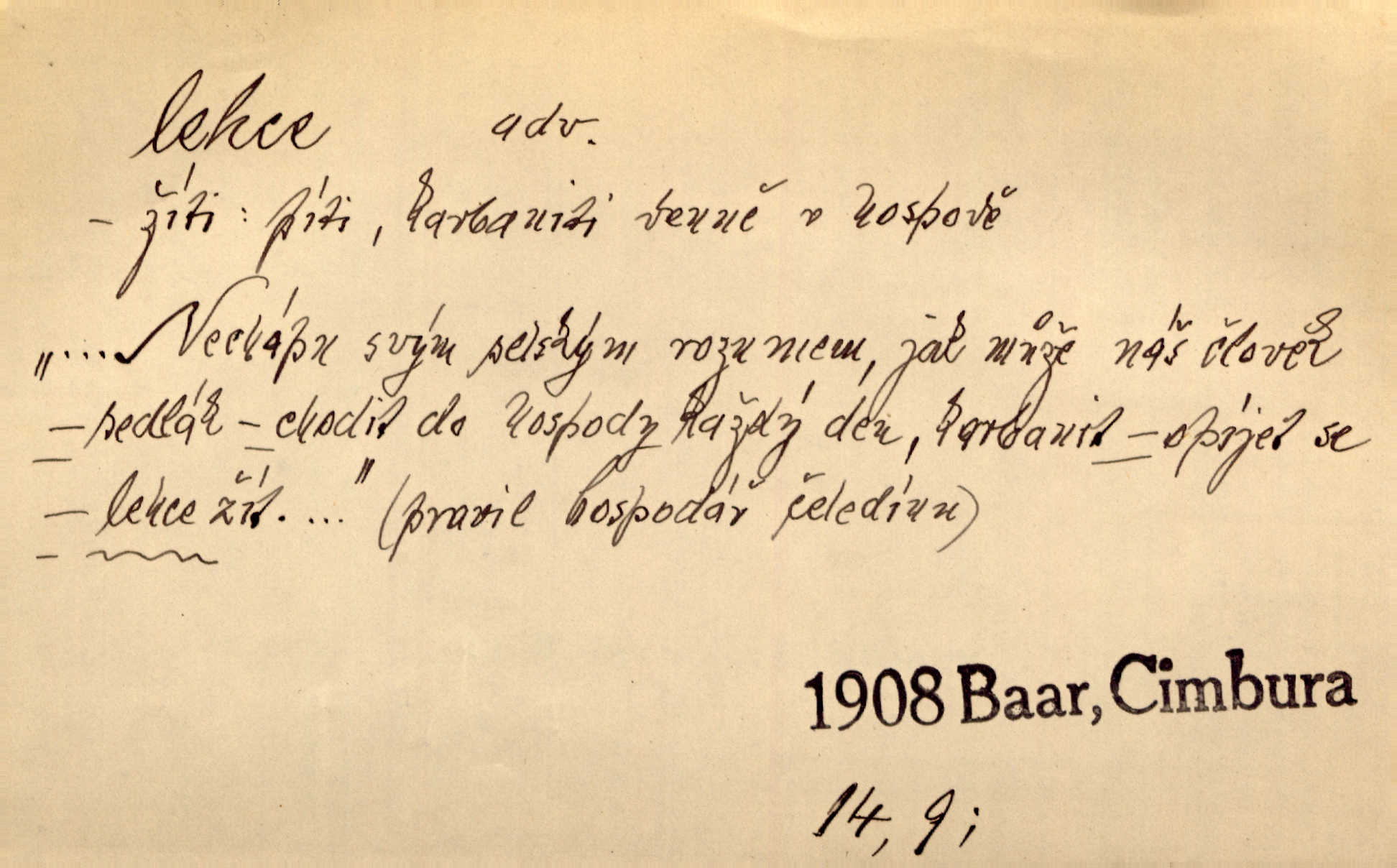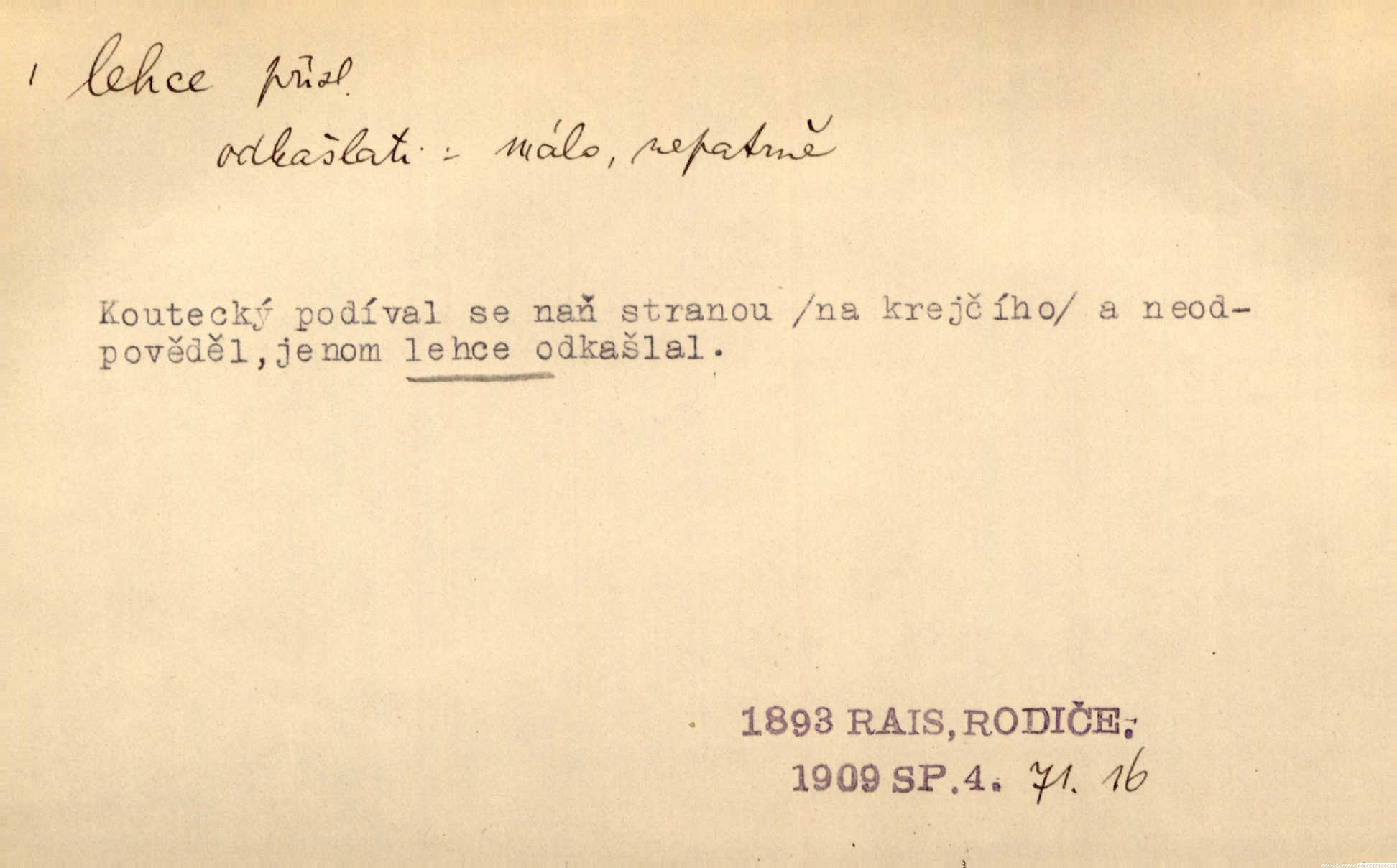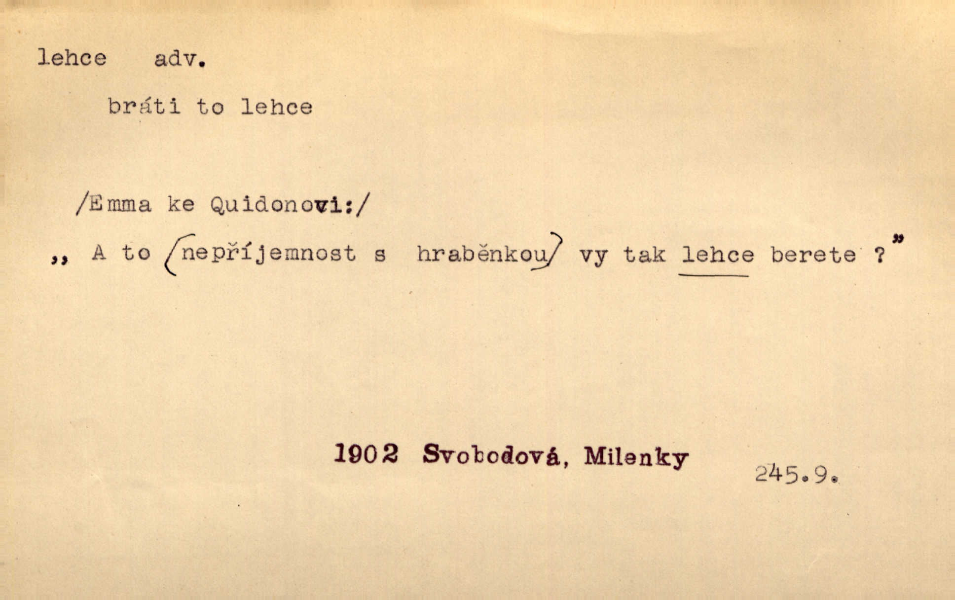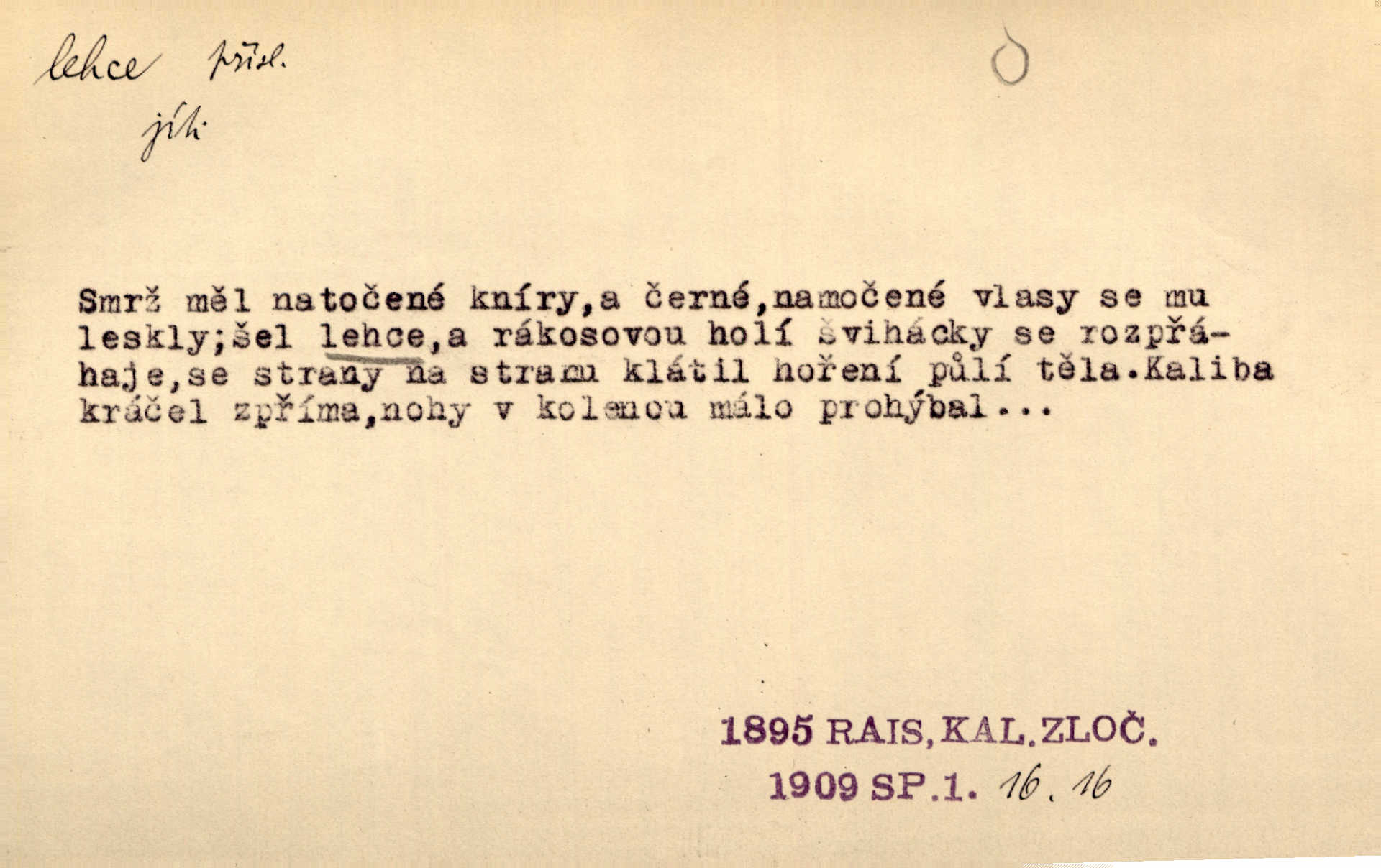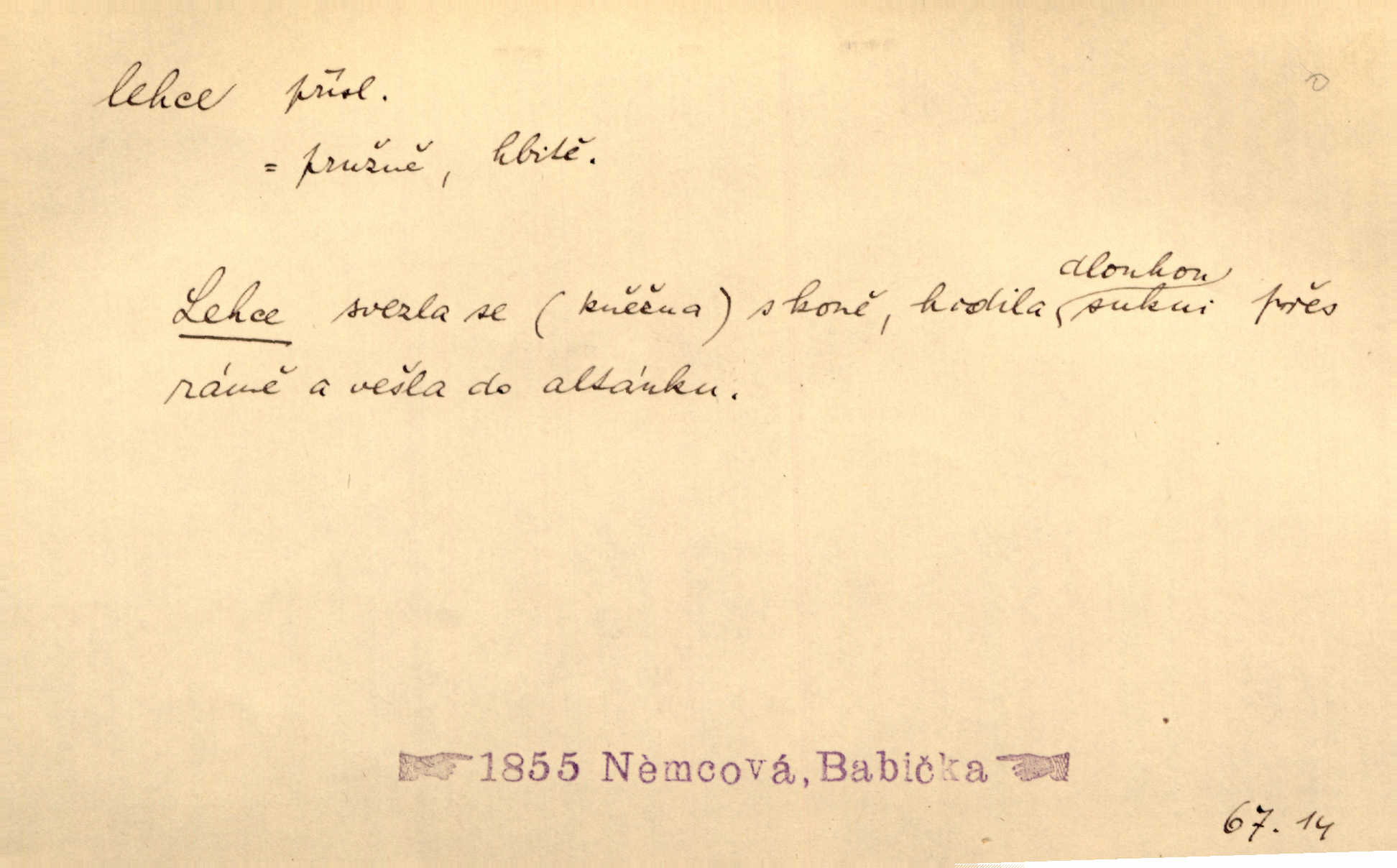 - lehce adv. k lehký, bez projevení tíže, bez velkého zatížení. Položil jí [matce] hlavu lehce na klín. Zey. Pavézníci i lehčeji odění střelci. Jir. Starší, lehce oblečená ženská vklouzla dovnitř v lehkém šatě. Rais. D hbitě, svižně. Šel lehce, a holí švihácky se rozpřáhaje, klátil hoření půlí těla. Rais. Lehce svezla se [kněžna] s koně. Něm. Přišla jako srna lehce. Jir. Přehoupl se lehce přes zábradlí [mostu]. Vach. D lehkomyslně, nerozvážně. „Nechápu, jak může sedlák chodit do hospody každý den, karbanit — opíjet se — lehce žit.“ Baar. „A to [nepříjemnost s hraběnkou] vy tak lehce berete?“ R. Svob. D slabě, málo usilovně, nepatrně, poněkud. Neodpověděl, jenom lehce odkašlal. Rais. Kapitán lehce vykřikl radostí. K. Čap. V pružnou půdu čerstvé koleje těžkých povozů byly jen lehce vtisknuty. Podl. Odstrčila ho, ale zcela lehce. Vach. Věděl, že je raněn, ač jen lehce. Staš. Starší sestra má lehce ochuravěla. Krás. D volně, nepevně. Kabanici přehodil přes ramena a lehce ji přes prsa řemínkem upevnil. Něm. Hlava pokryta je bílým malým šátkem, jehož přední dva konce jen lehce do zadu se zavážou. Něm. D nedůkladně, povrchně, zběžně. Salaše lehce srubené. Něm. Všecko jest tu [ve Vzpomínkách S. K. N.] lehce a ledabyle nahozeno. Lum. Voldan lehce přehlídl svůj zevnějšek v zrcadlech. Hlad. D klidně, bezstarostně. Náhle bylo tak klidno v jeho srdci, bylo mu tak lehce! Zey. Pohovoříme si a bude ti alespoň u srdce lehčeji. Třeb. Bětce po tom psaní bylo lehčeji: jakoby jí mlýnský kámen byl spadl se srdce. Herb. D snadno. Rybář, potěšen, že tak lehce z nouze vyvázl, radoval se z výdělku. Něm. Co se tak člověk na tom venkově nastará! A tam [v městě] se tak lehce vydělává! R. Svob. Lehce nabyl, lehce pozbyl. Přísl. Lehce se boří, ale těžko se staví. Baar.
