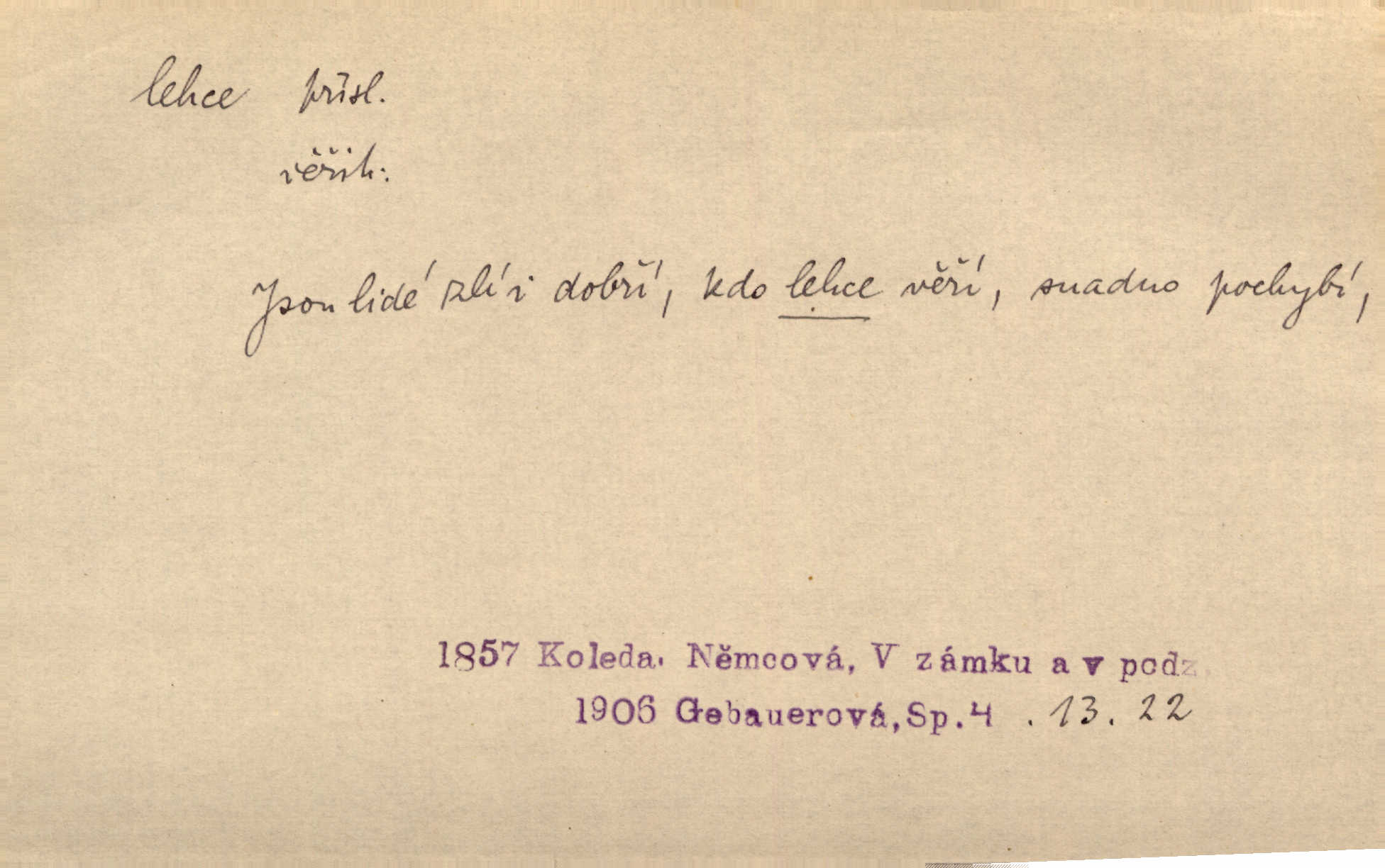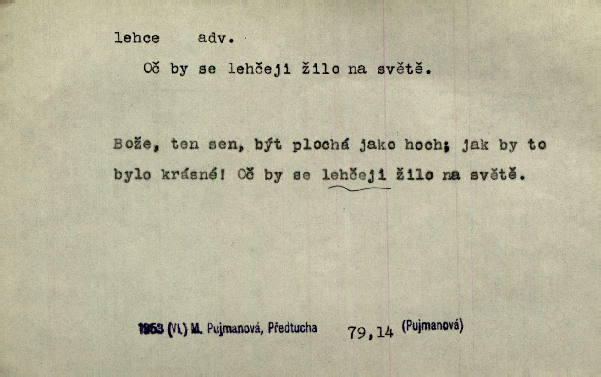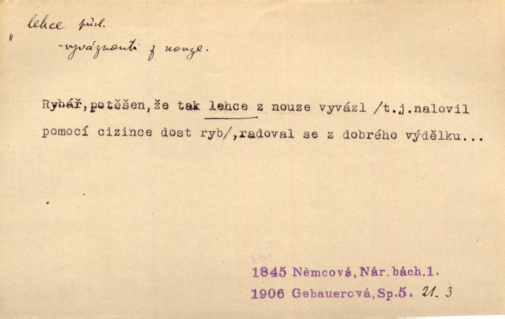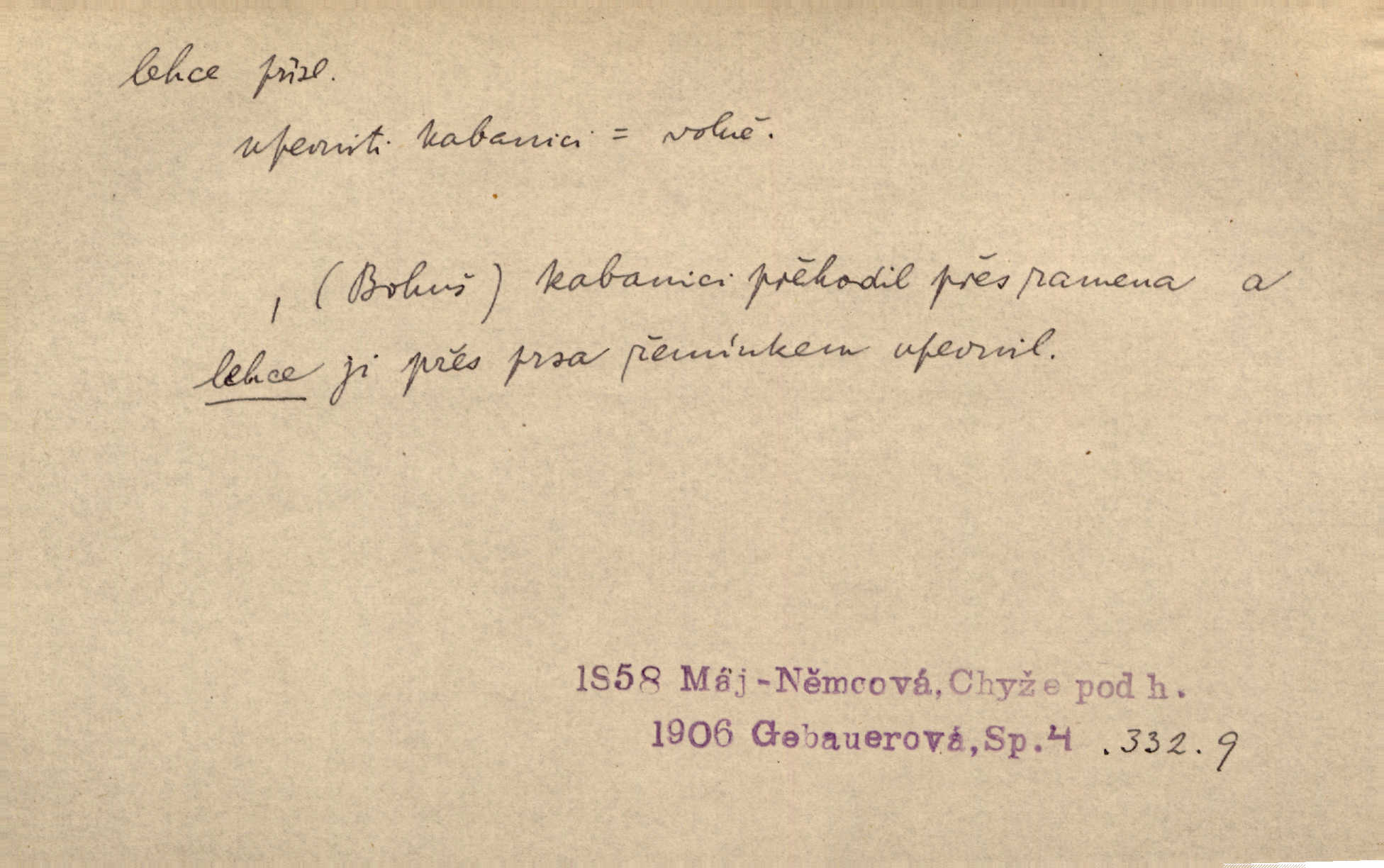 - lehce adv. k lehký, bez projevení tíže, bez velkého zatížení. Položil jí [matce] hlavu lehce na klín. Zey. Pavézníci i lehčeji odění střelci. Jir. Starší, lehce oblečená ženská vklouzla dovnitř v lehkém šatě. Rais. D hbitě, svižně. Šel lehce, a holí švihácky se rozpřáhaje, klátil hoření půlí těla. Rais. Lehce svezla se [kněžna] s koně. Něm. Přišla jako srna lehce. Jir. Přehoupl se lehce přes zábradlí [mostu]. Vach. D lehkomyslně, nerozvážně. „Nechápu, jak může sedlák chodit do hospody každý den, karbanit — opíjet se — lehce žit.“ Baar. „A to [nepříjemnost s hraběnkou] vy tak lehce berete?“ R. Svob. D slabě, málo usilovně, nepatrně, poněkud. Neodpověděl, jenom lehce odkašlal. Rais. Kapitán lehce vykřikl radostí. K. Čap. V pružnou půdu čerstvé koleje těžkých povozů byly jen lehce vtisknuty. Podl. Odstrčila ho, ale zcela lehce. Vach. Věděl, že je raněn, ač jen lehce. Staš. Starší sestra má lehce ochuravěla. Krás. D volně, nepevně. Kabanici přehodil přes ramena a lehce ji přes prsa řemínkem upevnil. Něm. Hlava pokryta je bílým malým šátkem, jehož přední dva konce jen lehce do zadu se zavážou. Něm. D nedůkladně, povrchně, zběžně. Salaše lehce srubené. Něm. Všecko jest tu [ve Vzpomínkách S. K. N.] lehce a ledabyle nahozeno. Lum. Voldan lehce přehlídl svůj zevnějšek v zrcadlech. Hlad. D klidně, bezstarostně. Náhle bylo tak klidno v jeho srdci, bylo mu tak lehce! Zey. Pohovoříme si a bude ti alespoň u srdce lehčeji. Třeb. Bětce po tom psaní bylo lehčeji: jakoby jí mlýnský kámen byl spadl se srdce. Herb. D snadno. Rybář, potěšen, že tak lehce z nouze vyvázl, radoval se z výdělku. Něm. Co se tak člověk na tom venkově nastará! A tam [v městě] se tak lehce vydělává! R. Svob. Lehce nabyl, lehce pozbyl. Přísl. Lehce se boří, ale těžko se staví. Baar.