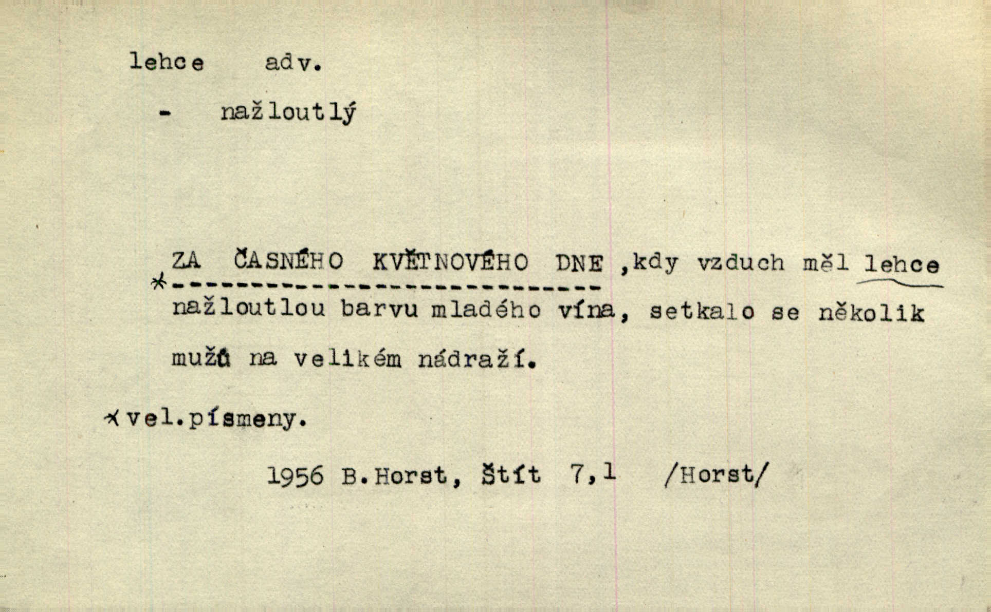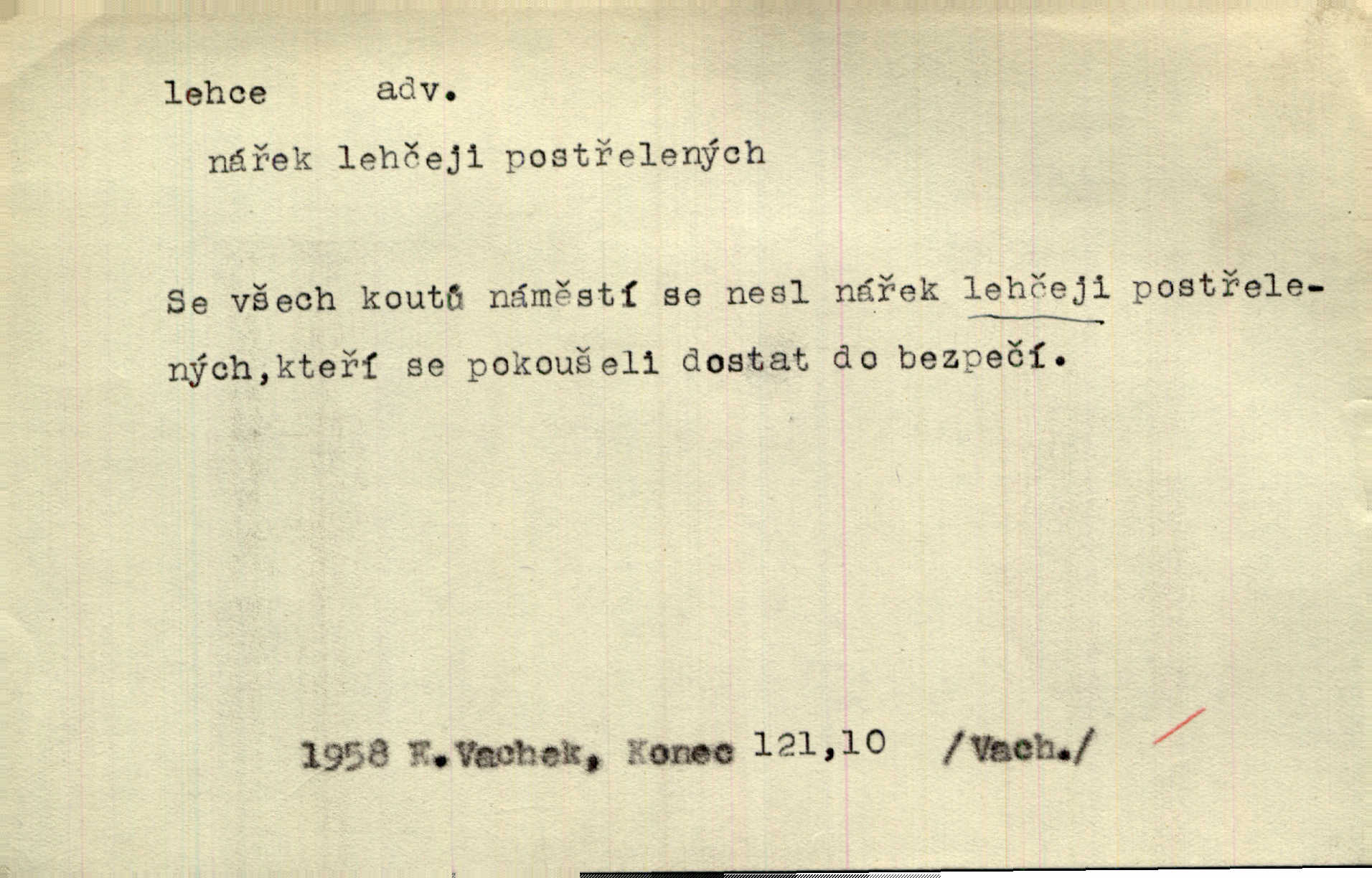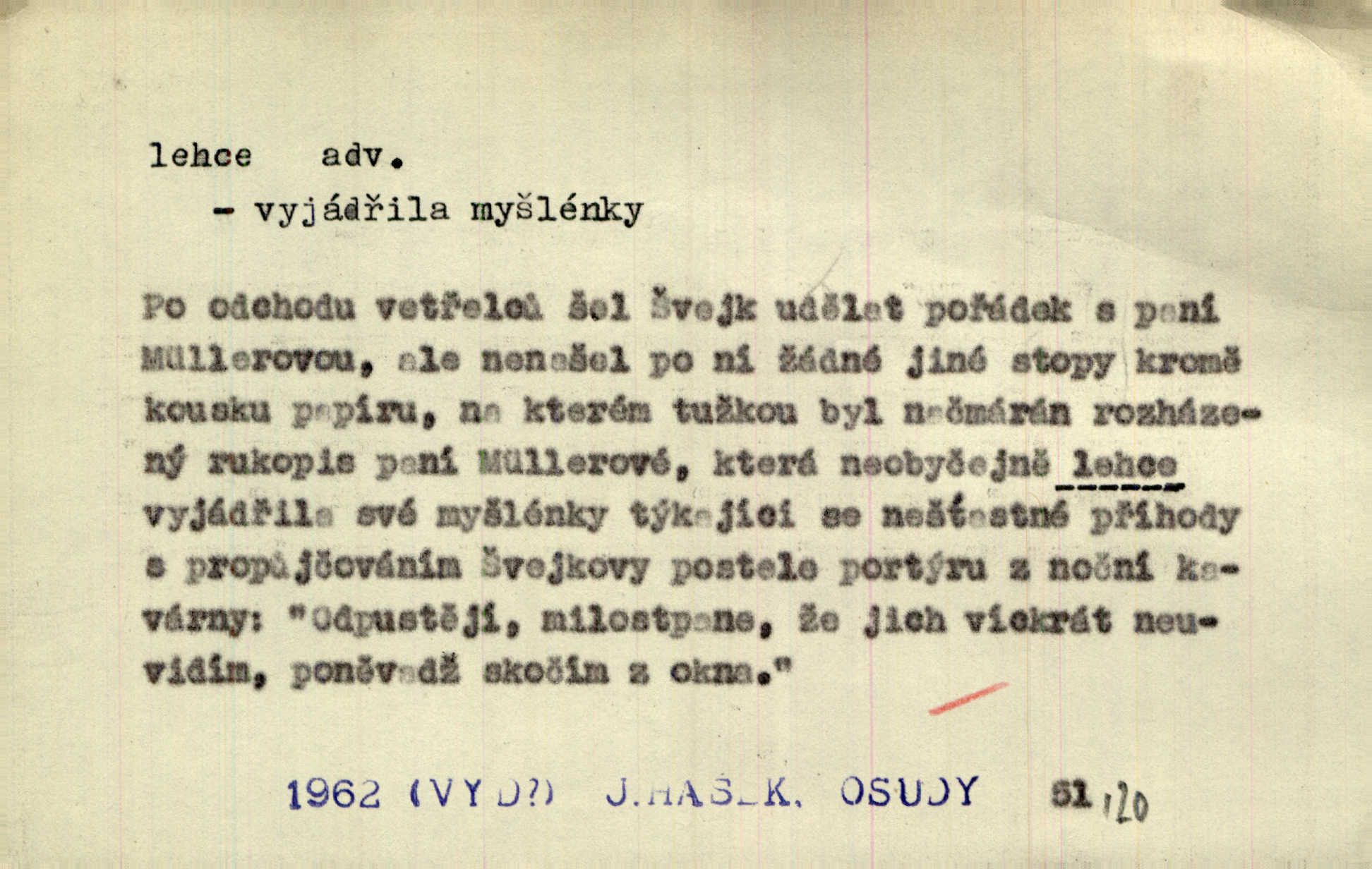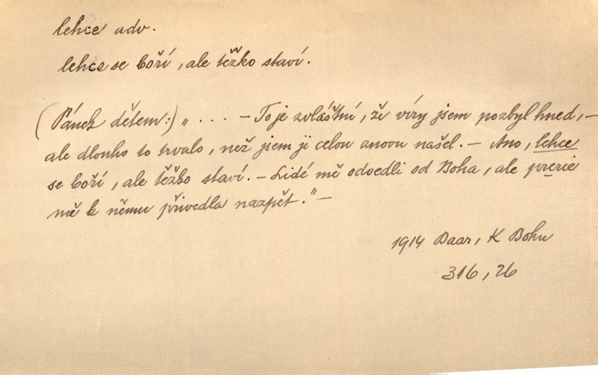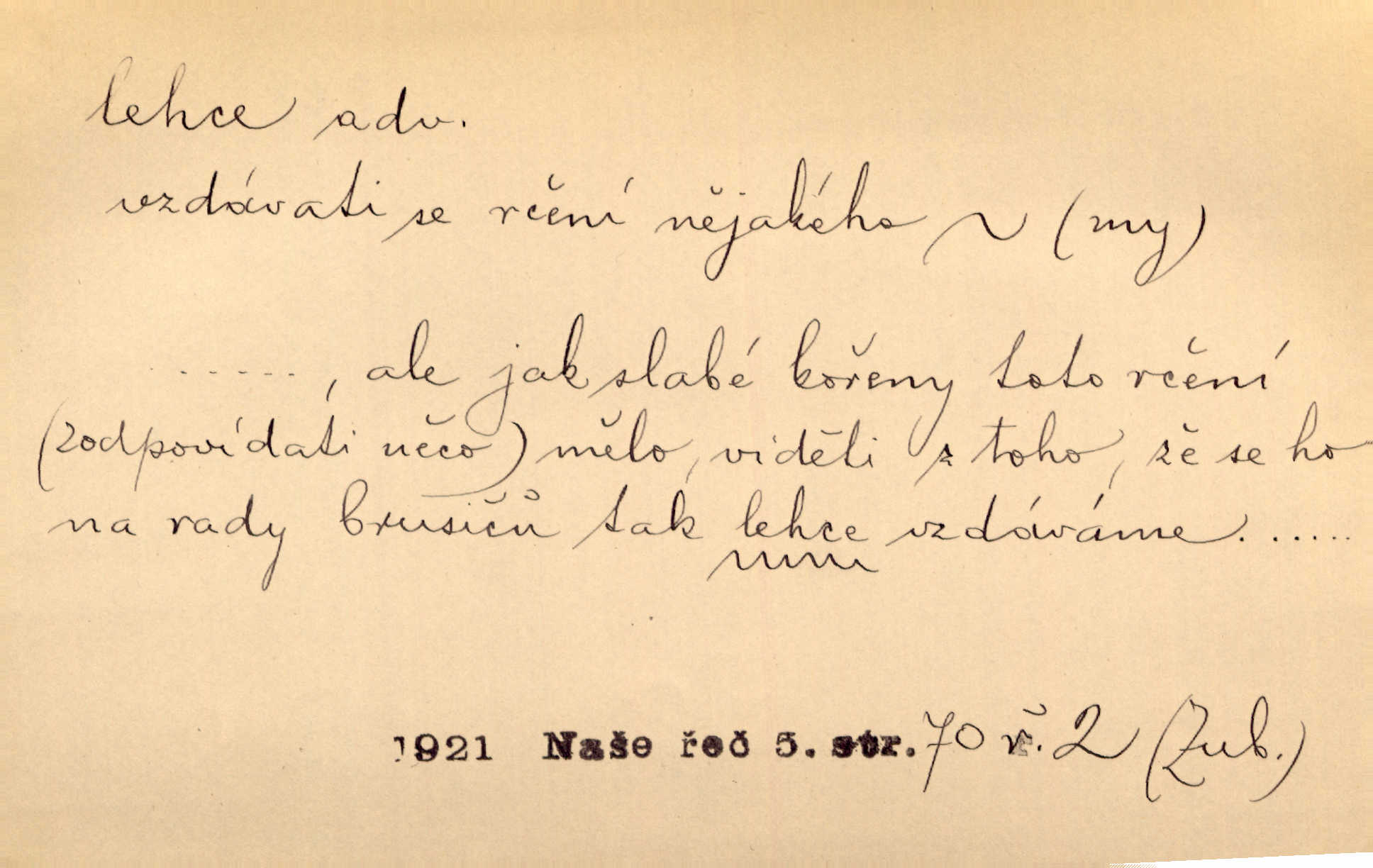 - lehce adv. k lehký, bez projevení tíže, bez velkého zatížení. Položil jí [matce] hlavu lehce na klín. Zey. Pavézníci i lehčeji odění střelci. Jir. Starší, lehce oblečená ženská vklouzla dovnitř v lehkém šatě. Rais. D hbitě, svižně. Šel lehce, a holí švihácky se rozpřáhaje, klátil hoření půlí těla. Rais. Lehce svezla se [kněžna] s koně. Něm. Přišla jako srna lehce. Jir. Přehoupl se lehce přes zábradlí [mostu]. Vach. D lehkomyslně, nerozvážně. „Nechápu, jak může sedlák chodit do hospody každý den, karbanit — opíjet se — lehce žit.“ Baar. „A to [nepříjemnost s hraběnkou] vy tak lehce berete?“ R. Svob. D slabě, málo usilovně, nepatrně, poněkud. Neodpověděl, jenom lehce odkašlal. Rais. Kapitán lehce vykřikl radostí. K. Čap. V pružnou půdu čerstvé koleje těžkých povozů byly jen lehce vtisknuty. Podl. Odstrčila ho, ale zcela lehce. Vach. Věděl, že je raněn, ač jen lehce. Staš. Starší sestra má lehce ochuravěla. Krás. D volně, nepevně. Kabanici přehodil přes ramena a lehce ji přes prsa řemínkem upevnil. Něm. Hlava pokryta je bílým malým šátkem, jehož přední dva konce jen lehce do zadu se zavážou. Něm. D nedůkladně, povrchně, zběžně. Salaše lehce srubené. Něm. Všecko jest tu [ve Vzpomínkách S. K. N.] lehce a ledabyle nahozeno. Lum. Voldan lehce přehlídl svůj zevnějšek v zrcadlech. Hlad. D klidně, bezstarostně. Náhle bylo tak klidno v jeho srdci, bylo mu tak lehce! Zey. Pohovoříme si a bude ti alespoň u srdce lehčeji. Třeb. Bětce po tom psaní bylo lehčeji: jakoby jí mlýnský kámen byl spadl se srdce. Herb. D snadno. Rybář, potěšen, že tak lehce z nouze vyvázl, radoval se z výdělku. Něm. Co se tak člověk na tom venkově nastará! A tam [v městě] se tak lehce vydělává! R. Svob. Lehce nabyl, lehce pozbyl. Přísl. Lehce se boří, ale těžko se staví. Baar.