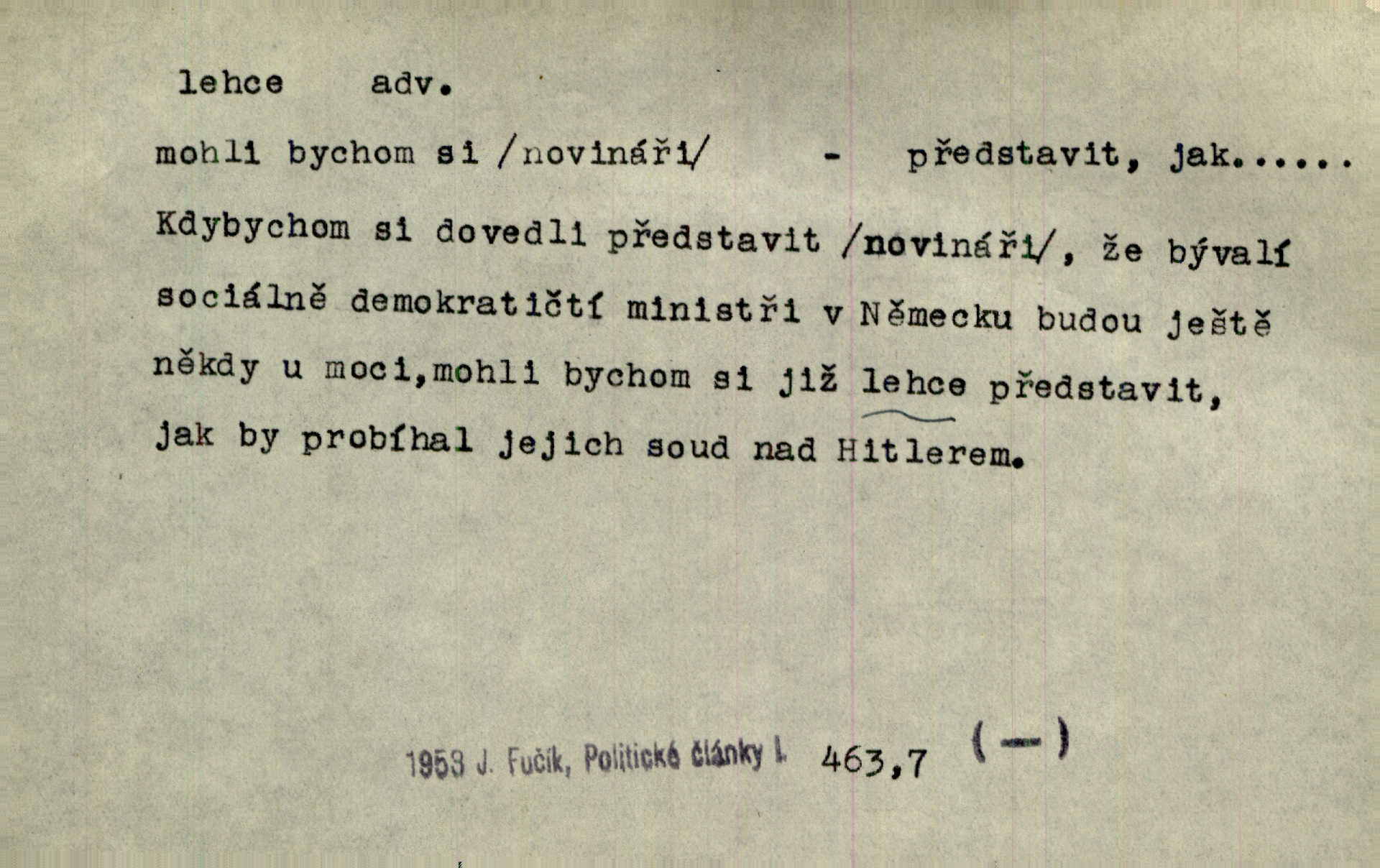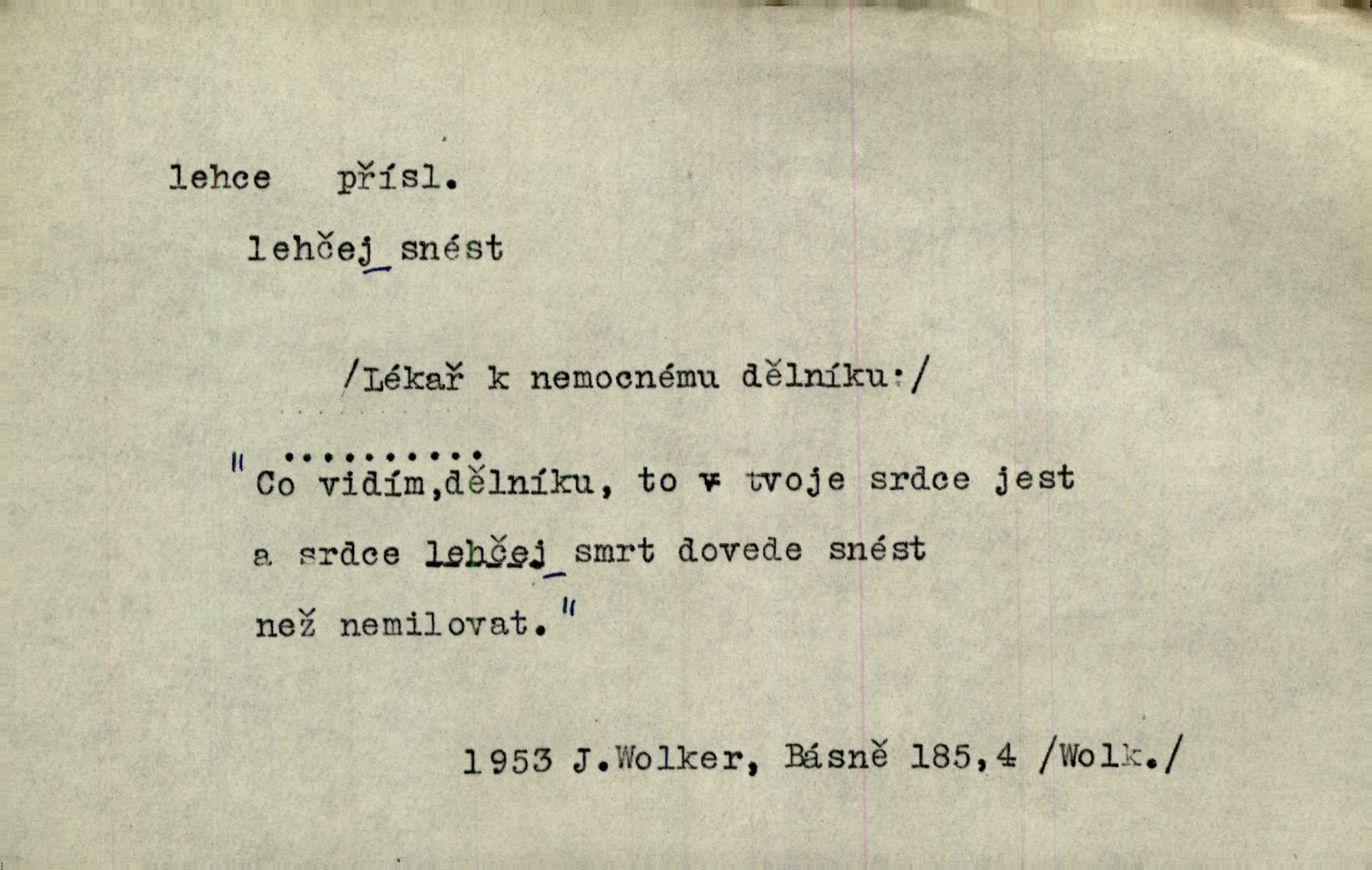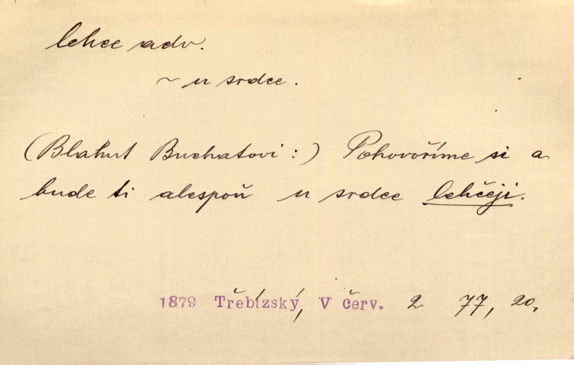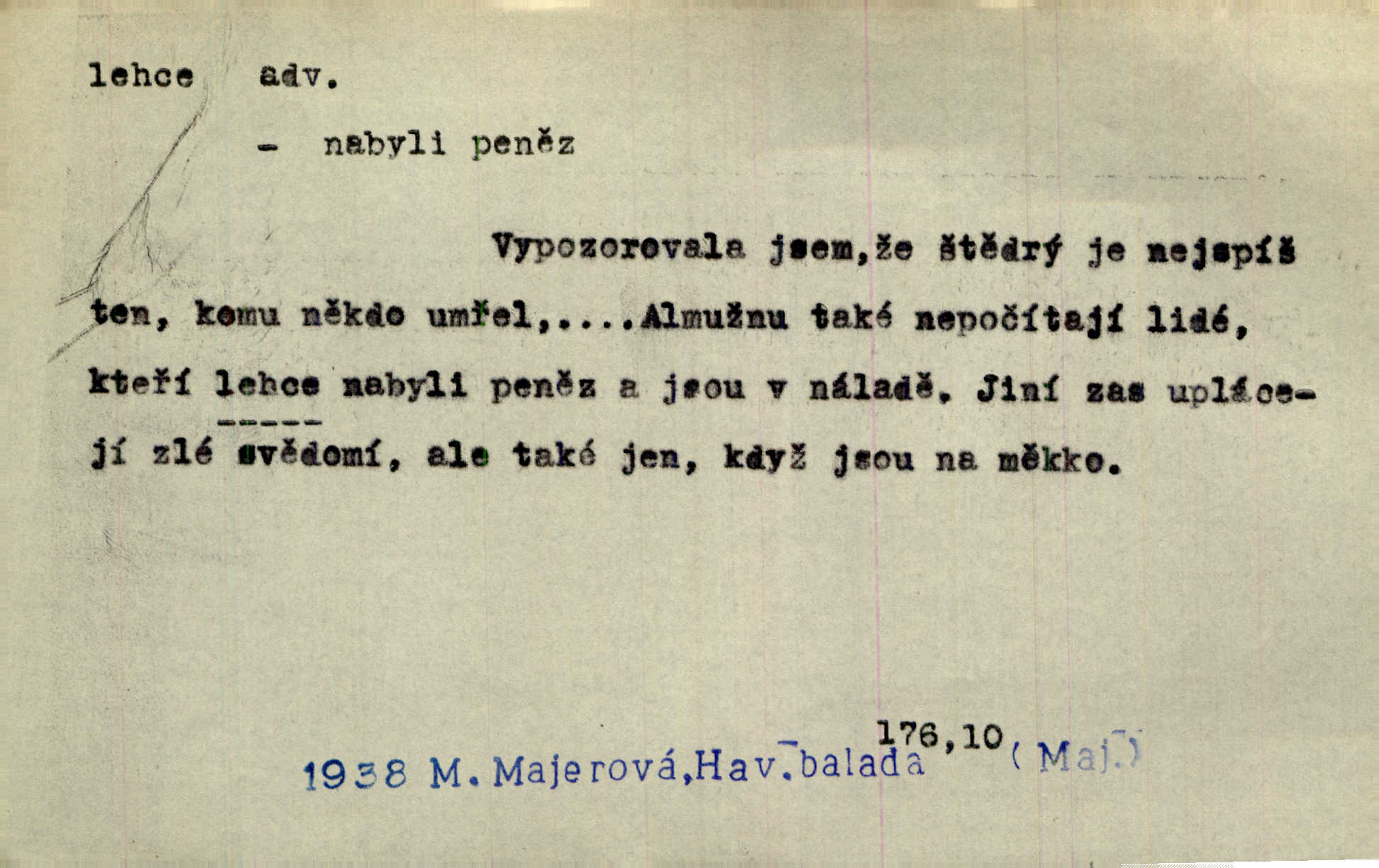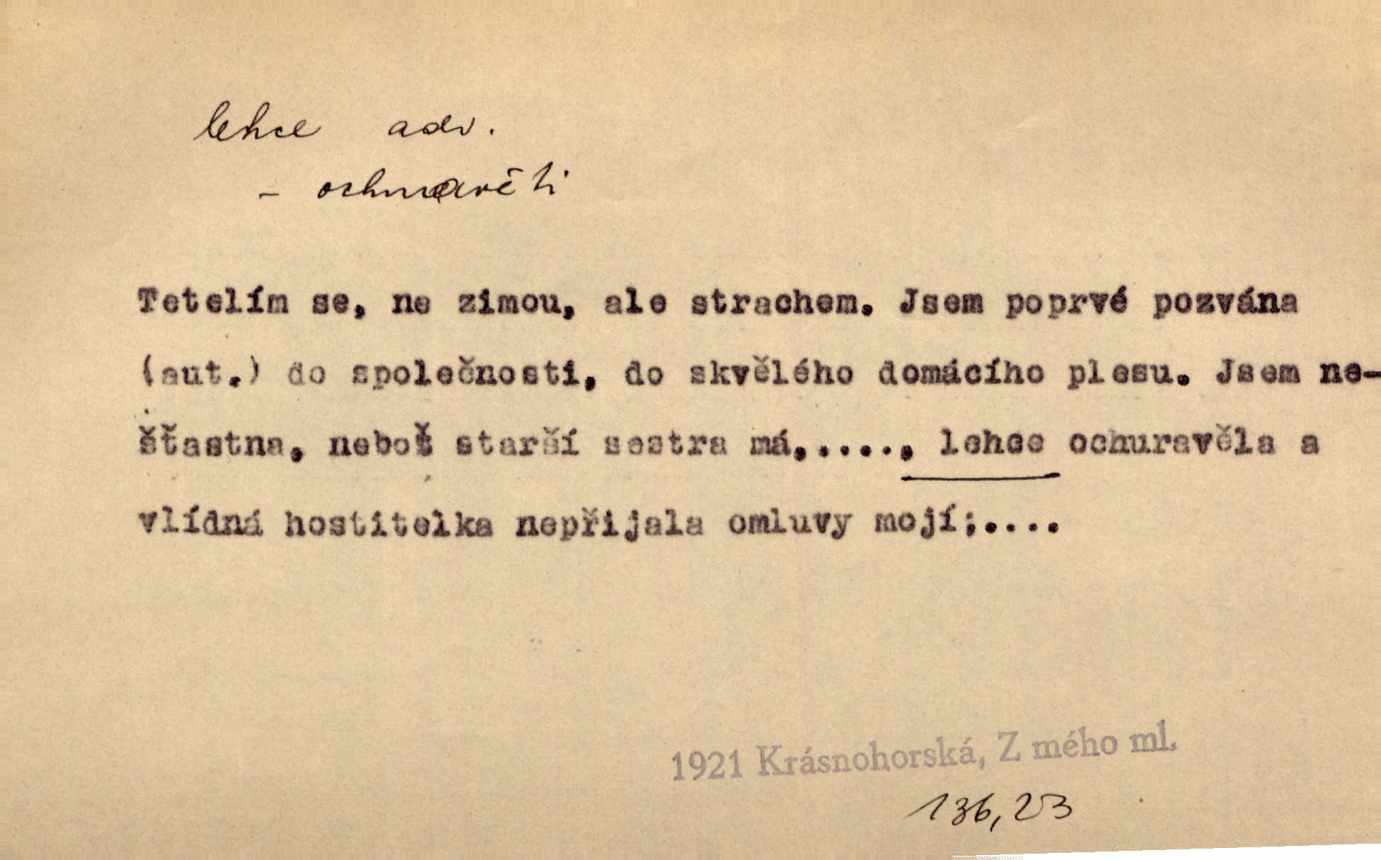 - lehce adv. k lehký, bez projevení tíže, bez velkého zatížení. Položil jí [matce] hlavu lehce na klín. Zey. Pavézníci i lehčeji odění střelci. Jir. Starší, lehce oblečená ženská vklouzla dovnitř v lehkém šatě. Rais. D hbitě, svižně. Šel lehce, a holí švihácky se rozpřáhaje, klátil hoření půlí těla. Rais. Lehce svezla se [kněžna] s koně. Něm. Přišla jako srna lehce. Jir. Přehoupl se lehce přes zábradlí [mostu]. Vach. D lehkomyslně, nerozvážně. „Nechápu, jak může sedlák chodit do hospody každý den, karbanit — opíjet se — lehce žit.“ Baar. „A to [nepříjemnost s hraběnkou] vy tak lehce berete?“ R. Svob. D slabě, málo usilovně, nepatrně, poněkud. Neodpověděl, jenom lehce odkašlal. Rais. Kapitán lehce vykřikl radostí. K. Čap. V pružnou půdu čerstvé koleje těžkých povozů byly jen lehce vtisknuty. Podl. Odstrčila ho, ale zcela lehce. Vach. Věděl, že je raněn, ač jen lehce. Staš. Starší sestra má lehce ochuravěla. Krás. D volně, nepevně. Kabanici přehodil přes ramena a lehce ji přes prsa řemínkem upevnil. Něm. Hlava pokryta je bílým malým šátkem, jehož přední dva konce jen lehce do zadu se zavážou. Něm. D nedůkladně, povrchně, zběžně. Salaše lehce srubené. Něm. Všecko jest tu [ve Vzpomínkách S. K. N.] lehce a ledabyle nahozeno. Lum. Voldan lehce přehlídl svůj zevnějšek v zrcadlech. Hlad. D klidně, bezstarostně. Náhle bylo tak klidno v jeho srdci, bylo mu tak lehce! Zey. Pohovoříme si a bude ti alespoň u srdce lehčeji. Třeb. Bětce po tom psaní bylo lehčeji: jakoby jí mlýnský kámen byl spadl se srdce. Herb. D snadno. Rybář, potěšen, že tak lehce z nouze vyvázl, radoval se z výdělku. Něm. Co se tak člověk na tom venkově nastará! A tam [v městě] se tak lehce vydělává! R. Svob. Lehce nabyl, lehce pozbyl. Přísl. Lehce se boří, ale těžko se staví. Baar.