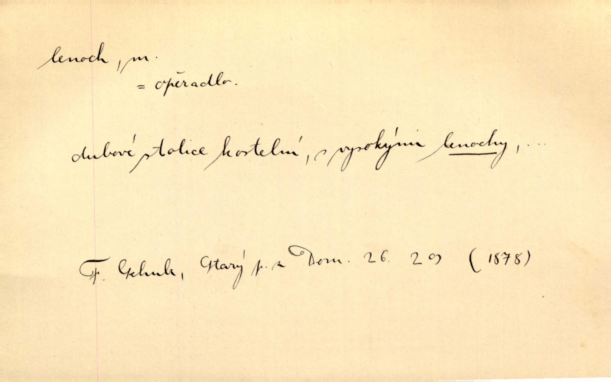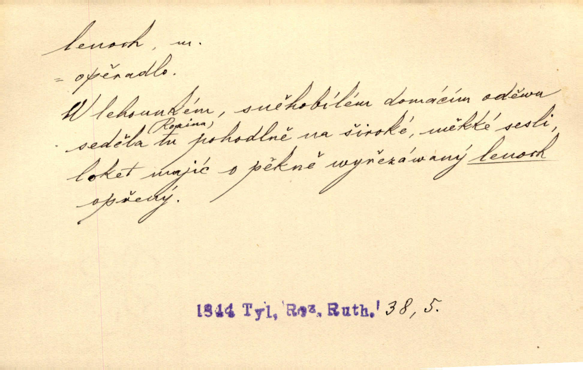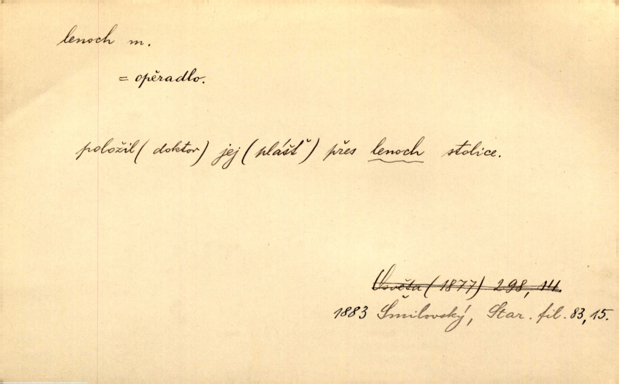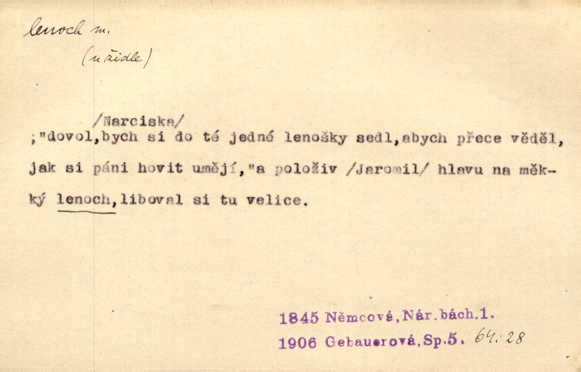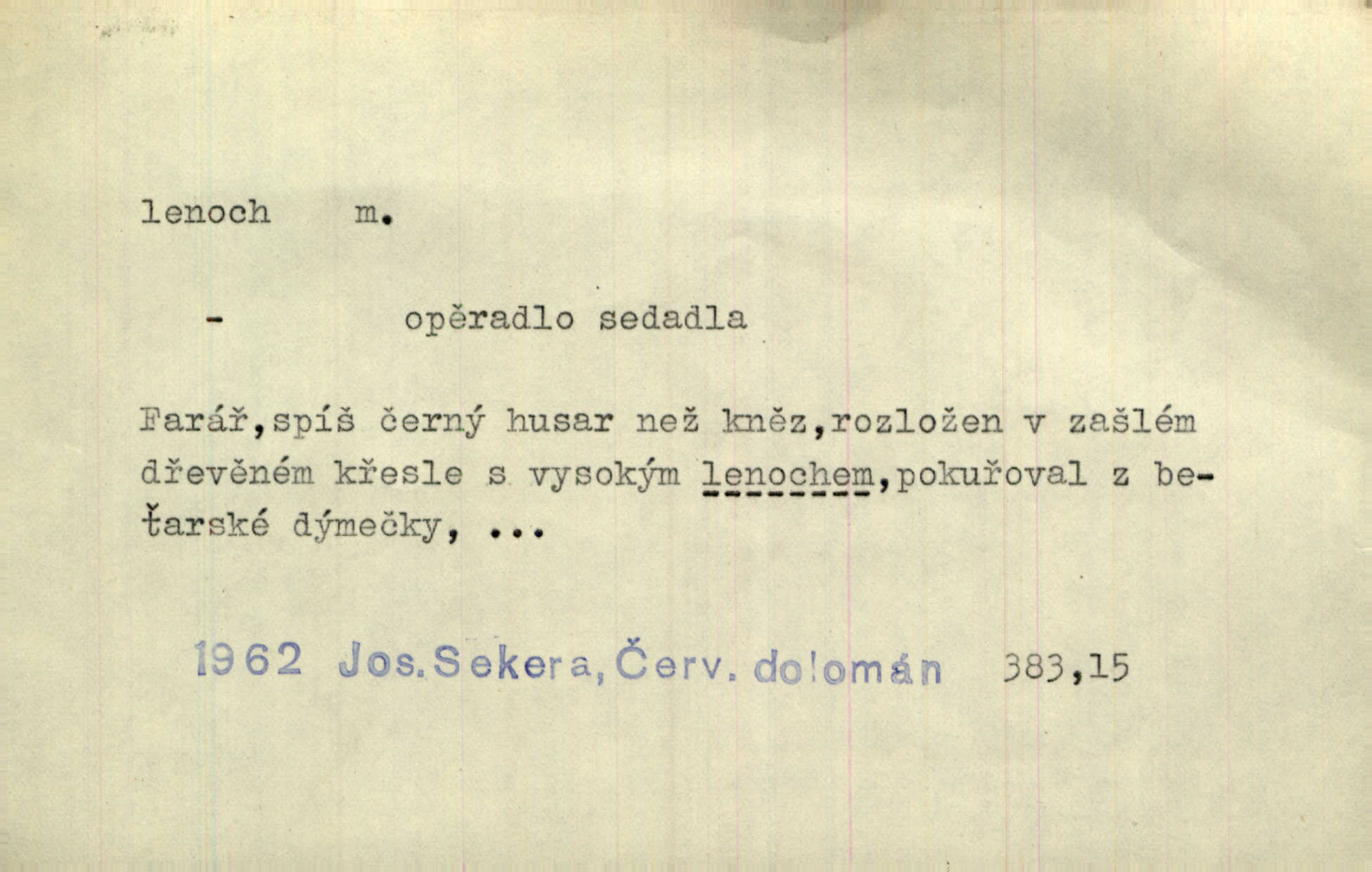 - lenoch, -u m. opěradlo sedadla. Farář bubnoval prsty do lenochu židle. Vach. D linkovaná papírová podložka. Průsvitnou koží byla mu znát žebra jako lenoch papírem. Čap. Ch.