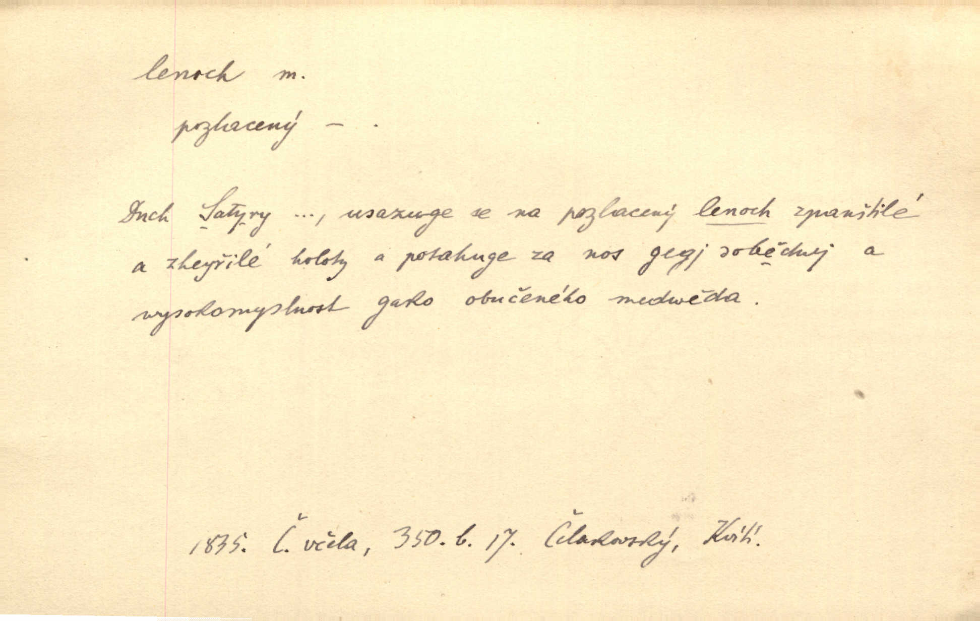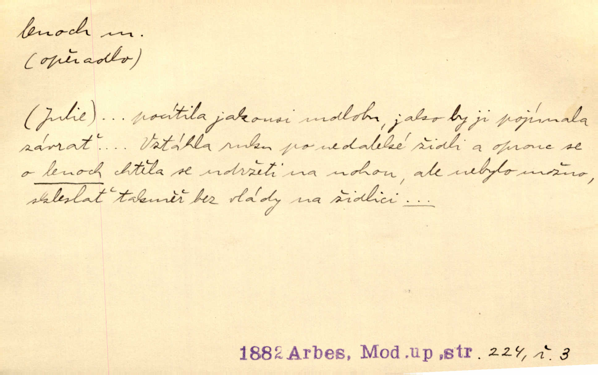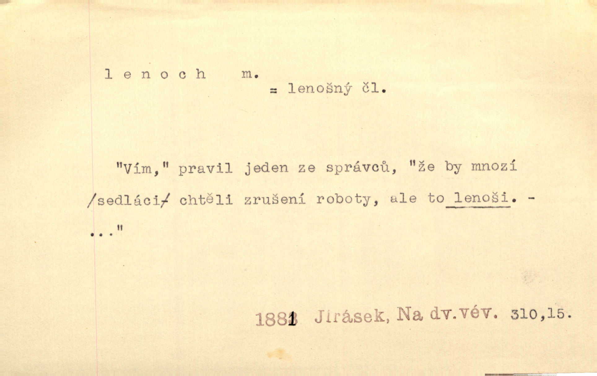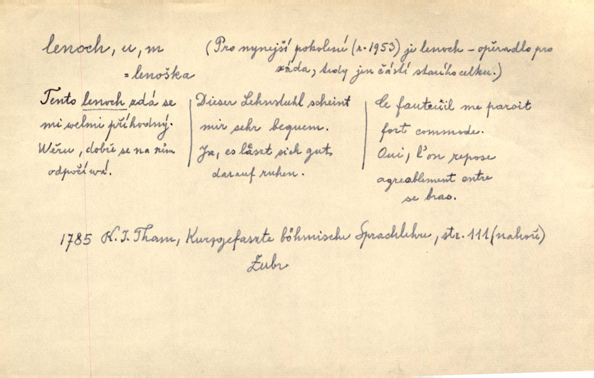 - lenoch, -u m. opěradlo sedadla. Farář bubnoval prsty do lenochu židle. Vach. D linkovaná papírová podložka. Průsvitnou koží byla mu znát žebra jako lenoch papírem. Čap. Ch.