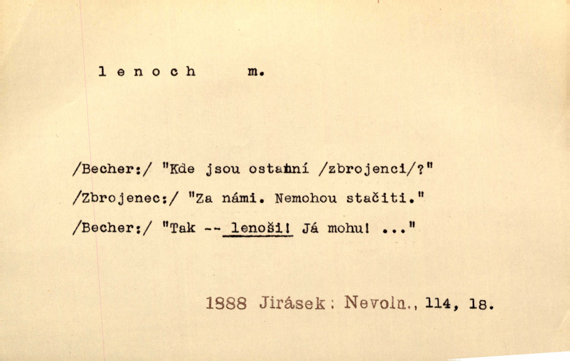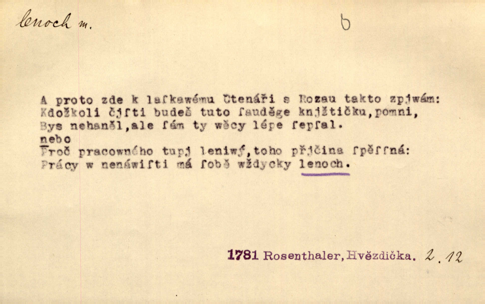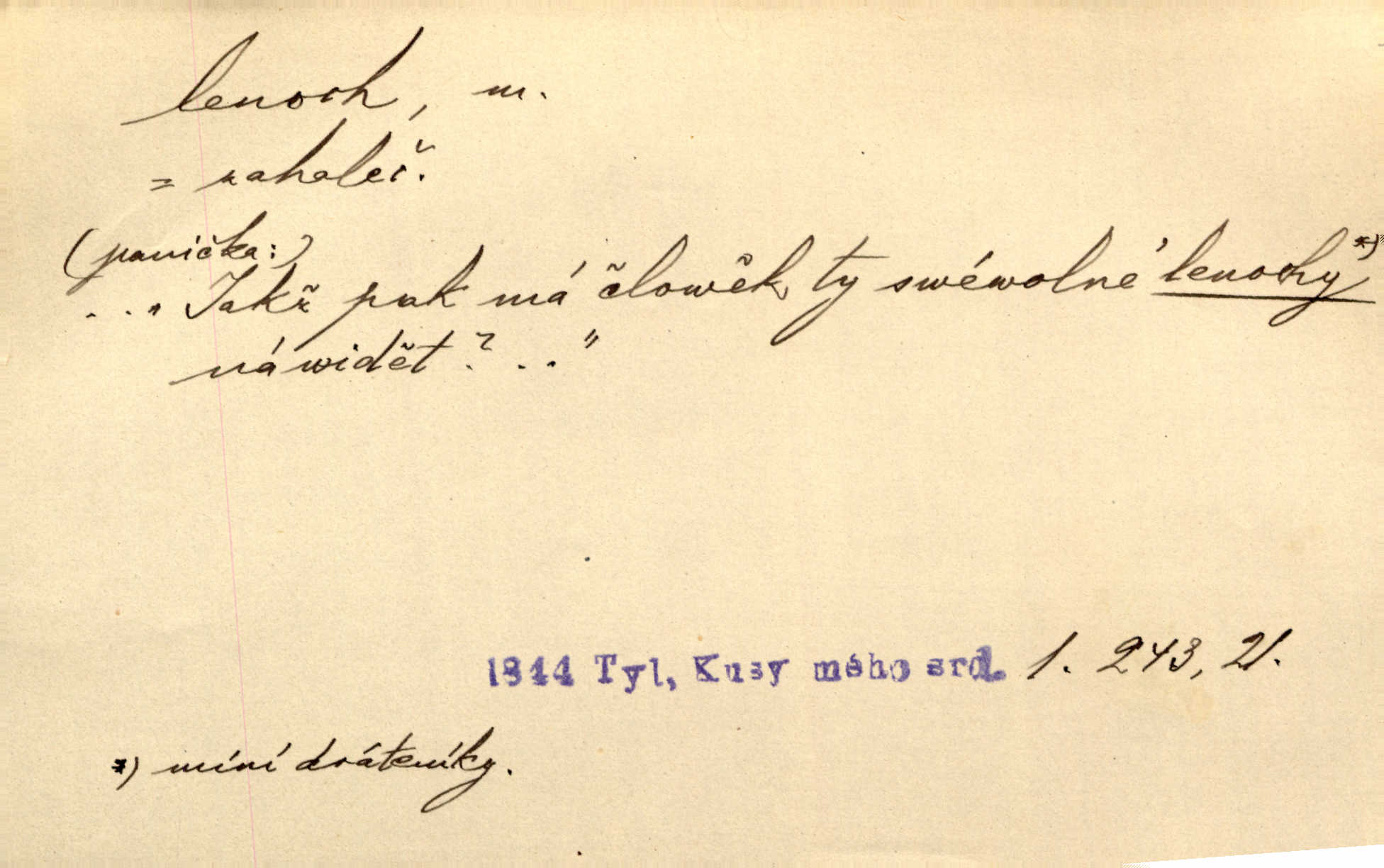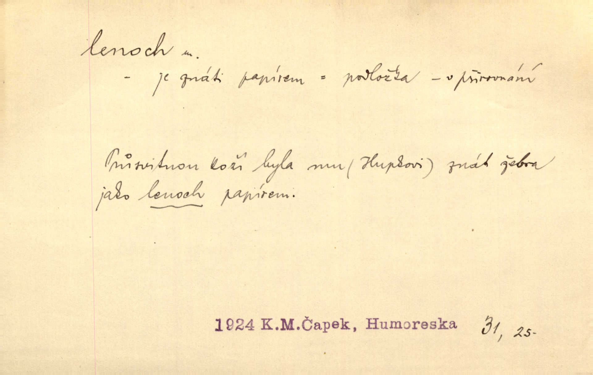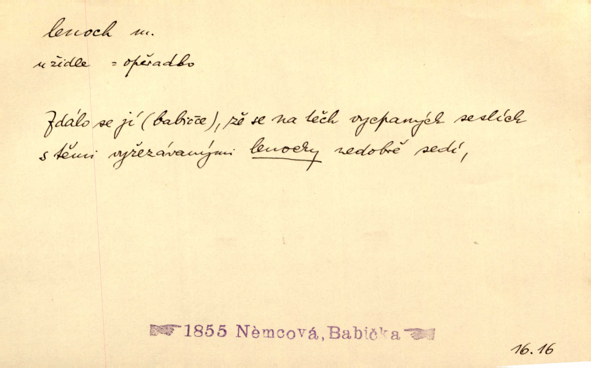 - lenoch, -u m. opěradlo sedadla. Farář bubnoval prsty do lenochu židle. Vach. D linkovaná papírová podložka. Průsvitnou koží byla mu znát žebra jako lenoch papírem. Čap. Ch.
