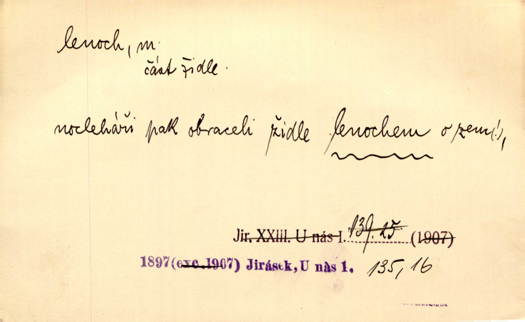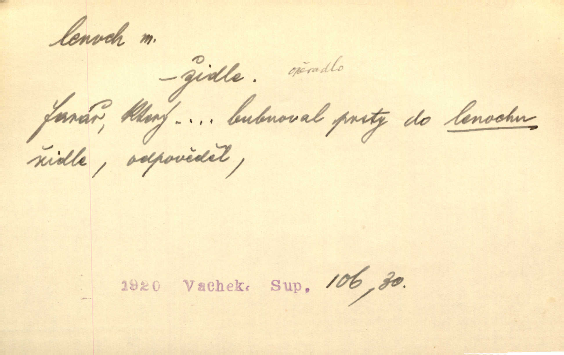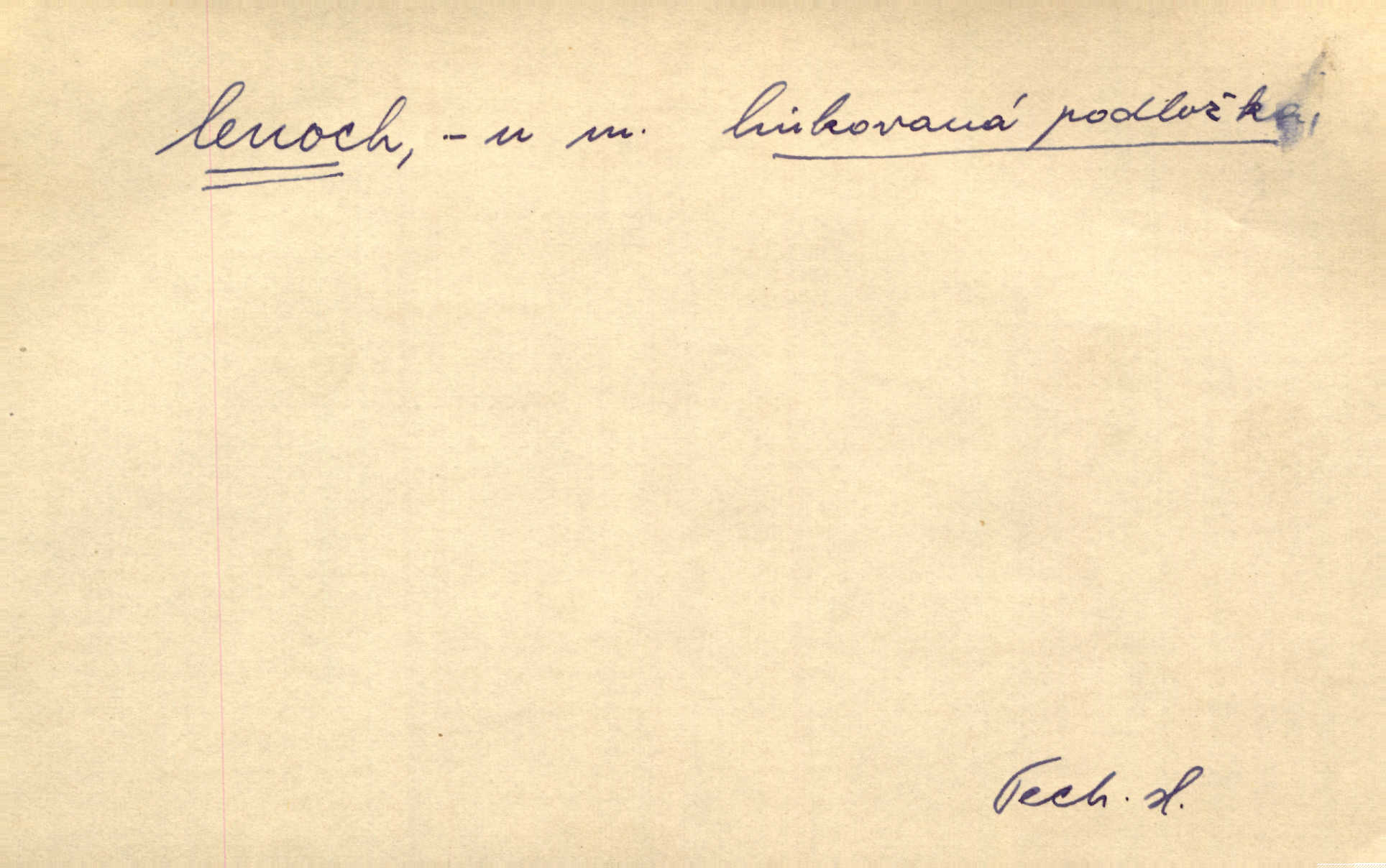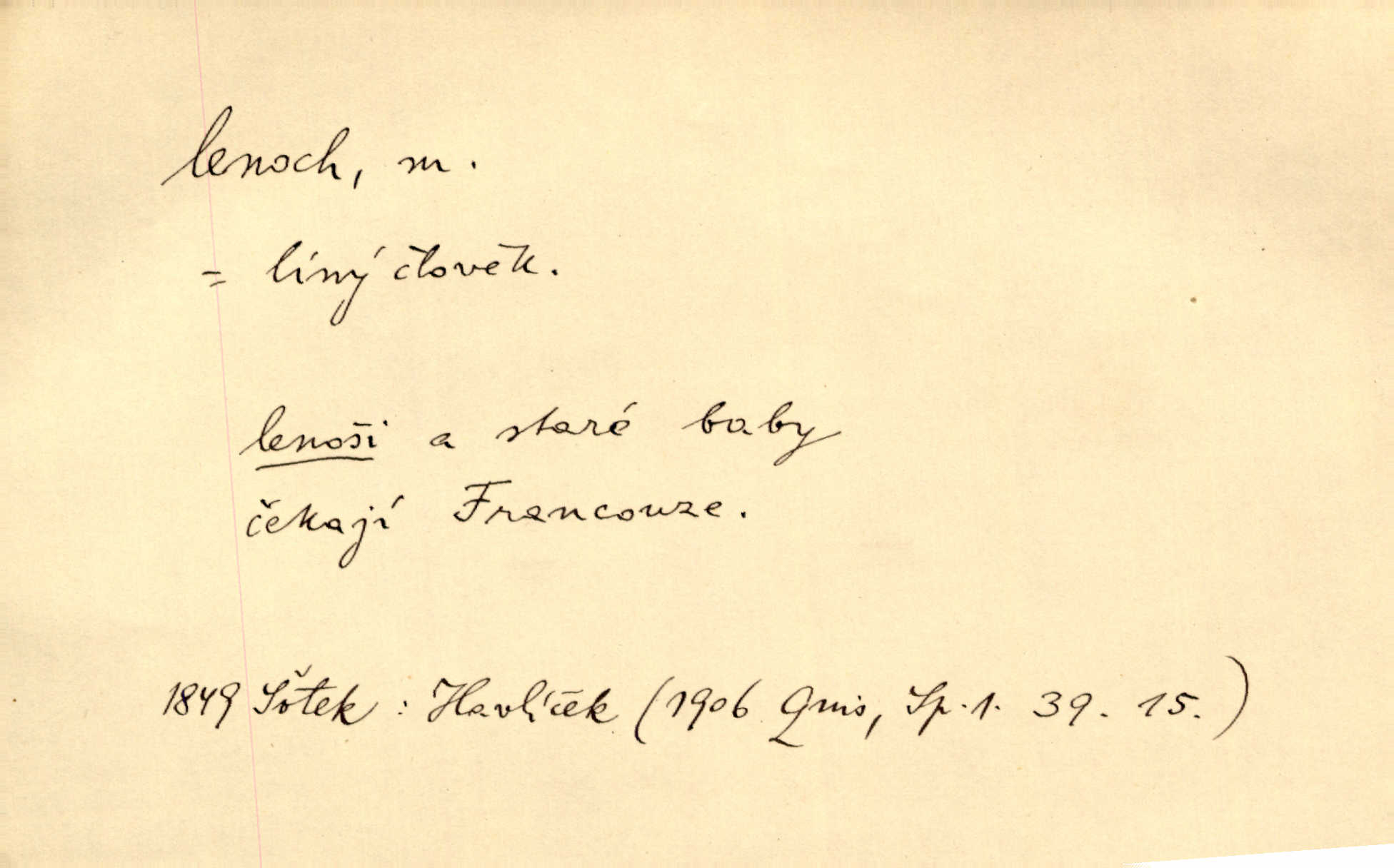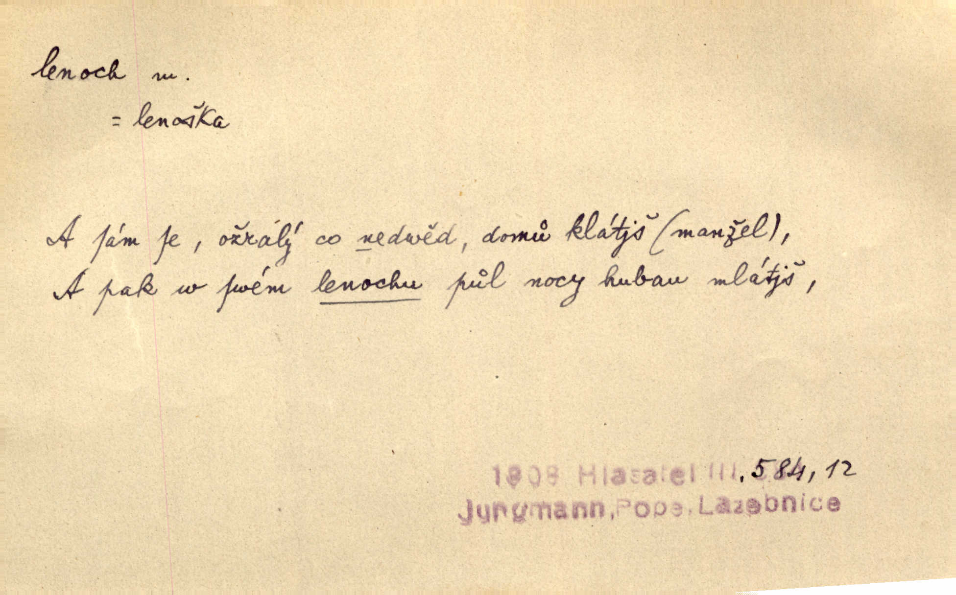 - lenoch, -u m. opěradlo sedadla. Farář bubnoval prsty do lenochu židle. Vach. D linkovaná papírová podložka. Průsvitnou koží byla mu znát žebra jako lenoch papírem. Čap. Ch.