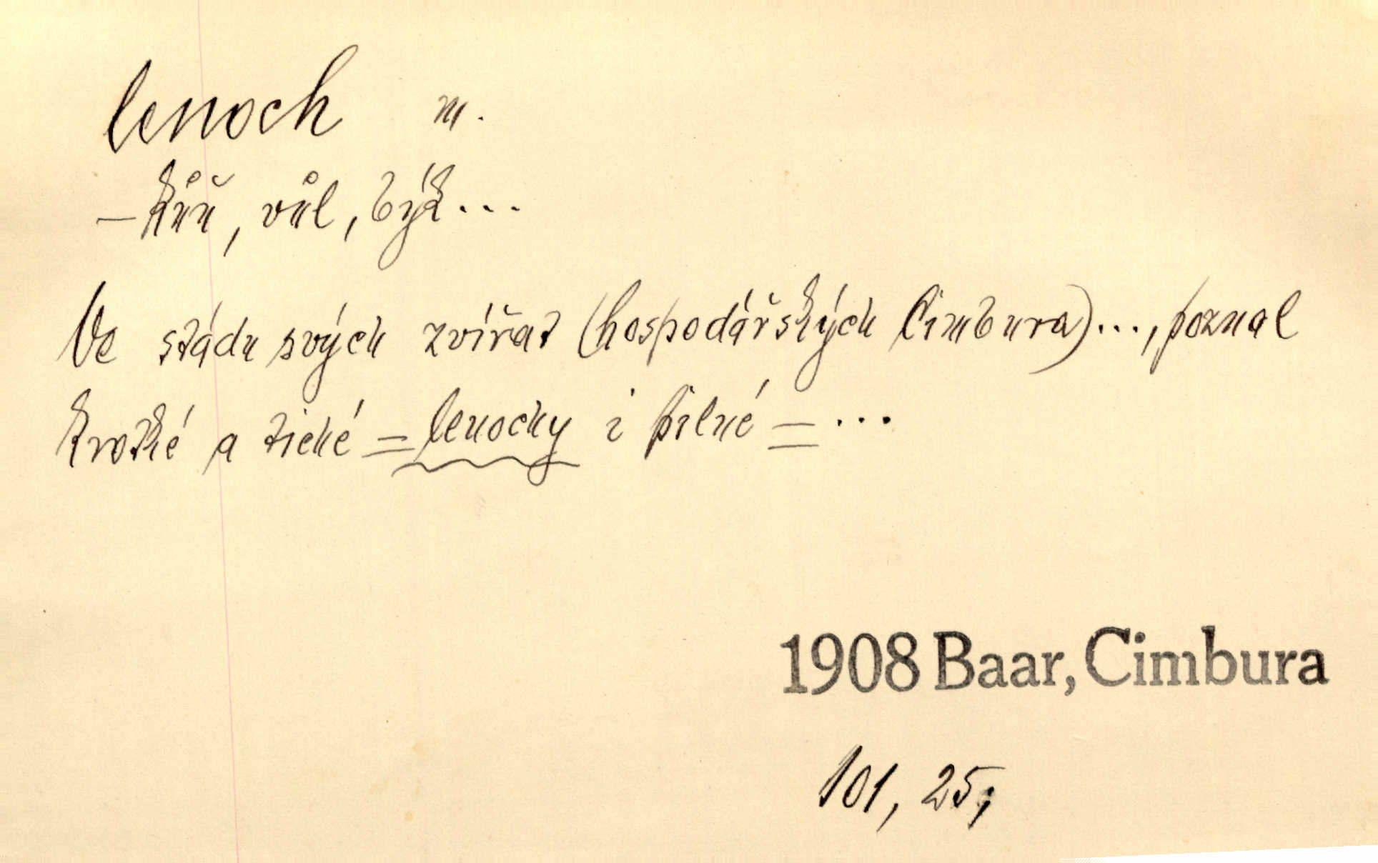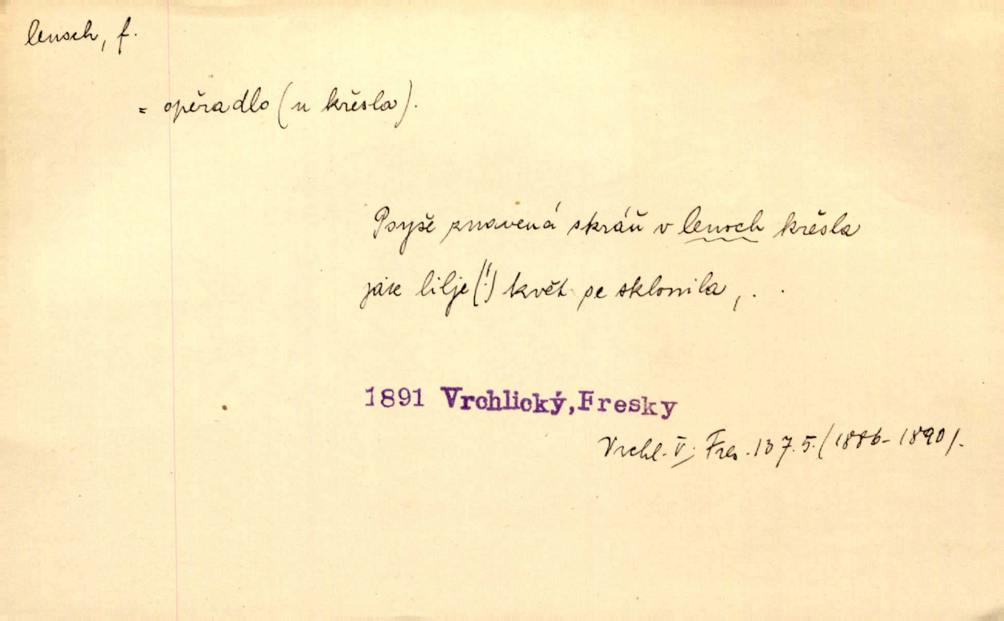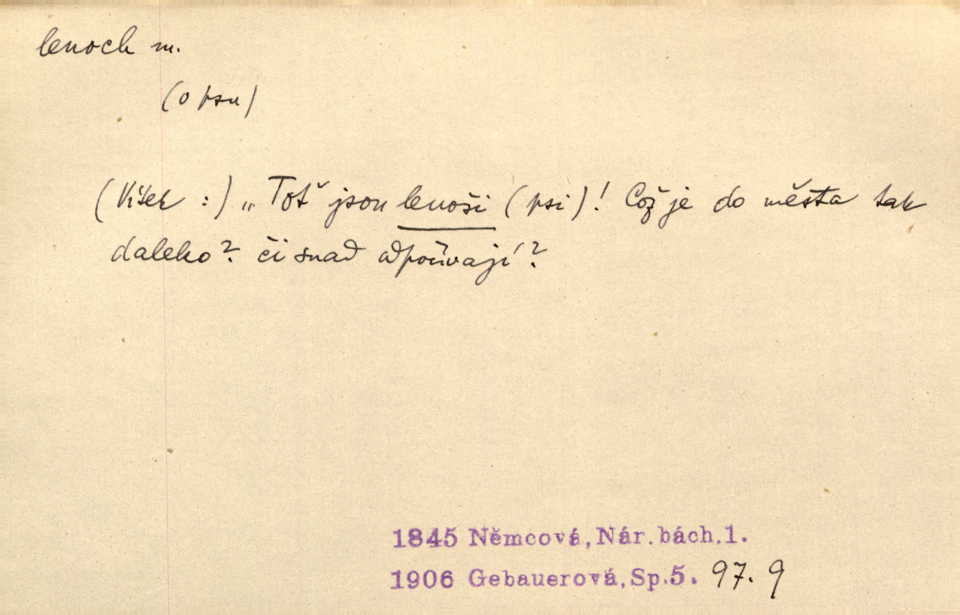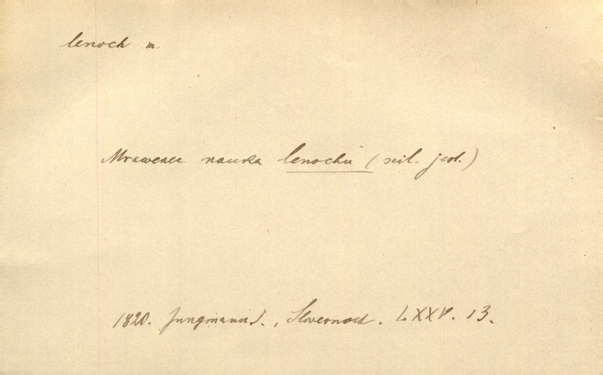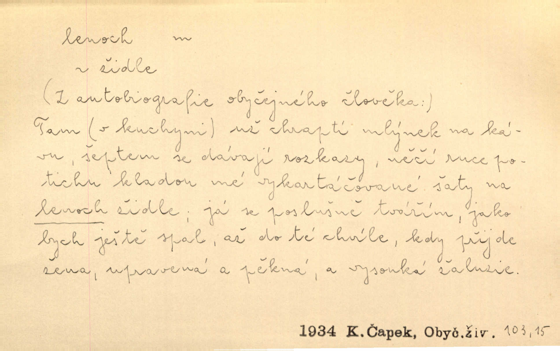 - lenoch, -u m. opěradlo sedadla. Farář bubnoval prsty do lenochu židle. Vach. D linkovaná papírová podložka. Průsvitnou koží byla mu znát žebra jako lenoch papírem. Čap. Ch.